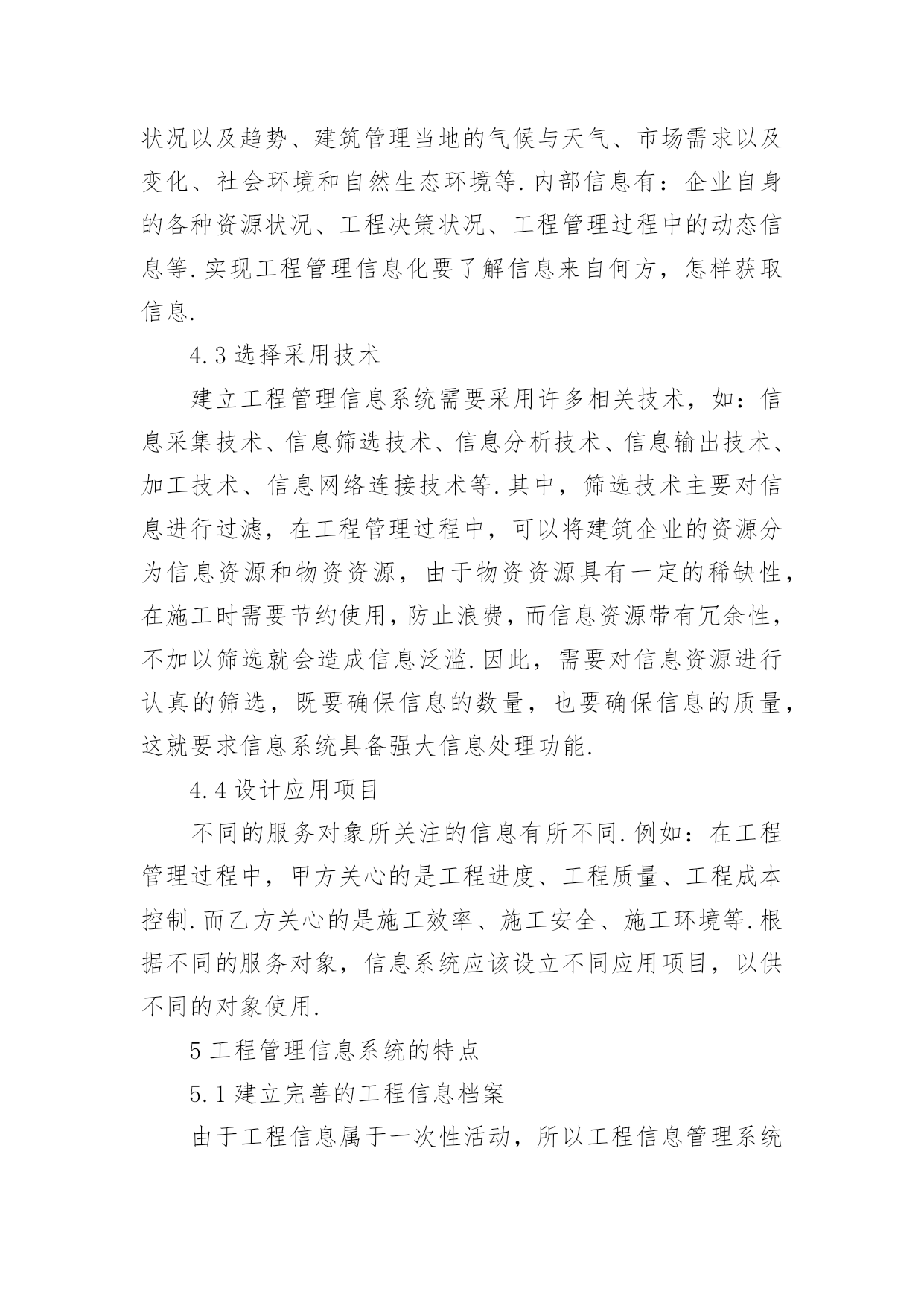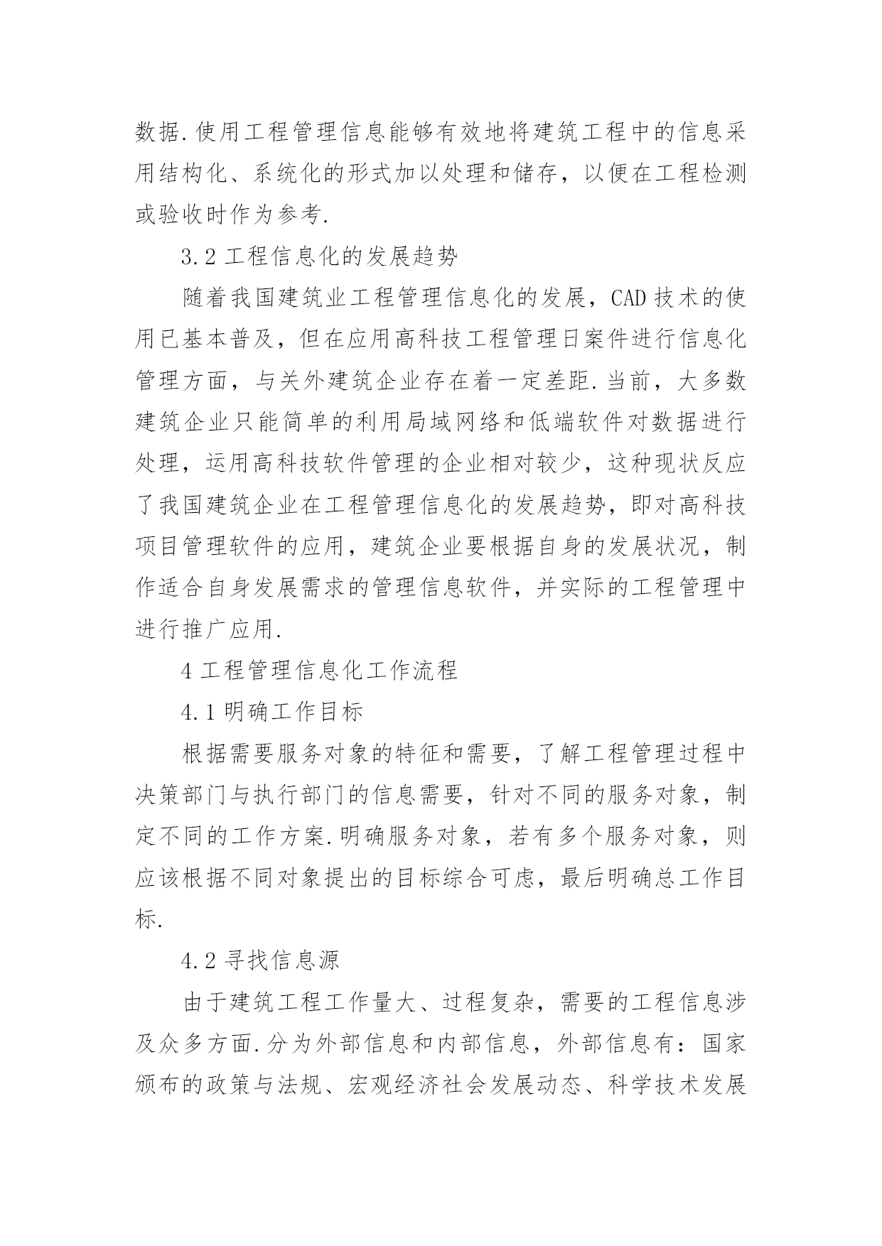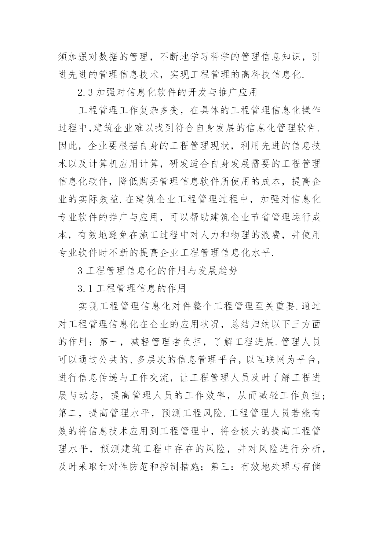信息化工程管理论文1我国工程管理信息化发展现状随着建筑业的蓬勃发展,各建筑企业建筑的竞争逐渐加剧,对工程管理信息化提出越来越高的要求.信息化管理效率的提高对管理软件提出了挑战.当前,大多数企业在数据的保持与处理方面,仍然采用局域网共享的手段,而对于项目管理软件的实际操作的应用功能不熟悉.当前,我国自主研发管理信息软件难以满足工作需求,由于国外的经济发展水平与市场意识形态与我国不同,专业的信息管理软件价格昂贵,不能适应我国建筑企业工程管理工作的需要.2对我国建筑行业工程管理信息化发展提出的建议2.1促进管理信息的均衡发展针对不同地区存在的工程管理信息化发展水平差异较大,相关机构应该根据各地区的发展需要,确保各地区的工程信息平衡发展,不论是在经济发达的东南沿海地区,还是在内陆相对落后的地区,要保证信息的数量、传播途径都能达到均衡发展的状态,为工程管理信息化发展营造良好的环境.2.2逐步完善工程管理信息化工作流程打破传统的信息数据管理模式,在传统的电话、书信等通信的基础上,运行运行新的通信方式,如:邮件、专门的通讯软件等.这样可以极大的提高信息传递速度,让通讯更加方便快捷.建筑企业若想从根本上提高信息化水平,就必须加强对数据的管理,不断地学习科学的管理信息知识,引进先进的管理信息技术,实现工程管理的高科技信息化.2.3加强对信息化软件的开发与推广应用工程管理工作复杂多变,在具体的工程管理信息化操作过程中,建筑企业难以找到符合自身发展的信息化管理软件.因此,企业要根据自身的工程管理现状,利用先进的信息技术以及计算机应用计算,研发适合自身发展需要的工程管理信息化软件,降低购买管理信息软件所使用的成本,提高企业的实际效益.在建筑企业工程管理过程中,加强对信息化专业软件的推广与应用,可以帮助建筑企业节省管理运行成本,有效地避免在施工过程中对人力和物理的浪费,并使用专业软件时不断的提高企业工程管理信息化水平.3工程管理信息化的作用与发展趋势3.1工程管理信息的作用实现工程管理信息化对件整个工程管理至关重要.通过对工程管理信息化在企业的应用状况,总结归纳以下三方面的作用:第一,减轻管理者负担,了解工程进展.管理人员可以通过公共的、多层次的信息管理平台,以互联网为平台,进行信息传递与工作交流,让工程管理人员及时了解工程进展与动态,提高管理人员的工作效率,从而减轻工作负担;第二,提高管理水平,预测工程风险.工程管理人员若能有效的将信息技术应用到工程管理中,将会极大的提高工程管理水平,预测建筑工程中存在的风险,并对风险进行分析,及时采取针对性防范和控制措施;第三:有效地处理与存储数据.使用工程管理信息能够有效地将建筑工程中的信息采用结构化、系统化的形式加以处理和储存,以便在工程检测或验收时作为参考.3.2工程信息化的发展趋势随着我国建筑业工程管理信息化的发展,CAD技术的使用已基本普及,但在应用高科技工程管理日案件进行信息化管理方面,与关外建筑企业存在着一定差距.当前,大多数建筑企业只能简单的利用局域网络和低端软件对数据进行处理,运用高科技软件管理的企业相对较少,这种现状反应了我国建筑企业在工程管理信息化的发展趋势,即对高科技项目管理软件的应用,建筑企业要根据自身的发展状况,制作适合自身发展需求的管理信息软件,并实际的工程管理中进行推广应用.4工程管理信息化工作流程4.1明确工作目标根据需要服务对象的特征和需要,了解工程管理过程中决策部门与执行部门的信息需要,针对不同的服务对象,制定不同的工作方案.明确服务对象,若有多个服务对象,则应该根据不同对象提出的目标综合可虑,最后明确总工作目标.4.2寻找信息源由于建筑工程工作量大、过程复杂,需要的工程信息涉及众多方面.分为外部信息和内部信息,外部信息有:国家颁布的政策与法规、宏观经济社会发展动态、科学技术发展状况以及趋势、建筑管理当地的气候与天气、市场需求以及变化、社会环境和自然生态环境等.内部信息有:企业自身的各种资源状况、工程决策状况、工程管理过程中的动态信息等.实现工程管理信息化要了解信息来自何方,怎样获取信息.4.3选择采用技术建立工程管理信息系统需要采用许多相关技术,如:信息采集技术、信息筛选技术、信息分析技术、信息输出技术、加工技术、信息网络连接技术等.其中,筛选技术主要对信息进行过滤,在工程管理过程中,可以将建筑企业的资源分为信息资源和物资资源,由于物资资源具有一定的稀缺性,在施工时需要节约使用,防止浪费,而信息资源带有冗余性,不加以筛选就会造成信息泛滥.因此,需要对信息资源进行认真的筛选,既要确保信息的数量,也要确保信息的质量,这就要求信息系统具备强大信息处理功能.4.4设计应用项目不同的服务对象所关注的信息有所不同.例如:在工程管理过程中,甲方关心的是工程进度、工程质量、工程成本控制.