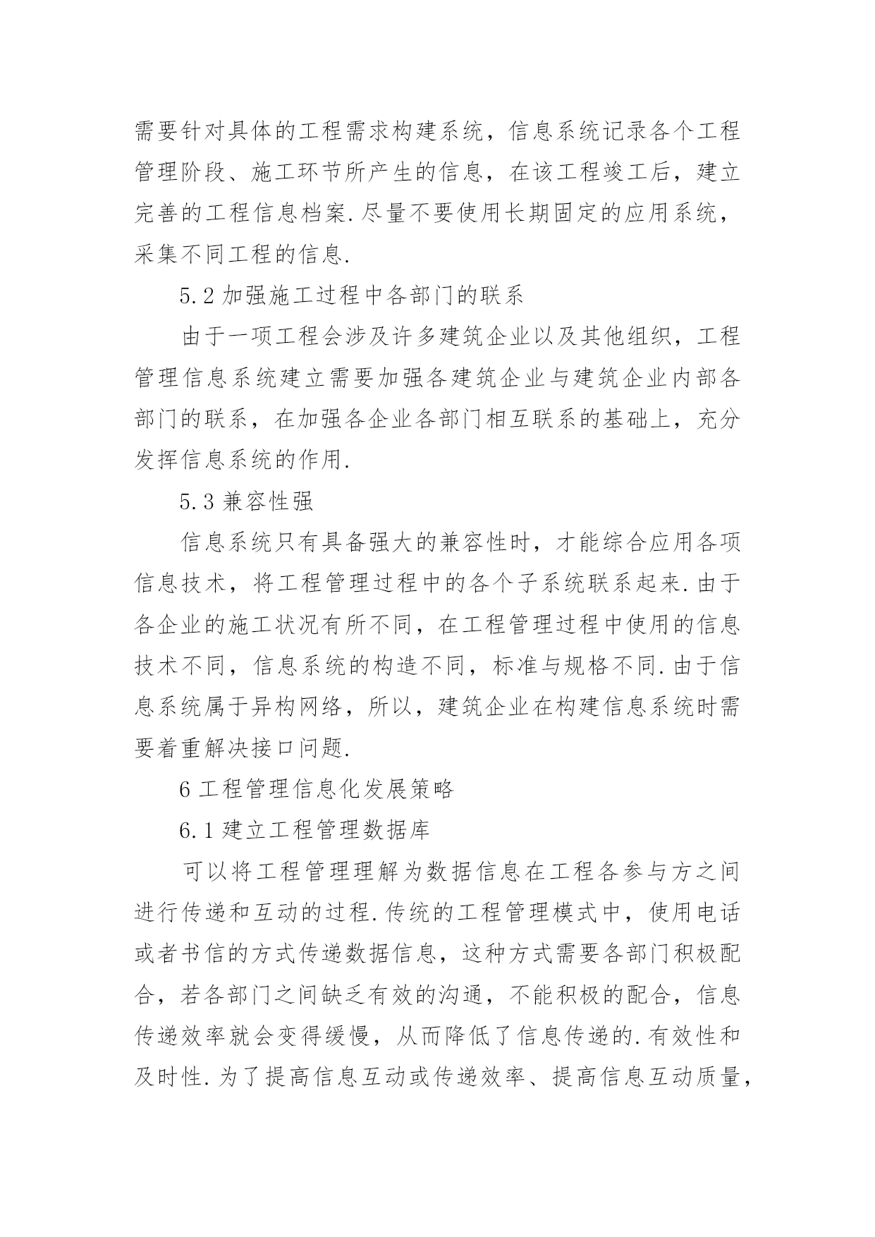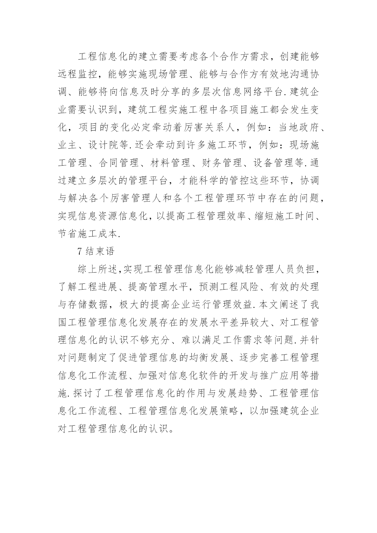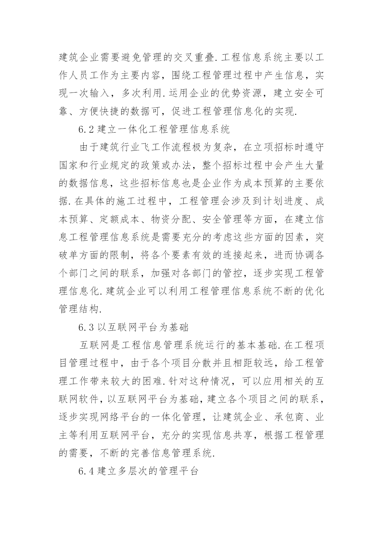 信息化工程管理论文1我国工程管理信息化发展现状随着建筑业的蓬勃发展,各建筑企业建筑的竞争逐渐加剧,对工程管理信息化提出越来越高的要求.信息化管理效率的提高对管理软件提出了挑战.当前,大多数企业在数据的保持与处理方面,仍然采用局域网共享的手段,而对于项目管理软件的实际操作的应用功能不熟悉.当前,我国自主研发管理信息软件难以满足工作需求,由于国外的经济发展水平与市场意识形态与我国不同,专业的信息管理软件价格昂贵,不能适应我国建筑企业工程管理工作的需要.2对我国建筑行业工程管理信息化发展提出的建议2.1促进管理信息的均衡发展针对不同地区存在的工程管理信息化发展水平差异较大,相关机构应该根据各地区的发展需要,确保各地区的工程信息平衡发展,不论是在经济发达的东南沿海地区,还是在内陆相对落后的地区,要保证信息的数量、传播途径都能达到均衡发展的状态,为工程管理信息化发展营造良好的环境.2.2逐步完善工程管理信息化工作流程打破传统的信息数据管理模式,在传统的电话、书信等通信的基础上,运行运行新的通信方式,如:邮件、专门的通讯软件等.这样可以极大的提高信息传递速度,让通讯更加方便快捷.建筑企业若想从根本上提高信息化水平,就必须加强对数据的管理,不断地学习科学的管理信息知识,引进先进的管理信息技术,实现工程管理的高科技信息化.2.3加强对信息化软件的开发与推广应用工程管理工作复杂多变,在具体的工程管理信息化操作过程中,建筑企业难以找到符合自身发展的信息化管理软件.因此,企业要根据自身的工程管理现状,利用先进的信息技术以及计算机应用计算,研发适合自身发展需要的工程管理信息化软件,降低购买管理信息软件所使用的成本,提高企业的实际效益.在建筑企业工程管理过程中,加强对信息化专业软件的推广与应用,可以帮助建筑企业节省管理运行成本,有效地避免在施工过程中对人力和物理的浪费,并使用专业软件时不断的提高企业工程管理信息化水平.3工程管理信息化的作用与发展趋势3.1工程管理信息的作用实现工程管理信息化对件整个工程管理至关重要.通过对工程管理信息化在企业的应用状况,总结归纳以下三方面的作用:第一,减轻管理者负担,了解工程进展.管理人员可以通过公共的、多层次的信息管理平台,以互联网为平台,进行信息传递与工作交流,让工程管理人员及时了解工程进展与动态,提高管理人员的工作效率,从而减轻工作负担;第二,提高管理水平,预测工程风险.工程管理人员若能有效的将信息技术应用到工程管理中,将会极大的提高工程管理水平,预测建筑工程中存在的风险,并对风险进行分析,及时采取针对性防范和控制措施;第三:有效地处理与存储数据.使用工程管理信息能够有效地将建筑工程中的信息采用结构化、系统化的形式加以处理和储存,以便在工程检测或验收时作为参考.3.2工程信息化的发展趋势随着我国建筑业工程管理信息化的发展,CAD技术的使用已基本普及,但在应用高科技工程管理日案件进行信息化管理方面,与关外建筑企业存在着一定差距.当前,大多数建筑企业只能简单的利用局域网络和低端软件对数据进行处理,运用高科技软件管理的企业相对较少,这种现状反应了我国建筑企业在工程管理信息化的发展趋势,即对高科技项目管理软件的应用,建筑企业要根据自身的发展状况,制作适合自身发展需求的管理信息软件,并实际的工程管理中进行推广应用.4工程管理信息化工作流程4.1明确工作目标根据需要服务对象的特征和需要,了解工程管理过程中决策部门与执行部门的信息需要,针对不同的服务对象,制定不同的工作方案.明确服务对象,若有多个服务对象,则应该根据不同对象提出的目标综合可虑,最后明确总工作目标.4.2寻找信息源由于建筑工程工作量大、过程复杂,需要的工程信息涉及众多方面.分为外部信息和内部信息,外部信息有:国家颁布的政策与法规、宏观经济社会发展动态、科学技术发展状况以及趋势、建筑管理当地的气候与天气、市场需求以及变化、社会环境和自然生态环境等.内部信息有:企业自身的各种资源状况、工程决策状况、工程管理过程中的动态信息等.实现工程管理信息化要了解信息来自何方,怎样获取信息.4.3选择采用技术建立工程管理信息系统需要采用许多相关技术,如:信息采集技术、信息筛选技术、信息分析技术、信息输出技术、加工技术、信息网络连接技术等.其中,筛选技术主要对信息进行过滤,在工程管理过程中,可以将建筑企业的资源分为信息资源和物资资源,由于物资资源具有一定的稀缺性,在施工时需要节约使用,防止浪费,而信息资源带有冗余性,不加以筛选就会造成信息泛滥.因此,需要对信息资源进行认真的筛选,既要确保信息的数量,也要确保信息的质量,这就要求信息系统具备强大信息处理功能.4.4设计应用项目不同的服务对象所关注的信息有所不同.例如:在工程管理过程中,甲方关心的是工程进度、工程质量、工程成本控制.