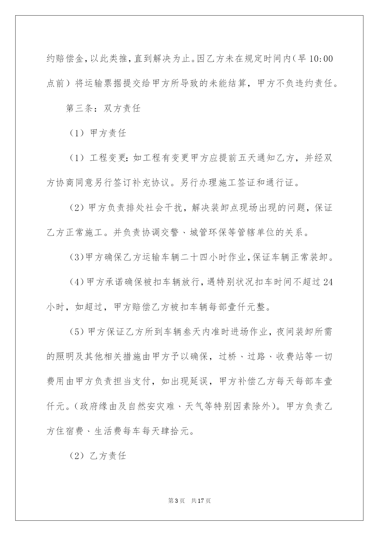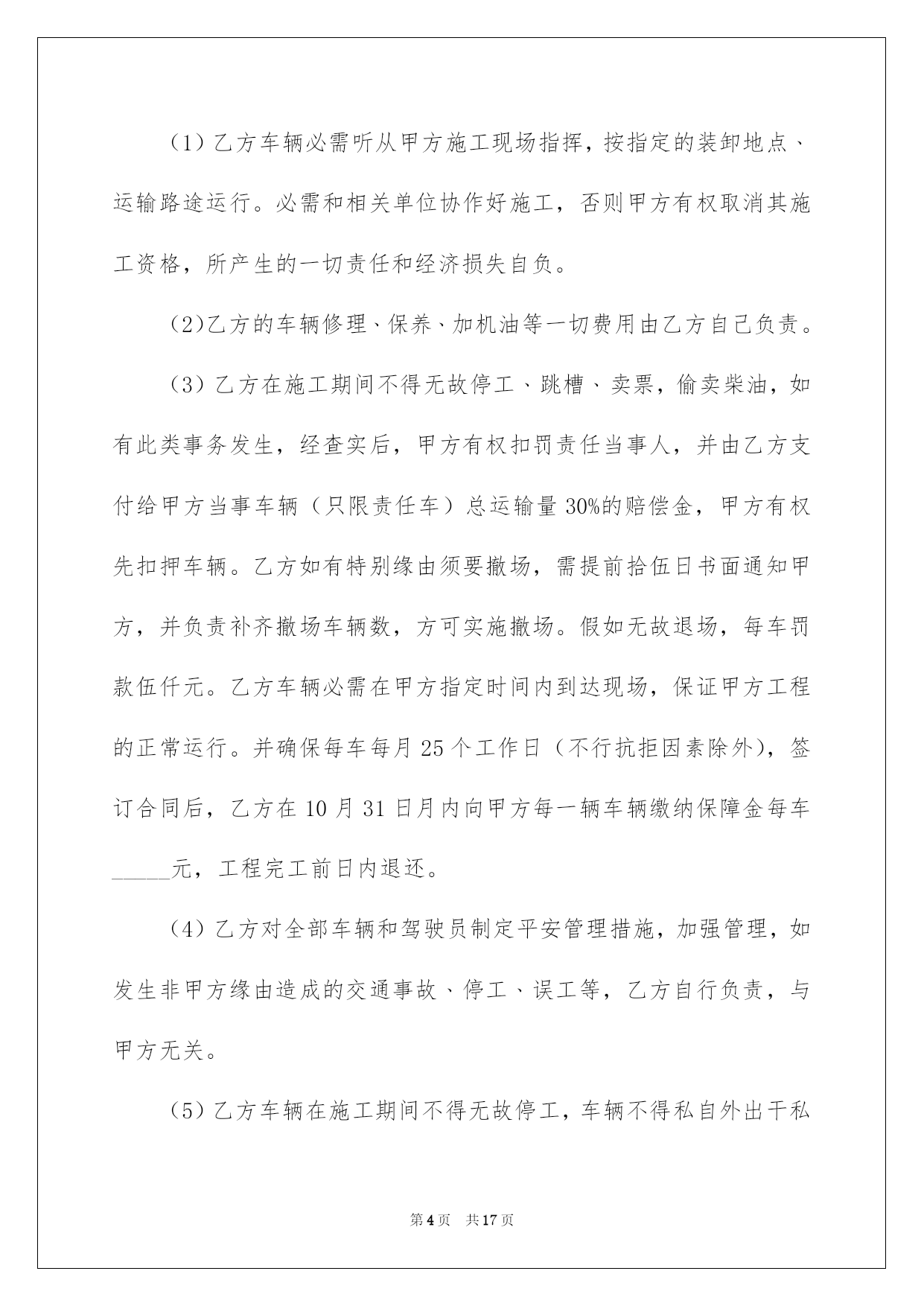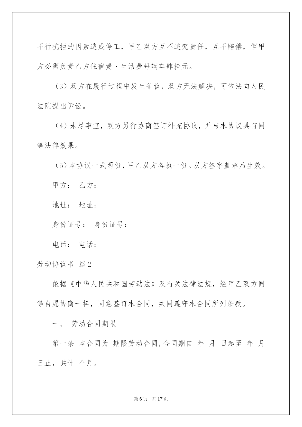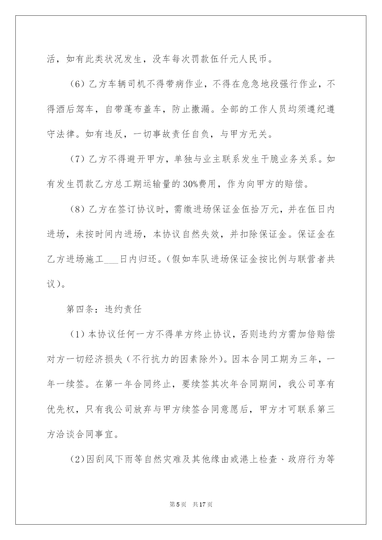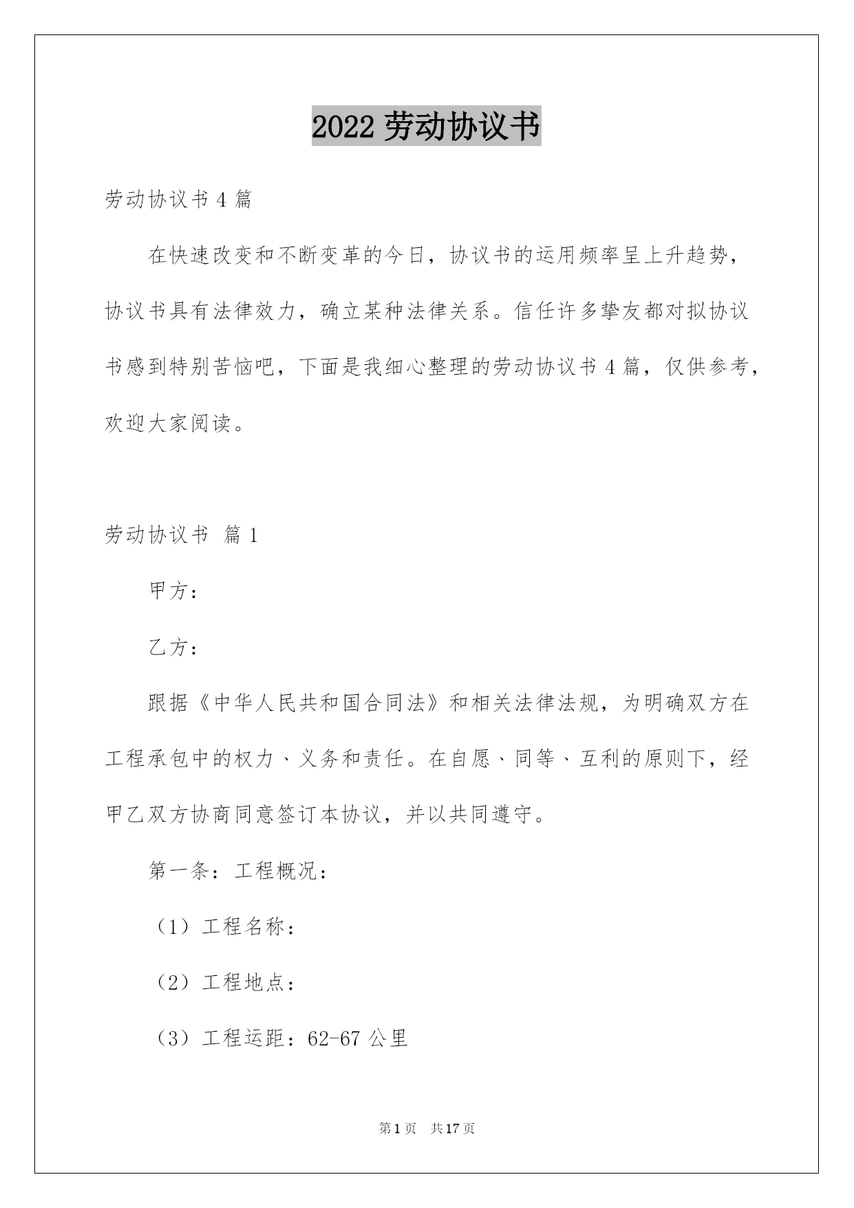 第PAGE\*Arabic\*MERGEFORMAT17页共NUMPAGES\*Arabic\*MERGEFORMAT17页第PAGE\*MERGEFORMAT17页共NUMPAGES\*MERGEFORMAT17页第PAGE\*MERGEFORMAT17页共NUMPAGES\*MERGEFORMAT17页第PAGE\*MERGEFORMAT17页共NUMPAGES\*MERGEFORMAT17页第PAGE\*MERGEFORMAT17页共NUMPAGES\*MERGEFORMAT17页第PAGE\*MERGEFORMAT17页共NUMPAGES\*MERGEFORMAT17页第PAGE\*MERGEFORMAT17页共NUMPAGES\*MERGEFORMAT17页第PAGE\*MERGEFORMAT17页共NUMPAGES\*MERGEFORMAT17页第PAGE\*MERGEFORMAT17页共NUMPAGES\*MERGEFORMAT17页第PAGE\*MERGEFORMAT17页共NUMPAGES\*MERGEFORMAT17页第PAGE\*MERGEFORMAT17页共NUMPAGES\*MERGEFORMAT17页2022劳动协议书劳动协议书4篇在快速改变和不断变革的今日,协议书的运用频率呈上升趋势,协议书具有法律效力,确立某种法律关系。信任许多挚友都对拟协议书感到特别苦恼吧,下面是我细心整理的劳动协议书4篇,仅供参考,欢迎大家阅读。劳动协议书篇1甲方:乙方:跟据《中华人民共和国合同法》和相关法律法规,为明确双方在工程承包中的权力﹑义务和责任。在自愿﹑同等﹑互利的原则下,经甲乙双方协商同意签订本协议,并以共同遵守。第一条:工程概况:(1)工程名称:(2)工程地点:(3)工程运距:62-67公里(4)运输期限:.施工期间有不行抗力的特别状况时需延期,经甲﹑乙双方确认后另立补充协议。(5)运输方式:清运,调车费每车元,车到现场支付。工程开工后拾伍日内扣除。(6)车辆规格:前四后八,净重60吨。(7)运输价格:每车元整(税后价),甲方包吃住﹑包加油﹑包路保生活费标准每车每天.(8)运输方量:.其次条:运输款结算与付款方式:(1)运输费支付方法:结算周期为24小时(周一至周日都正常结算),每日8:00―10:00为结算时间。在当日下午四点之前结算上日完成的工程量的全部钱款,结算率为100%.(2)甲方按乙方供应的银行账号,由甲方通过银行存入乙方指定银行账户。甲乙双方以甲方开具的过磅单据或方量单据为结算依据。(3)结算以甲乙双方现场统计员和乙方指定人。(4)如甲方未能按时结算,或因甲方缘由导致停工,停工损失由甲方担当。并需支付给乙方每部车每天运输的相应金额壹仟元整的违约赔偿金,以此类推,直到解决为止。因乙方未在规定时间内(早10:00点前)将运输票据提交给甲方所导致的未能结算,甲方不负违约责任。第三条:双方责任(1)甲方责任(1)工程变更:如工程有变更甲方应提前五天通知乙方,并经双方协商同意另行签订补充协议。另行办理施工签证和通行证。(2)甲方负责排处社会干扰,解决装卸点现场出现的问题,保证乙方正常施工。并负责协调交警﹑城管环保等管辖单位的关系。(3)甲方确保乙方运输车辆二十四小时作业,保证车辆正常装卸。(4)甲方承诺确保被扣车辆放行,遇特别状况扣车时间不超过24小时,如超过,甲方赔偿乙方被扣车辆每部壹仟元整。(5)甲方保证乙方所到车辆叁天内准时进场作业,夜间装卸所需的照明及其他相关措施由甲方予以确保,过桥﹑过路﹑收费站等一切费用由甲方负责担当支付,如出现延误,甲方补偿乙方每天每部车壹仟元。(政府缘由及自然安灾难﹑天气等特别因素除外)。甲方负责乙方住宿费﹑生活费每车每天肆拾元。(2)乙方责任(1)乙方车辆必需听从甲方施工现场指挥,按指定的装卸地点﹑运输路途运行。必需和相关单位协作好施工,否则甲方有权取消其施工资格,所产生的一切责任和经济损失自负。(2)乙方的车辆修理﹑保养﹑加机油等一切费用由乙方自己负责。(3)乙方在施工期间不得无故停工﹑跳槽﹑卖票,偷卖柴油,如有此类事务发生,经查实后,甲方有权扣罚责任当事人,并由乙方支付给甲方当事车辆(只限责任车)总运输量30%的赔偿金,甲方有权先扣押车辆。乙方如有特别缘由须要撤场,需提前拾伍日书面通知甲方,并负责补齐撤场车辆数,方可实施撤场。假如无故退场,每车罚款伍仟元。乙方车辆必需在甲方指定时间内到达现场,保证甲方工程的正常运行。并确保每车每月25个工作日(不行抗拒因素除外),签订合同后,乙方在10月31日月内向甲方每一辆车辆缴