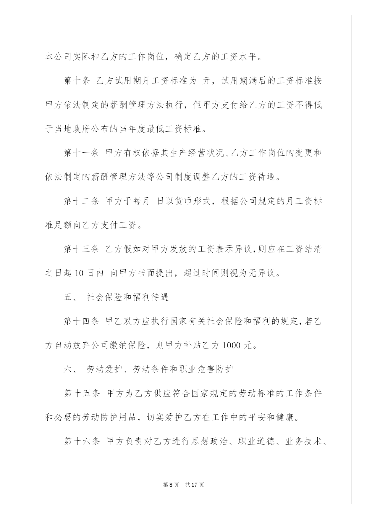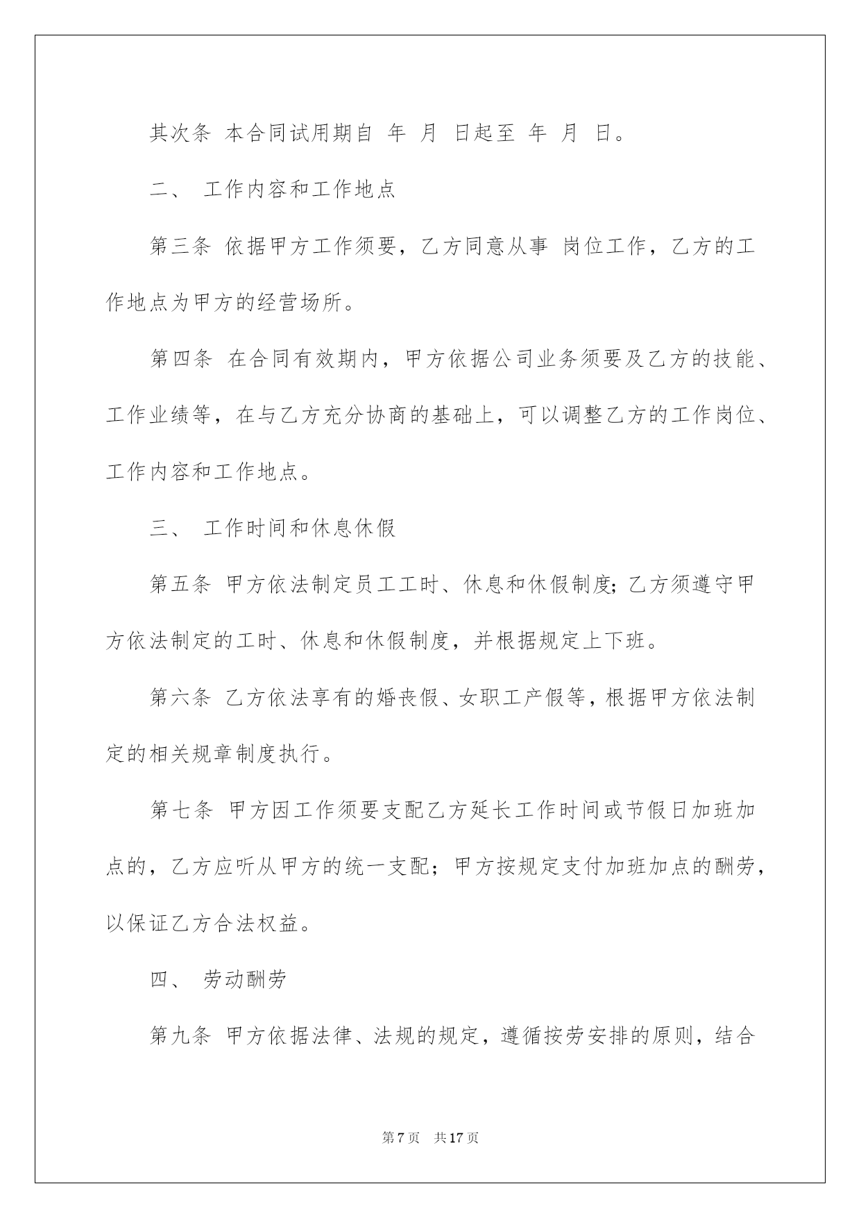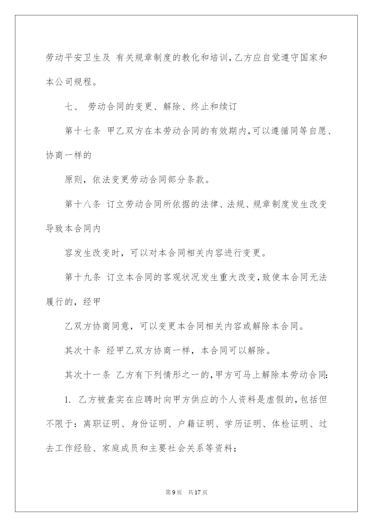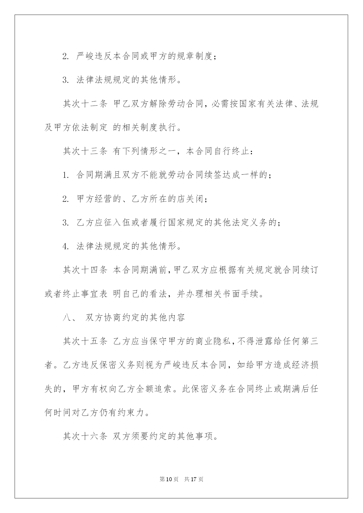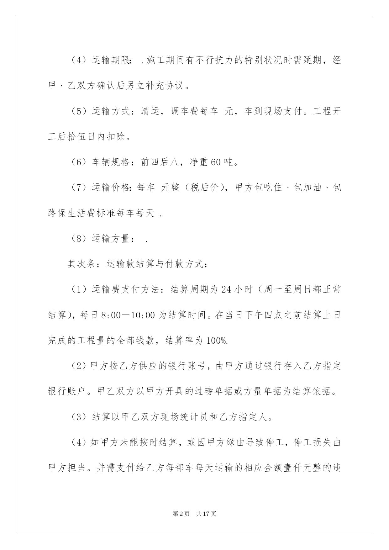 第PAGE\*Arabic\*MERGEFORMAT17页共NUMPAGES\*Arabic\*MERGEFORMAT17页第PAGE\*MERGEFORMAT17页共NUMPAGES\*MERGEFORMAT17页第PAGE\*MERGEFORMAT17页共NUMPAGES\*MERGEFORMAT17页第PAGE\*MERGEFORMAT17页共NUMPAGES\*MERGEFORMAT17页第PAGE\*MERGEFORMAT17页共NUMPAGES\*MERGEFORMAT17页第PAGE\*MERGEFORMAT17页共NUMPAGES\*MERGEFORMAT17页第PAGE\*MERGEFORMAT17页共NUMPAGES\*MERGEFORMAT17页第PAGE\*MERGEFORMAT17页共NUMPAGES\*MERGEFORMAT17页第PAGE\*MERGEFORMAT17页共NUMPAGES\*MERGEFORMAT17页第PAGE\*MERGEFORMAT17页共NUMPAGES\*MERGEFORMAT17页第PAGE\*MERGEFORMAT17页共NUMPAGES\*MERGEFORMAT17页2022劳动协议书劳动协议书4篇在快速改变和不断变革的今日,协议书的运用频率呈上升趋势,协议书具有法律效力,确立某种法律关系。信任许多挚友都对拟协议书感到特别苦恼吧,下面是我细心整理的劳动协议书4篇,仅供参考,欢迎大家阅读。劳动协议书篇1甲方:乙方:跟据《中华人民共和国合同法》和相关法律法规,为明确双方在工程承包中的权力﹑义务和责任。在自愿﹑同等﹑互利的原则下,经甲乙双方协商同意签订本协议,并以共同遵守。第一条:工程概况:(1)工程名称:(2)工程地点:(3)工程运距:62-67公里(4)运输期限:.施工期间有不行抗力的特别状况时需延期,经甲﹑乙双方确认后另立补充协议。(5)运输方式:清运,调车费每车元,车到现场支付。工程开工后拾伍日内扣除。(6)车辆规格:前四后八,净重60吨。(7)运输价格:每车元整(税后价),甲方包吃住﹑包加油﹑包路保生活费标准每车每天.(8)运输方量:.其次条:运输款结算与付款方式:(1)运输费支付方法:结算周期为24小时(周一至周日都正常结算),每日8:00―10:00为结算时间。在当日下午四点之前结算上日完成的工程量的全部钱款,结算率为100%.(2)甲方按乙方供应的银行账号,由甲方通过银行存入乙方指定银行账户。甲乙双方以甲方开具的过磅单据或方量单据为结算依据。(3)结算以甲乙双方现场统计员和乙方指定人。(4)如甲方未能按时结算,或因甲方缘由导致停工,停工损失由甲方担当。并需支付给乙方每部车每天运输的相应金额壹仟元整的违约赔偿金,以此类推,直到解决为止。因乙方未在规定时间内(早10:00点前)将运输票据提交给甲方所导致的未能结算,甲方不负违约责任。第三条:双方责任(1)甲方责任(1)工程变更:如工程有变更甲方应提前五天通知乙方,并经双方协商同意另行签订补充协议。另行办理施工签证和通行证。(2)甲方负责排处社会干扰,解决装卸点现场出现的问题,保证乙方正常施工。并负责协调交警﹑城管环保等管辖单位的关系。(3)甲方确保乙方运输车辆二十四小时作业,保证车辆正常装卸。(4)甲方承诺确保被扣车辆放行,遇特别状况扣车时间不超过24小时,如超过,甲方赔偿乙方被扣车辆每部壹仟元整。(5)甲方保证乙方所到车辆叁天内准时进场作业,夜间装卸所需的照明及其他相关措施由甲方予以确保,过桥﹑过路﹑收费站等一切费用由甲方负责担当支付,如出现延误,甲方补偿乙方每天每部车壹仟元。(政府缘由及自然安灾难﹑天气等特别因素除外)。甲方负责乙方住宿费﹑生活费每车每天肆拾元。(2)乙方责任(1)乙方车辆必需听从甲方施工现场指挥,按指定的装卸地点﹑运输路途运行。必需和相关单位协作好施工,否则甲方有权取消其施工资格,所产生的一切责任和经济损失自负。(2)乙方的车辆修理﹑保养﹑加机油等一切费用由乙方自己负责。(3)乙方在施工期间不得无故停工﹑跳槽﹑卖票,偷卖柴油,如有此类事务发生,经查实后,甲方有权扣罚责任当事人,并由乙方支付给甲方当事车辆(只限责任车)总运输量30%的赔偿金,甲方有权先扣押车辆。乙方如有特别缘由须要撤场,需提前拾伍日书面通知甲方,并负责补齐撤场车辆数,方可实施撤场。假如无故退场,每车罚款伍仟元。乙方车辆必需在甲方指定时间内到达现场,保证甲方工程的正常运行。并确保每车每月25个工作日(不行抗拒因素除外),签订合同后,乙方在10月31日月内向甲方每一辆车辆缴