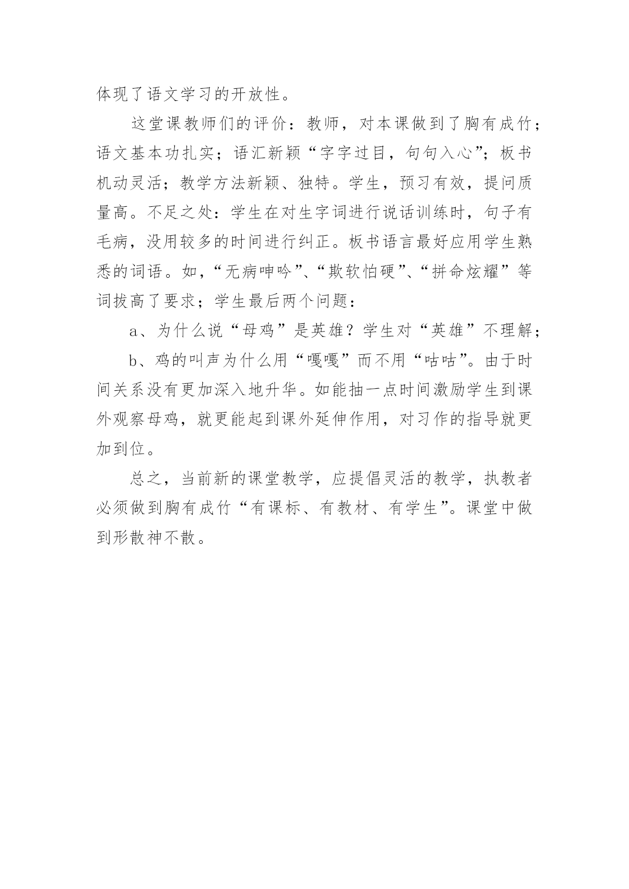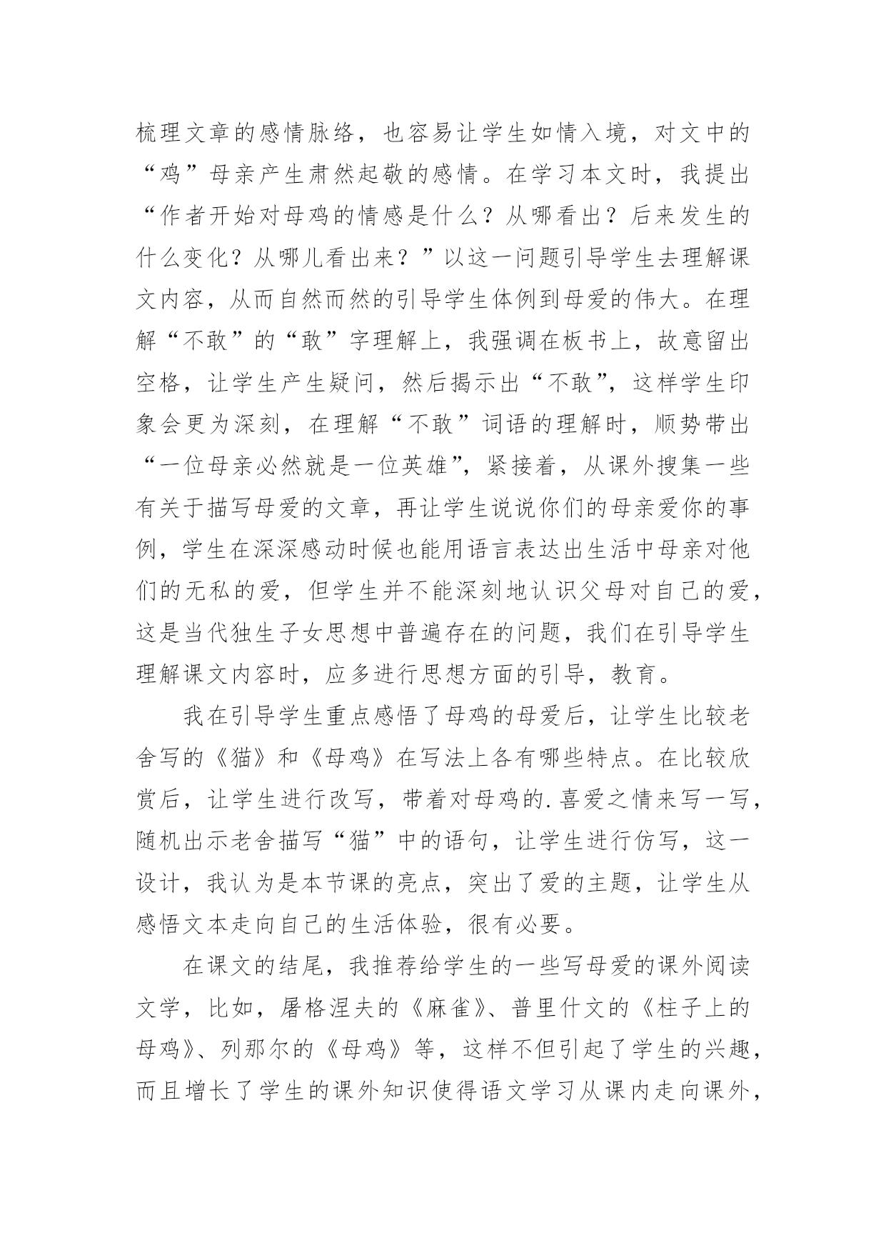 《母鸡》教学设计优秀作为一名默默奉献的教育工作者,就不得不需要编写教学设计,借助教学设计可以让教学工作更加有效地进行。一份好的教学设计是什么样子的呢?下面是小编整理的《母鸡》教学设计优秀,希望能够帮助到大家。《母鸡》教学设计优秀1“母爱”是一个永恒的主题,从古到今人们对于她的讴歌与诠释从未有过终止。《母鸡》,老舍的另一写作手法的体现:欲褒先贬、欲扬先抑、欲擒故纵。故在此环节的处理上无过分的张扬,为体验后面的主情感“母爱”埋下了伏笔,并进一以贯之。最后让学生在“品析词句,体会情感”的学法指导下,在朗读感悟母鸡对鸡雏的平凡细节中自然地联想到生活的场景,层层推进,勾起对“母爱”的'回忆,从而揭示出:母亲是伟大的,一位母亲必定是一位英雄的文本主题。和谐的课堂氛围有待进一步的思考,过于沉重的表情抑制了学生思维的火花;由于让学生回答问题时过于犹豫,延误了时间显得有些拖沓;朗读的指导与训练要在平时花功夫加以落实。《母鸡》教学设计优秀2《母鸡》,这是老舍另一写作顺序来学习,这样有助于梳理文章的感情脉络,也容易让学生如情入境,对文中的“鸡”母亲产生肃然起敬的感情。在学习本文时,我提出“作者开始对母鸡的情感是什么?从哪看出?后来发生的什么变化?从哪儿看出来?”以这一问题引导学生去理解课文内容,从而自然而然的引导学生体例到母爱的伟大。在理解“不敢”的“敢”字理解上,我强调在板书上,故意留出空格,让学生产生疑问,然后揭示出“不敢”,这样学生印象会更为深刻,在理解“不敢”词语的理解时,顺势带出“一位母亲必然就是一位英雄”,紧接着,从课外搜集一些有关于描写母爱的文章,再让学生说说你们的母亲爱你的事例,学生在深深感动时候也能用语言表达出生活中母亲对他们的无私的爱,但学生并不能深刻地认识父母对自己的爱,这是当代独生子女思想中普遍存在的问题,我们在引导学生理解课文内容时,应多进行思想方面的引导,教育。我在引导学生重点感悟了母鸡的母爱后,让学生比较老舍写的《猫》和《母鸡》在写法上各有哪些特点。在比较欣赏后,让学生进行改写,带着对母鸡的.喜爱之情来写一写,随机出示老舍描写“猫”中的语句,让学生进行仿写,这一设计,我认为是本节课的亮点,突出了爱的主题,让学生从感悟文本走向自己的生活体验,很有必要。在课文的结尾,我推荐给学生的一些写母爱的课外阅读文学,比如,屠格涅夫的《麻雀》、普里什文的《柱子上的母鸡》、列那尔的《母鸡》等,这样不但引起了学生的兴趣,而且增长了学生的课外知识使得语文学习从课内走向课外,体现了语文学习的开放性。这堂课教师们的评价:教师,对本课做到了胸有成竹;语文基本功扎实;语汇新颖“字字过目,句句入心”;板书机动灵活;教学方法新颖、独特。学生,预习有效,提问质量高。不足之处:学生在对生字词进行说话训练时,句子有毛病,没用较多的时间进行纠正。板书语言最好应用学生熟悉的词语。如,“无病呻吟”、“欺软怕硬”、“拼命炫耀”等词拔高了要求;学生最后两个问题:a、为什么说“母鸡”是英雄?学生对“英雄”不理解;b、鸡的叫声为什么用“嘎嘎”而不用“咕咕”。由于时间关系没有更加深入地升华。如能抽一点时间激励学生到课外观察母鸡,就更能起到课外延伸作用,对习作的指导就更加到位。总之,当前新的课堂教学,应提倡灵活的教学,执教者必须做到胸有成竹“有课标、有教材、有学生”。课堂中做到形散神不散。