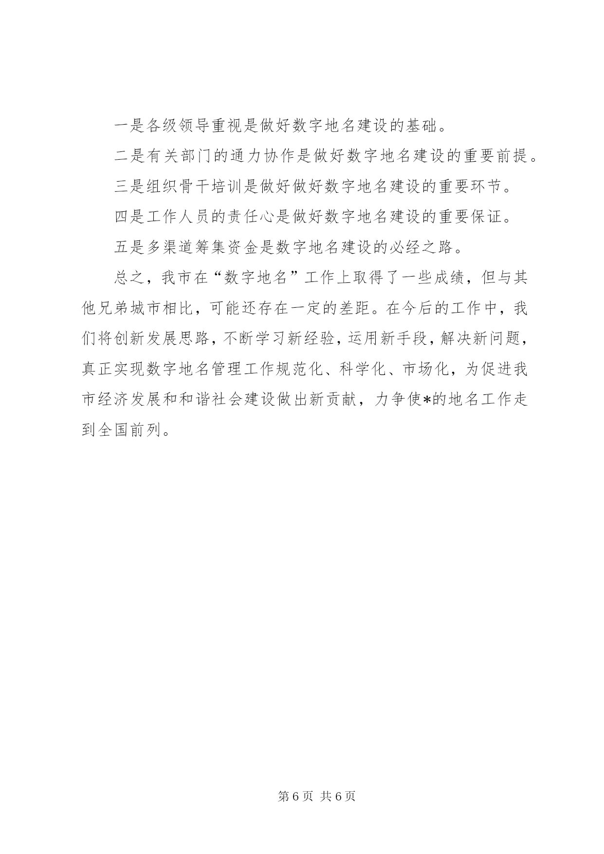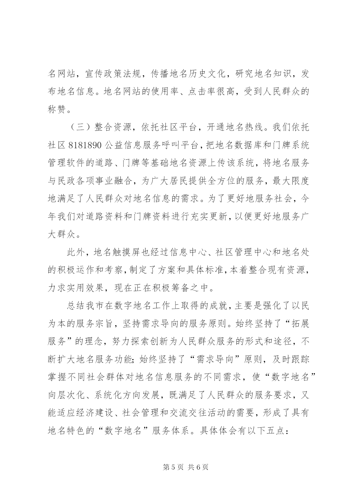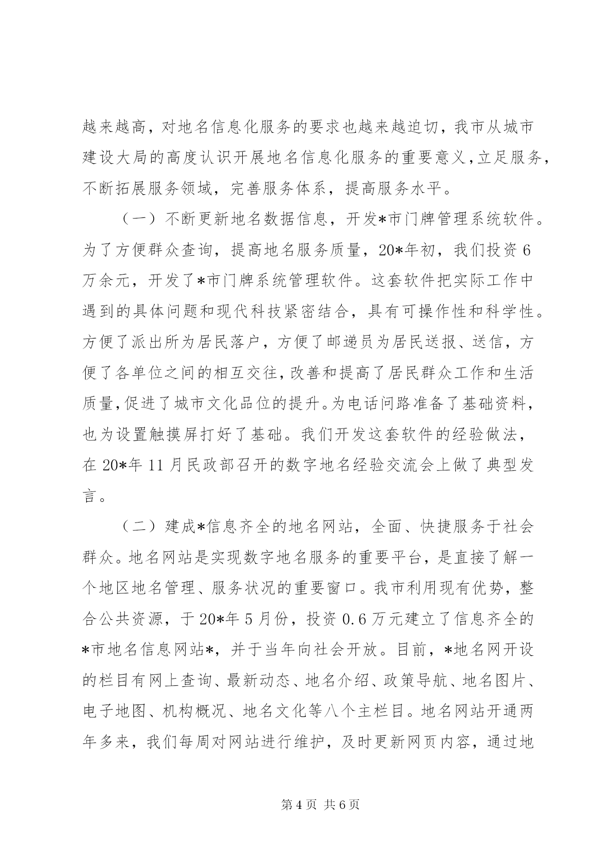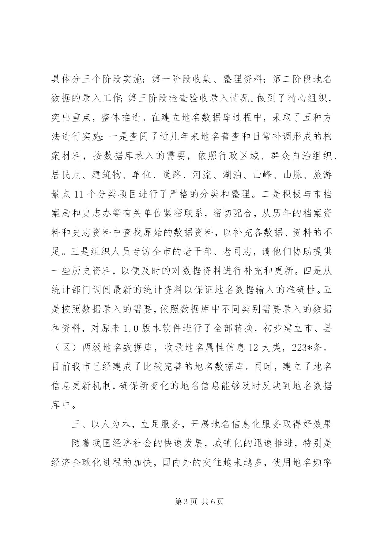 第PAGE\*Arabic\*MERGEFORMAT6页共NUMPAGES\*MERGEFORMAT6页市民政局公共服务经验交流*是*的省会,是一座历史悠久的名城,始建于春秋末年,2500年的历史赋予了*浓厚的历史文化底蕴,形成了纵横交错的1080多条街巷,积淀了具有浓郁地方特色的地名文化。近几年来,市政府投资750万元,用两年多的时间完成了全市六区一市的城市地名标志设置任务,在市区1080条街路巷设置了各种类型地名标志4360块,更换门牌27128块。围绕市委、市政府提出的“集三晋文脉与现代气息为一体的特色文化”的*城市文化定位目标,着眼于地名为经济建设服务,为群众服务,加大政府财政投入力度,积极探索地名公共服务的新路子,在地名规范、地名规划、地名设标、数字地名上做了一些工作,特别是在地名数据库和门牌系统管理软件建设上狠下功夫,精心组织,认真实施,收到了较好的效果。为实现数字地名奠定了基础。20*年初,在全省率先建成了市、县(区)两级地名数据库。20*年又在全省率先建成*市地名网站*。一、提高认识,加强领导,切实把建立地名数据库工作作为地名管理工作中心任务来抓建立地名数据库工作是地名管理工作与国内、国际接轨,服务经济、服务社会、服务人民群众的有效途径和重要手段,是地名工作由传统管理方式向现代信息管理方式转变的一场革命,是拓宽地名工作领域,实现地名管理科学化、标准化、信息化的重要步骤。启动这一工程的根本目的是为了更好地履行政府服务职能,为社会提供更多更好的公共产品。*市委、市政府领导非常关心、重视和支持这项工作,把建立地名数据库建设看作方便社会交往和群众生活,切实为民办实事的一项政治任务,摆上重要位置,纳入重要工作日程。主管市长亲自过问,责成市民政局负总责,城建、公安、电信等各相关部门密切配合,同心协力,齐抓共管。一是成立了由市民政局主管局长为组长,地名办工作人员及各相关部门人员共同参加的工作小组,按照省厅要求,我们把握“数字地名”的重点和突破口,争取政府财政的支持,保障了数字地名建设和服务工作需求。二是工作小组多次召开专题协调会议,研究落实各相关部门具体任务和责任,做到了任务明确,责任落实。三是市民政局重拳出击,把建立地名数据库工作作为重中之重和亮点工作来抓,作为省会城市的“形象工程”来抓,作为民政工作的品牌工作来抓。民政局长经常过问、主管局长亲自抓,地名办的同志具体操作。由于领导重视,组织得力,使建立地名数据库工作有了良好的组织保证。二、精心组织,突出重点,整体推进,确保各项地名基础数据准确录入建立地名数据库不仅仅是录入一点点数据,而是要向社会向全国乃至向世界介绍*,宣传*,使更多的人了解*,认识*。为此,我市根据省厅安排和要求,结合本市实际,制定了工作实施方案,具体分三个阶段实施:第一阶段收集、整理资料;第二阶段地名数据的录入工作;第三阶段检查验收录入情况。做到了精心组织,突出重点,整体推进。在建立地名数据库过程中,采取了五种方法进行实施:一是查阅了近几年来地名普查和日常补调形成的档案材料,按数据库录入的需要,依照行政区域、群众自治组织、居民点、建筑物、单位、道路、河流、湖泊、山峰、山脉、旅游景点11个分类项目进行了严格的分类和整理。二是积极与市档案局和史志办等有关单位紧密联系,密切配合,从历年的档案资料和史志资料中查找原始的数据资料,以补充各数据、资料的不足。三是组织人员专访全市的老干部、老同志,请他们协助提供一些历史资料,以便及时的对数据资料进行补充和更新。四是从统计部门调阅最新的统计资料以保证地名数据输入的准确性。五是按照数据录入的需要,依照数据库中不同类别需要录入的数据和资料,对原来1.0版本软件进行了全部转换,初步建立市、县(区)两级地名数据库,收录地名属性信息12大类,223*条。目前我市已经建成了比较完善的地名数据库。同时,建立了地名信息更新机制,确保新变化的地名信息能够及时反映到地名数据库中。三、以人为本,立足服务,开展地名信息化服务取得好效果随着我国经济社会的快速发展,城镇化的迅速推进,特别是经济全球化进程的加快,国内外的交往越来越多,使用地名频率越来越高,对地名信息化服务的要求也越来越迫切,我市从城市建设大局的高度认识开展地名信息化服务的重要意义,立足服务,不断拓展服务领域,完善服务体系,提高服务水平。(一)不断更新地名数据信息,开发*市门牌管理系统软件。为了方便群众查询,提高地名服务质量,20*年初,我们投资6万余元,开发了*市门牌系统管理软件。这套软件把实际工作中遇到的具体问题和现代科技紧密结合,具有可操作性和科学性。方便了派出所为居民落户,方便了邮递员为居民送报、送信,方便了各单位之间的相互交往,改善和提高了居民群众工作和生活质量,促进了城市文化品位的提升。为电话问路准