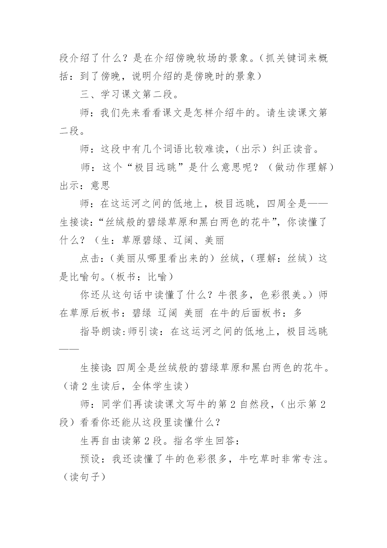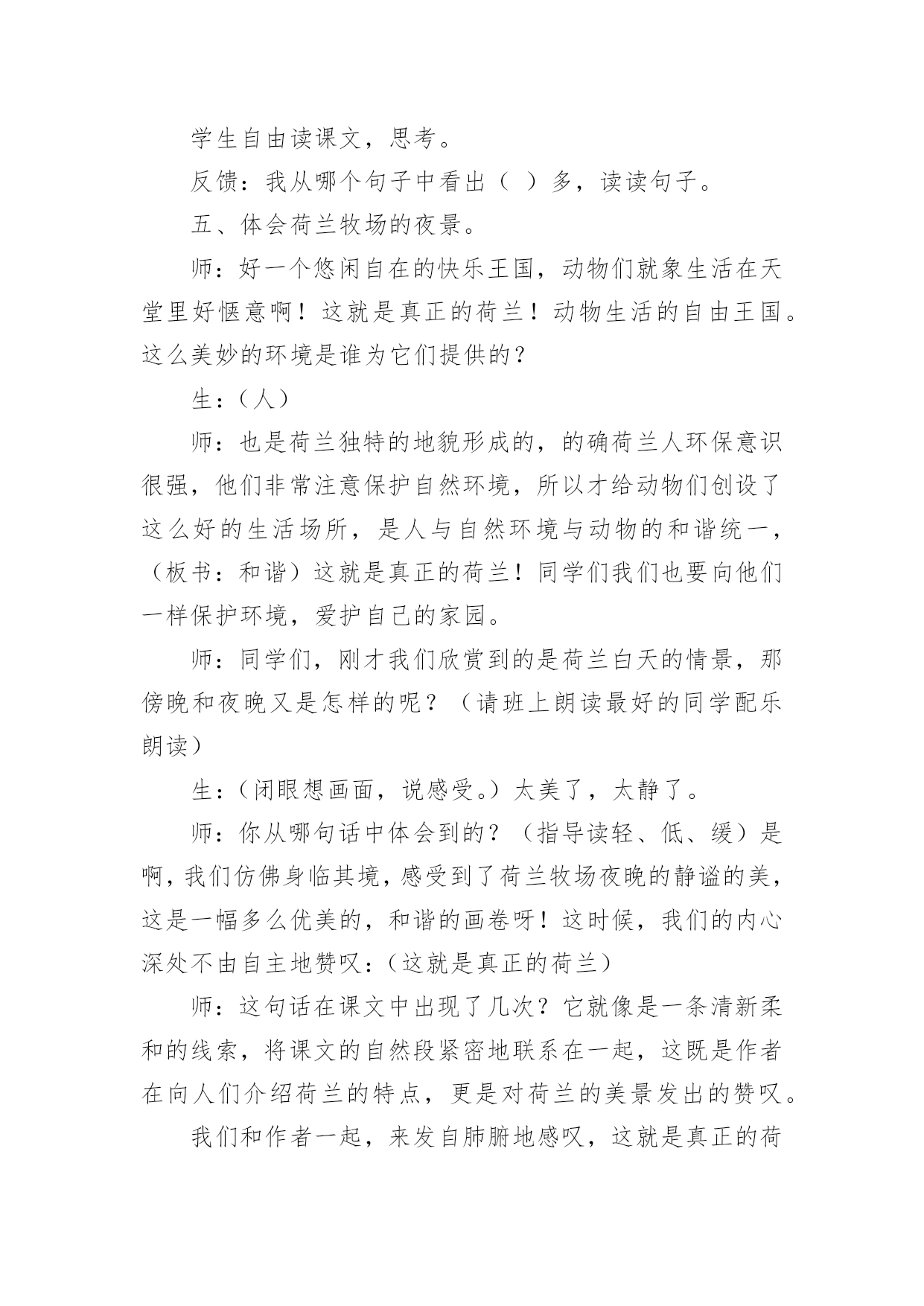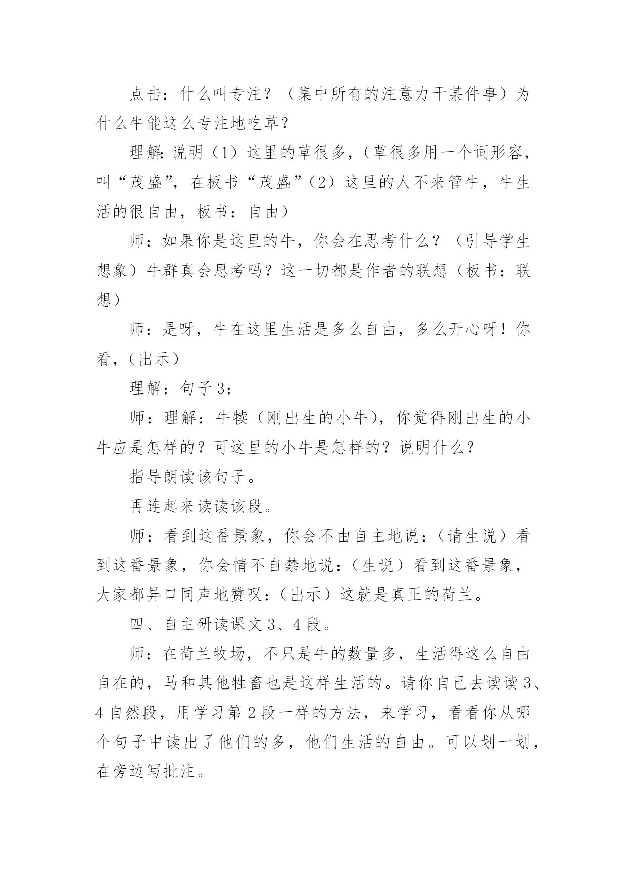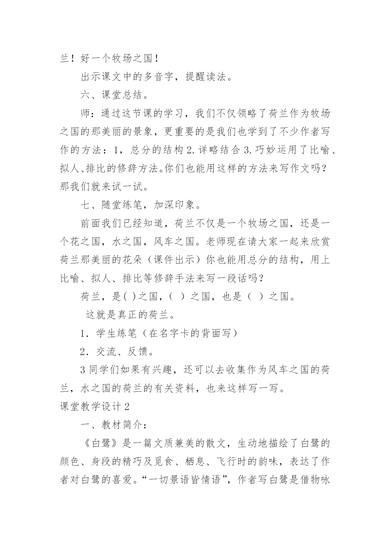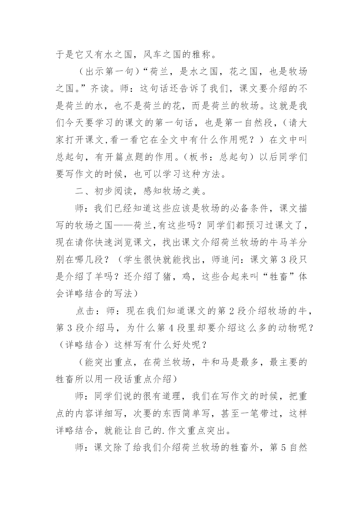 课堂教学设计课堂教学设计作为一名默默奉献的教育工作者,很有必要精心设计一份教学设计,教学设计是一个系统设计并实现学习目标的过程,它遵循学习效果最优的原则吗,是课件开发质量高低的关键所在。那么写教学设计需要注意哪些问题呢?以下是小编帮大家整理的课堂教学设计,欢迎大家分享。课堂教学设计1一、创设情境,激情导入。师:板书写牧场,看到这个词你眼前出现了什么样的画面?生:眼前出现了马、牛、羊,还有一望无际的草原……板书:草原牛马羊师:你们的想像力很丰富,今天老师就要带着大家一同走进欧洲的一个美丽的国家,这个国家有三分之一的领土都是牧场,这里的牧场辽阔无垠,所以它当之无愧被称为牧场之国。(板书:之国)这个国家就是——荷兰!师:这是荷兰的国花郁金香,它有200多个品种,每年3月到9月郁金香开了,水仙花开了,风信子也开了……整个荷兰就是一个万紫千红的大花园。所以便有了花之国的美誉。荷兰境内的运河纵横交错。大小不一的风车随处可见,于是它又有水之国,风车之国的雅称。(出示第一句)“荷兰,是水之国,花之国,也是牧场之国。”齐读。师:这句话还告诉了我们,课文要介绍的不是荷兰的水,也不是荷兰的花,而是荷兰的牧场。这就是我们今天要学习的课文的第一句话,也是第一自然段,(请大家打开课文,看一看它在全文中有什么作用呢?)在文中叫总起句,有开篇点题的作用。(板书:总起句)以后同学们要写作文的时候,也可以学习这种方法。二、初步阅读,感知牧场之美。师:我们已经知道这些应该是牧场的必备条件,课文描写的牧场之国——荷兰,有这些吗?同学们都预习过课文了,现在请你快速浏览课文,找出课文介绍荷兰牧场的牛马羊分别在哪几段?(学生很快就能找出,师追问:课文第3段只是介绍了羊吗?还介绍了猪,鸡,这些合起来叫“牲畜”体会详略结合的写法)点击:师:现在我们知道课文的第2段介绍牧场的牛,第3段介绍马,为什么第4段里却要介绍这么多的动物呢?(详略结合)这样写有什么好处呢?(能突出重点,在荷兰牧场,牛和马是最多,最主要的牲畜所以用一段话重点介绍)师:同学们说的很有道理,我们在写作文的时候,把重点的内容详细写,次要的东西简单写,甚至一笔带过,这样详略结合,就能让自己的.作文重点突出。师:课文除了给我们介绍荷兰牧场的牲畜外,第5自然段介绍了什么?是在介绍傍晚牧场的景象。(抓关键词来概括:到了傍晚,说明介绍的是傍晚时的景象)三、学习课文第二段。师:我们先来看看课文是怎样介绍牛的。请生读课文第二段。师:这段中有几个词语比较难读,(出示)纠正读音。师:这个“极目远眺”是什么意思呢?(做动作理解)出示:意思师:在这运河之间的低地上,极目远眺,四周全是——生接读:“丝绒般的碧绿草原和黑白两色的花牛”,你读懂了什么?(生:草原碧绿、辽阔、美丽点击:(美丽从哪里看出来的)丝绒,(理解:丝绒)这是比喻句。(板书:比喻)你还从这句话中读懂了什么?牛很多,色彩很美。)师在草原后板书:碧绿辽阔美丽在牛的后面板书:多指导朗读:师引读:在这运河之间的低地上,极目远眺——生接读:四周全是丝绒般的碧绿草原和黑白两色的花牛。(请2生读后,全体学生读)师:同学们再读读课文写牛的第2自然段,(出示第2段)看看你还能从这段里读懂什么?生再自由读第2段。指名学生回答:预设:我还读懂了牛的色彩很多,牛吃草时非常专注。(读句子)点击:什么叫专注?(集中所有的注意力干某件事)为什么牛能这么专注地吃草?理解:说明(1)这里的草很多,(草很多用一个词形容,叫“茂盛”,在板书“茂盛”(2)这里的人不来管牛,牛生活的很自由,板书:自由)师:如果你是这里的牛,你会在思考什么?(引导学生想象)牛群真会思考吗?这一切都是作者的联想(板书:联想)师:是呀,牛在这里生活是多么自由,多么开心呀!你看,(出示)理解:句子3:师:理解:牛犊(刚出生的小牛),你觉得刚出生的小牛应是怎样的?可这里的小牛是怎样的?说明什么?指导朗读该句子。再连起来读读该段。师:看到这番景象,你会不由自主地说:(请生说)看到这番景象,你会情不自禁地说:(生说)看到这番景象,大家都异口同声地赞叹:(出示)这就是真正的荷兰。四、自主研读课文3、4段。师:在荷兰牧场,不只是牛的数量多,生活得这么自由自在的,马和其他牲畜也是这样生活的。请你自己去读读3、4自然段,用学习第2段一样的方法,来学习,看看你从哪个句子中读出了他们的多,他们生活的自由。可以划一划,在旁边写批注。学生自由读课文,思考。反馈:我从哪个句子中看出()多,读读句子。五、体会荷兰牧场的夜景。师:好一个悠闲自在的快乐王国,动物们就象生活在天堂里好惬意啊!这就是真正的荷兰!动物生活的自由王国。这么美妙的环境是谁为它们提供的?生:(人)师:也是荷兰独特的地貌形成的,的确荷兰人环保意识很强,他们非常注意保护自然环境,所以才给动物们创