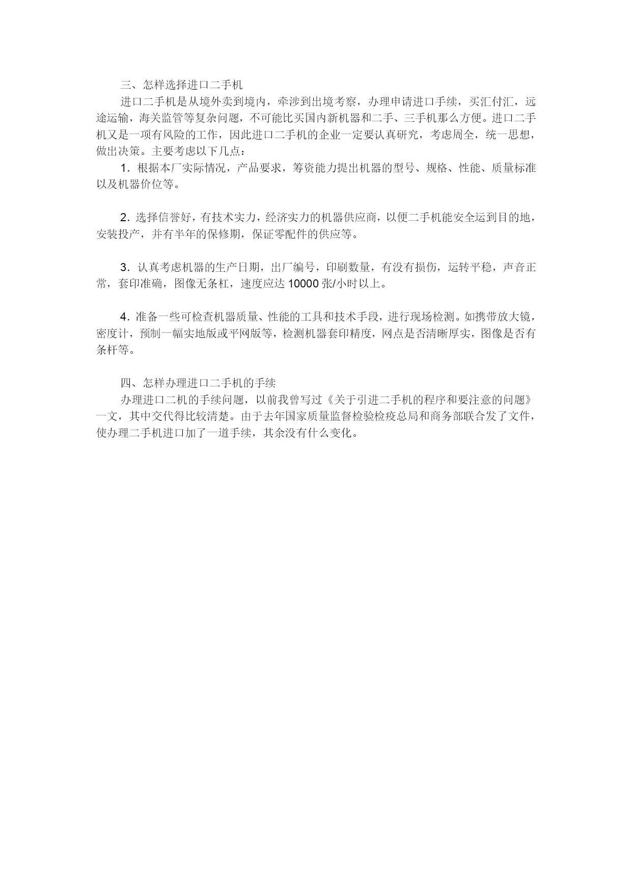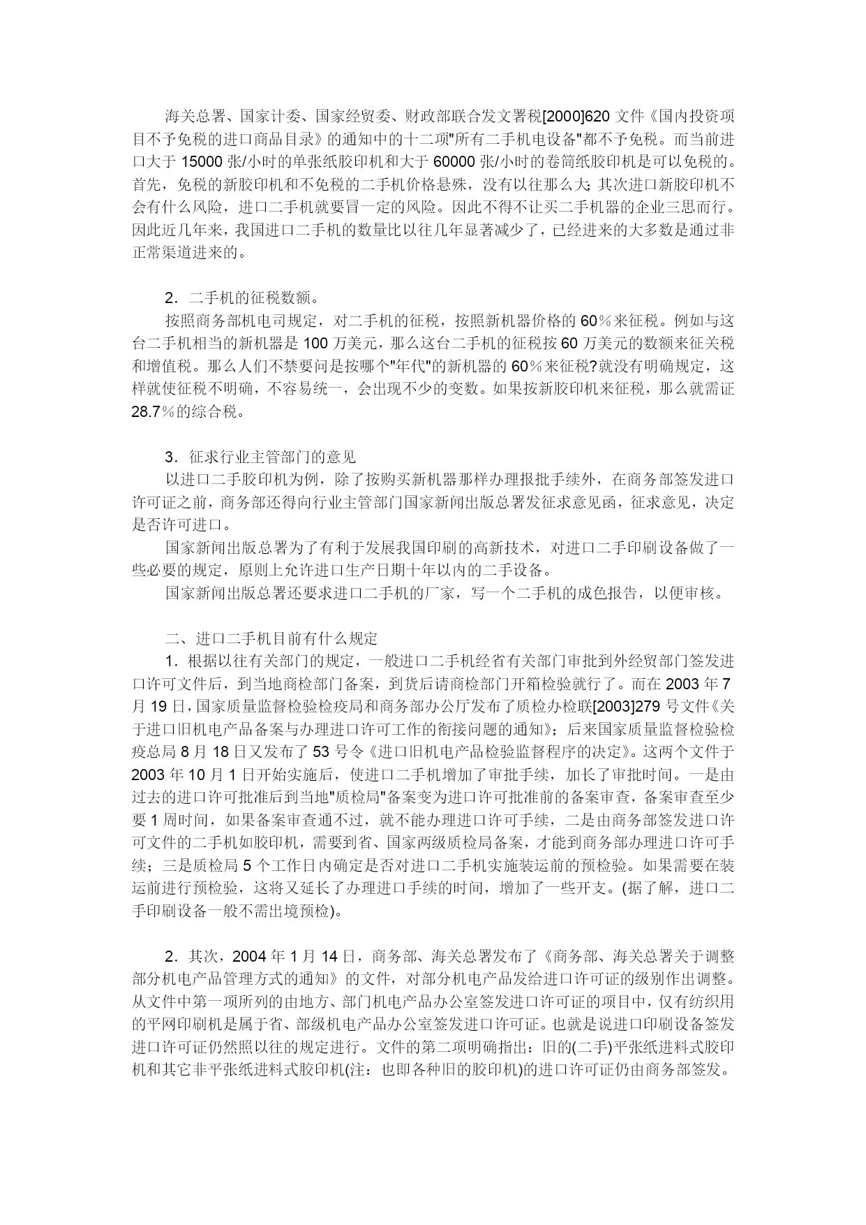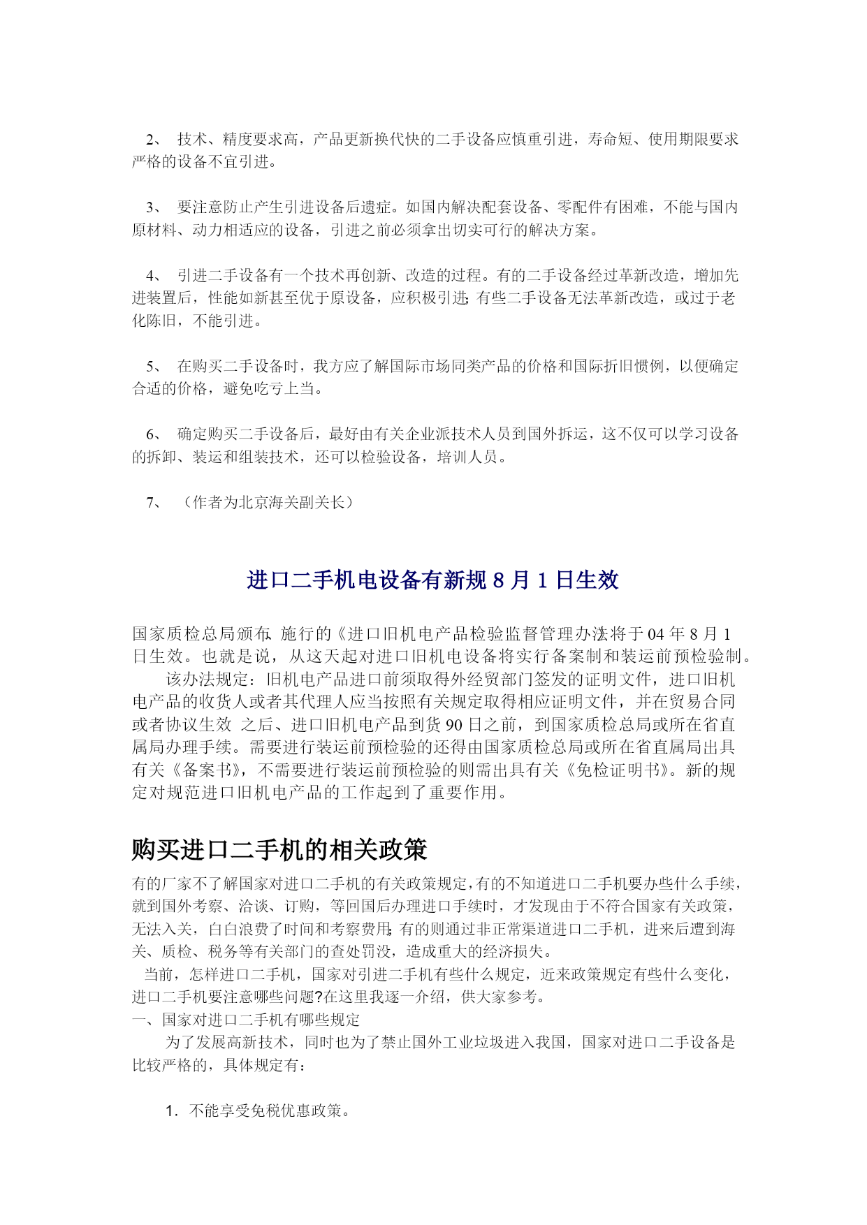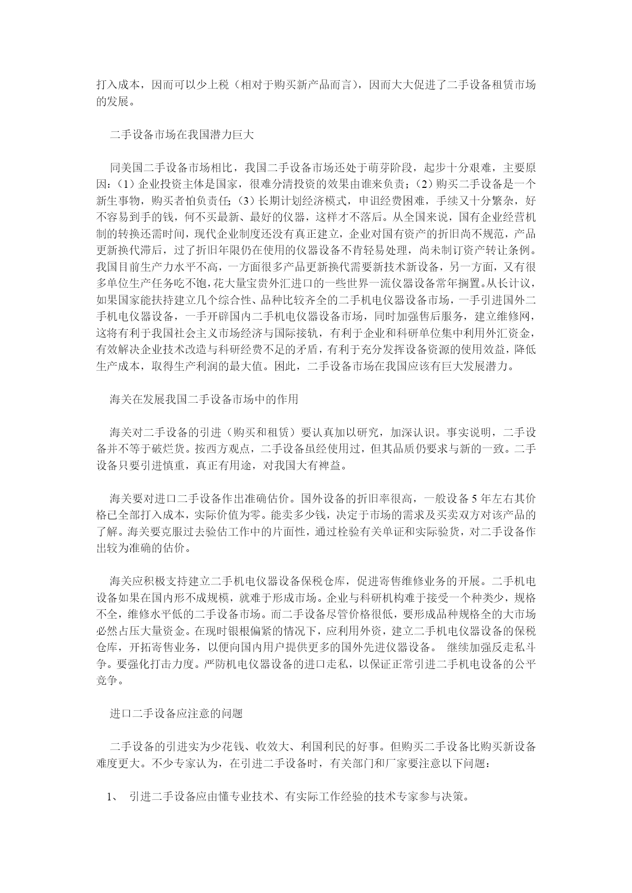 与苏州海关关长就进口二手机电设备手续的探讨苏州市来了一个大型招商团,带队的是苏州市长。同来的有各相关的局长。以前看到海归论坛讨论二手机电设备的进口问题,我就这事与苏州的海关关长探讨了一下。1。国家是否允许进口二手机电设备?国家允许进口二手机电设备,但不允许进口有毒,有污染,不安全的二手设备。2。进口二手设备的手续如何?进口二手设备需要商务部的批准文件,然后进口时由海关查验。商务部文件可以通过国内购买单位申请。如果作为投资部分,还要审核投资的合同条款。3。进口关税如何?进口关税可以查阅海关清单。基本信息可以归纳如下:一般二手设备都可以进口。手续最好由当地接受单位申请办理。关税可以到海关查阅。另外,中国强制实行电气产品的3C认证,我与商品进出口检验局的局长,又询问了一下。3C认证要在国内完成,一般要由国内单位申请。苏州开发区可以在开发区解决,不需要跑到省里去。手续简便一些。如各位还有其他问题,不妨提出来,我再找机会向他们询问。积极发展我国二手设备进口市场去年五六月间,笔者参加了中科院赴美考察组,专程调查了解美国二手机电仪器设备市情况。现根据在美考察之见闻,对发展我国二手机电设备进口市场问题谈点看法。成熟的美国二手机电仪器设备市场目前,全美大约有500多家企业经营二手设备的租凭与销售服务业务。我们考察的五家经营二的仪器设备公司,大、中、小皆有,表明其二手仪器设备市场已趋成熟。其中GERENTAL/LEASE公司是美国规模较大的二手设备租赁、买卖公司之一,具有全国性的网络和良好的实验室,其业务的重点计算机的租赁服务上,已有30多年的发展史。公司现有150多名员工,大约有1亿美元的库存,年营业额1亿美元,其中2500万美元为直接销售,7500万美元为租赁业务收入。美国之所以形成相当规模的二手设备市场,主要缘于二手设备对美国经济的发展、资源配置起着重要的补充作用。美国企业高度重视生产效益,在生产设备的购置上绝不盲目求大、求精、求全,他们依据市场经济发展规律,以市场需求决定产品,根据产品的特定用户范围和用户的需求进行产品设计,生产企业以最经济的方式决定采购生产产品的设备,通常采取三种方式:租赁;二手设备买入;新设备买入。美国很多企业,包括波音公司这种规模较大的企业,都根据产品的订单而增添设备。当生产任务落实时,就到二手设备市场去购置或租赁,一旦生产任务完成,设备闲置下来,又将它们抛售回二手设备市场。其次,美国设备折旧率的计算方式及概念与我国迥然不同,其折旧率大,达每月1。5%(一年18%)左右。一般设备5年左右价值已全部打入成本,其实际价值为零。这就促使企业更新换代,将二手设备尽快推向市场。此外,美国规定租赁仪器设备的费用可一次打入成本,因而可以少上税(相对于购买新产品而言),因而大大促进了二手设备租赁市场的发展。二手设备市场在我国潜力巨大同美国二手设备市场相比,我国二手设备市场还处于萌芽阶段,起步十分艰难,主要原因:(1)企业投资主体是国家,很难分清投资的效果由谁来负责;(2)购买二手设备是一个新生事物,购买者怕负责任;(3)长期计划经济模式,申诅经费困难,手续又十分繁杂,好不容易到手的钱,何不买最新、最好的仪器,这样才不落后。从全国来说,国有企业经营机制的转换还需时间,现代企业制度还没有真正建立,企业对国有资产的折旧尚不规范,产品更新换代滞后,过了折旧年限仍在使用的仪器设备不肯轻易处理,尚未制订资产转让条例。我国目前生产力水平不高,一方面很多产品更新换代需要新技术新设备,另一方面,又有很多单位生产任务吃不饱,花大量宝贵外汇进口的一些世界一流仪器设备常年搁置。从长计议,如果国家能扶持建立几个综合性、品种比较齐全的二手机电仪器设备市场,一手引进国外二手机电仪器设备,一手开辟国内二手机电仪器设备市场,同时加强售后服务,建立维修网,这将有利于我国社会主义市场经济与国际接轨,有利于企业和科研单位集中利用外汇资金,有效解决企业技术改造与科研经费不足的矛盾,有利于充分发挥设备资源的使用效益,降低生产成本,取得生产利润的最大值。困此,二手设备市场在我国应该有巨大发展潜力。海关在发展我国二手设备市场中的作用海关对二手设备的引进(购买和租赁)要认真加以研究,加深认识。事实说明,二手设备并不等于破烂货。按西方观点,二手设备虽经使用过,但其品质仍要求与新的一致。二手设备只要引进慎重,真正有用途,对我国大有裨益。海关要对进口二手设备作出准确估价。国外设备的折旧率很高,一般设备5年左右其价格已全部打入成本,实际价值为零。能卖多少钱,决定于市场的需求及买卖双方对该产品的了解。海关要克服过去验估工作中的片面性,通过栓验有关单证和实际验货,对二手设备作出较为准确的估价。海关应积极支持建立二手机电仪器设备保税仓库,促进寄售维修业务的开展。二手机电设备如果在国内形不成