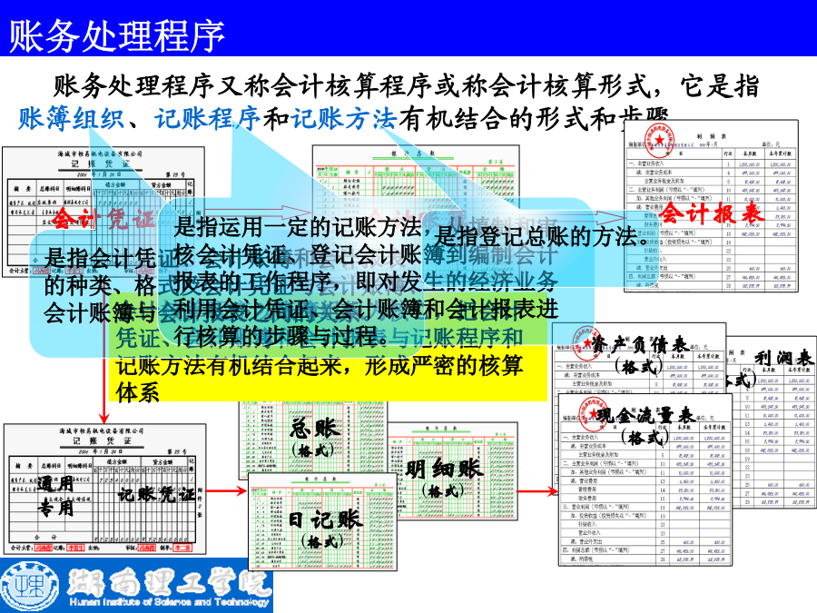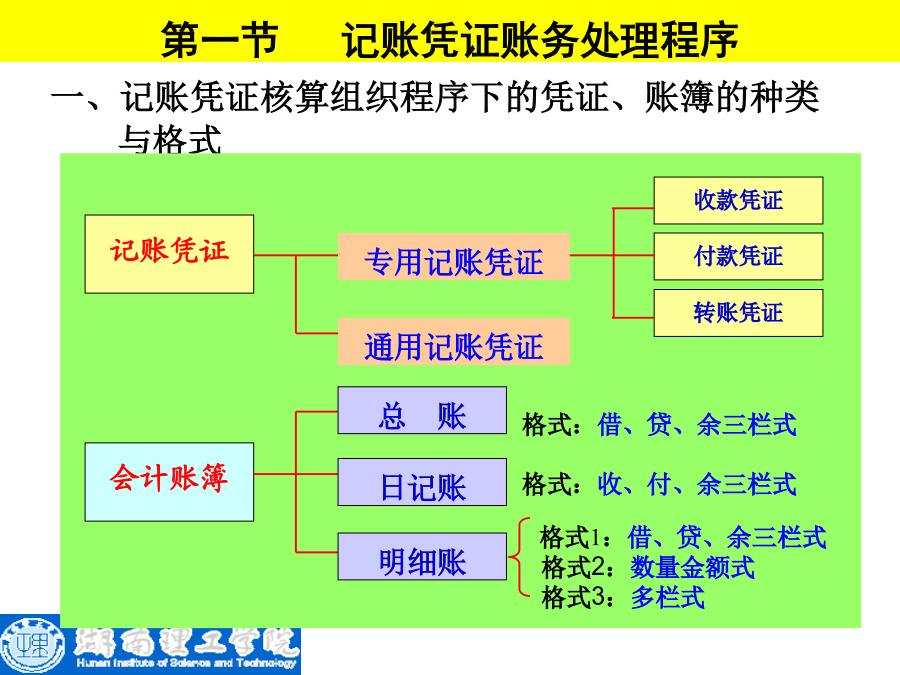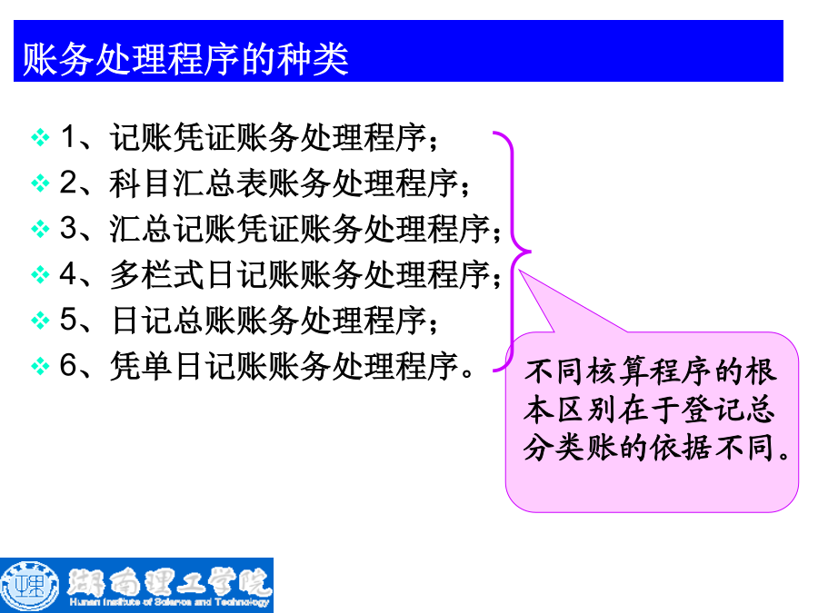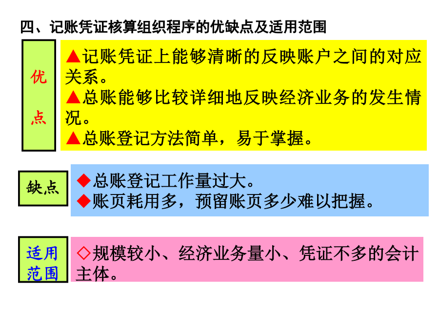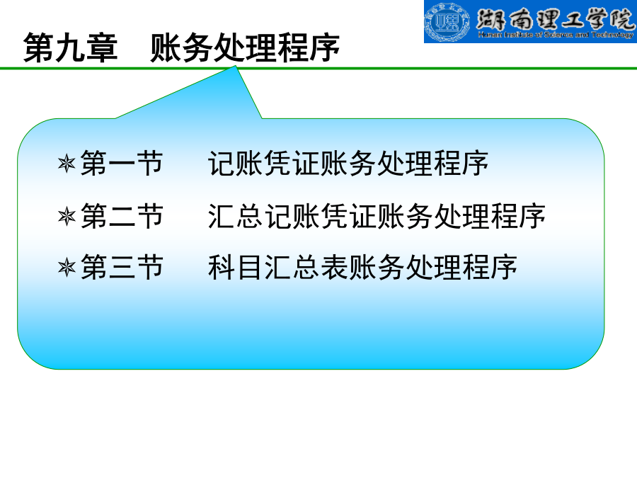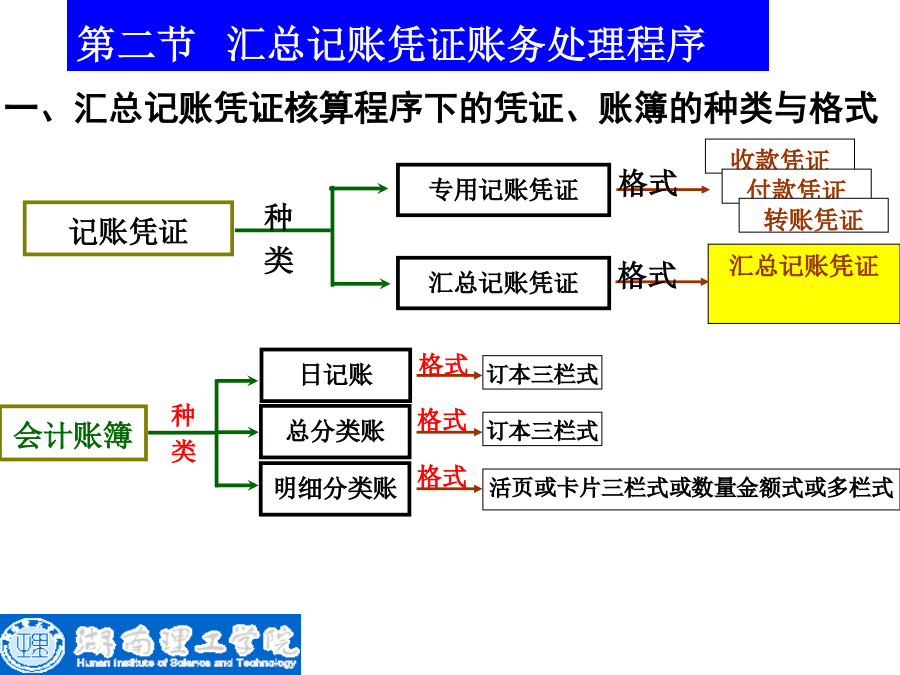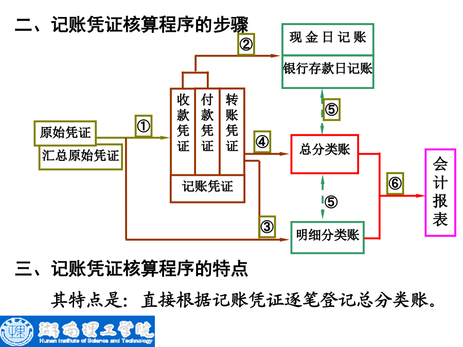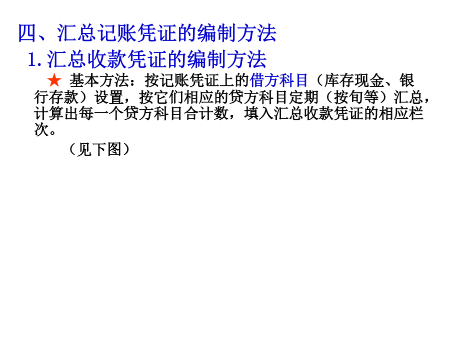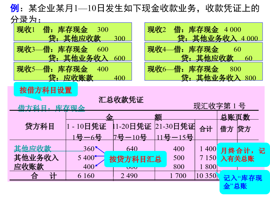 第九章账务处理程序账务处理程序账务处理程序的种类一、记账凭证核算组织程序下的凭证、账簿的种类与格式三、记账凭证核算程序的特点四、记账凭证核算组织程序的优缺点及适用范围一、汇总记账凭证核算程序下的凭证、账簿的种类与格式二、汇总记账凭证核算组织程序下账务处理的基本步骤四、汇总记账凭证的编制方法1.汇总收款凭证的编制方法★基本方法:按记账凭证上的借方科目(库存现金、银行存款)设置,按它们相应的贷方科目定期(按旬等)汇总,计算出每一个贷方科目合计数,填入汇总收款凭证的相应栏次。(见下图)例:某企业某月1—10日发生如下现金收款业务,收款凭证上的分录为:★注意事项:为了便于汇总收款凭证,在编制收款凭证的分录时,分录形式最好是一借一贷、一借多贷,不要多借一贷或多借多贷。2.汇总付款凭证的编制方法例:某企业某月1—10日发生如下银行存款付款业务,付款凭证上的分录为:★注意事项:为了便于汇总付款凭证,在编制付款凭证的分录时,分录形式最好是一借一贷、多借一贷,不要一借多贷或多借多贷。因为编制这样的记账凭证同样存在记账凭证在汇总过程中由于被重复使用而容易出错,以及分录中不能清晰的反映账户之间的对应关系等问题。3.汇总转账凭证的编制方法转1—借:生产成本2500贷:原材料2500★注意事项:为便于汇总转账凭证的编制,在编制转账凭证的分录时,分录形式最好是一借一贷、多借一贷,不要一借多贷或多借多贷。五、汇总记账凭证账务处理程序的优缺点及适用范围第三节科目汇总表账务处理程序二、科目汇总表核算程序的步骤1、编制科目汇总表编制日期应根据实际情况填写,本例应为2008年1月1日至1月10日。说明:科目汇总表下总账填制方法1、优点减少总账工作量可试算平衡实用范围较广2、缺点无法反映账户间对应关系科目汇总表工作量大3、适用范围任何企业主要规模较大、经济业务量较多、凭证较多的会计主体)24