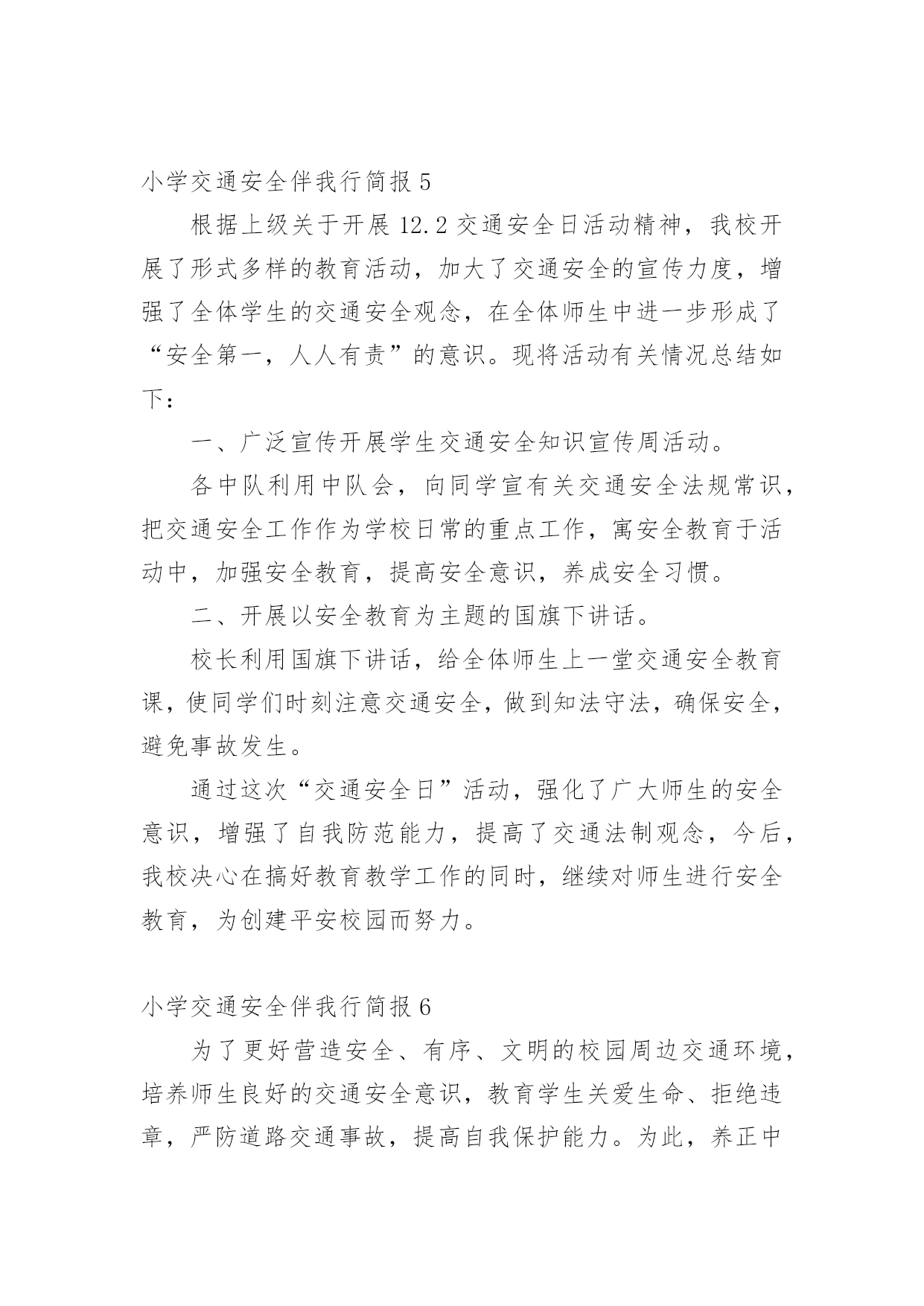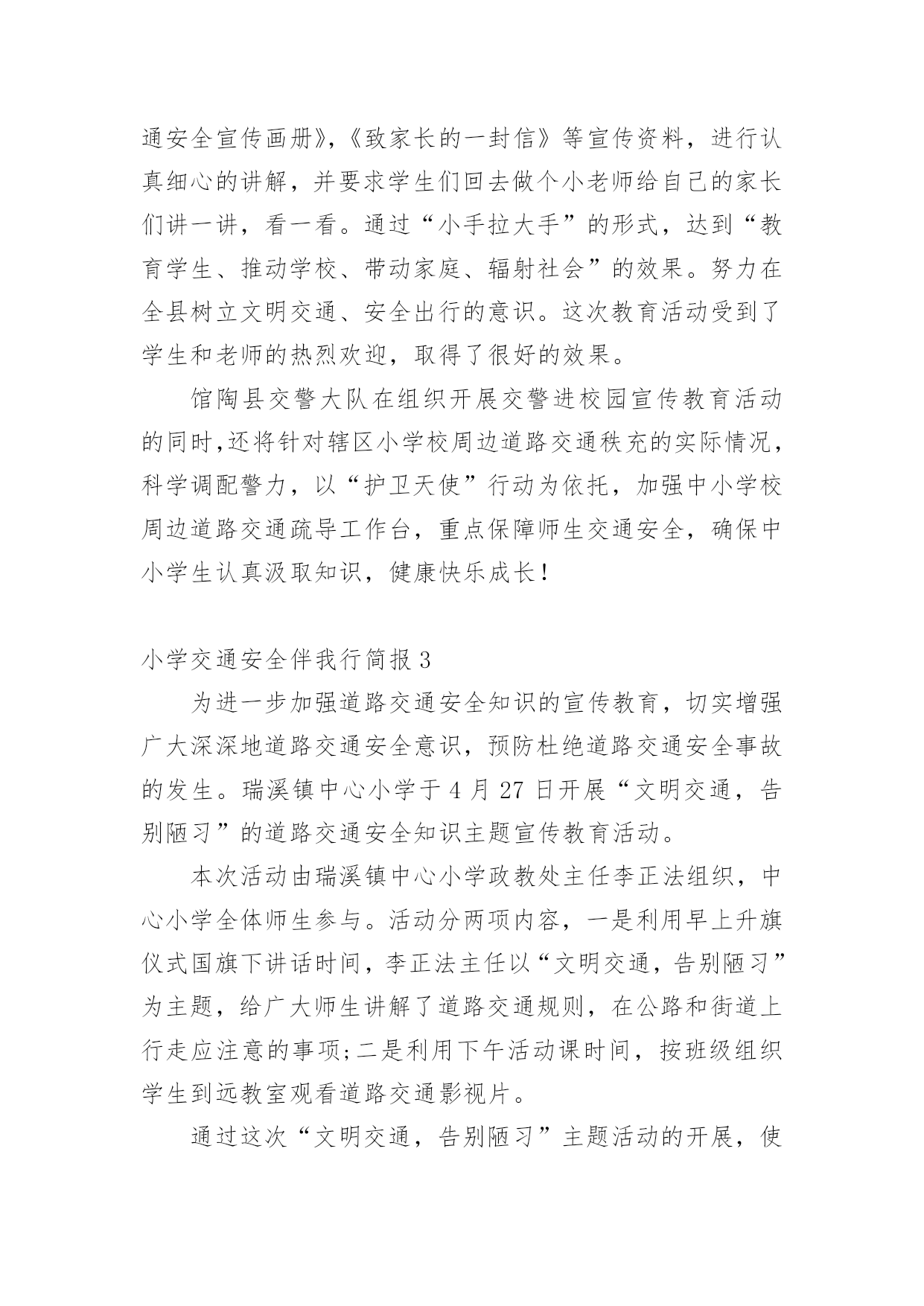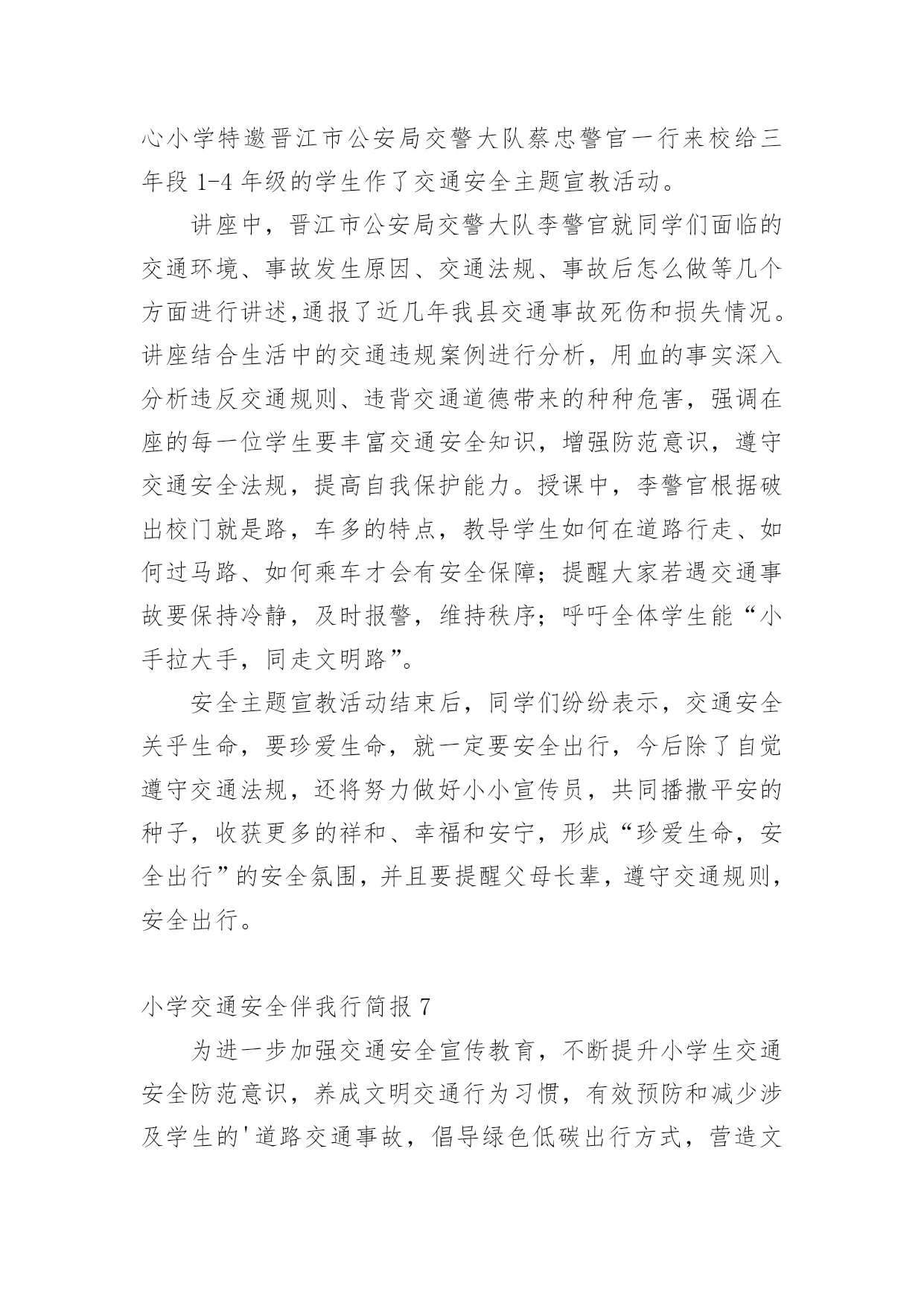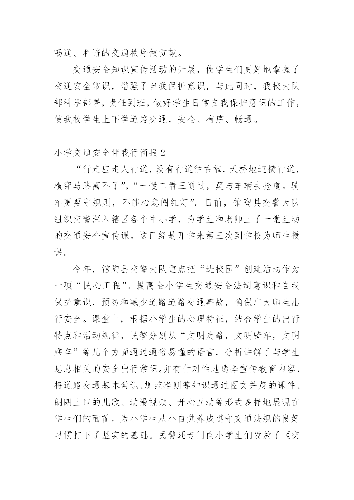 小学交通安全伴我行简报小学交通安全伴我行简报(通用11篇)在发展不断提速的社会中,越来越多人会去使用简报,简报具有简、精、快、新、实、活和连续性等特点。你知道什么样的简报才能算得上是好的简报吗?下面是小编精心整理的小学交通安全伴我行简报(通用11篇),欢迎阅读,希望大家能够喜欢。小学交通安全伴我行简报1为了进一步提高漩小学生交通安全意识和自我安全防护意识,维护广大师生生命财产安全。近日,漩口小学开展了以“关爱学生,平安出行”为主题的道路交通安全宣传活动。大队辅导员为学生们上了交通安全知识讲座课,在为学生讲解交通安全法律法规的基础上,结合交通安全管理工作的实际情况,仔细为学生们强调过马路应注意的细节,并纠正小学生在参与交通过程中常犯的几种错误。为了强化宣传效果,增强宣传实效,大队辅导员还组织学生观看了交通安全宣传警示光碟和交通安全知识展板、分发了交通安全知识资料,对在校学生进行交通安全教育,力争把宣传教育的内容融入到小学生的法制教育和社会实践活动当中。还通过开展“小手拉大手”活动,以自身为宣传源,积极向爸爸妈妈、爷爷奶奶和亲戚朋友宣传交通安全知识,让更多的人了解交通安全知识,文明参与交通,为创造畅通、和谐的交通秩序做贡献。交通安全知识宣传活动的开展,使学生们更好地掌握了交通安全常识,增强了自我保护意识,与此同时,我校大队部科学部署,责任到班,做好学生日常自我保护意识的工作,使我校学生上下学道路交通,安全、有序、畅通。小学交通安全伴我行简报2“行走应走人行道,没有行道往右靠,天桥地道横行道,横穿马路离不了”,“一慢二看三通过,莫与车辆去抢道。骑车更要守规则,不能心急闯红灯”。日前,馆陶县交警大队组织交警深入辖区各个中小学,为学生和老师上了一堂生动的交通安全宣传课。这已经是开学来第三次到学校为师生授课。今年,馆陶县交警大队重点把“进校园”创建活动作为一项“民心工程”。提高全小学生交通安全法制意识和自我保护意识,预防和减少道路道路交通事故,确保广大师生出行安全。课堂上,根据小学生的心理特征,结合学生的出行特点和活动规律,民警分别从“文明走路,文明骑车,文明乘车”等几个方面通过通俗易懂的语言,分析讲解了与学生息息相关的安全出行常识。并有什对性地选择宣传教育内容,将道路交通基本常识、规范准则等知识通过图文并茂的课件、朗朗上口的儿歌、动漫视频、开心互动等形式多样地展现在学生们的面前。为小学生从小自觉养成遵守交通法规的良好习惯打下了坚实的基础。民警还专门向小学生们发放了《交通安全宣传画册》,《致家长的一封信》等宣传资料,进行认真细心的讲解,并要求学生们回去做个小老师给自己的家长们讲一讲,看一看。通过“小手拉大手”的形式,达到“教育学生、推动学校、带动家庭、辐射社会”的效果。努力在全县树立文明交通、安全出行的意识。这次教育活动受到了学生和老师的热烈欢迎,取得了很好的效果。馆陶县交警大队在组织开展交警进校园宣传教育活动的同时,还将针对辖区小学校周边道路交通秩充的实际情况,科学调配警力,以“护卫天使”行动为依托,加强中小学校周边道路交通疏导工作台,重点保障师生交通安全,确保中小学生认真汲取知识,健康快乐成长!小学交通安全伴我行简报3为进一步加强道路交通安全知识的宣传教育,切实增强广大深深地道路交通安全意识,预防杜绝道路交通安全事故的发生。瑞溪镇中心小学于4月27日开展“文明交通,告别陋习”的道路交通安全知识主题宣传教育活动。本次活动由瑞溪镇中心小学政教处主任李正法组织,中心小学全体师生参与。活动分两项内容,一是利用早上升旗仪式国旗下讲话时间,李正法主任以“文明交通,告别陋习”为主题,给广大师生讲解了道路交通规则,在公路和街道上行走应注意的事项;二是利用下午活动课时间,按班级组织学生到远教室观看道路交通影视片。通过这次“文明交通,告别陋习”主题活动的开展,使广大师生学习了解到更多的道路交通安全知识,为促进广大师生严格遵守交通规则,并向身边的人宣传文明交通起到较好的教育作用。小学交通安全伴我行简报4为了全面加强我校的交通安全教育,提高学生的自我保护意识和遵守交通法规的意识,我校开展了“交通安全教育”系列主题活动,使学生进一步认识到交通安全的重要性。活动形式如下:1、在全校范围内进行交通安全宣传。通过电视媒体,远程教育,课外书籍等形式,向广大师生宣传交通安全教育。2、发放一封《给学生和家长交通安全教育公开信》,提高家庭、社会对孩子安全教育的广泛参与度。3、为营造浓厚的宣传气氛,各班以“交通安全教育”为主题办了一期黑板报。4、各班以“交通安全伴我行”为主题,开展一系列有关交通教育的主题班会。学校的各班班主任给学生进行了交通安全方面的教育,并从交通安全引申到对学生的饮食、消防和意外伤害等安全问题的教育,要求同学们把安全意识从学校带进家庭,从家庭带到社会。