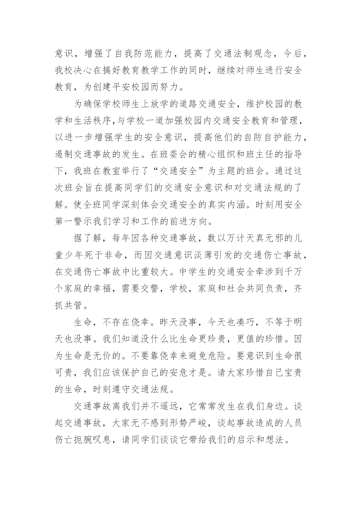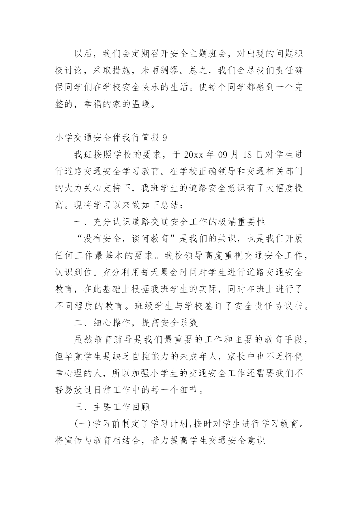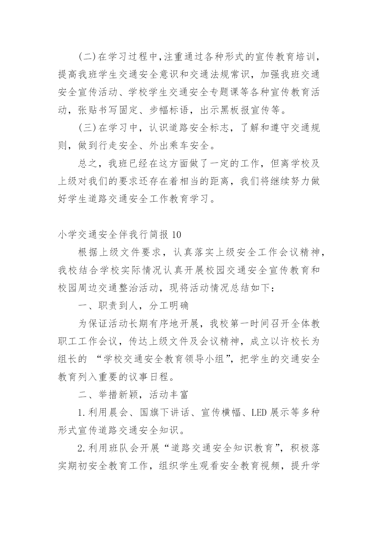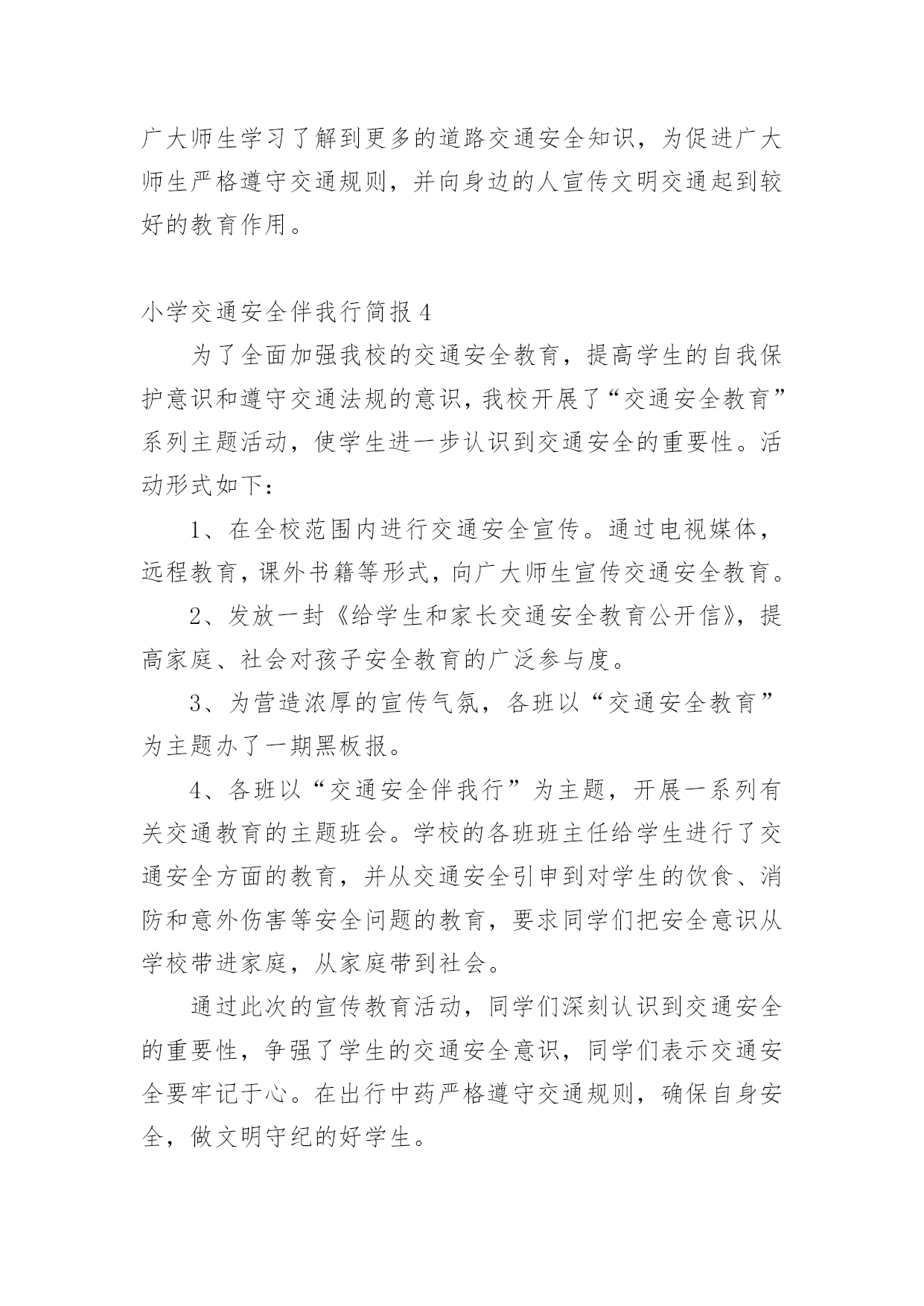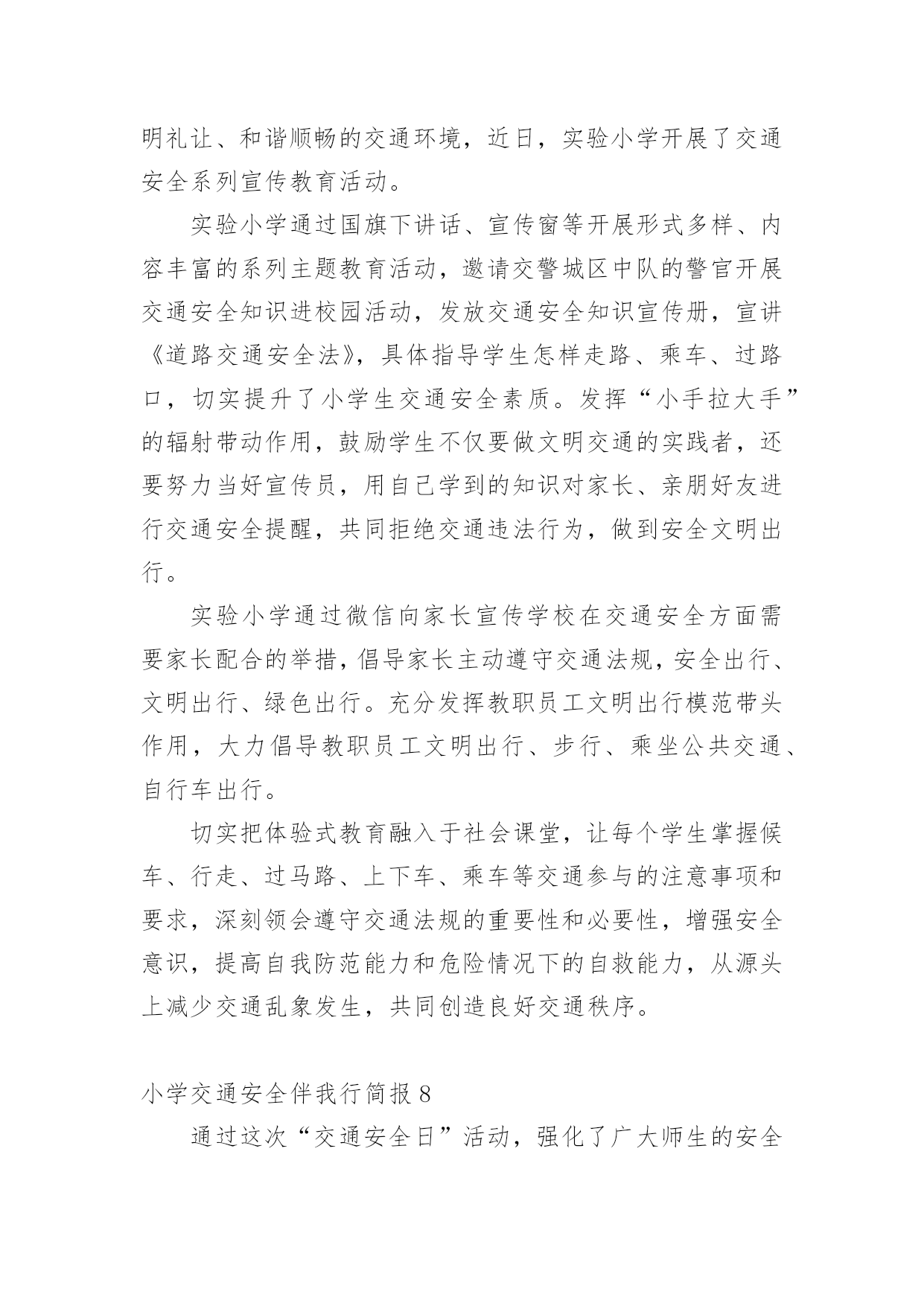 小学交通安全伴我行简报小学交通安全伴我行简报(通用11篇)在发展不断提速的社会中,越来越多人会去使用简报,简报具有简、精、快、新、实、活和连续性等特点。你知道什么样的简报才能算得上是好的简报吗?下面是小编精心整理的小学交通安全伴我行简报(通用11篇),欢迎阅读,希望大家能够喜欢。小学交通安全伴我行简报1为了进一步提高漩小学生交通安全意识和自我安全防护意识,维护广大师生生命财产安全。近日,漩口小学开展了以“关爱学生,平安出行”为主题的道路交通安全宣传活动。大队辅导员为学生们上了交通安全知识讲座课,在为学生讲解交通安全法律法规的基础上,结合交通安全管理工作的实际情况,仔细为学生们强调过马路应注意的细节,并纠正小学生在参与交通过程中常犯的几种错误。为了强化宣传效果,增强宣传实效,大队辅导员还组织学生观看了交通安全宣传警示光碟和交通安全知识展板、分发了交通安全知识资料,对在校学生进行交通安全教育,力争把宣传教育的内容融入到小学生的法制教育和社会实践活动当中。还通过开展“小手拉大手”活动,以自身为宣传源,积极向爸爸妈妈、爷爷奶奶和亲戚朋友宣传交通安全知识,让更多的人了解交通安全知识,文明参与交通,为创造畅通、和谐的交通秩序做贡献。交通安全知识宣传活动的开展,使学生们更好地掌握了交通安全常识,增强了自我保护意识,与此同时,我校大队部科学部署,责任到班,做好学生日常自我保护意识的工作,使我校学生上下学道路交通,安全、有序、畅通。小学交通安全伴我行简报2“行走应走人行道,没有行道往右靠,天桥地道横行道,横穿马路离不了”,“一慢二看三通过,莫与车辆去抢道。骑车更要守规则,不能心急闯红灯”。日前,馆陶县交警大队组织交警深入辖区各个中小学,为学生和老师上了一堂生动的交通安全宣传课。这已经是开学来第三次到学校为师生授课。今年,馆陶县交警大队重点把“进校园”创建活动作为一项“民心工程”。提高全小学生交通安全法制意识和自我保护意识,预防和减少道路道路交通事故,确保广大师生出行安全。课堂上,根据小学生的心理特征,结合学生的出行特点和活动规律,民警分别从“文明走路,文明骑车,文明乘车”等几个方面通过通俗易懂的语言,分析讲解了与学生息息相关的安全出行常识。并有什对性地选择宣传教育内容,将道路交通基本常识、规范准则等知识通过图文并茂的课件、朗朗上口的儿歌、动漫视频、开心互动等形式多样地展现在学生们的面前。为小学生从小自觉养成遵守交通法规的良好习惯打下了坚实的基础。民警还专门向小学生们发放了《交通安全宣传画册》,《致家长的一封信》等宣传资料,进行认真细心的讲解,并要求学生们回去做个小老师给自己的家长们讲一讲,看一看。通过“小手拉大手”的形式,达到“教育学生、推动学校、带动家庭、辐射社会”的效果。努力在全县树立文明交通、安全出行的意识。这次教育活动受到了学生和老师的热烈欢迎,取得了很好的效果。馆陶县交警大队在组织开展交警进校园宣传教育活动的同时,还将针对辖区小学校周边道路交通秩充的实际情况,科学调配警力,以“护卫天使”行动为依托,加强中小学校周边道路交通疏导工作台,重点保障师生交通安全,确保中小学生认真汲取知识,健康快乐成长!小学交通安全伴我行简报3为进一步加强道路交通安全知识的宣传教育,切实增强广大深深地道路交通安全意识,预防杜绝道路交通安全事故的发生。瑞溪镇中心小学于4月27日开展“文明交通,告别陋习”的道路交通安全知识主题宣传教育活动。本次活动由瑞溪镇中心小学政教处主任李正法组织,中心小学全体师生参与。活动分两项内容,一是利用早上升旗仪式国旗下讲话时间,李正法主任以“文明交通,告别陋习”为主题,给广大师生讲解了道路交通规则,在公路和街道上行走应注意的事项;二是利用下午活动课时间,按班级组织学生到远教室观看道路交通影视片。通过这次“文明交通,告别陋习”主题活动的开展,使广大师生学习了解到更多的道路交通安全知识,为促进广大师生严格遵守交通规则,并向身边的人宣传文明交通起到较好的教育作用。小学交通安全伴我行简报4为了全面加强我校的交通安全教育,提高学生的自我保护意识和遵守交通法规的意识,我校开展了“交通安全教育”系列主题活动,使学生进一步认识到交通安全的重要性。活动形式如下:1、在全校范围内进行交通安全宣传。通过电视媒体,远程教育,课外书籍等形式,向广大师生宣传交通安全教育。2、发放一封《给学生和家长交通安全教育公开信》,提高家庭、社会对孩子安全教育的广泛参与度。3、为营造浓厚的宣传气氛,各班以“交通安全教育”为主题办了一期黑板报。4、各班以“交通安全伴我行”为主题,开展一系列有关交通教育的主题班会。学校的各班班主任给学生进行了交通安全方面的教育,并从交通安全引申到对学生的饮食、消防和意外伤害等安全问题的教育,要求同学们把安全意识从学校带进家庭,从家庭带到社会。