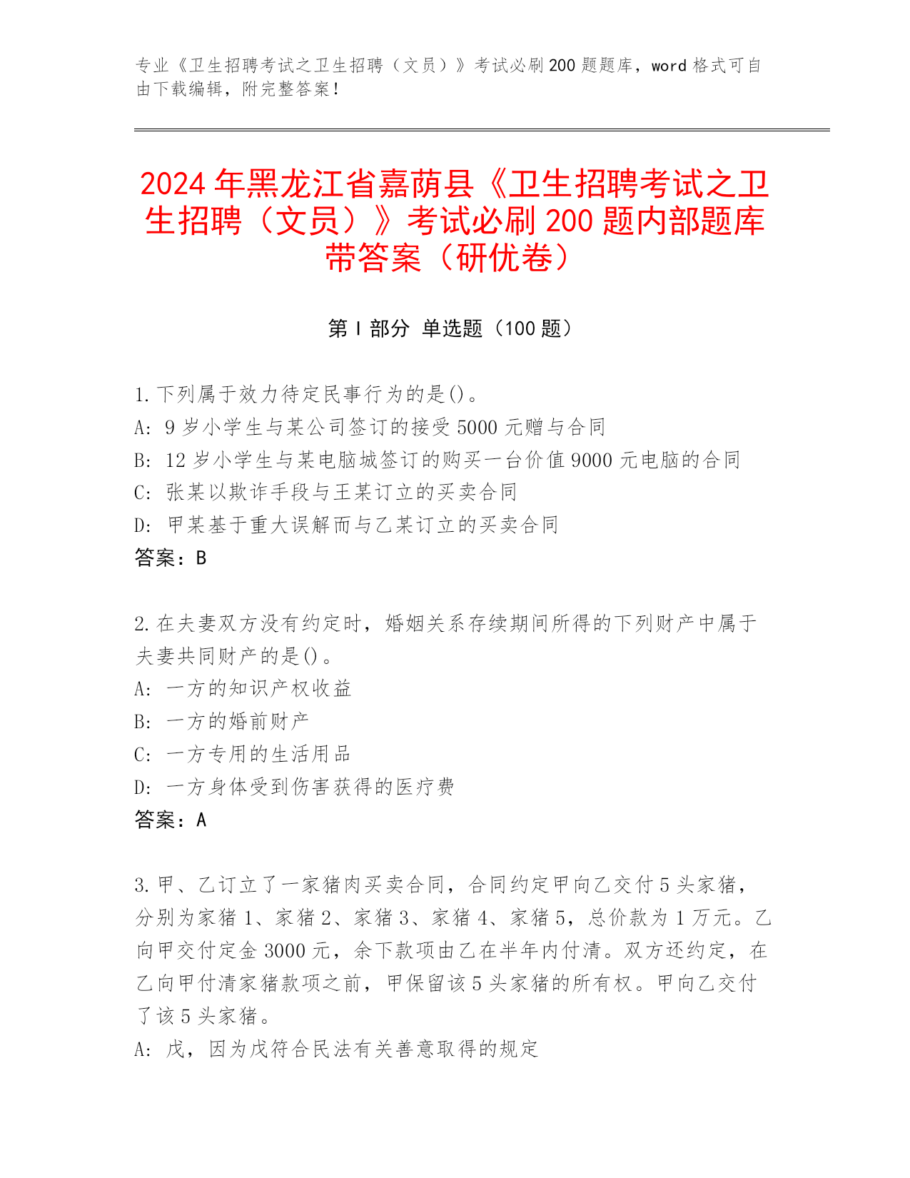 2024年黑龙江省嘉荫县《卫生招聘考试之卫生招聘(文员)》考试必刷200题内部题库带答案(研优卷)