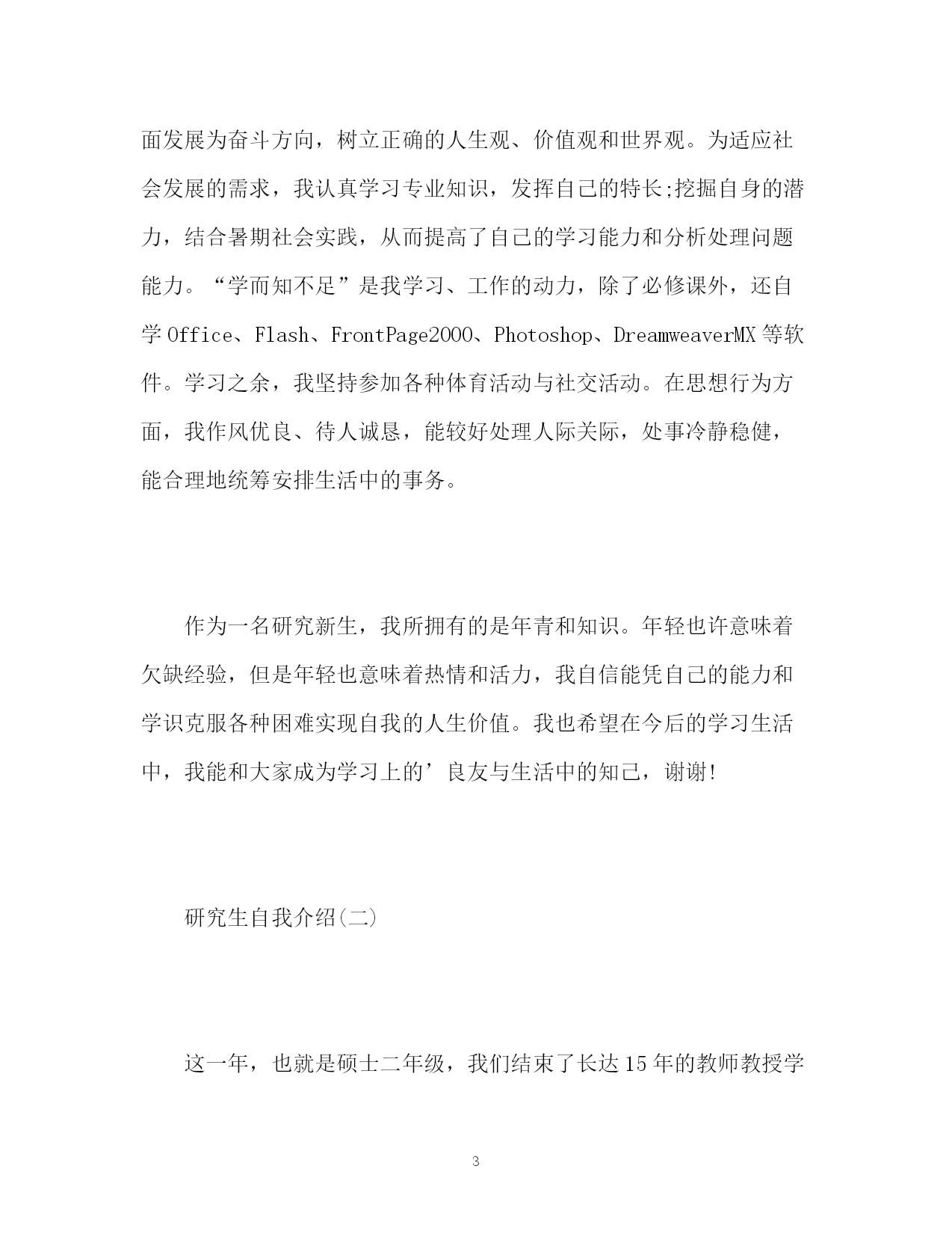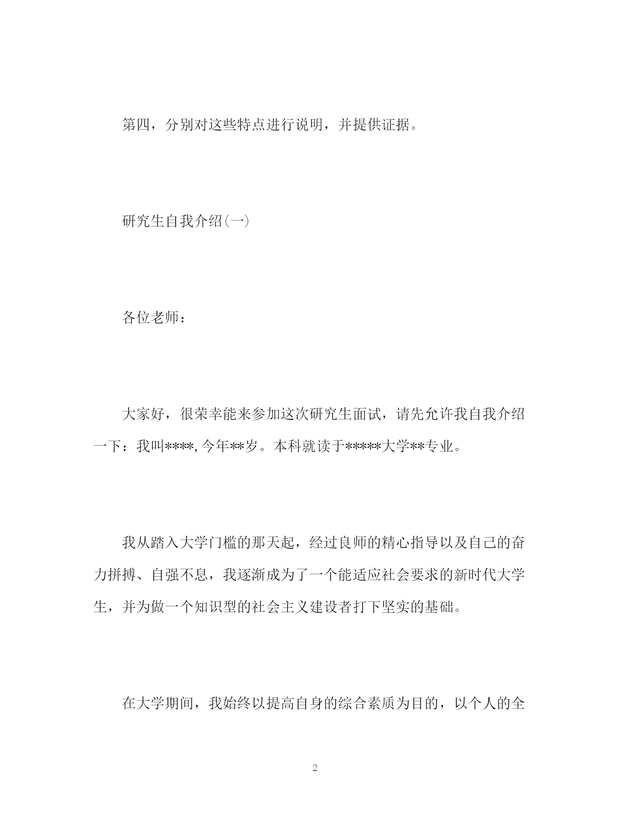 此资料由网络收集而来,如有侵权请告知上传者立即删除。资料共分享,我们负责传递知识。PAGEPAGE5研究生自我介绍怎么写研究生自我介绍怎么写面试自我介绍的框架:首先,一句话自我表明身份,此时音质和音色好的同学,马上就能吸引我们的注意力。第二,一段话简介自己的经历,而且强调的都是我们喜欢听的经历。第三,几句话概括一下自己的特点,这是关键,我们希望听到我们需要的特点。第四,分别对这些特点进行说明,并提供证据。研究生自我介绍(一)各位老师:大家好,很荣幸能来参加这次研究生面试,请先允许我自我介绍一下:我叫****,今年**岁。本科就读于*****大学**专业。我从踏入大学门槛的那天起,经过良师的精心指导以及自己的奋力拼搏、自强不息,我逐渐成为了一个能适应社会要求的新时代大学生,并为做一个知识型的社会主义建设者打下坚实的基础。在大学期间,我始终以提高自身的综合素质为目的,以个人的全面发展为奋斗方向,树立正确的人生观、价值观和世界观。为适应社会发展的需求,我认真学习专业知识,发挥自己的特长;挖掘自身的潜力,结合暑期社会实践,从而提高了自己的学习能力和分析处理问题能力。“学而知不足”是我学习、工作的动力,除了必修课外,还自学Office、Flash、FrontPage2000、Photoshop、DreamweaverMX等软件。学习之余,我坚持参加各种体育活动与社交活动。在思想行为方面,我作风优良、待人诚恳,能较好处理人际关际,处事冷静稳健,能合理地统筹安排生活中的事务。作为一名研究新生,我所拥有的是年青和知识。年轻也许意味着欠缺经验,但是年轻也意味着热情和活力,我自信能凭自己的能力和学识克服各种困难实现自我的人生价值。我也希望在今后的学习生活中,我能和大家成为学习上的’良友与生活中的知己,谢谢!研究生自我介绍(二)这一年,也就是硕士二年级,我们结束了长达15年的教师教授学生自学的学习模式,开始了科研的初步探索。这是一种与单纯汲取知识完全不同的模式,需要很多的主观能动性的创新。这种转变是一个痛苦的过程,唯有经历过这种痛苦,才会渐渐成长起来。我们渐渐地对搞科研入了门,却马上面临着毕业了。说实话,很是不舍。不舍自己破茧重生后积累的经验迅速的贬值,封尘于人生的藏宝箱。幸好,做学问,学业亦或科研,上升到哲学的角度,与做其他事情都是有共性的。在这一年之中,我更大的收获是对自己性格方面、处理事情方面的历练。科研是需要独立完成的。从最初的无所适从,到现在的渐渐地适应自己给自己提出一个思路,然后当机立断的执行,并对自己的创意、自己的执行力负责。这种独立性的培养,这种责任心的培养,对整个人生是大有裨益的。另外,科研极大的磨练了我的心智。除却培养了我的独立性以外,大大提升了我的执行力。渐渐地明白,有些事情是逃不掉的,无论早晚,自己去做并且做好,没有人可以代劳,早执行早得出结果,而且无论再繁杂,都要一步一步按部就班地执行,急躁不得。这一年的磨练让我的行动力和耐力得到极大的提升。这一年,我离开了从20岁到25岁待久了习惯了它的美丽、它的亲切的校园。来到了天津的这个研究所做联合培养生。在一个熟悉的环境呆得太久,对新环境的适应能力都有些忘却了。