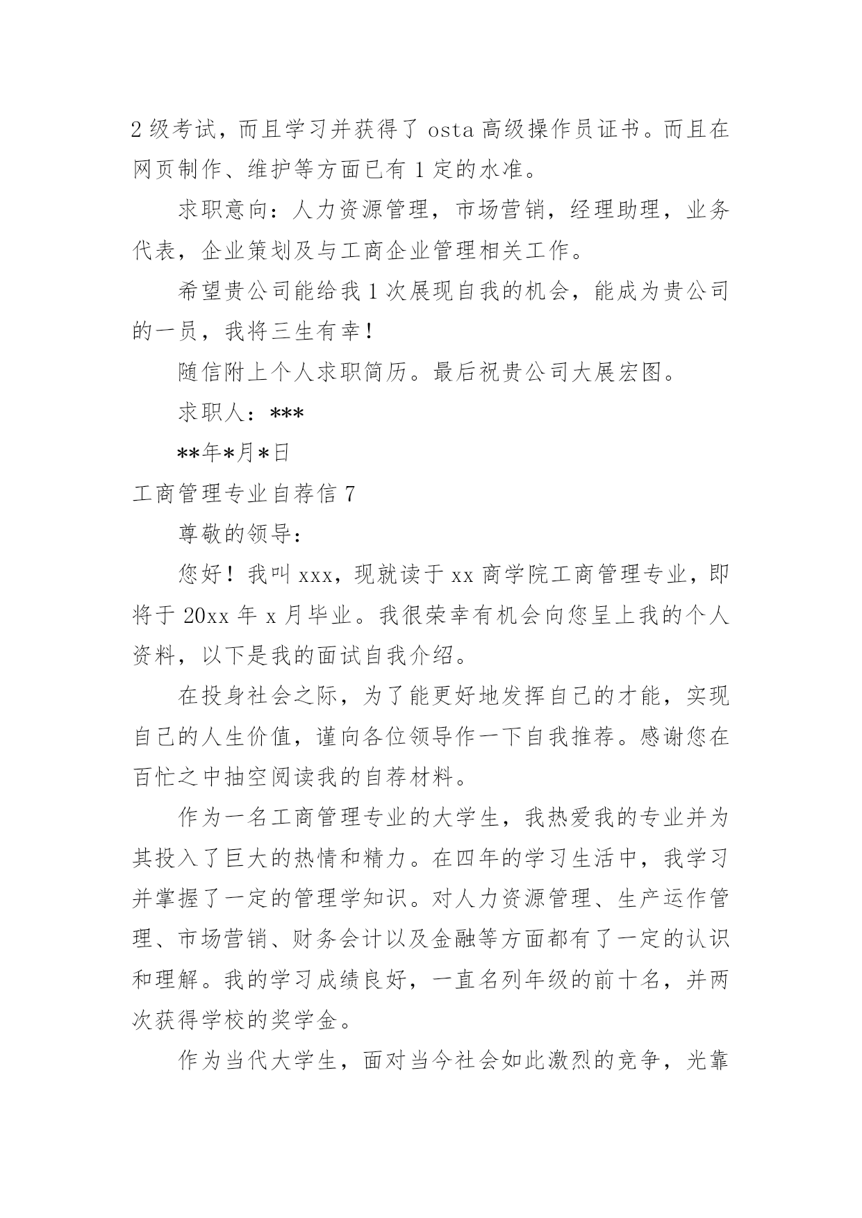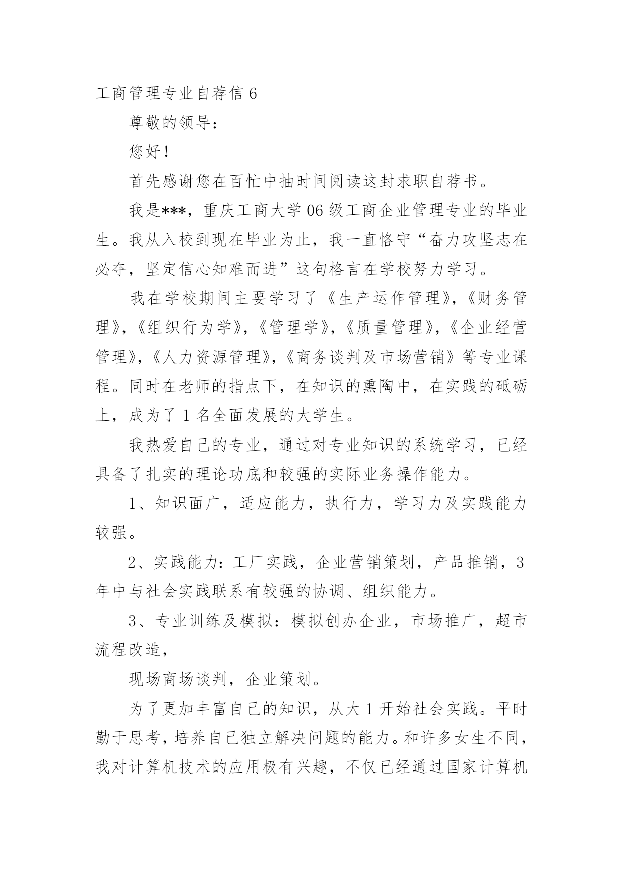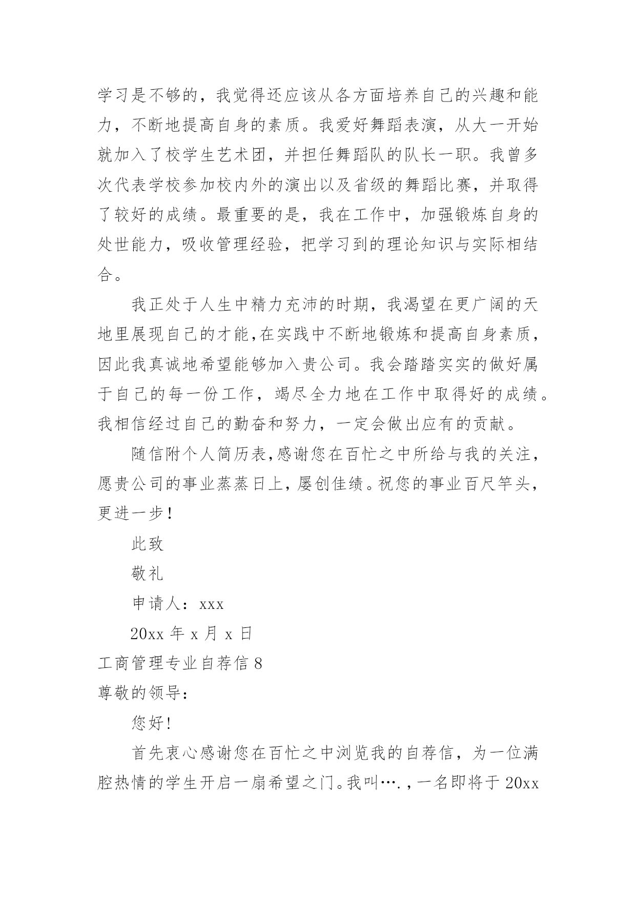 工商管理专业自荐信工商管理专业自荐信在一步步向前发展的社会中,自荐信的使用范围越来越大,通过自荐信,我们可以展示自己的长处。那么问题来了,自荐信应该怎么写?下面是小编整理的工商管理专业自荐信,仅供参考,希望能够帮助到大家。工商管理专业自荐信1尊敬的领导:您好!我叫孙旭楠,毕业于首都经济贸易大学工商管理专业。普通的院校,普通的我却拥有一颗不甘于平凡的心。我,自信,乐观,敢于迎接一切挑战。虽然只是一名普通的本科毕业生,但是,年轻是我的本钱,拼搏是我的天性,努力是我的责任,我坚信,成功定会成为必然。经过大学四年锤炼,在面对未来事业的选择时,我对自己有了更清醒的认识,由于我在大学中锻练了较好的学习工作能力,加上“努力做到最好”的天性使然,四年中,除了完成基本的课程教学外,我还积极参加各种学校的活动,但我并没有满足,因为我知道,在大学是学习与积累的过程,为了更好适应日后的工作,还不断地充实自己,参加了大学英语四级,并顺利通过。积极参加校园活动,如校园双选会,宿舍文化节等活动。假期中,我为了提高自己的能力,在松下电器,西门子中国有限公司参加实习。这些都大大提升我的沟通能力和交往能力,培养了我具备良好的组织策划能力和极佳的团队协作能力。但是,我知道,一切的辉煌与失败早已成为过去,我将要面对的是更具挑战的未来。我虽然只是一个普通的本科毕业生,但大学四年教会了我什么叫“学无止境”,我相信,在我不断努力刻苦的学习中,我一定能够胜任这份高尚的职业。一直坚信“天道酬勤”,我的人生信条是“人生在勤,不索何获”。给我一次机会,我会尽职尽责。一个人惟有把所擅长的投入到社会中才能使自我价值得以实现。别人不愿做的,我会义不容辞的做好;别人能做到的,我会尽最大努力做到更好!发挥自身优势,我愿与贵单位同事携手共进,共创辉煌!感谢您在百忙之中读完我的求职简历,诚祝事业蒸蒸日上!此致敬礼!自荐人:孙**20xx年11月工商管理专业自荐信2尊敬的领导:感谢您抽空垂阅我的自荐信!本人xxx,又名xxx;男,19xx年生于江西省修水县。父母都是知识分子,在国家机关工作,这使得我从小就受到了良好的家庭教育,而且在父母的言传身教下我很早就树立了自己正确的人生观和价值观,并懂得了如何在生活中磨炼自己。20xx年xx月,我被蓝天学院录取,并选择了适合自己学习的国际贸易与工商管理专业。一直以来我学习刻苦,勤于钻研,在三年内,学院给了我得智体美全面的教育,科学的安排了;国际贸易、国际工商管理、财务会计、国际结算、市场营销等课程。三年期间修完全部课程并顺利地通过了计算机国家二级、英语三级等等级考试。适应社会和公司对人才的要求。为了锻炼自己、服务大家,在大学期间我积极地加入了学院青年志愿者协会、现代企业管理协会等学生社团。在社团中,由于我的积极工作、努力学习,为社团做出了一定的贡献,取得了一定的成绩,曾分别在五四评优和学期评优中被评为“优秀青年志愿者”和企业管理协会“优秀会员”。此外我还以个人名义参加了由上海《萌芽》杂志社和全国多所名牌高校联合举办的“中华杯第四届全国新概念作文大赛”,并获二等奖。大一、大二暑假期间为了培养自己的能力,了解社会,我先后两次到沿海城市做过暑期工,而且两次所选的工作属于两个不同的行业,这使得我接触和了解了更多的事物,并且学懂了粤语,积累了一定的社会实践经验。我性格开朗,勤奋好学,接受能力强,有强烈的集体荣誉感和上进心。希望您能给我一次施展才能的机会,相信我定能胜任我的工作,为公司的发展作出我最大的贡献。xxx20xx年xx月xx日工商管理专业自荐信3尊敬的领导:您好!首先感谢您在百忙中抽时间阅读这封求职自荐书。我是xxx,重庆工商大学xx级工商企业管理专业的毕业生。从20xx年入校到现在,我直恪守“奋力攻坚志在必夺,坚定信心知难而进”这句格言在学校努力学习。在学校期间主要学习了《生产运作管理》、《财务管理》、《组织行为学》、《管理学》、《质量管理》、《企业经营管理》、《人力资源管理》、《商务谈判及市场营销》等专业课程。同时在老师的指点下,在知识的熏陶中,在实践的砥砺上,成为了名全面发展的大学生。我热爱自己的专业,通过对专业知识的系统学习,已经具备了扎实的理论功底和较强的实际业务操作能力。知识面广,适应能力,执行力,学习力及实践能力较强。2是实践能力:工厂实践,企业营销策划,产品推销,3年中与社会实践联系有较强的协调、组织能力。3是专业训练及模拟:模拟创办企业,市场推广,超市流程改造,现场商场谈判,企业策划。为了更加丰富自己的知识,从大开始社会实践。平时勤于思考,培养自己独立解决问题的能力。和许多女生不同,我对计算机技术的应用极有兴趣,不仅已经通过国家计算机2级考试,而且学习并获得了osta高级操作员证书。而且在网页制作、维护等方面已有定的水准。求职意向:人力