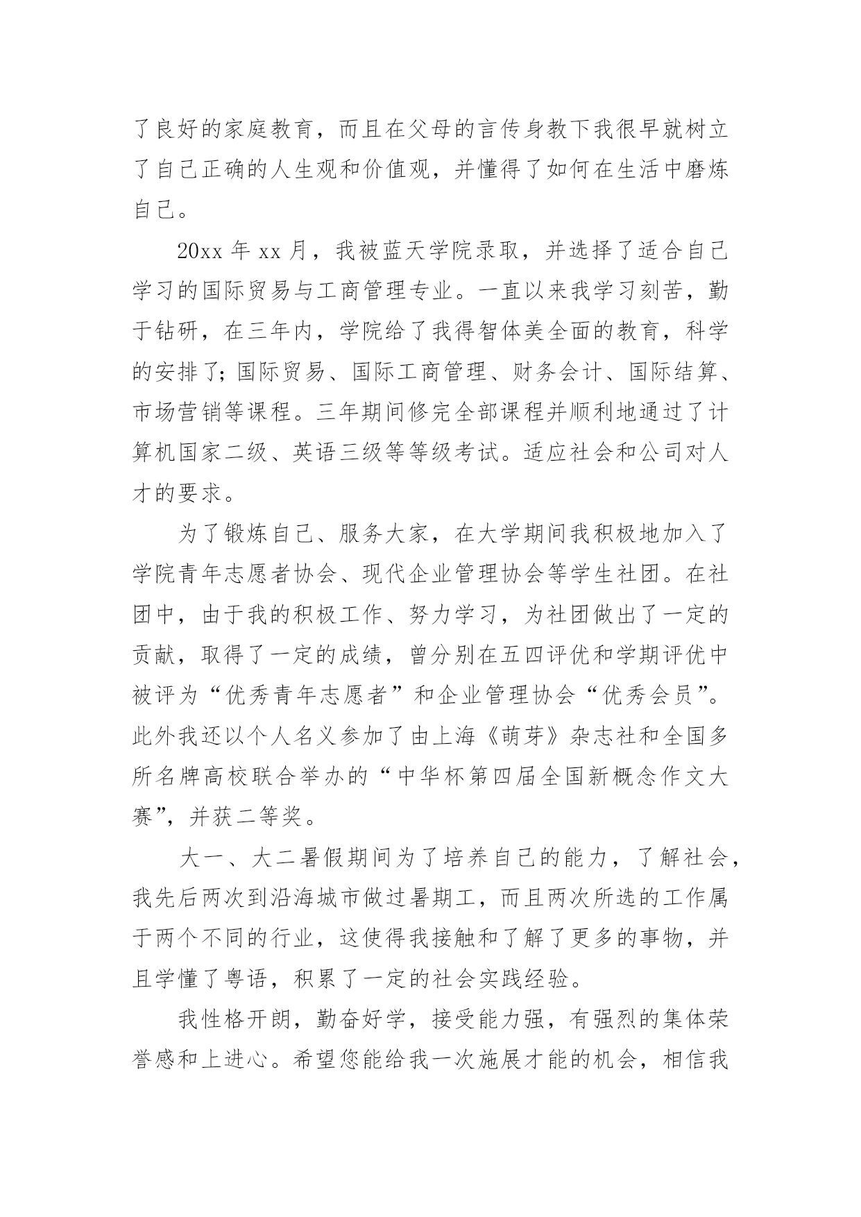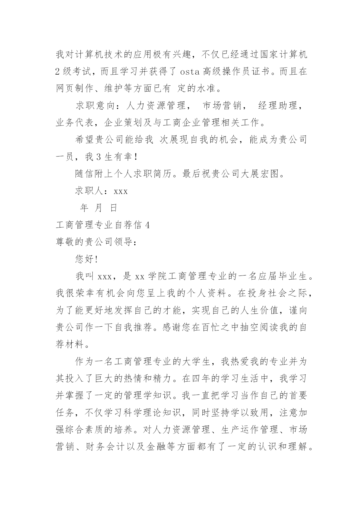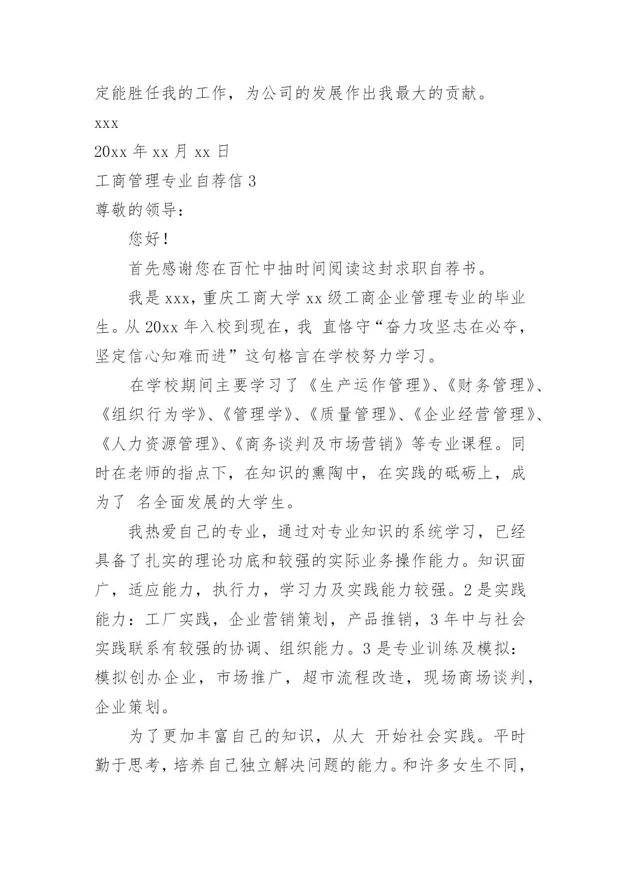 工商管理专业自荐信工商管理专业自荐信在一步步向前发展的社会中,自荐信的使用范围越来越大,通过自荐信,我们可以展示自己的长处。那么问题来了,自荐信应该怎么写?下面是小编整理的工商管理专业自荐信,仅供参考,希望能够帮助到大家。工商管理专业自荐信1尊敬的领导:您好!我叫孙旭楠,毕业于首都经济贸易大学工商管理专业。普通的院校,普通的我却拥有一颗不甘于平凡的心。我,自信,乐观,敢于迎接一切挑战。虽然只是一名普通的本科毕业生,但是,年轻是我的本钱,拼搏是我的天性,努力是我的责任,我坚信,成功定会成为必然。经过大学四年锤炼,在面对未来事业的选择时,我对自己有了更清醒的认识,由于我在大学中锻练了较好的学习工作能力,加上“努力做到最好”的天性使然,四年中,除了完成基本的课程教学外,我还积极参加各种学校的活动,但我并没有满足,因为我知道,在大学是学习与积累的过程,为了更好适应日后的工作,还不断地充实自己,参加了大学英语四级,并顺利通过。积极参加校园活动,如校园双选会,宿舍文化节等活动。假期中,我为了提高自己的能力,在松下电器,西门子中国有限公司参加实习。这些都大大提升我的沟通能力和交往能力,培养了我具备良好的组织策划能力和极佳的团队协作能力。但是,我知道,一切的辉煌与失败早已成为过去,我将要面对的是更具挑战的未来。我虽然只是一个普通的本科毕业生,但大学四年教会了我什么叫“学无止境”,我相信,在我不断努力刻苦的学习中,我一定能够胜任这份高尚的职业。一直坚信“天道酬勤”,我的人生信条是“人生在勤,不索何获”。给我一次机会,我会尽职尽责。一个人惟有把所擅长的投入到社会中才能使自我价值得以实现。别人不愿做的,我会义不容辞的做好;别人能做到的,我会尽最大努力做到更好!发挥自身优势,我愿与贵单位同事携手共进,共创辉煌!感谢您在百忙之中读完我的求职简历,诚祝事业蒸蒸日上!此致敬礼!自荐人:孙**20xx年11月工商管理专业自荐信2尊敬的领导:感谢您抽空垂阅我的自荐信!本人xxx,又名xxx;男,19xx年生于江西省修水县。父母都是知识分子,在国家机关工作,这使得我从小就受到了良好的家庭教育,而且在父母的言传身教下我很早就树立了自己正确的人生观和价值观,并懂得了如何在生活中磨炼自己。20xx年xx月,我被蓝天学院录取,并选择了适合自己学习的国际贸易与工商管理专业。一直以来我学习刻苦,勤于钻研,在三年内,学院给了我得智体美全面的教育,科学的安排了;国际贸易、国际工商管理、财务会计、国际结算、市场营销等课程。三年期间修完全部课程并顺利地通过了计算机国家二级、英语三级等等级考试。适应社会和公司对人才的要求。为了锻炼自己、服务大家,在大学期间我积极地加入了学院青年志愿者协会、现代企业管理协会等学生社团。在社团中,由于我的积极工作、努力学习,为社团做出了一定的贡献,取得了一定的成绩,曾分别在五四评优和学期评优中被评为“优秀青年志愿者”和企业管理协会“优秀会员”。此外我还以个人名义参加了由上海《萌芽》杂志社和全国多所名牌高校联合举办的“中华杯第四届全国新概念作文大赛”,并获二等奖。大一、大二暑假期间为了培养自己的能力,了解社会,我先后两次到沿海城市做过暑期工,而且两次所选的工作属于两个不同的行业,这使得我接触和了解了更多的事物,并且学懂了粤语,积累了一定的社会实践经验。我性格开朗,勤奋好学,接受能力强,有强烈的集体荣誉感和上进心。希望您能给我一次施展才能的机会,相信我定能胜任我的工作,为公司的发展作出我最大的贡献。xxx20xx年xx月xx日工商管理专业自荐信3尊敬的领导:您好!首先感谢您在百忙中抽时间阅读这封求职自荐书。我是xxx,重庆工商大学xx级工商企业管理专业的毕业生。从20xx年入校到现在,我直恪守“奋力攻坚志在必夺,坚定信心知难而进”这句格言在学校努力学习。在学校期间主要学习了《生产运作管理》、《财务管理》、《组织行为学》、《管理学》、《质量管理》、《企业经营管理》、《人力资源管理》、《商务谈判及市场营销》等专业课程。同时在老师的指点下,在知识的熏陶中,在实践的砥砺上,成为了名全面发展的大学生。我热爱自己的专业,通过对专业知识的系统学习,已经具备了扎实的理论功底和较强的实际业务操作能力。知识面广,适应能力,执行力,学习力及实践能力较强。2是实践能力:工厂实践,企业营销策划,产品推销,3年中与社会实践联系有较强的协调、组织能力。3是专业训练及模拟:模拟创办企业,市场推广,超市流程改造,现场商场谈判,企业策划。为了更加丰富自己的知识,从大开始社会实践。平时勤于思考,培养自己独立解决问题的能力。和许多女生不同,我对计算机技术的应用极有兴趣,不仅已经通过国家计算机2级考试,而且学习并获得了osta高级操作员证书。而且在网页制作、维护等方面已有定的水准。求职意向:人力
