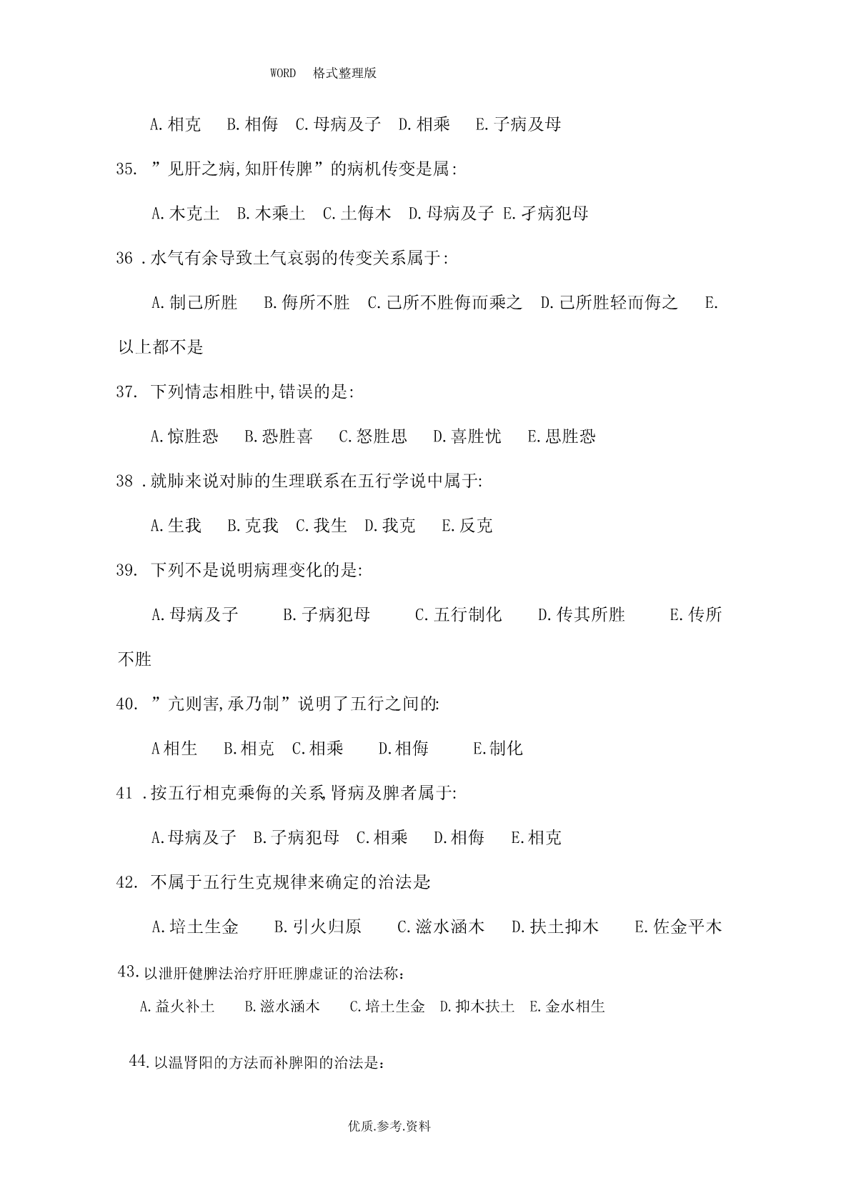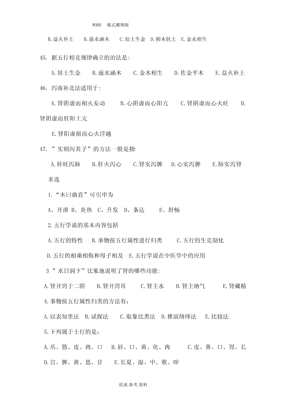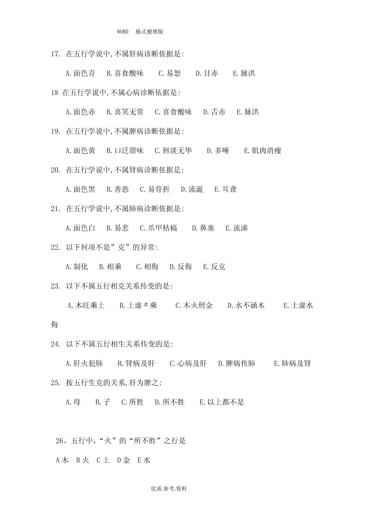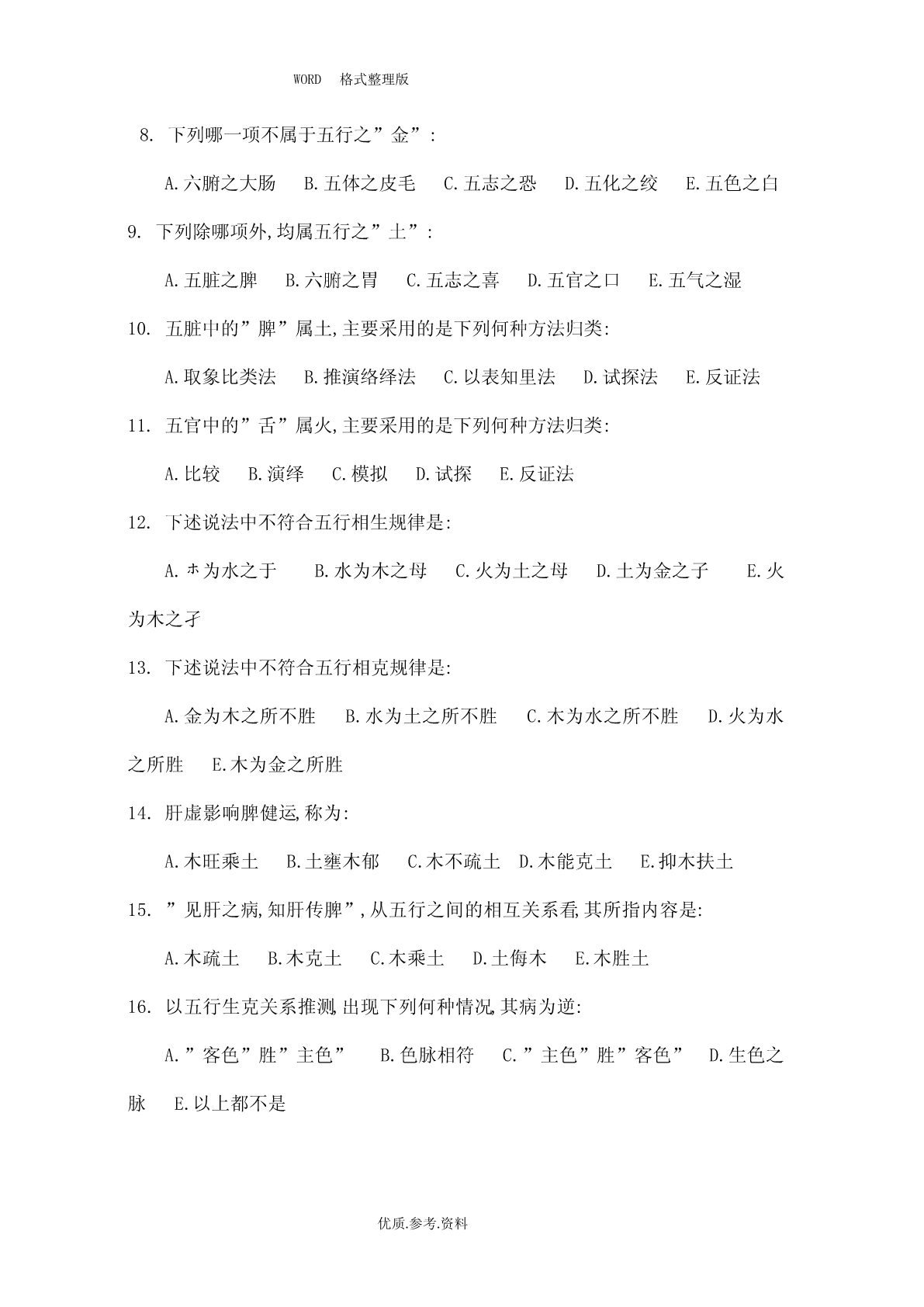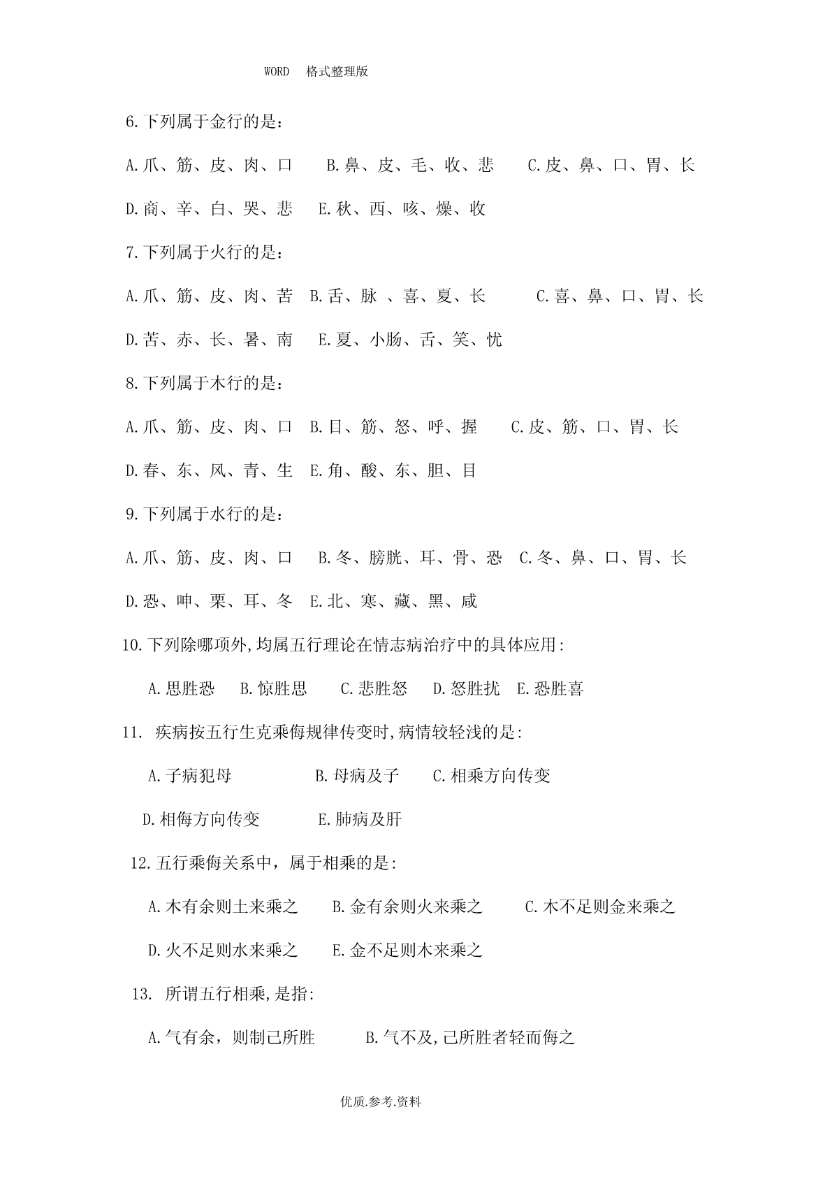 WORD格式整理版第三节五行学说名词解释五行学说五行五行相生五行相克五行制化五行胜复五行相乘五行相侮母病及子子病及母补母泻子滋水涵木法益火补土法培土生金法金水相生法抑木扶土法培土制水法佐金平木法泻南补北法单选1.五行学说中”木”的特性:A.炎上B.稼穑C.润下D.从革E.曲直2.何曰润下A木B火C土D金E水3.五行中具有“稼穑”特性的是A木B火C土D金E水4.五行中具有“从革”特性的是A木B火C土D金E水5.下述说法,哪一项不是”土”的特性A.生长B.生化C.承载D.受纳E.稼穑6.下述说法,哪一项不属于”金”的特性A.从革B.寒凉C.沉降D.隶杀E.收敛7四时季节中属于五行之“金”的是A春B夏C长夏D秋E冬优质.参考.资料WORD格式整理版8.下列哪一项不属于五行之”金”:A.六腑之大肠B.五体之皮毛C.五志之恐D.五化之绞E.五色之白9.下列除哪项外,均属五行之”土”:A.五脏之脾B.六腑之胃C.五志之喜D.五官之口E.五气之湿10.五脏中的”脾”属土,主要采用的是下列何种方法归类:A.取象比类法B.推演络绎法C.以表知里法D.试探法E.反证法11.五官中的”舌”属火,主要采用的是下列何种方法归类:A.比较B.演绎C.模拟D.试探E.反证法12.下述说法中不符合五行相生规律是:A.ホ为水之于B.水为木之母C.火为土之母D.土为金之子E.火为木之孑13.下述说法中不符合五行相克规律是:A.金为木之所不胜B.水为土之所不胜C.木为水之所不胜D.火为水之所胜E.木为金之所胜14.肝虚影响脾健运,称为:A.木旺乘土B.土壅木郁C.木不疏土D.木能克土E.抑木扶土15.”见肝之病,知肝传脾”,从五行之间的相互关系看,其所指内容是:A.木疏土B.木克土C.木乘土D.土侮木E.木胜土16.以五行生克关系推测,出现下列何种情况,其病为逆:A.”客色”胜”主色”B.色脉相符C.”主色”胜”客色”D.生色之脉E.以上都不是优质.参考.资料WORD格式整理版17.在五行学说中,不属肝病诊断依据是:A.面色青B.喜食酸味C.易怒D.目赤E.脉洪18在五行学说中,不属心病诊断依据是:A.面色赤B.喜笑无常C.喜食酸味D.舌赤E.脉洪19.在五行学说中,不属脾病诊断依据是:A.面色黄B.口泛甜味C.唇淡无华D.多唾E.肌肉消瘦20.在五行学说中,不属肾病诊断依据是:A.面色黑B.善恐C.易骨折D.流涎E.耳聋21.在五行学说中,不属肺病诊断依据是:A.面色白B.易悲C.爪甲枯槁D.鼻塞E.流涕22.以下何项不是”克”的异常:A.制化B.相乘C.相侮D.反侮E.反克23.以下不属五行相克关系传变的是:A.木旺乘土B.土虚ホ乘C.木火刑金D.水不涵木E.土虚水侮24.以下不属五行相生关系传变的是:A.肝火犯肺B.肾病及肝C.心病及肝D.脾病传肺E.肺病及肾25.按五行生克的关系,肝为脾之:A.母B.子C.所胜D.所不胜E.以上都不是26、五行中,“火”的“所不胜”之行是A木B火C土D金E水优质.参考.资料WORD格式整理版27.五行中,“木”之“所胜”为A木B火C土D金E水28.五行相乘的基本概念是:A.母病其气有余而乘其子B.子病其气有余而乘其母C.其气有余则乘己所胜D.其气有余则乘己所不胜E.其气不及则己所胜者侮而乘之29.五行相侮的基本概念是:A.子病其气亢盛,反侮其母B.母病其气不足,子反侮母C.其气有余,则侮己所胜D.其气不足,则己所不胜者轻而侮之E.以上都不是30..五行中某一行过于强盛,使原来克制它的一行不仅无法克制它,反而受其反向克制,说明五行之间的关系是A五行制化B五行相生C五行相克D五行相乘E五行相侮31、五行中某一行过于虚弱,难以抵御其所不胜的正常限度的克制,说明五行之间的关系是A五行制化B五行相生C五行相克D五行相乘E五行相侮32”肝火犯肺”是属于:A.子病犯母B.克C.乘D.侮E.母病及子33肝气犯脾属于A.子病犯母B.克C.乘D.侮E.母病及子34脾病传肾是属于:优质.参考.资料WORD格式整理版A.相克B.相侮C.母病及子D.相乘E.子病及母35.”见肝之病,知肝传脾”的病机传变是属:A.木克土B.木乘土C.土侮木D.母病及子E.孑病犯母36.水气有余导致土气哀弱的传变关系属于:A.制己所胜B.侮所不胜C.己所不胜侮而乘
