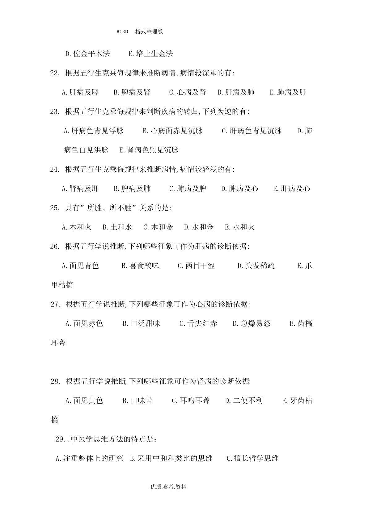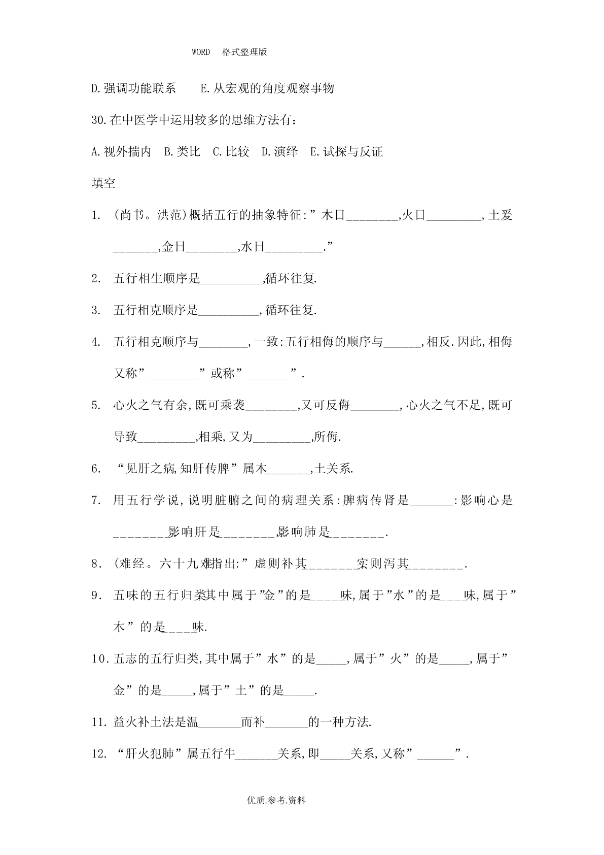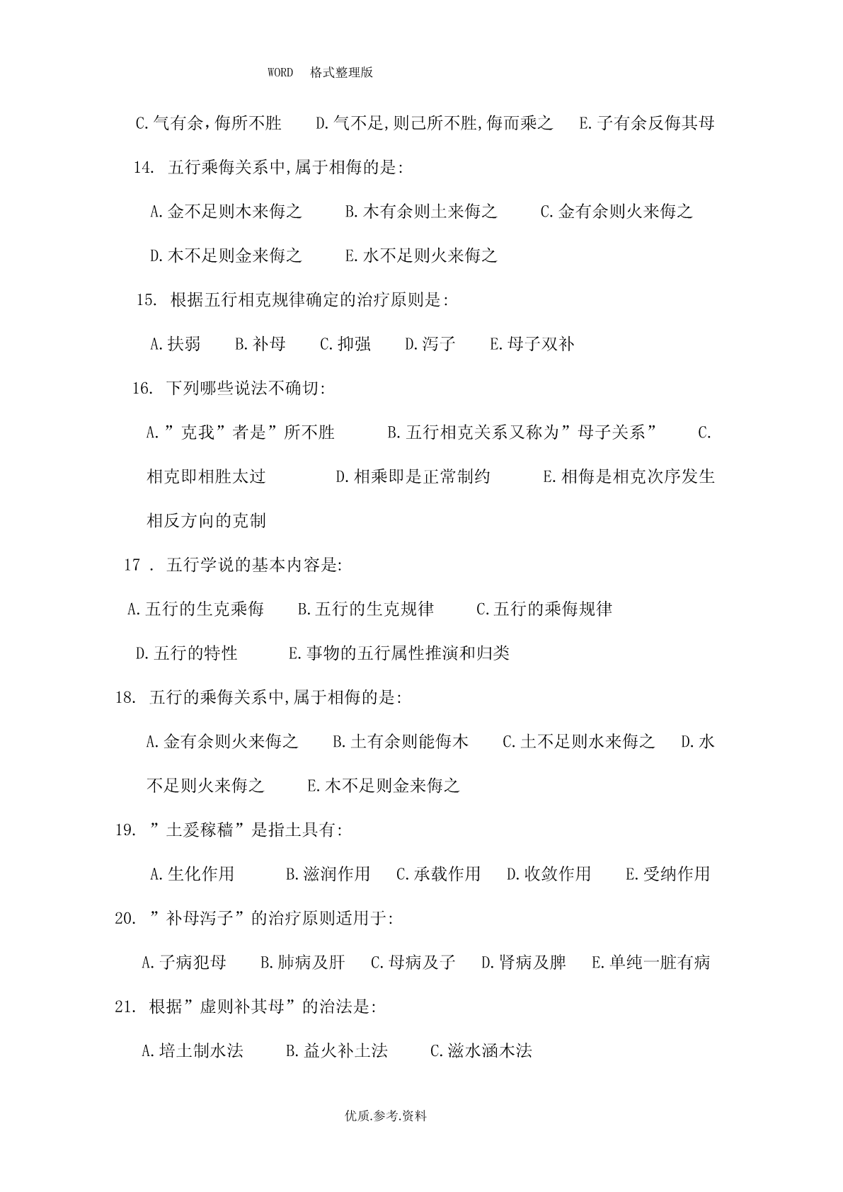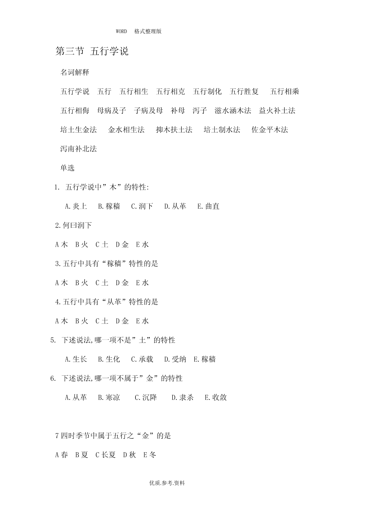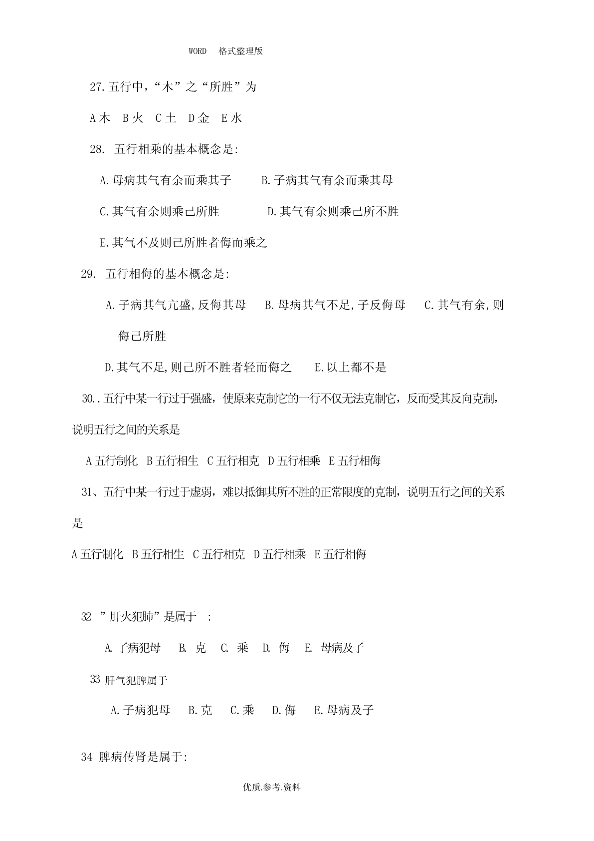 WORD格式整理版第三节五行学说名词解释五行学说五行五行相生五行相克五行制化五行胜复五行相乘五行相侮母病及子子病及母补母泻子滋水涵木法益火补土法培土生金法金水相生法抑木扶土法培土制水法佐金平木法泻南补北法单选1.五行学说中”木”的特性:A.炎上B.稼穑C.润下D.从革E.曲直2.何曰润下A木B火C土D金E水3.五行中具有“稼穑”特性的是A木B火C土D金E水4.五行中具有“从革”特性的是A木B火C土D金E水5.下述说法,哪一项不是”土”的特性A.生长B.生化C.承载D.受纳E.稼穑6.下述说法,哪一项不属于”金”的特性A.从革B.寒凉C.沉降D.隶杀E.收敛7四时季节中属于五行之“金”的是A春B夏C长夏D秋E冬优质.参考.资料WORD格式整理版8.下列哪一项不属于五行之”金”:A.六腑之大肠B.五体之皮毛C.五志之恐D.五化之绞E.五色之白9.下列除哪项外,均属五行之”土”:A.五脏之脾B.六腑之胃C.五志之喜D.五官之口E.五气之湿10.五脏中的”脾”属土,主要采用的是下列何种方法归类:A.取象比类法B.推演络绎法C.以表知里法D.试探法E.反证法11.五官中的”舌”属火,主要采用的是下列何种方法归类:A.比较B.演绎C.模拟D.试探E.反证法12.下述说法中不符合五行相生规律是:A.ホ为水之于B.水为木之母C.火为土之母D.土为金之子E.火为木之孑13.下述说法中不符合五行相克规律是:A.金为木之所不胜B.水为土之所不胜C.木为水之所不胜D.火为水之所胜E.木为金之所胜14.肝虚影响脾健运,称为:A.木旺乘土B.土壅木郁C.木不疏土D.木能克土E.抑木扶土15.”见肝之病,知肝传脾”,从五行之间的相互关系看,其所指内容是:A.木疏土B.木克土C.木乘土D.土侮木E.木胜土16.以五行生克关系推测,出现下列何种情况,其病为逆:A.”客色”胜”主色”B.色脉相符C.”主色”胜”客色”D.生色之脉E.以上都不是优质.参考.资料WORD格式整理版17.在五行学说中,不属肝病诊断依据是:A.面色青B.喜食酸味C.易怒D.目赤E.脉洪18在五行学说中,不属心病诊断依据是:A.面色赤B.喜笑无常C.喜食酸味D.舌赤E.脉洪19.在五行学说中,不属脾病诊断依据是:A.面色黄B.口泛甜味C.唇淡无华D.多唾E.肌肉消瘦20.在五行学说中,不属肾病诊断依据是:A.面色黑B.善恐C.易骨折D.流涎E.耳聋21.在五行学说中,不属肺病诊断依据是:A.面色白B.易悲C.爪甲枯槁D.鼻塞E.流涕22.以下何项不是”克”的异常:A.制化B.相乘C.相侮D.反侮E.反克23.以下不属五行相克关系传变的是:A.木旺乘土B.土虚ホ乘C.木火刑金D.水不涵木E.土虚水侮24.以下不属五行相生关系传变的是:A.肝火犯肺B.肾病及肝C.心病及肝D.脾病传肺E.肺病及肾25.按五行生克的关系,肝为脾之:A.母B.子C.所胜D.所不胜E.以上都不是26、五行中,“火”的“所不胜”之行是A木B火C土D金E水优质.参考.资料WORD格式整理版27.五行中,“木”之“所胜”为A木B火C土D金E水28.五行相乘的基本概念是:A.母病其气有余而乘其子B.子病其气有余而乘其母C.其气有余则乘己所胜D.其气有余则乘己所不胜E.其气不及则己所胜者侮而乘之29.五行相侮的基本概念是:A.子病其气亢盛,反侮其母B.母病其气不足,子反侮母C.其气有余,则侮己所胜D.其气不足,则己所不胜者轻而侮之E.以上都不是30..五行中某一行过于强盛,使原来克制它的一行不仅无法克制它,反而受其反向克制,说明五行之间的关系是A五行制化B五行相生C五行相克D五行相乘E五行相侮31、五行中某一行过于虚弱,难以抵御其所不胜的正常限度的克制,说明五行之间的关系是A五行制化B五行相生C五行相克D五行相乘E五行相侮32”肝火犯肺”是属于:A.子病犯母B.克C.乘D.侮E.母病及子33肝气犯脾属于A.子病犯母B.克C.乘D.侮E.母病及子34脾病传肾是属于:优质.参考.资料WORD格式整理版A.相克B.相侮C.母病及子D.相乘E.子病及母35.”见肝之病,知肝传脾”的病机传变是属:A.木克土B.木乘土C.土侮木D.母病及子E.孑病犯母36.水气有余导致土气哀弱的传变关系属于:A.制己所胜B.侮所不胜C.己所不胜侮而乘