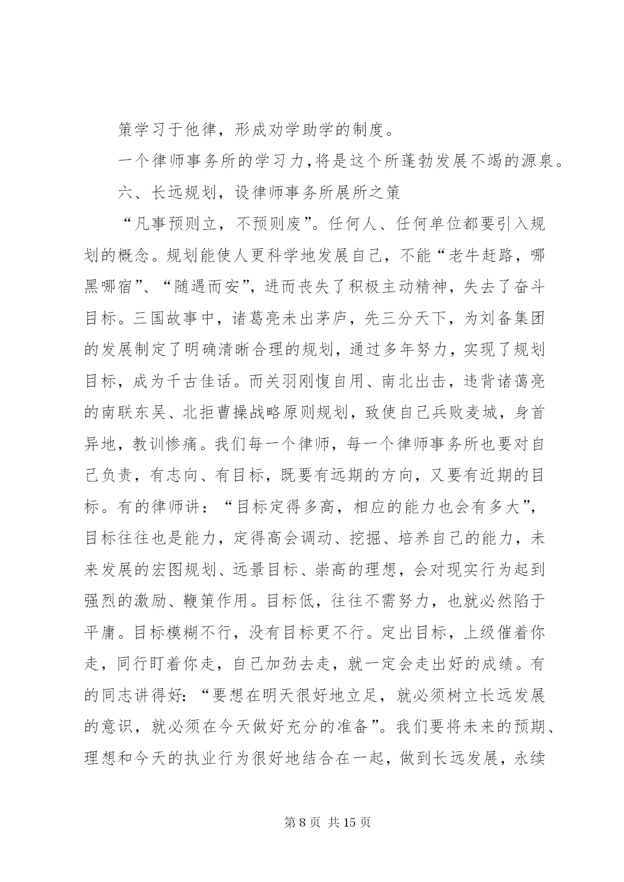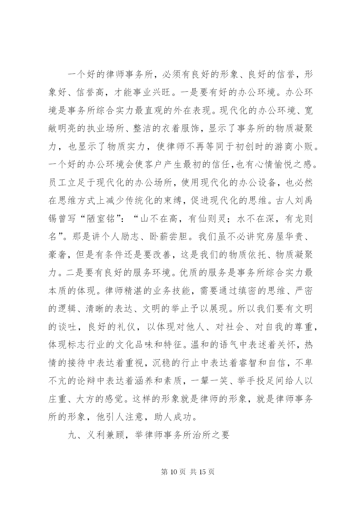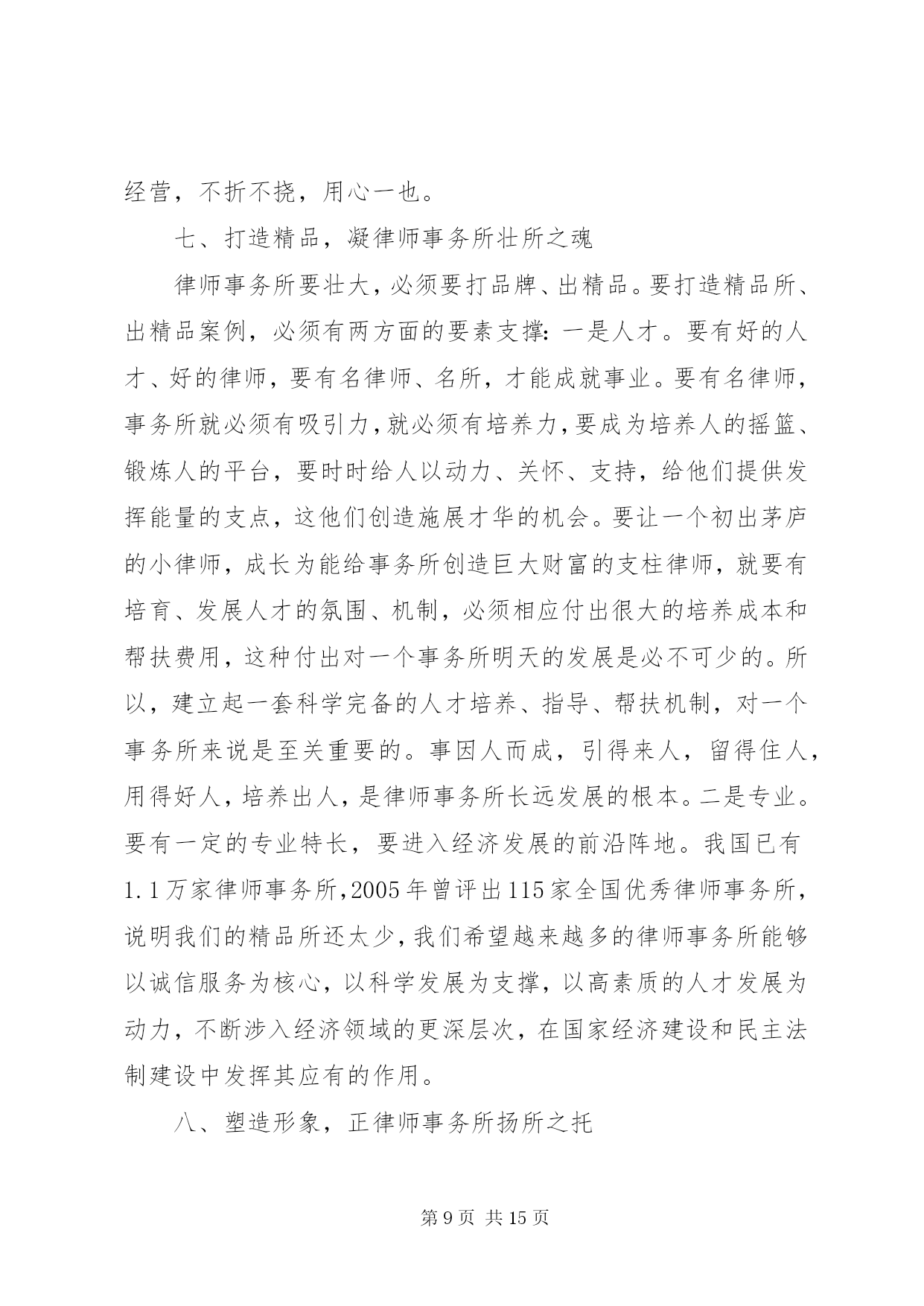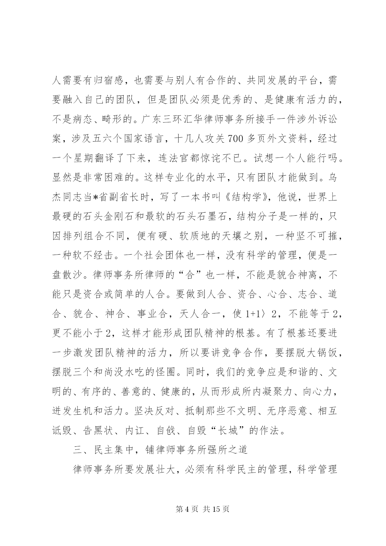 第PAGE\*Arabic\*MERGEFORMAT15页共NUMPAGES\*MERGEFORMAT15页市司法局文化建设调研报告文化从社会的角度看,是人类社会发展过程中积累的物质财富和精神财富的总结和升华;从个人角度看,是生活、工作习惯风格的一种积累、沉淀、凝聚、养成,是由习惯固化养成的一种理念行为;文化还是一种熏陶影响人的氛围,有着强烈的教化作用。文化存在于日常生活工作的观念和行为中,常常从细节或大事上折射出来。文化从律师的角度看,是律师行业在长期的执业实践中形成的理想信仰、价值目标、行为模式、思维习惯等的集合体。律师事务所是律师团体化的组织,是律师执业的依托、立业的基点、创业的平台,处于非常重要的地位,有着非常重要的作用。律师事务所应该是“管理科学、运作高效、凝聚人才、竞争力强”的中介组织、法人单位,它的文化管理应该是律师文化建设的关键所在。律师文化涉及面比较广,我仅就律师业发展和律师事务所管理作些文化理念方面的研讨,以期起到抛砖引玉作用,从而促进律师事务所规范化管理,推动律师业团体化发展。一、忠诚守信,夯律师事务所立所之本律师事务所要有立所之本,这个本就是“忠诚守信”。首先这是做人做事的根本要求。没有诚信,没人愿意和你打交道,只有诚信,大家才会心中有底,才会“立言有人从,做事有人跟”。商品社会重要的是讲诚信,诚信是商品社会的一把标尺。对自己,“诚信是良心的责任”;对他人,“诚信是人格的天平”。“人无信不立,业无信不成”,做事先做人,做人要讲诚实、信用,这是根本。第二是职业道德的要求。有人讲,律师应“仗人间义”,“戴着荆棘的王冠、擎着正义的宝剑”,去维护社会的公平正义,去做一个“法律人”。如果不忠于法律、不忠于当事人、不忠于社会的公平正义、不忠于自己的良心,实在不能适合于当律师。第三是律师业发展的要求。律师事业在蓬勃发展,因为这项事业适应了现代法律制度、现代法律生活的要求。律师个体能否顺利发展,取决于本人的素质;律师事务所能否做大做强,则取决于本人本所的整体素质和发展策略。一个诚实守信的律师时间长了必然众口成碑,一个事务所也一样,由于律师个体诚信的外在表现融汇成整体忠诚守信的社会形象,即使不在显赫的大街上,“巷深酒香飘,顾客盈满门”也就成了水到渠成的事情。相反,有的律师、有的所不讲诚信,不时被控告、被举报或被责备,时间久了必然声名狼藉。一个人、一个所,甚至整个社会,诚信的缺失是最大的失败,所以我们要千方百计打造我们诚信的“金”字招牌、诚信的镇所“宝鼎”,真正做到一言九鼎、驷马难追。管理部门也要采取有效措施促进律师事务所、律师铸造诚信的形象。我们还要进一步健全和完善诚信档案,把律师诚信记录公示于社会,用制度来约束和改变个别律师的不良行为。许多律师事务所都把“诚信”作为立所之本,“传国法之信达、仗国人之信任”的国信联合律师事务所、“诚信、敬业、合作、发展”的新天伦律师事务所、“正义、诚信、仁爱、严慎”的海天庆城律师事务所、“康达高远、精诚为桥”的康桥律师事务所、“同心同力、尚德尚能、至诚至善、共济共赢”的马林江律师事务所,还有我们本地的正名、奇政、均儒、鼎正等等,都把诚信文化理念融入所名。我国《律师法》将“品行良好”作为申请律师执业应当具备的法定条件之一,《民法通则》的基本原则之一就是“自愿、公平、等价有偿、诚实信用”。无论从法律层面、道德层面、实践层面、理论层面,“忠诚守信”这个中华民族五千年文明的写真,理应作为我们律师事务所的立所之本,律师文化理应高高擎起“忠诚守信”这面大旗。二、团队发展,铸律师事务所建所之基团队发展是律师事务所建设和发展的基础。在任何单位,人是最根本的,人的因素是第一位的,而人“合”起来是最强势的,因为“合”意味着彼此的取长补短。你有这方面的特长,我有那方面的才干,优势互补,意味着心往一处想,劲往一处使;意味着目标、追求、精神信仰、价值观的融合和统一;意味着用共同的意志、共同的信念、共同的理想来团结、凝聚人心,形成团队精神;更意味着用团队精神来激发、促进我们事业的蓬勃发展。人在个体时是脆弱的,只有置于团队中,才会感觉自己是强大的;人需要有归宿感,也需要与别人有合作的、共同发展的平台,需要融入自己的团队,但是团队必须是优秀的、是健康有活力的,不是病态、畸形的。广东三环汇华律师事务所接手一件涉外诉讼案,涉及五六个国家语言,十几人攻关700多页外文资料,经过一个星期翻译了下来,连法官都惊诧不已。试想一个人能行吗。显然是非常困难的。这样专业化的水平,只有团队才能做到。乌杰同志当*省副省长时,写了一本书叫《结构学》,他说,世界上最硬的石头金刚石和最软的石头石墨石,结构分子是一样的,只因排列组合不同,便有硬、软质地的天壤之别,一种坚不可摧,一种软不经击。一个社会团体也一样,没有科学的管