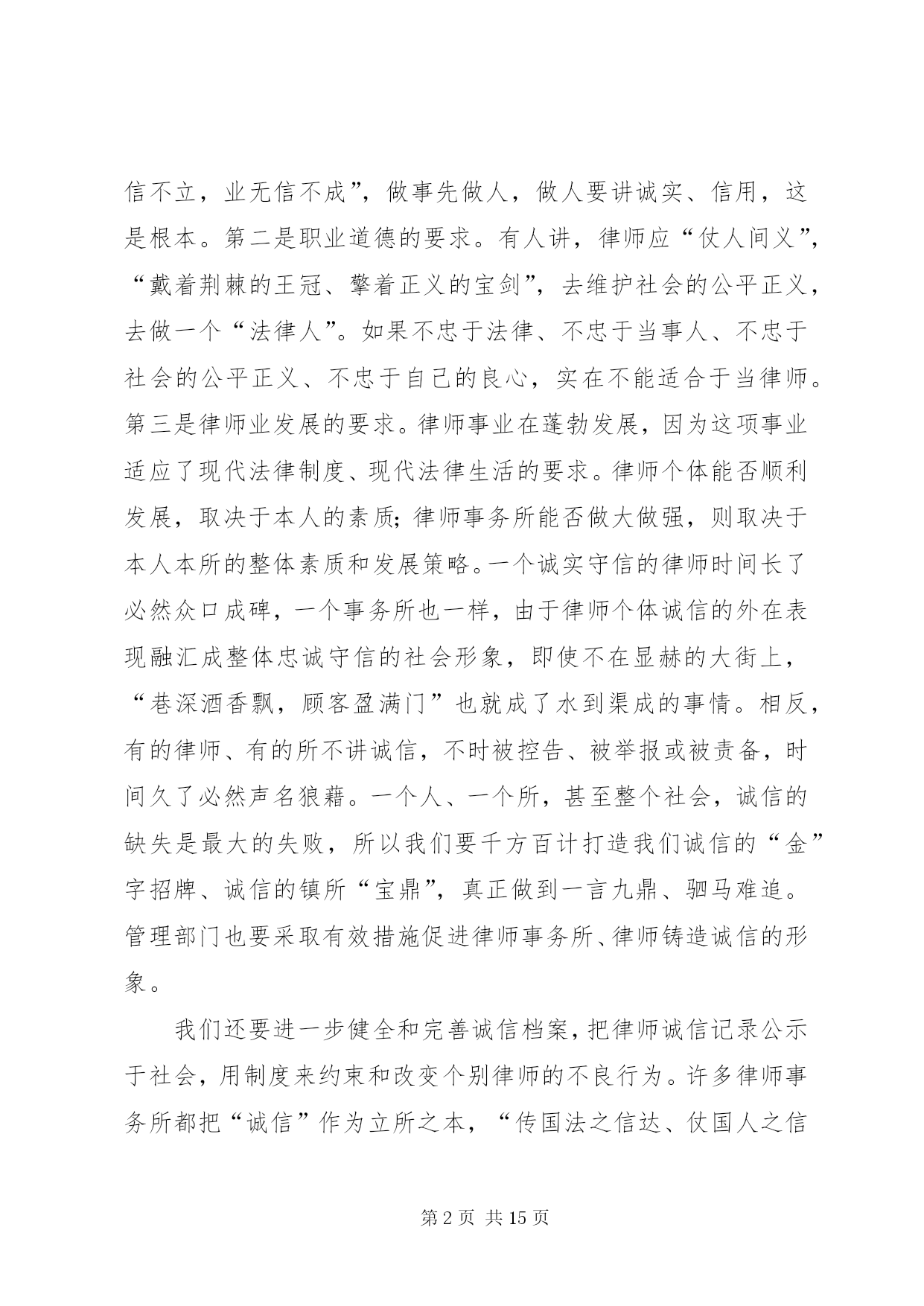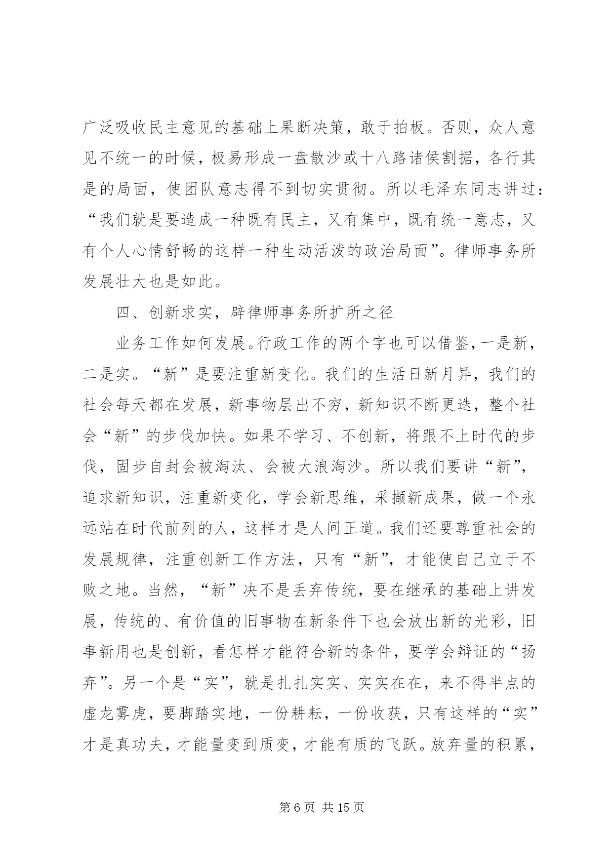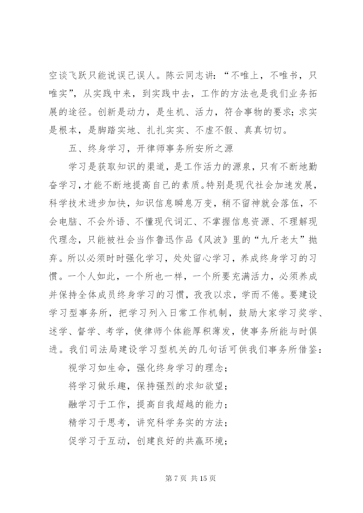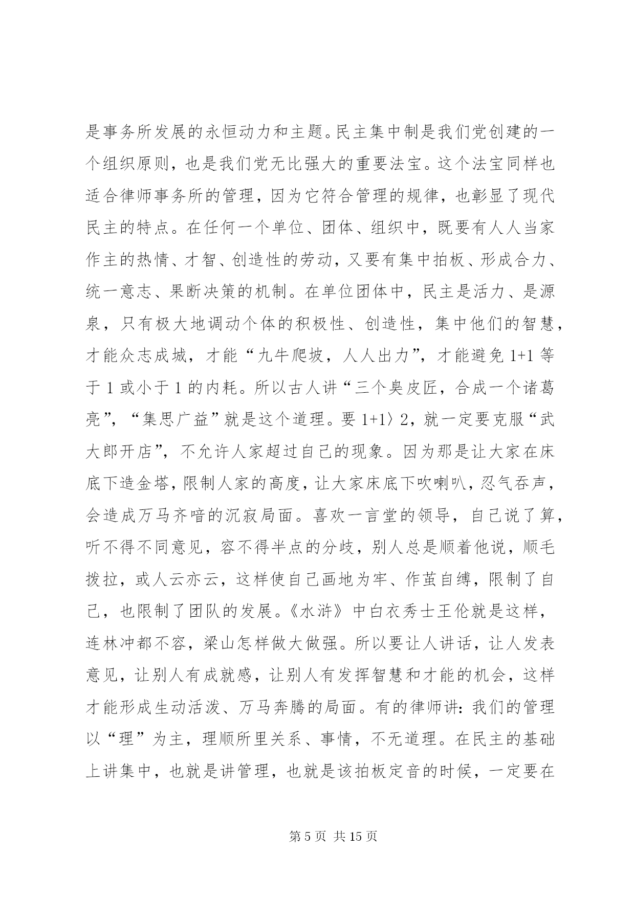 第PAGE\*Arabic\*MERGEFORMAT15页共NUMPAGES\*MERGEFORMAT15页市司法局文化建设调研报告文化从社会的角度看,是人类社会发展过程中积累的物质财富和精神财富的总结和升华;从个人角度看,是生活、工作习惯风格的一种积累、沉淀、凝聚、养成,是由习惯固化养成的一种理念行为;文化还是一种熏陶影响人的氛围,有着强烈的教化作用。文化存在于日常生活工作的观念和行为中,常常从细节或大事上折射出来。文化从律师的角度看,是律师行业在长期的执业实践中形成的理想信仰、价值目标、行为模式、思维习惯等的集合体。律师事务所是律师团体化的组织,是律师执业的依托、立业的基点、创业的平台,处于非常重要的地位,有着非常重要的作用。律师事务所应该是“管理科学、运作高效、凝聚人才、竞争力强”的中介组织、法人单位,它的文化管理应该是律师文化建设的关键所在。律师文化涉及面比较广,我仅就律师业发展和律师事务所管理作些文化理念方面的研讨,以期起到抛砖引玉作用,从而促进律师事务所规范化管理,推动律师业团体化发展。一、忠诚守信,夯律师事务所立所之本律师事务所要有立所之本,这个本就是“忠诚守信”。首先这是做人做事的根本要求。没有诚信,没人愿意和你打交道,只有诚信,大家才会心中有底,才会“立言有人从,做事有人跟”。商品社会重要的是讲诚信,诚信是商品社会的一把标尺。对自己,“诚信是良心的责任”;对他人,“诚信是人格的天平”。“人无信不立,业无信不成”,做事先做人,做人要讲诚实、信用,这是根本。第二是职业道德的要求。有人讲,律师应“仗人间义”,“戴着荆棘的王冠、擎着正义的宝剑”,去维护社会的公平正义,去做一个“法律人”。如果不忠于法律、不忠于当事人、不忠于社会的公平正义、不忠于自己的良心,实在不能适合于当律师。第三是律师业发展的要求。律师事业在蓬勃发展,因为这项事业适应了现代法律制度、现代法律生活的要求。律师个体能否顺利发展,取决于本人的素质;律师事务所能否做大做强,则取决于本人本所的整体素质和发展策略。一个诚实守信的律师时间长了必然众口成碑,一个事务所也一样,由于律师个体诚信的外在表现融汇成整体忠诚守信的社会形象,即使不在显赫的大街上,“巷深酒香飘,顾客盈满门”也就成了水到渠成的事情。相反,有的律师、有的所不讲诚信,不时被控告、被举报或被责备,时间久了必然声名狼藉。一个人、一个所,甚至整个社会,诚信的缺失是最大的失败,所以我们要千方百计打造我们诚信的“金”字招牌、诚信的镇所“宝鼎”,真正做到一言九鼎、驷马难追。管理部门也要采取有效措施促进律师事务所、律师铸造诚信的形象。我们还要进一步健全和完善诚信档案,把律师诚信记录公示于社会,用制度来约束和改变个别律师的不良行为。许多律师事务所都把“诚信”作为立所之本,“传国法之信达、仗国人之信任”的国信联合律师事务所、“诚信、敬业、合作、发展”的新天伦律师事务所、“正义、诚信、仁爱、严慎”的海天庆城律师事务所、“康达高远、精诚为桥”的康桥律师事务所、“同心同力、尚德尚能、至诚至善、共济共赢”的马林江律师事务所,还有我们本地的正名、奇政、均儒、鼎正等等,都把诚信文化理念融入所名。我国《律师法》将“品行良好”作为申请律师执业应当具备的法定条件之一,《民法通则》的基本原则之一就是“自愿、公平、等价有偿、诚实信用”。无论从法律层面、道德层面、实践层面、理论层面,“忠诚守信”这个中华民族五千年文明的写真,理应作为我们律师事务所的立所之本,律师文化理应高高擎起“忠诚守信”这面大旗。二、团队发展,铸律师事务所建所之基团队发展是律师事务所建设和发展的基础。在任何单位,人是最根本的,人的因素是第一位的,而人“合”起来是最强势的,因为“合”意味着彼此的取长补短。你有这方面的特长,我有那方面的才干,优势互补,意味着心往一处想,劲往一处使;意味着目标、追求、精神信仰、价值观的融合和统一;意味着用共同的意志、共同的信念、共同的理想来团结、凝聚人心,形成团队精神;更意味着用团队精神来激发、促进我们事业的蓬勃发展。人在个体时是脆弱的,只有置于团队中,才会感觉自己是强大的;人需要有归宿感,也需要与别人有合作的、共同发展的平台,需要融入自己的团队,但是团队必须是优秀的、是健康有活力的,不是病态、畸形的。广东三环汇华律师事务所接手一件涉外诉讼案,涉及五六个国家语言,十几人攻关700多页外文资料,经过一个星期翻译了下来,连法官都惊诧不已。试想一个人能行吗。显然是非常困难的。这样专业化的水平,只有团队才能做到。乌杰同志当*省副省长时,写了一本书叫《结构学》,他说,世界上最硬的石头金刚石和最软的石头石墨石,结构分子是一样的,只因排列组合不同,便有硬、软质地的天壤之别,一种坚不可摧,一种软不经击。一个社会团体也一样,没有科学的管