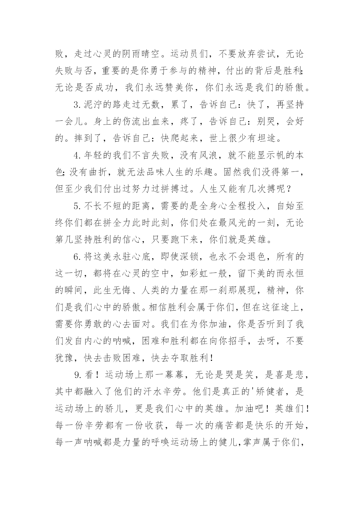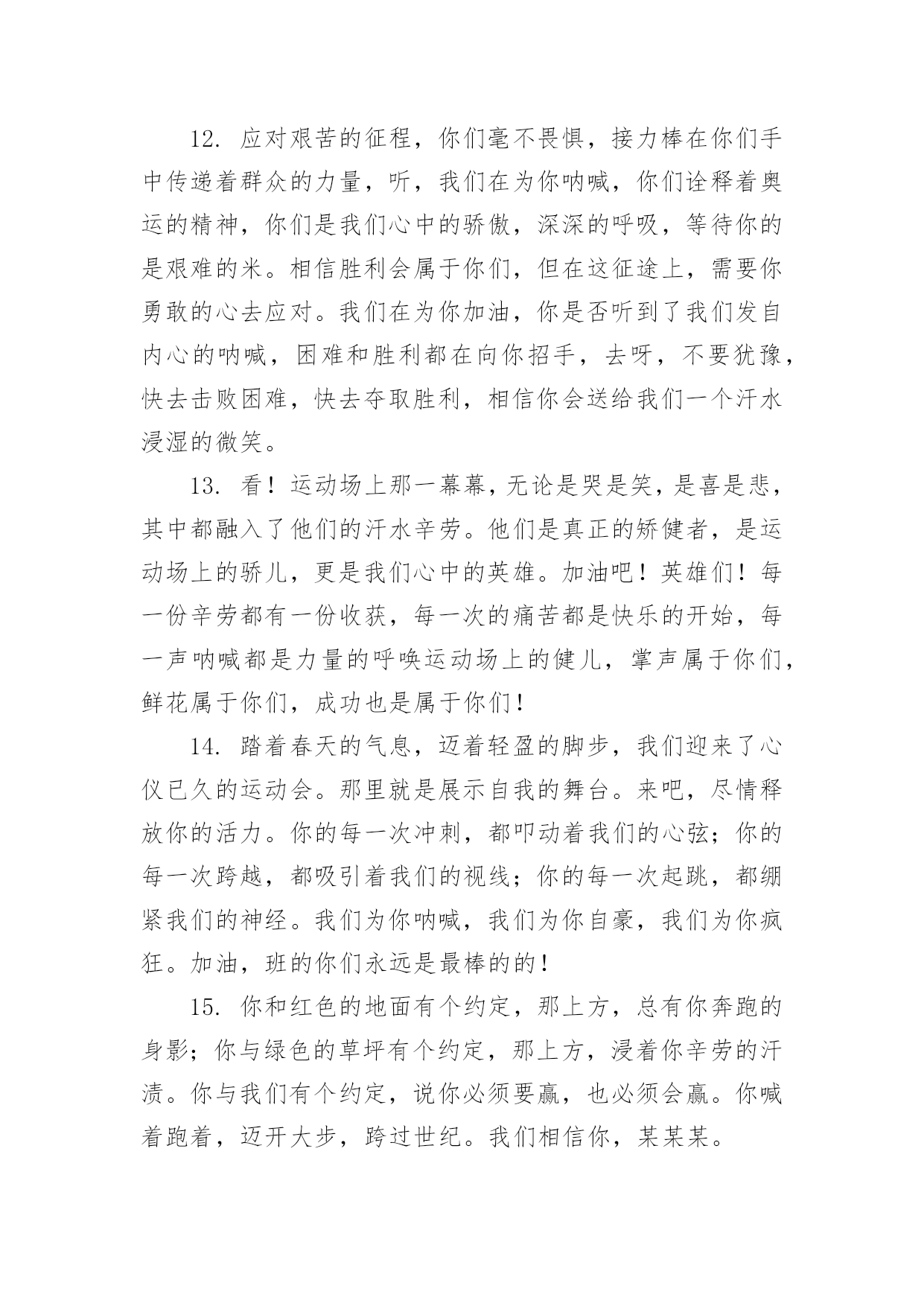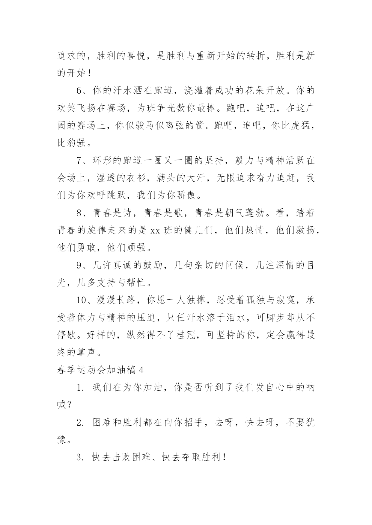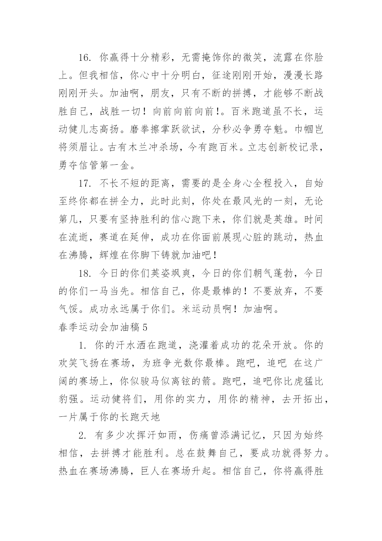 春季运动会加油稿【推荐】春季运动会加油稿在充满活力,日益开放的今天,我们都跟加油稿有着直接或间接的联系,借助加油稿可以激励他人的士气。那么,怎么去写加油稿呢?以下是小编为大家整理的春季运动会加油稿,仅供参考,大家一起来看看吧。春季运动会加油稿11.温暖的陽光洒在赛场上,男子乙组标枪的比赛即将开始。赛场上,一道道优美的弧线将轻盈地划过天空。健儿们用手中的标枪向距离的权限发起一轮又一轮的挑战。标枪在空中轻盈的姿态,是健儿们强健的力量和熟练的技巧的结合。谁能在这场激烈的竞争中获胜?让我们拭目以待,让我们为他们呐喊、助威吧!只有将力量与技巧合二为一的人,才能获得胜利的桂冠!2.你的汗水洒在跑道,浇灌着成功的花朵开放。你的欢笑飞扬在赛场,为班争光数你最棒。跑吧,追吧在这广阔的赛场上,你似骏马似离铉的箭。跑吧,追吧你比虎猛比豹强。3.你们挥舞着充满力量的双臂看着实心球化成美丽的弧线我着实在心里佩服你们你们抛出了自己的最佳水平。4.致失败者倒下的时候,生命又怎能屹立!歪歪斜斜的身影,又怎耐的住风雨的洗礼。你若有一个不屈的灵魂,脚下才会有一方坚实的土地。昨天的失败已经过去,胜利不仅仅是一个美好的话题。5.年轻的我们自信飞扬,青春的气息如同出生的朝陽,蓬勃的力量如同陽光的挥洒。此时此刻,跑道便是我们精彩的舞台,声声加油便是我们最高的奖项!论何成功,谈何荣辱,心中的信念只有一个:拼搏!6.你的汗水洒在跑道,浇灌着成功的花朵开放。你的欢笑飞扬在赛场,为班争光数你最棒。跑吧,追吧在这广阔的赛场上,你似骏马似离铉的箭。跑吧,追吧你比虎猛比豹强。7.青春的脚步,青春的速度,青春的活力,青春的激情,将会在你们的身上尽情体现。迎接自我,挑战自我,战胜自我!我们相信你们一定能行,加油吧,运动员!终点就在眼前!8.曾几何时,我为痛失奖杯而愧诲不已。曾几何时,我因别人而羡慕不已,伤心、失落已成过去,新的机遇也即将到来。这次不需要使自己留下任何遗憾,努力准备吧!9.超越对手,超越自我,是我们的目标,是我们的信念,在清凉的初冬,在喧嚣的田径场上,。你们点燃了似火的热情,无论成败,我们都为你们感到自豪,你们永远是我们的骄傲!10.超越对手,超越自我,是我们的目标,是我们的信念,在清凉的初秋,在喧嚣的田径场上,。你们点燃了似火的热情,无论成败,我们都为你们感到自豪,你们永远是我们的骄傲。11.一条跑道,要四个人去打造一个信念,要四个人去拼搏每次交接都是信任的传递每次交接都是永恒的支持前世的五百次回眸,才能够换来今天的相遇,冲吧!向着终点,向着个四个人的共同目标,前进!12.人生的路,有坦途,也有坎坷,做过的岁月,有欢笑,也有苦涩,泪水告诉我一个跌倒的`故事,汗水使我多了一份沉重,几多成熟。理想毕竟不同于现实,失败是生活的一部分,谁也无法选择,无法抗拒,人生要自己去拼搏,去奋斗,在风雨中百折不饶勇往直前。流泪不是失落,徘徊不是迷惑,成功属于那些战胜失败,坚持不懈,勇于追求梦想的人。13.一根小小的木棒,连接的是团结和友爱一根小小的木棒,传递的是勇气和力量一根小小的木棒,演绎的是奋斗和拼搏加油吧!让这激动人心的时刻,一直回荡在我们心中!14.踏上跑道,是一种选择。离开起点,是一种勇气。驰骋赛场,是一种胜利。15.温暖的阳光洒在赛场上,男子乙组标枪的比赛即将开始。赛场上,一道道优美的弧线将轻盈地划过天空。健儿们用手中的标枪向距离的权限发起一轮又一轮的挑战。标枪在空中轻盈的姿态,是健儿们强健的力量和熟练的技巧的结合。谁能在这场激烈的竞争中获胜?让我们拭目以待,让我们为他们呐喊、助威吧!只有将力量与技巧合二为一的人,才能获得胜利的桂冠!16.运动健将们,用你的实力,用你的精神,去开拓出,一片属于你的长跑天地!17.汗水,泪水;笑声,歌声;我们尽情挥洒。开幕式上,运动场上,我们尽情展现,多少艰辛,多少困苦,我们勇敢承担。因为年轻,因为张扬,因为我们知道:用今天的汗水换来明天的微笑18.有多少次挥汗如雨,伤痛曾添满记忆,只因为始终相信,去拼搏才能胜利。总在鼓舞自己,要成功就得努力。热血在赛场沸腾,巨人在赛场升起。相信自己,你将赢得胜利,创造奇迹;相信自己,梦想在你手中,这是你的天地。当一切过去,你们将是第一。相信自己,你们将超越极限,超越自己!相信自己,加油吧,健儿们,相信你自己。19.广阔的绿茵场,是为你们搭建的舞台。张扬吧,年轻的心,我们将为你永远喝彩!20.曾几何时,我为痛失奖杯而愧诲不已。曾几何时,我因别人而羡慕不已,伤心、失落已成过去,新的机遇也即将到来。这次不需要使自己留下任何遗憾,努力准备吧!春季运动会加油稿21.深深的呼吸,等待你的是艰难的400米。相信胜利会属于你们。但在这征途上,需要你勇敢的心去面对。我们在为你加油,你是否听到了我们发自心中的呐喊?困难和胜利都在