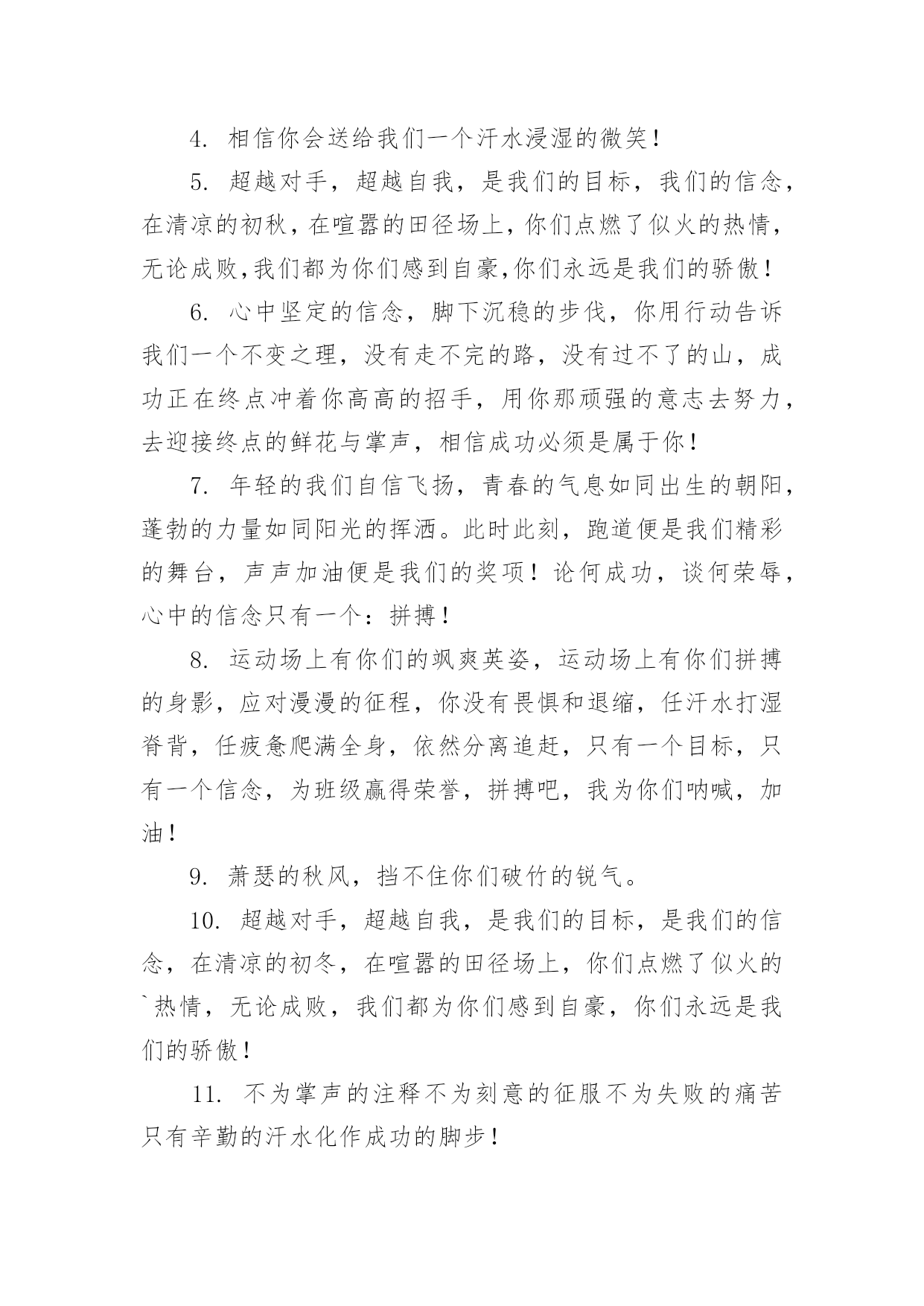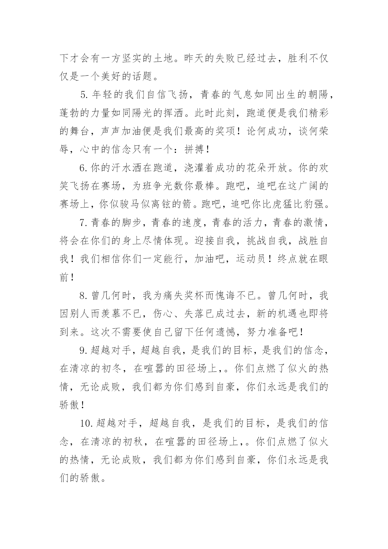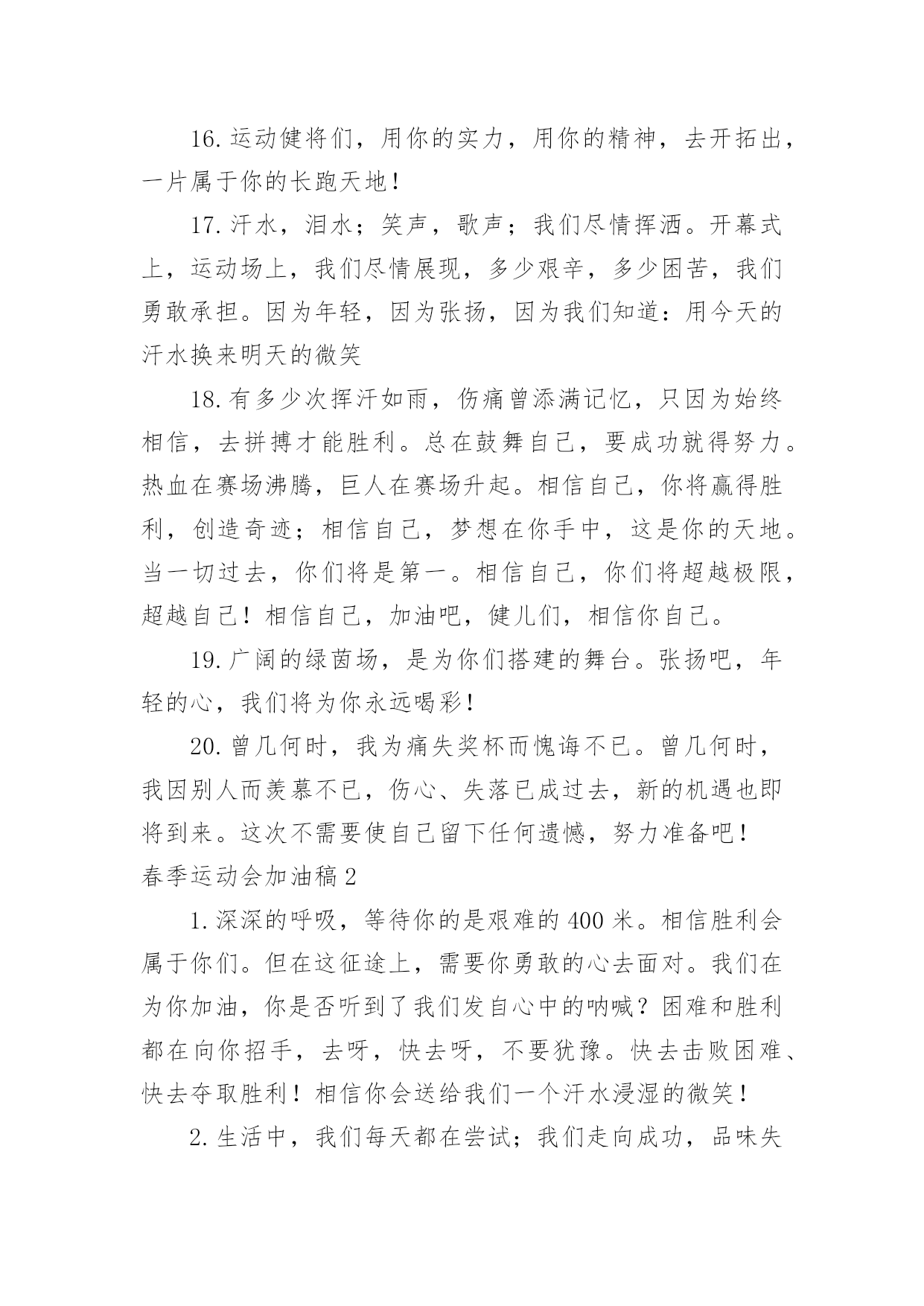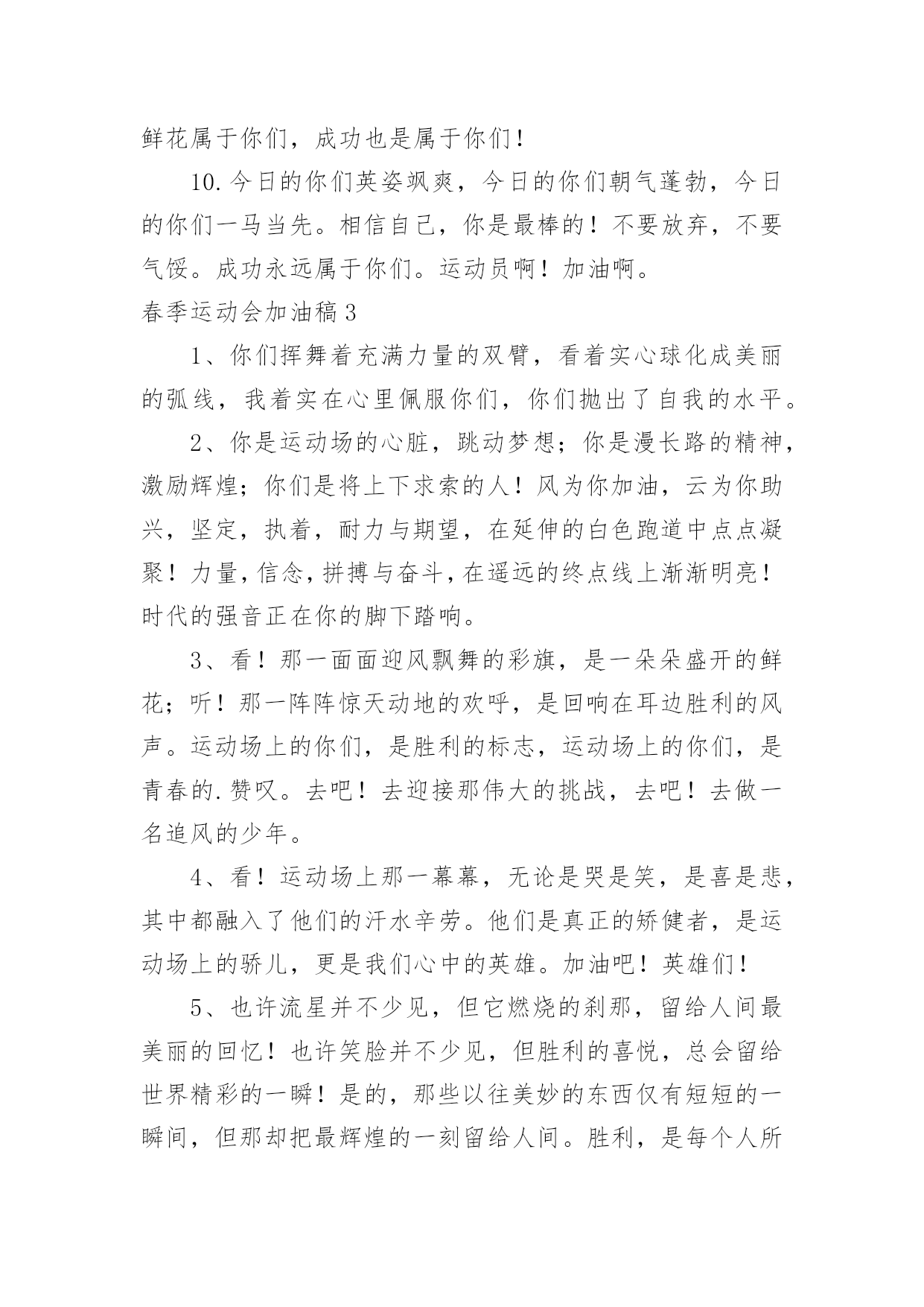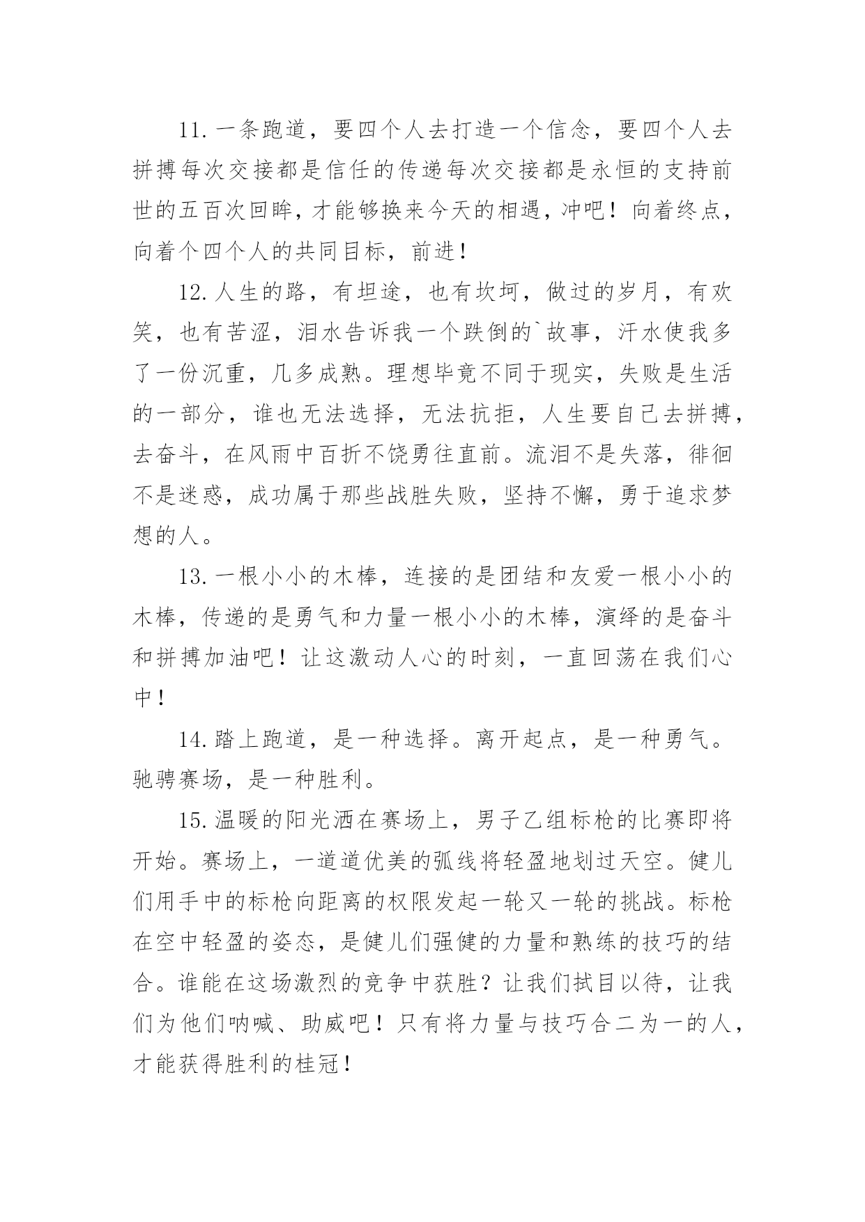 春季运动会加油稿【推荐】春季运动会加油稿在充满活力,日益开放的今天,我们都跟加油稿有着直接或间接的联系,借助加油稿可以激励他人的士气。那么,怎么去写加油稿呢?以下是小编为大家整理的春季运动会加油稿,仅供参考,大家一起来看看吧。春季运动会加油稿11.温暖的陽光洒在赛场上,男子乙组标枪的比赛即将开始。赛场上,一道道优美的弧线将轻盈地划过天空。健儿们用手中的标枪向距离的权限发起一轮又一轮的挑战。标枪在空中轻盈的姿态,是健儿们强健的力量和熟练的技巧的结合。谁能在这场激烈的竞争中获胜?让我们拭目以待,让我们为他们呐喊、助威吧!只有将力量与技巧合二为一的人,才能获得胜利的桂冠!2.你的汗水洒在跑道,浇灌着成功的花朵开放。你的欢笑飞扬在赛场,为班争光数你最棒。跑吧,追吧在这广阔的赛场上,你似骏马似离铉的箭。跑吧,追吧你比虎猛比豹强。3.你们挥舞着充满力量的双臂看着实心球化成美丽的弧线我着实在心里佩服你们你们抛出了自己的最佳水平。4.致失败者倒下的时候,生命又怎能屹立!歪歪斜斜的身影,又怎耐的住风雨的洗礼。你若有一个不屈的灵魂,脚下才会有一方坚实的土地。昨天的失败已经过去,胜利不仅仅是一个美好的话题。5.年轻的我们自信飞扬,青春的气息如同出生的朝陽,蓬勃的力量如同陽光的挥洒。此时此刻,跑道便是我们精彩的舞台,声声加油便是我们最高的奖项!论何成功,谈何荣辱,心中的信念只有一个:拼搏!6.你的汗水洒在跑道,浇灌着成功的花朵开放。你的欢笑飞扬在赛场,为班争光数你最棒。跑吧,追吧在这广阔的赛场上,你似骏马似离铉的箭。跑吧,追吧你比虎猛比豹强。7.青春的脚步,青春的速度,青春的活力,青春的激情,将会在你们的身上尽情体现。迎接自我,挑战自我,战胜自我!我们相信你们一定能行,加油吧,运动员!终点就在眼前!8.曾几何时,我为痛失奖杯而愧诲不已。曾几何时,我因别人而羡慕不已,伤心、失落已成过去,新的机遇也即将到来。这次不需要使自己留下任何遗憾,努力准备吧!9.超越对手,超越自我,是我们的目标,是我们的信念,在清凉的初冬,在喧嚣的田径场上,。你们点燃了似火的热情,无论成败,我们都为你们感到自豪,你们永远是我们的骄傲!10.超越对手,超越自我,是我们的目标,是我们的信念,在清凉的初秋,在喧嚣的田径场上,。你们点燃了似火的热情,无论成败,我们都为你们感到自豪,你们永远是我们的骄傲。11.一条跑道,要四个人去打造一个信念,要四个人去拼搏每次交接都是信任的传递每次交接都是永恒的支持前世的五百次回眸,才能够换来今天的相遇,冲吧!向着终点,向着个四个人的共同目标,前进!12.人生的路,有坦途,也有坎坷,做过的岁月,有欢笑,也有苦涩,泪水告诉我一个跌倒的`故事,汗水使我多了一份沉重,几多成熟。理想毕竟不同于现实,失败是生活的一部分,谁也无法选择,无法抗拒,人生要自己去拼搏,去奋斗,在风雨中百折不饶勇往直前。流泪不是失落,徘徊不是迷惑,成功属于那些战胜失败,坚持不懈,勇于追求梦想的人。13.一根小小的木棒,连接的是团结和友爱一根小小的木棒,传递的是勇气和力量一根小小的木棒,演绎的是奋斗和拼搏加油吧!让这激动人心的时刻,一直回荡在我们心中!14.踏上跑道,是一种选择。离开起点,是一种勇气。驰骋赛场,是一种胜利。15.温暖的阳光洒在赛场上,男子乙组标枪的比赛即将开始。赛场上,一道道优美的弧线将轻盈地划过天空。健儿们用手中的标枪向距离的权限发起一轮又一轮的挑战。标枪在空中轻盈的姿态,是健儿们强健的力量和熟练的技巧的结合。谁能在这场激烈的竞争中获胜?让我们拭目以待,让我们为他们呐喊、助威吧!只有将力量与技巧合二为一的人,才能获得胜利的桂冠!16.运动健将们,用你的实力,用你的精神,去开拓出,一片属于你的长跑天地!17.汗水,泪水;笑声,歌声;我们尽情挥洒。开幕式上,运动场上,我们尽情展现,多少艰辛,多少困苦,我们勇敢承担。因为年轻,因为张扬,因为我们知道:用今天的汗水换来明天的微笑18.有多少次挥汗如雨,伤痛曾添满记忆,只因为始终相信,去拼搏才能胜利。总在鼓舞自己,要成功就得努力。热血在赛场沸腾,巨人在赛场升起。相信自己,你将赢得胜利,创造奇迹;相信自己,梦想在你手中,这是你的天地。当一切过去,你们将是第一。相信自己,你们将超越极限,超越自己!相信自己,加油吧,健儿们,相信你自己。19.广阔的绿茵场,是为你们搭建的舞台。张扬吧,年轻的心,我们将为你永远喝彩!20.曾几何时,我为痛失奖杯而愧诲不已。曾几何时,我因别人而羡慕不已,伤心、失落已成过去,新的机遇也即将到来。这次不需要使自己留下任何遗憾,努力准备吧!春季运动会加油稿21.深深的呼吸,等待你的是艰难的400米。相信胜利会属于你们。但在这征途上,需要你勇敢的心去面对。我们在为你加油,你是否听到了我们发自心中的呐喊?困难和胜利都在