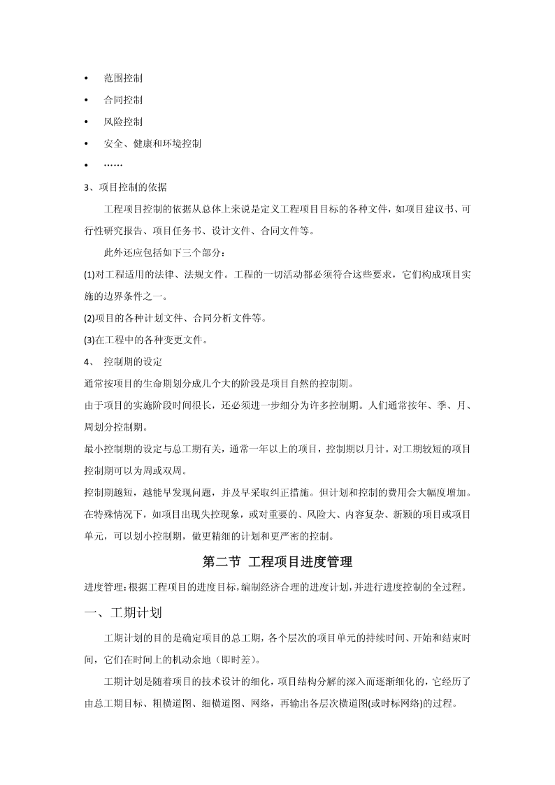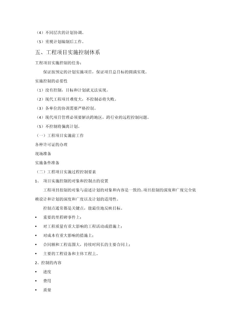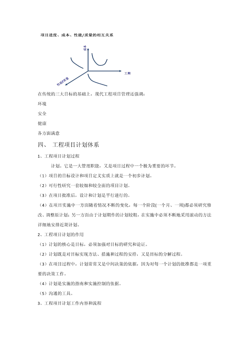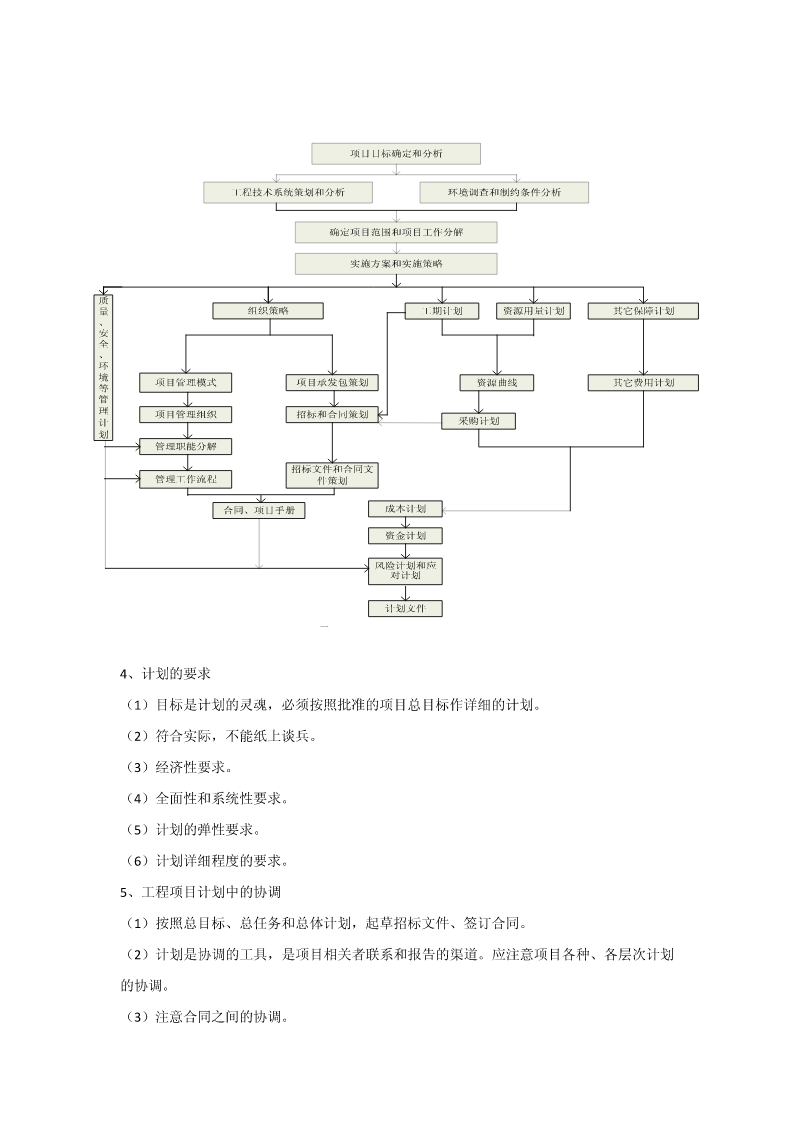 第五章建设工程项目目标管理第一节目标管理概述一、目标管理基本概念目标:是一定时期集体活动预期达到的成果或结果。目标管理(MBO,managementbyobjectives),指集体中成员亲自参加工作目标的制定,在实施中运用现代管理技术和行为科学,借助人们的事业感、能力、自信、自尊等,实行自我控制,努力实现目标。目标管理是以目标为导向,以人为中心,以成果为标准,而使组织和个人取得最佳业绩的现代管理方法。目标管理程序:目标管理的要点:(1)目标管理的基本点是以被管理活动的目标为中心,通过目标的实现,完成经济活动的任务。(2)目标管理的精髓“以目标指导实际行动”。(3)目标管理是面向未来的,主动的管理。(4)目标管理是全体人员参加的管理活动。目标责任体系二、控制原理参考课本三、工程项目目标体系在传统的三大目标的基础上,现代工程项目管理还强调:环境安全健康各方面满意四、工程项目计划体系1、工程项目计划过程计划。它是一大管理职能,又是项目过程中一个极为重要的环节。(1)项目的目标设计和项目定义实质上就是一个初步计划。(2)可行性研究一套较细和较全面的项目计划。(3)在项目批准后,设计和计划是平行进行的。(4)在项目实施中一方面随着情况不断的变化,每一个阶段(一个月、一周)都必须研究修改、调整原计划;另一方面由于计划期作的计划较粗,在实施中必须不断地采用滚动的方法详细地安排近期计划。2、工程项目计划的作用(1)计划的核心是目标,必须加强对目标的研究和论证。(2)计划既是对目标实现方法、措施和过程的安排,又是目标的分解过程。(3)在项目过程中,计划常常又是中间决策的依据,因为对每一个计划的批准都是一项重要的决策工作。(4)计划是实施的指南和实施控制的依据。(5)沟通的工具。3、工程项目计划工作内容和流程项目目标确定和分析工程技术系统策划和分析环境调查和制约条件分析确定项目范围和项目工作分解实施方案和实施策略质量组织策略工期计划资源用量计划其它保障计划、安全、环境项目管理模式项目承发包策划资源曲线其它费用计划等管理项目管理组织招标和合同策划计采购计划划管理职能分解招标文件和合同文管理工作流程件策划合同、项目手册成本计划资金计划风险计划和应对计划计划文件图2-34、计划的要求(1)目标是计划的灵魂,必须按照批准的项目总目标作详细的计划。(2)符合实际,不能纸上谈兵。(3)经济性要求。(4)全面性和系统性要求。(5)计划的弹性要求。(6)计划详细程度的要求。5、工程项目计划中的协调(1)按照总目标、总任务和总体计划,起草招标文件、签订合同。(2)计划是协调的工具,是项目相关者联系和报告的渠道。应注意项目各种、各层次计划的协调。(3)注意合同之间的协调。(4)不同层次的计划协调。(5)重视计划编制后工作。五、工程项目实施控制体系工程项目实施控制的任务:保证按预定的计划实施项目,保证项目总目标的圆满实现。实施控制的必要性(1)没有控制,目标和计划就无法实现。(2)现代工程项目难度大,不控制必将失败。(3)各单位的协调需要严格控制。(4)现代项目管理必须要解决跨地区,跨行业的远程控制问题。(5)不控制将偏离计划。(一)工程项目实施前工作各种许可证的办理现场准备实施条件准备(二)工程项目实施过程控制要素1、项目实施控制的对象和控制点的设置工程项目控制的对象与前述计划的对象和内容是一致的。项目控制的深度和广度完全依赖设计和计划的深度和广度以及计划的适用性。控制点通常都是关键点,能最佳地反映目标。重要的里程碑事件上;对工程质量有重大影响的工程活动或措施上;对成本有重大影响的措施上;合同额和工程范围大,持续时间长的主要合同上;主要的工程设备和主体工程上。2、控制的内容进度费用质量范围控制合同控制风险控制安全、健康和环境控制……3、项目控制的依据工程项目控制的依据从总体上来说是定义工程项目目标的各种文件,如项目建议书、可行性研究报告、项目任务书、设计文件、合同文件等。此外还应包括如下三个部分:(1)对工程适用的法律、法规文件。工程的一切活动都必须符合这些要求,它们构成项目实施的边界条件之一。(2)项目的各种计划文件、合同分析文件等。(3)在工程中的各种变更文件。4