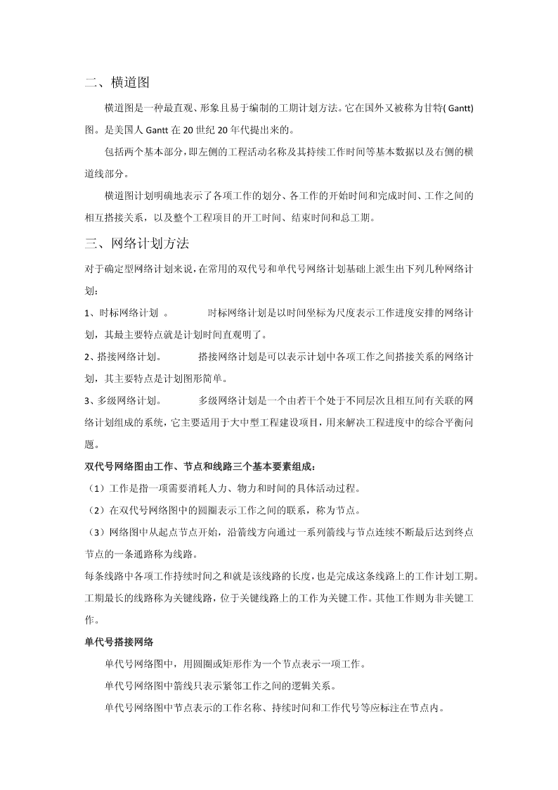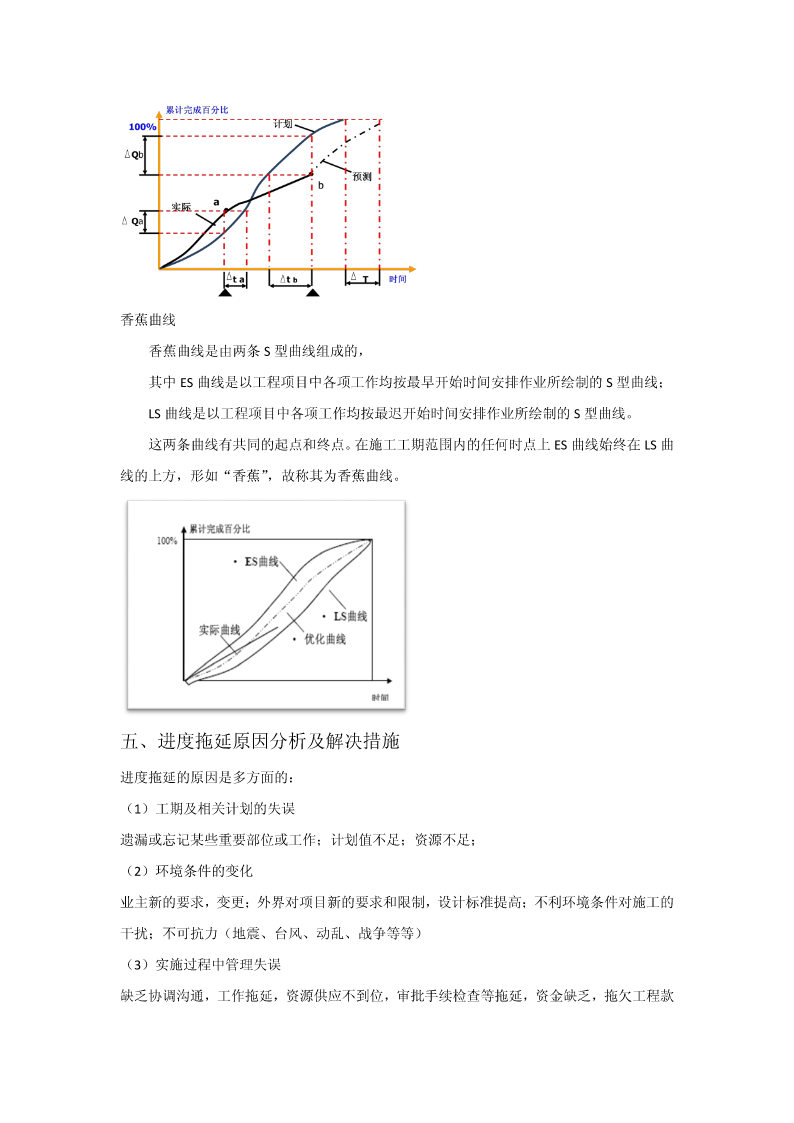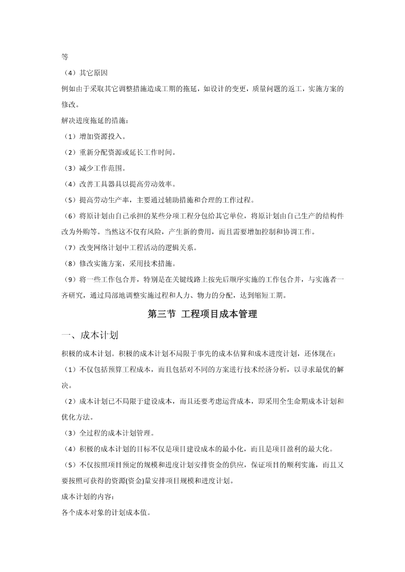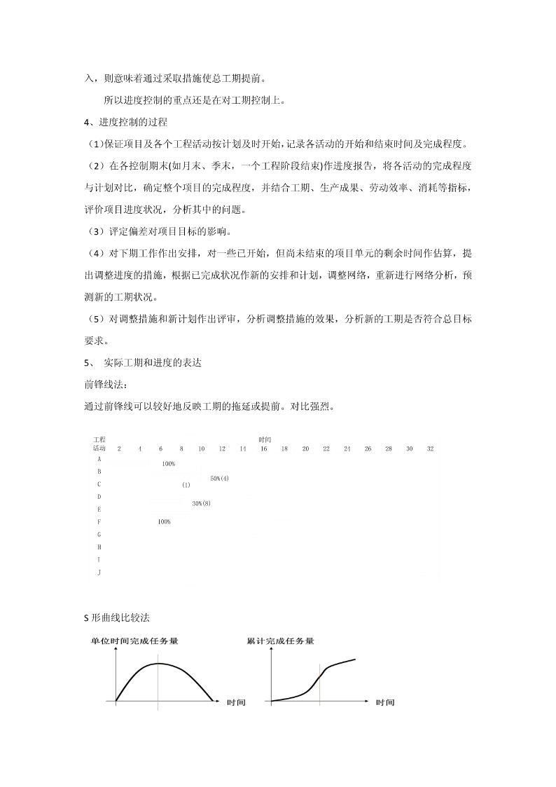 第五章建设工程项目目标管理第一节目标管理概述一、目标管理基本概念目标:是一定时期集体活动预期达到的成果或结果。目标管理(MBO,managementbyobjectives),指集体中成员亲自参加工作目标的制定,在实施中运用现代管理技术和行为科学,借助人们的事业感、能力、自信、自尊等,实行自我控制,努力实现目标。目标管理是以目标为导向,以人为中心,以成果为标准,而使组织和个人取得最佳业绩的现代管理方法。目标管理程序:目标管理的要点:(1)目标管理的基本点是以被管理活动的目标为中心,通过目标的实现,完成经济活动的任务。(2)目标管理的精髓“以目标指导实际行动”。(3)目标管理是面向未来的,主动的管理。(4)目标管理是全体人员参加的管理活动。目标责任体系二、控制原理参考课本三、工程项目目标体系在传统的三大目标的基础上,现代工程项目管理还强调:环境安全健康各方面满意四、工程项目计划体系1、工程项目计划过程计划。它是一大管理职能,又是项目过程中一个极为重要的环节。(1)项目的目标设计和项目定义实质上就是一个初步计划。(2)可行性研究一套较细和较全面的项目计划。(3)在项目批准后,设计和计划是平行进行的。(4)在项目实施中一方面随着情况不断的变化,每一个阶段(一个月、一周)都必须研究修改、调整原计划;另一方面由于计划期作的计划较粗,在实施中必须不断地采用滚动的方法详细地安排近期计划。2、工程项目计划的作用(1)计划的核心是目标,必须加强对目标的研究和论证。(2)计划既是对目标实现方法、措施和过程的安排,又是目标的分解过程。(3)在项目过程中,计划常常又是中间决策的依据,因为对每一个计划的批准都是一项重要的决策工作。(4)计划是实施的指南和实施控制的依据。(5)沟通的工具。3、工程项目计划工作内容和流程项目目标确定和分析工程技术系统策划和分析环境调查和制约条件分析确定项目范围和项目工作分解实施方案和实施策略质量组织策略工期计划资源用量计划其它保障计划、安全、环境项目管理模式项目承发包策划资源曲线其它费用计划等管理项目管理组织招标和合同策划计采购计划划管理职能分解招标文件和合同文管理工作流程件策划合同、项目手册成本计划资金计划风险计划和应对计划计划文件图2-34、计划的要求(1)目标是计划的灵魂,必须按照批准的项目总目标作详细的计划。(2)符合实际,不能纸上谈兵。(3)经济性要求。(4)全面性和系统性要求。(5)计划的弹性要求。(6)计划详细程度的要求。5、工程项目计划中的协调(1)按照总目标、总任务和总体计划,起草招标文件、签订合同。(2)计划是协调的工具,是项目相关者联系和报告的渠道。应注意项目各种、各层次计划的协调。(3)注意合同之间的协调。(4)不同层次的计划协调。(5)重视计划编制后工作。五、工程项目实施控制体系工程项目实施控制的任务:保证按预定的计划实施项目,保证项目总目标的圆满实现。实施控制的必要性(1)没有控制,目标和计划就无法实现。(2)现代工程项目难度大,不控制必将失败。(3)各单位的协调需要严格控制。(4)现代项目管理必须要解决跨地区,跨行业的远程控制问题。(5)不控制将偏离计划。(一)工程项目实施前工作各种许可证的办理现场准备实施条件准备(二)工程项目实施过程控制要素1、项目实施控制的对象和控制点的设置工程项目控制的对象与前述计划的对象和内容是一致的。项目控制的深度和广度完全依赖设计和计划的深度和广度以及计划的适用性。控制点通常都是关键点,能最佳地反映目标。重要的里程碑事件上;对工程质量有重大影响的工程活动或措施上;对成本有重大影响的措施上;合同额和工程范围大,持续时间长的主要合同上;主要的工程设备和主体工程上。2、控制的内容进度费用质量范围控制合同控制风险控制安全、健康和环境控制……3、项目控制的依据工程项目控制的依据从总体上来说是定义工程项目目标的各种文件,如项目建议书、可行性研究报告、项目任务书、设计文件、合同文件等。此外还应包括如下三个部分:(1)对工程适用的法律、法规文件。工程的一切活动都必须符合这些要求,它们构成项目实施的边界条件之一。(2)项目的各种计划文件、合同分析文件等。(3)在工程中的各种变更文件。4