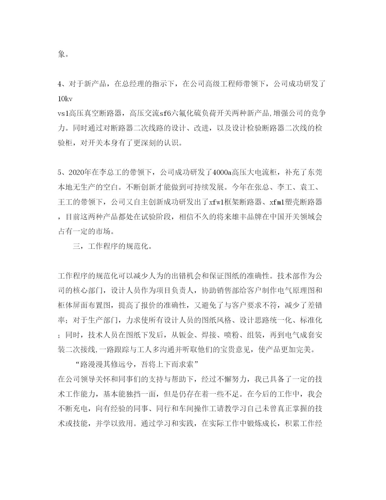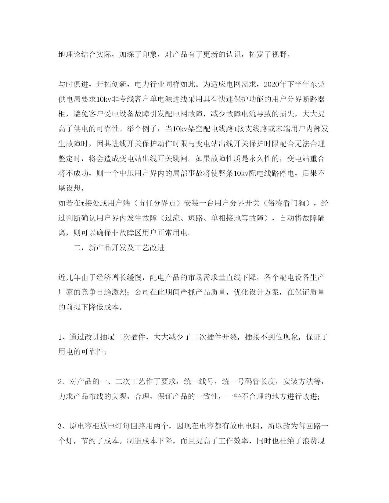 此资料由网络收集而来,如有侵权请告知上传者立即删除。资料共分享,我们负责传递知识。电气工程师专业技术工作总结时光匆匆,转眼之间已经毕业三年了。在xx公司工作也已经有二年多的时间了,由于工作的需求和提高自己的技术水平,我进入xx配电设备有限公司技术部学习和工作。在xx公司工作至今两年多,已经成长为一名合格的电气工程师。一、成长过程。刚进公司时,必须去电气车间实习。期间主要是熟悉产品,为以后的设计打基础。实习结束后,我正式进入技术部工作。刚开始时,主要负责设计小箱、pgl、ggd、一些比较标准的xgn36(15)-12等一些小订单,通常数量在几台,或者产值不超过10万的订单。这段时间跟着总工和老工程师学习,晚上培训专业技能和基础知识,然后在订单上检验学习成果。这段时间的学习和工作给我留下了深刻的印象和影响。一些比较标准的工程订单,如星三角降压启动、全压启动、自耦降压启动、电机正反转等,这些都是在学校学习过的,但当时印象不深,做了这些电动机控制的项目后,将以前的理论和实际结合在一起,能够举一反三,设计出有自己风格的控制产品。比如温度控制箱、瓦斯控制箱、路灯控制箱等等。这类产品主要遇到的问题就是元器件的布置摆放,直接影响到箱体或柜体的外型尺寸,以及电缆走向。一旦不细心,用户在安装、使用过程中就会遇到大量的问题。做这类产品时,必须要细心,多去现场和客户沟通,了解客户意图后,能设计出大概的布置图和外型图给客户确认。随着经验的增长,开始做比较大套的gck、通常数量在几十台或上百台,产值通常超过五十万元,甚至百万元。主要功能单元有:计量柜、进线柜、电容补偿柜、馈电柜、市发电转换柜、联络柜。LOCAlhOst计量柜基本每两年广东电网东莞供电局会提出新的要求,通常提出新要求的一个月内,出现问题的情况是最多的。比如以前要求315kva及以上的变压器要求装设两组电流互感器、一个有功表、一个电子表,采用低压计费的方式。而现在为一组电流互感器、一个有功表,必须装10kv高压计量柜,采用高压计费方式。一旦不注意这个问题,出货到现场通不了电,通不过验收,现场改造工程量很大,而且会给公司带来负面影响。gck常用的馈电单元为抽屉柜,是国内较为先进的一种柜型。通常需要注意的是负载中是否有“非消防必保负荷”,这样的负荷在火灾时必须要停电,防止事故扩大。通常在塑壳断路器加装一个dc24v的消防分励线圈来实现跳闸。很多人理解为“不是—消防类必须保护的负荷”,导致跳闸线圈加错了位置,把一些消防类的负载跳掉了,如消防风机、消防水泵等,实际上消防类负荷的不能停电的。一旦火灾时,会导致火灾更严重。应该理解为“非消防类的、必须保护的负荷”。再往后,开始做高压电缆分接箱dfw-12和高/低压预装式电站ybp(m),再到xgn15环网柜、kyn28a-12中置柜以及比较复杂的plc和变频控制柜、直流屏(gzdw)、信号屏;从简单到复杂;从小工程、小数量到大工程、多台大订单;随着设计工程的增多,经验的增长,对于各个柜型的系统原理图设计,二次控制接线图的设计,包括各种非标电机、风机、消防控制箱,以及各种双电源、多电源三合二、五合三系统能够熟练掌握,合理运用。同时,对于各种柜体的结构特点十分熟悉。曾负责过东莞百事威房地产(雍雅山庄)、东莞市委党校、长安华南电子厂、东莞理工学院城市学院、阿克苏诺贝尔涂料(东莞)有限公司、东莞国丰粮油中心电房、东莞生态园办公大楼、茶山美丽湾畔花园住宅区、东莞职业技术学院等工程项目的设计;通过与甲方、弱电设计方的合作,对电力系统的设计、运行有了更全面的认识。这些年期间跟随总工参与了对珠江啤酒厂垂直母排终端拉弧事故分析,风岗供电公司10kv户外电缆分接箱短路故障分析,中堂沙泵厂受谐波影响的治理方案、以及东莞裕元鞋厂大电流柜的噪音处理等事件,加深了对理论知识的理解,能更好地理论结合实际,加深了印象,对产品有了更新的认识,拓宽了视野。与时俱进,开拓创新,电力行业同样如此。为适应电网需求,2020年下半年东莞供电局要求10kv非专线客户单电源进线采用具有快速保护功能的用户分界断路器柜,避免客户受电设备故障引发配电网故障,减少故障电流导致的损失,大大提高了供电的可靠性。举个例子:当10kv架空配电线路t接支线路或末端用户内部发生故障时,因其进线开关保护动作时限与变电站出线开关保护时限配合无法合理整定时,将会造成变电站出线开关跳闸。如果故障性质是永久性的,变电站重合将不成功,则一个中压用户界内的局部事故将使整条10kv配电线路停电,后果不堪设想。如若在t接处或用户端(责任分界点)安装一台用户分界开关(俗称看门狗),经过判断确认用户界内发生故障(过流、短路、单相接地等故障),自动将故障隔离,则可以确保非故障区用户正常用电。二,新产品开发及工艺改进。近几