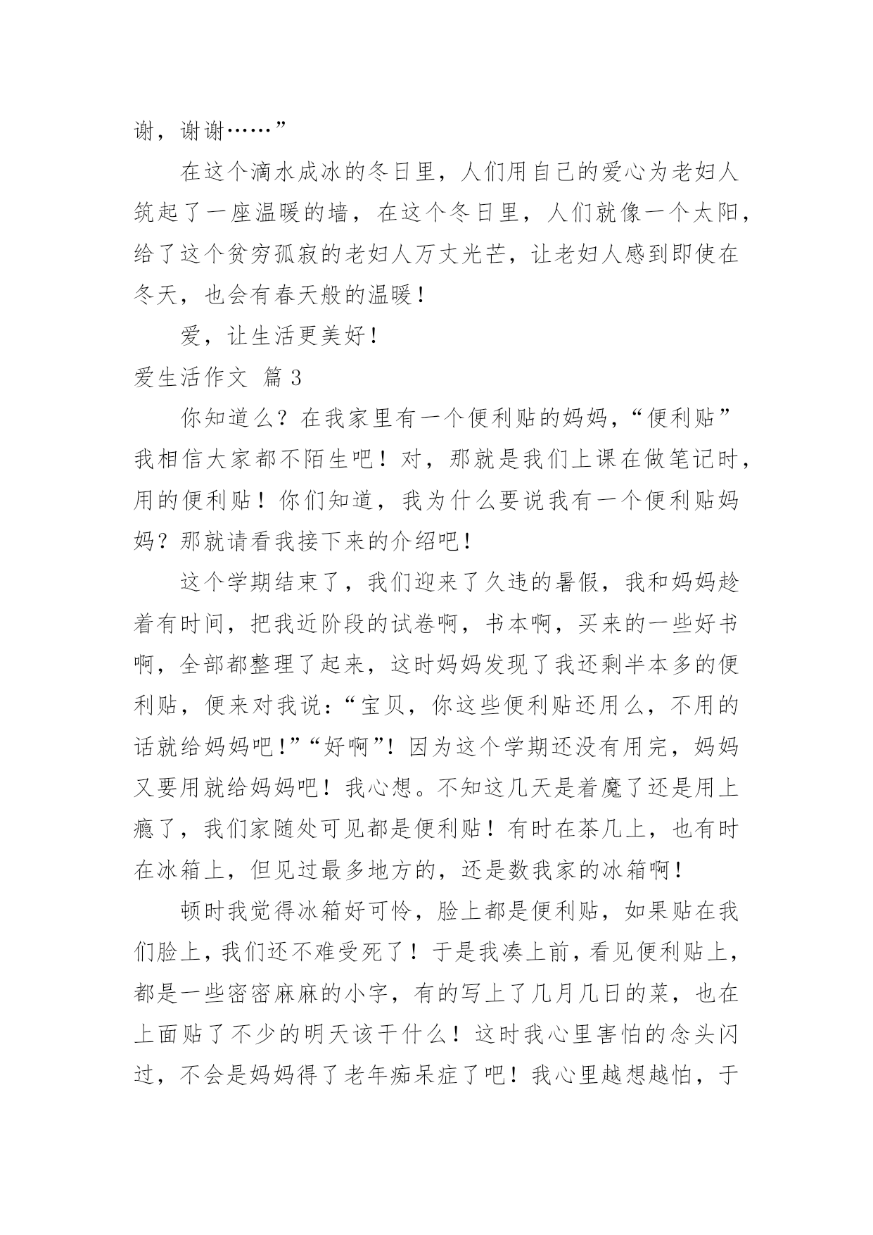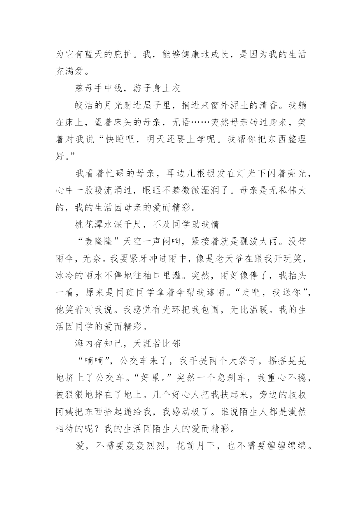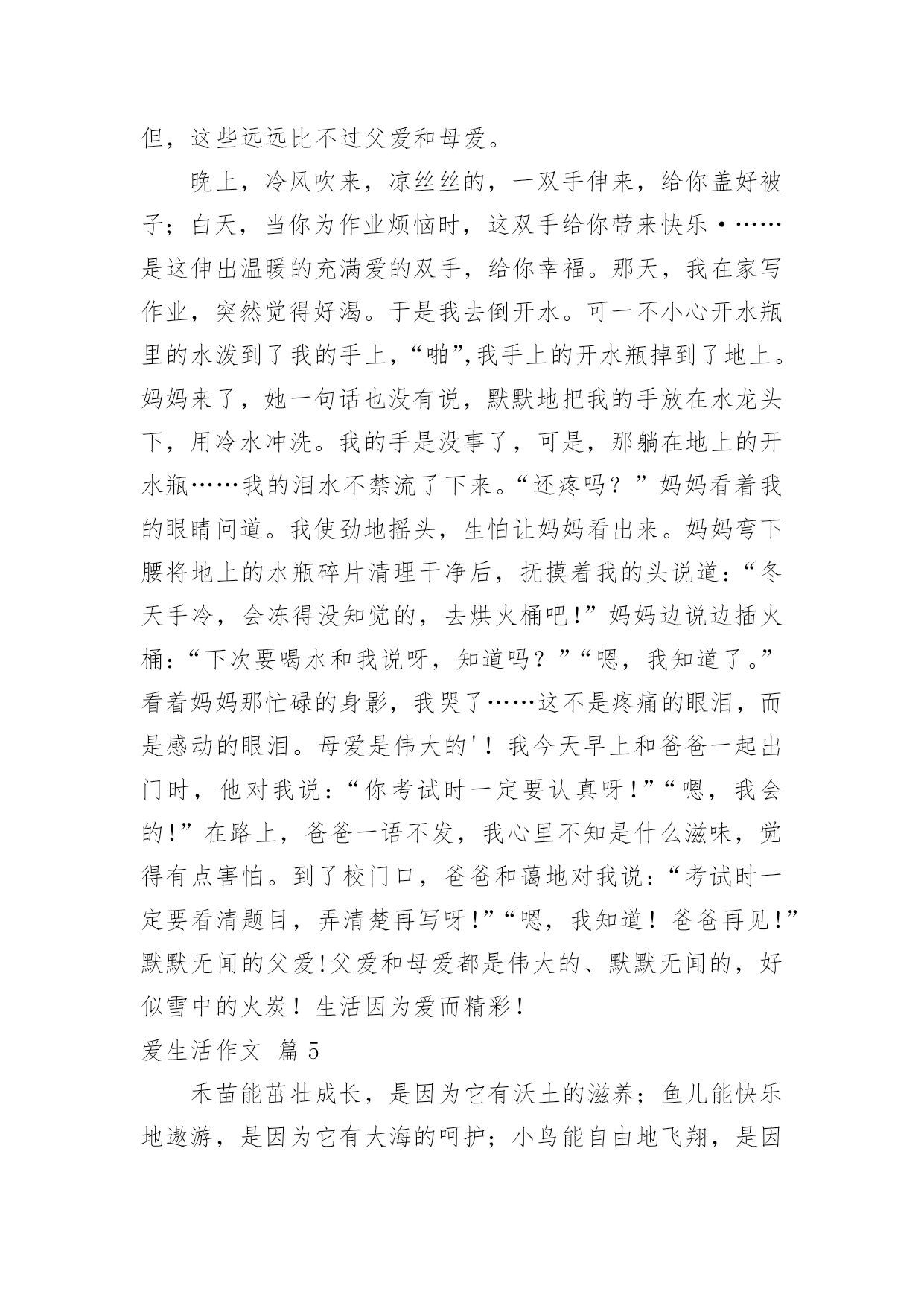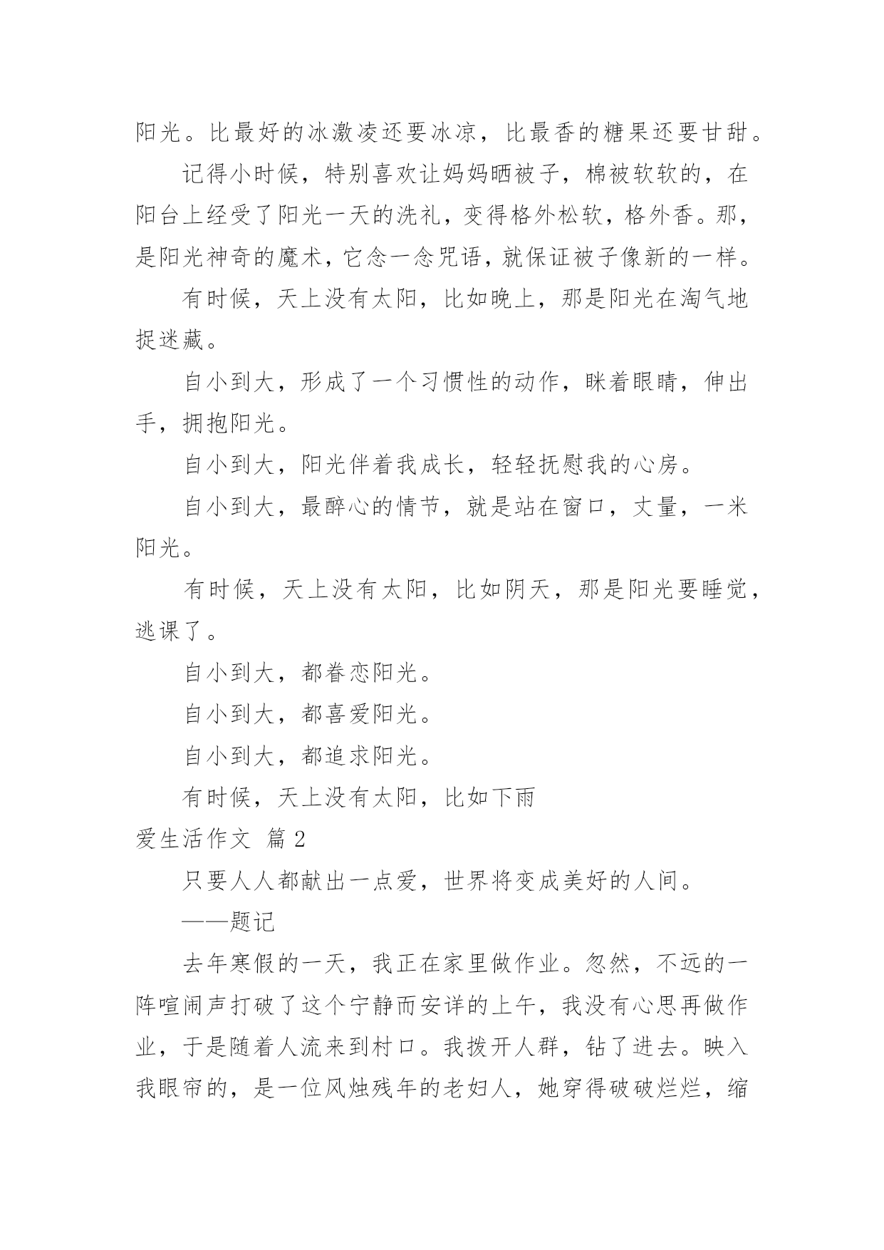 爱生活作文【精选】爱生活作文10篇在学习、工作、生活中,许多人都写过作文吧,作文是由文字组成,经过人的思想考虑,通过语言组织来表达一个主题意义的文体。你知道作文怎样写才规范吗?以下是小编精心整理的爱生活作文10篇,希望能够帮助到大家。爱生活作文篇1阳光,是我一直的信仰。无与伦比的单纯,暖暖的光亮,淡淡地绽放。很安静,却又张扬,纯朴,却又不单调。掬一捧阳光,起身,洒在脸上。生活,你知道么?多亏了阳光呢????─────题记抬头仰望,蓝色的天光,因着阳光变得更美好。固执的抬头看着它,就会莫名其妙地流泪,呵呵是因为阳光把眼睛刺痛了。记得小时候,我在幼儿园不大的操场上,在滑梯正中央,用脚踩住旁边的栏杆,扬着脑袋看太阳,小朋友们学着我的样子,结果大家眼里都闪着泪光。而心里,却是那是幼小心灵几近不能承受的,满满得快要溢出的温暖。我们手拉着手在阳光下奔跑,尽情嬉闹。跑过了长长一段时间,很长的,像梦一样。记得小时候,我在家门口不宽的草坪里,在那时快要长过膝盖的绿草中,也不嫌脏,就静静地躺下,看阳光,闻着青草的味道,淡淡的清香,充斥在鼻翼里,就像是青草味的阳光。比最好的冰激凌还要冰凉,比最香的糖果还要甘甜。记得小时候,特别喜欢让妈妈晒被子,棉被软软的,在阳台上经受了阳光一天的洗礼,变得格外松软,格外香。那,是阳光神奇的魔术,它念一念咒语,就保证被子像新的一样。有时候,天上没有太阳,比如晚上,那是阳光在淘气地捉迷藏。自小到大,形成了一个习惯性的动作,眯着眼睛,伸出手,拥抱阳光。自小到大,阳光伴着我成长,轻轻抚慰我的心房。自小到大,最醉心的情节,就是站在窗口,丈量,一米阳光。有时候,天上没有太阳,比如阴天,那是阳光要睡觉,逃课了。自小到大,都眷恋阳光。自小到大,都喜爱阳光。自小到大,都追求阳光。有时候,天上没有太阳,比如下雨爱生活作文篇2只要人人都献出一点爱,世界将变成美好的人间。——题记去年寒假的一天,我正在家里做作业。忽然,不远的一阵喧闹声打破了这个宁静而安详的上午,我没有心思再做作业,于是随着人流来到村口。我拨开人群,钻了进去。映入我眼帘的,是一位风烛残年的老妇人,她穿得破破烂烂,缩在墙角瑟瑟发抖,她饱经风霜的脸上显示出岁月的沧桑,一双黯淡无光的眼睛内透着许多的无奈和无助,她旁边的破碗里,只有两三个硬币,见我离她最近,她就立即用乞求的目光看着我,还说:“行行好吧,我的儿子嫌我老,不要我,我已经有好几天都没有吃饭了,行行好吧……”顿时,我的心里像被针扎了一下,对于这个老妇人的哭喊,我的心里真不是滋味,我将手默默地伸进了口袋,准备给她一点钱时,就听见旁边的两个大人议论说:“现在这年头,骗子这么多,谁知道是真是假呢?唉……”我向四周看了一下,人们大多只是摇摇头叹息着,眼里流露出同情的目光,却没有一个人肯伸出援助之手,我已经伸出的手又缩回了口袋。我们谁也没有注意到王叔叔离开了人群,不一会儿,他又回来了,不同的是,此时的他手里端了一碗热气腾腾的面。他把面递给老人,还说:“慢慢吃,不够我锅里还有,您哪,就放宽心,什么也不要多想,您的好日子还长着呢!”我的脸一下子红到了耳朵根上,羞愧得无地自容,跟人家比,我究竟差了多少,对于弱者,我们需要给予他关心和帮助,而不是去对他猜疑,去评头论足。不经意间,我看了老妇人一眼,竟然发现老妇人的眼睛里闪烁着晶莹的泪花,我无语,径直走到老人面前,将手里的几块钱塞到老人手里,然后冲她善意地微笑一下,退回到人群中。这时,喧嚷的人群竟一下子安静了,人们也都纷纷解囊,献出自己的一份爱心,老妇人在一旁不住地说:“谢谢,谢谢……”在这个滴水成冰的冬日里,人们用自己的爱心为老妇人筑起了一座温暖的墙,在这个冬日里,人们就像一个太阳,给了这个贫穷孤寂的老妇人万丈光芒,让老妇人感到即使在冬天,也会有春天般的温暖!爱,让生活更美好!爱生活作文篇3你知道么?在我家里有一个便利贴的妈妈,“便利贴”我相信大家都不陌生吧!对,那就是我们上课在做笔记时,用的便利贴!你们知道,我为什么要说我有一个便利贴妈妈?那就请看我接下来的介绍吧!这个学期结束了,我们迎来了久违的暑假,我和妈妈趁着有时间,把我近阶段的试卷啊,书本啊,买来的一些好书啊,全部都整理了起来,这时妈妈发现了我还剩半本多的便利贴,便来对我说:“宝贝,你这些便利贴还用么,不用的话就给妈妈吧!”“好啊”!因为这个学期还没有用完,妈妈又要用就给妈妈吧!我心想。不知这几天是着魔了还是用上瘾了,我们家随处可见都是便利贴!有时在茶几上,也有时在冰箱上,但见过最多地方的,还是数我家的冰箱啊!顿时我觉得冰箱好可怜,脸上都是便利贴,如果贴在我们脸上,我们还不难受死了!于是我凑上前,看见便利贴上,都是一些密密麻麻的小字,有的写上了几月几日的菜,也在上面贴了不少的明天该干什么!这时我心里害怕的念头闪过,不会是妈妈得了