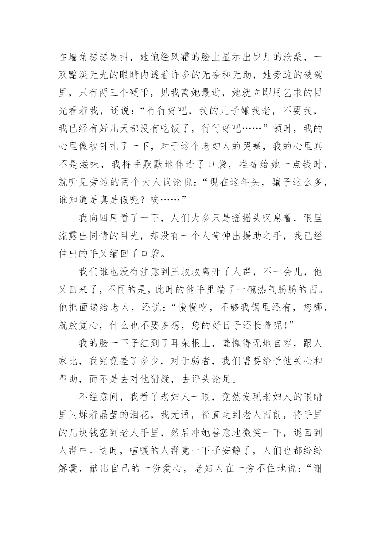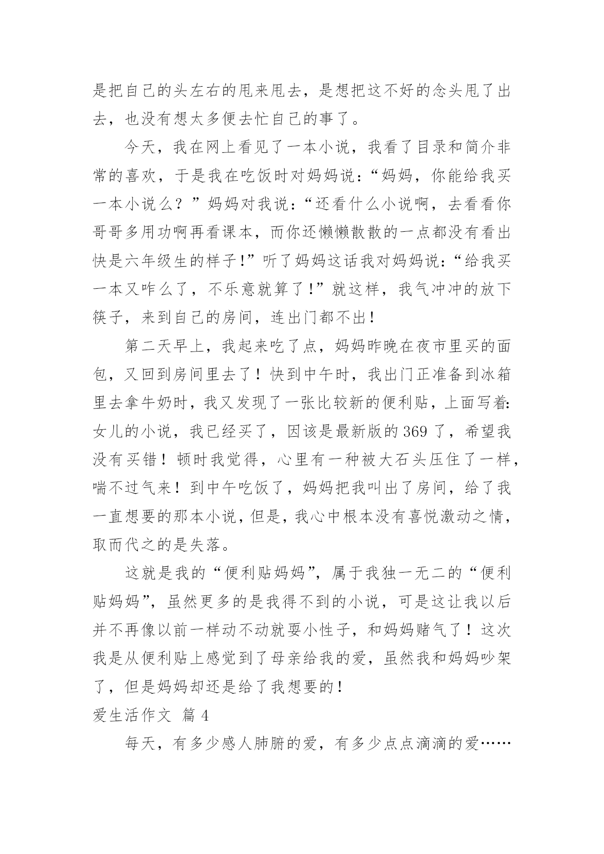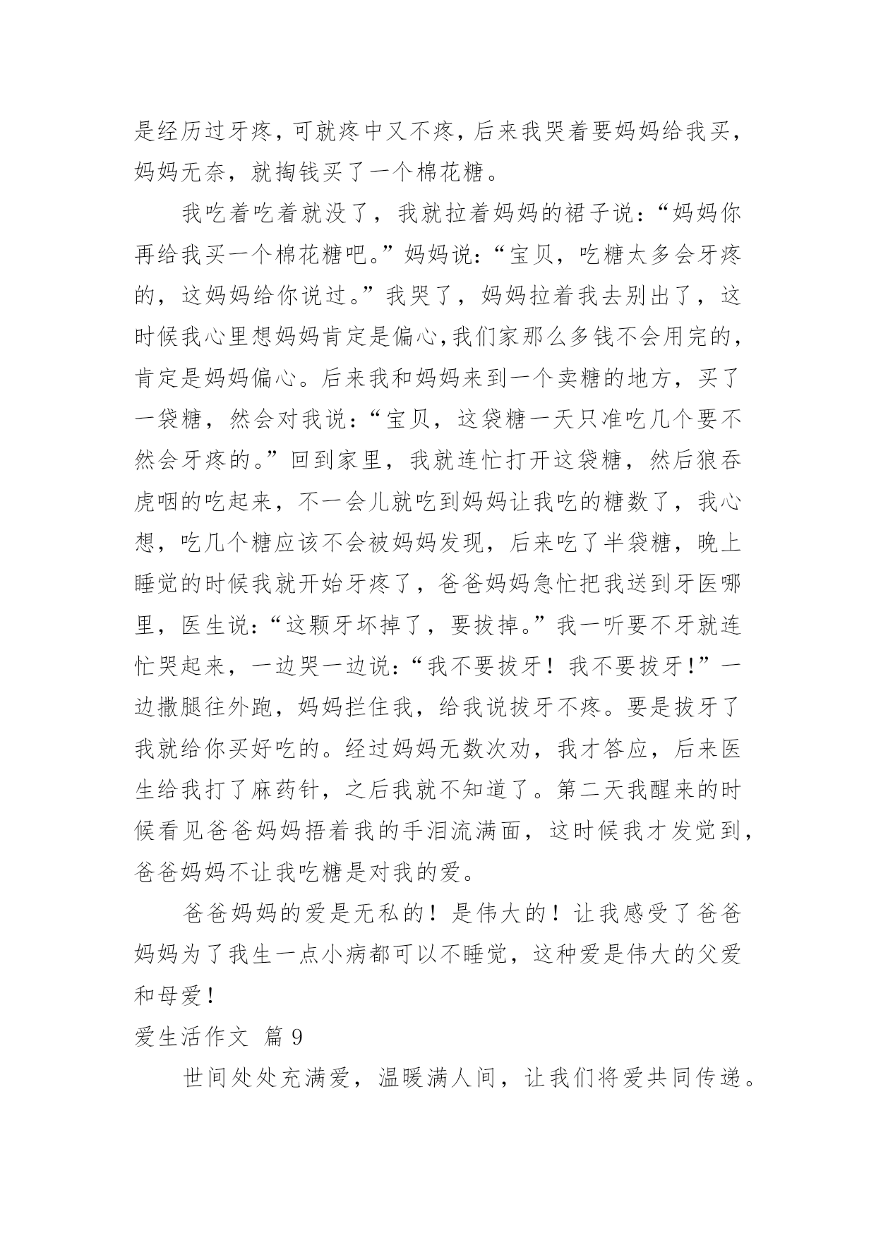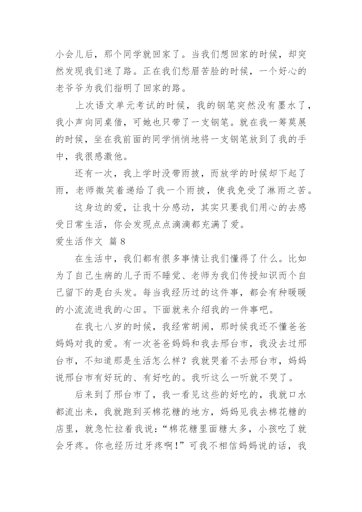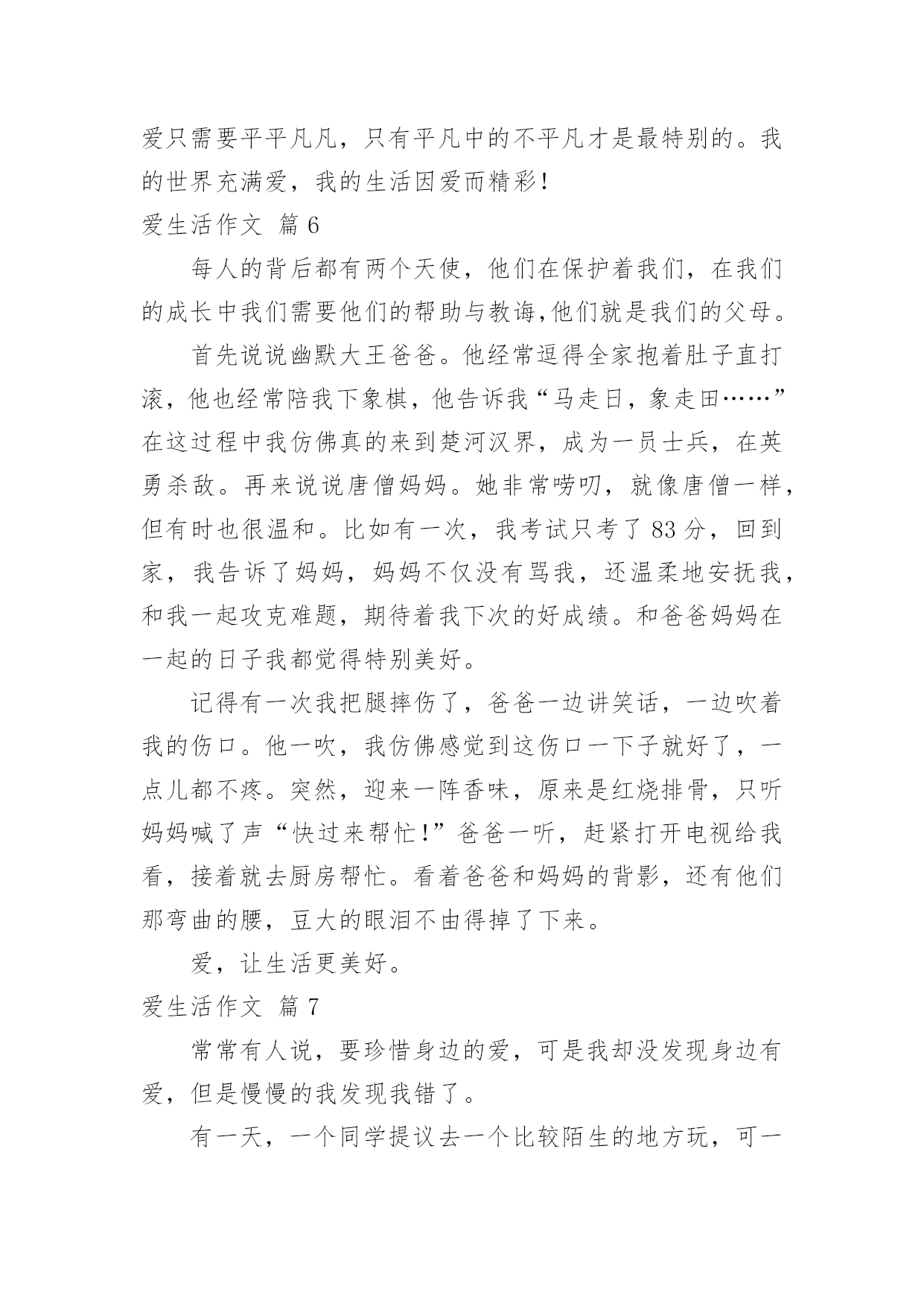 爱生活作文【精选】爱生活作文10篇在学习、工作、生活中,许多人都写过作文吧,作文是由文字组成,经过人的思想考虑,通过语言组织来表达一个主题意义的文体。你知道作文怎样写才规范吗?以下是小编精心整理的爱生活作文10篇,希望能够帮助到大家。爱生活作文篇1阳光,是我一直的信仰。无与伦比的单纯,暖暖的光亮,淡淡地绽放。很安静,却又张扬,纯朴,却又不单调。掬一捧阳光,起身,洒在脸上。生活,你知道么?多亏了阳光呢????─────题记抬头仰望,蓝色的天光,因着阳光变得更美好。固执的抬头看着它,就会莫名其妙地流泪,呵呵是因为阳光把眼睛刺痛了。记得小时候,我在幼儿园不大的操场上,在滑梯正中央,用脚踩住旁边的栏杆,扬着脑袋看太阳,小朋友们学着我的样子,结果大家眼里都闪着泪光。而心里,却是那是幼小心灵几近不能承受的,满满得快要溢出的温暖。我们手拉着手在阳光下奔跑,尽情嬉闹。跑过了长长一段时间,很长的,像梦一样。记得小时候,我在家门口不宽的草坪里,在那时快要长过膝盖的绿草中,也不嫌脏,就静静地躺下,看阳光,闻着青草的味道,淡淡的清香,充斥在鼻翼里,就像是青草味的阳光。比最好的冰激凌还要冰凉,比最香的糖果还要甘甜。记得小时候,特别喜欢让妈妈晒被子,棉被软软的,在阳台上经受了阳光一天的洗礼,变得格外松软,格外香。那,是阳光神奇的魔术,它念一念咒语,就保证被子像新的一样。有时候,天上没有太阳,比如晚上,那是阳光在淘气地捉迷藏。自小到大,形成了一个习惯性的动作,眯着眼睛,伸出手,拥抱阳光。自小到大,阳光伴着我成长,轻轻抚慰我的心房。自小到大,最醉心的情节,就是站在窗口,丈量,一米阳光。有时候,天上没有太阳,比如阴天,那是阳光要睡觉,逃课了。自小到大,都眷恋阳光。自小到大,都喜爱阳光。自小到大,都追求阳光。有时候,天上没有太阳,比如下雨爱生活作文篇2只要人人都献出一点爱,世界将变成美好的人间。——题记去年寒假的一天,我正在家里做作业。忽然,不远的一阵喧闹声打破了这个宁静而安详的上午,我没有心思再做作业,于是随着人流来到村口。我拨开人群,钻了进去。映入我眼帘的,是一位风烛残年的老妇人,她穿得破破烂烂,缩在墙角瑟瑟发抖,她饱经风霜的脸上显示出岁月的沧桑,一双黯淡无光的眼睛内透着许多的无奈和无助,她旁边的破碗里,只有两三个硬币,见我离她最近,她就立即用乞求的目光看着我,还说:“行行好吧,我的儿子嫌我老,不要我,我已经有好几天都没有吃饭了,行行好吧……”顿时,我的心里像被针扎了一下,对于这个老妇人的哭喊,我的心里真不是滋味,我将手默默地伸进了口袋,准备给她一点钱时,就听见旁边的两个大人议论说:“现在这年头,骗子这么多,谁知道是真是假呢?唉……”我向四周看了一下,人们大多只是摇摇头叹息着,眼里流露出同情的目光,却没有一个人肯伸出援助之手,我已经伸出的手又缩回了口袋。我们谁也没有注意到王叔叔离开了人群,不一会儿,他又回来了,不同的是,此时的他手里端了一碗热气腾腾的面。他把面递给老人,还说:“慢慢吃,不够我锅里还有,您哪,就放宽心,什么也不要多想,您的好日子还长着呢!”我的脸一下子红到了耳朵根上,羞愧得无地自容,跟人家比,我究竟差了多少,对于弱者,我们需要给予他关心和帮助,而不是去对他猜疑,去评头论足。不经意间,我看了老妇人一眼,竟然发现老妇人的眼睛里闪烁着晶莹的泪花,我无语,径直走到老人面前,将手里的几块钱塞到老人手里,然后冲她善意地微笑一下,退回到人群中。这时,喧嚷的人群竟一下子安静了,人们也都纷纷解囊,献出自己的一份爱心,老妇人在一旁不住地说:“谢谢,谢谢……”在这个滴水成冰的冬日里,人们用自己的爱心为老妇人筑起了一座温暖的墙,在这个冬日里,人们就像一个太阳,给了这个贫穷孤寂的老妇人万丈光芒,让老妇人感到即使在冬天,也会有春天般的温暖!爱,让生活更美好!爱生活作文篇3你知道么?在我家里有一个便利贴的妈妈,“便利贴”我相信大家都不陌生吧!对,那就是我们上课在做笔记时,用的便利贴!你们知道,我为什么要说我有一个便利贴妈妈?那就请看我接下来的介绍吧!这个学期结束了,我们迎来了久违的暑假,我和妈妈趁着有时间,把我近阶段的试卷啊,书本啊,买来的一些好书啊,全部都整理了起来,这时妈妈发现了我还剩半本多的便利贴,便来对我说:“宝贝,你这些便利贴还用么,不用的话就给妈妈吧!”“好啊”!因为这个学期还没有用完,妈妈又要用就给妈妈吧!我心想。不知这几天是着魔了还是用上瘾了,我们家随处可见都是便利贴!有时在茶几上,也有时在冰箱上,但见过最多地方的,还是数我家的冰箱啊!顿时我觉得冰箱好可怜,脸上都是便利贴,如果贴在我们脸上,我们还不难受死了!于是我凑上前,看见便利贴上,都是一些密密麻麻的小字,有的写上了几月几日的菜,也在上面贴了不少的明天该干什么!这时我心里害怕的念头闪过,不会是妈妈得了