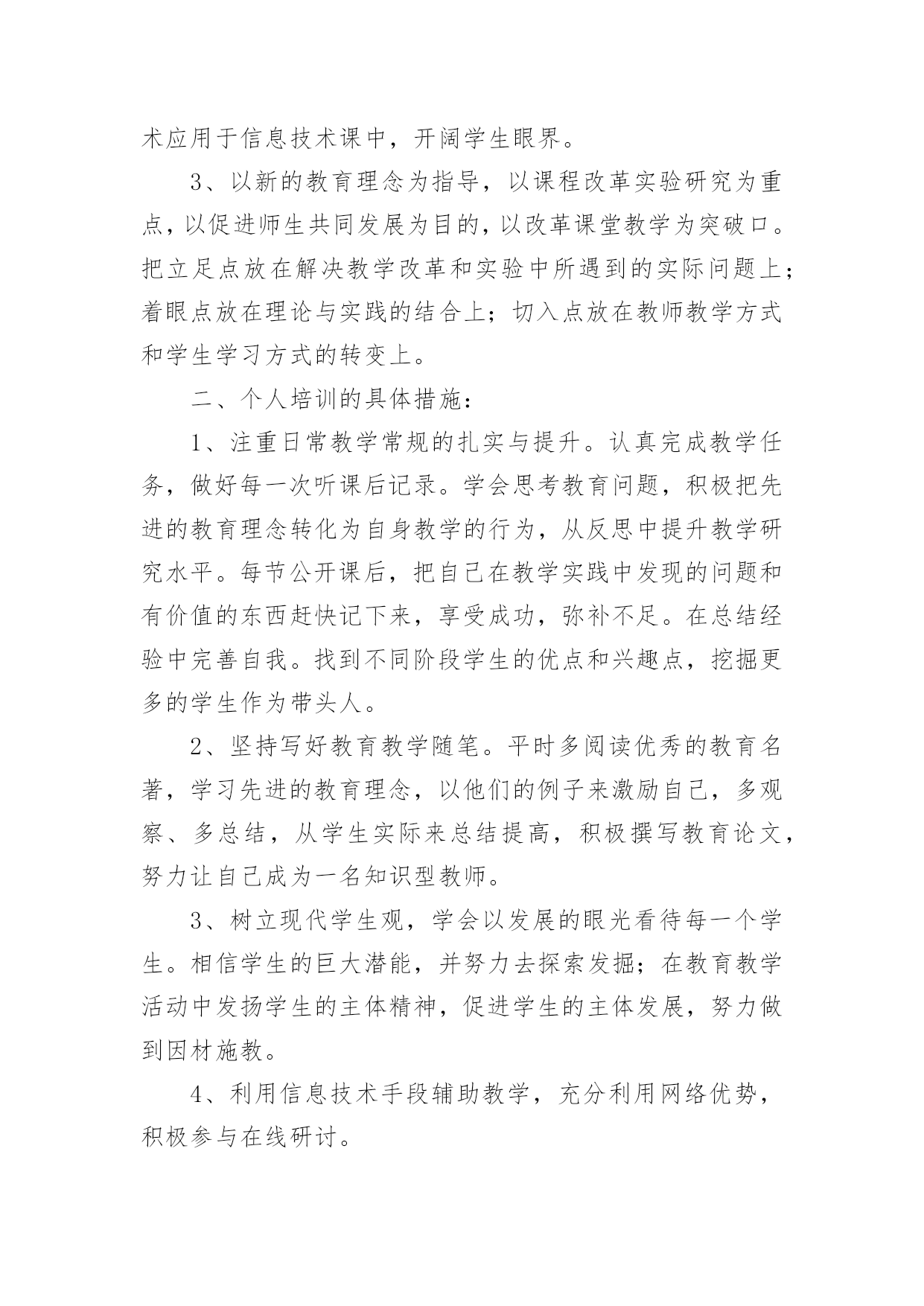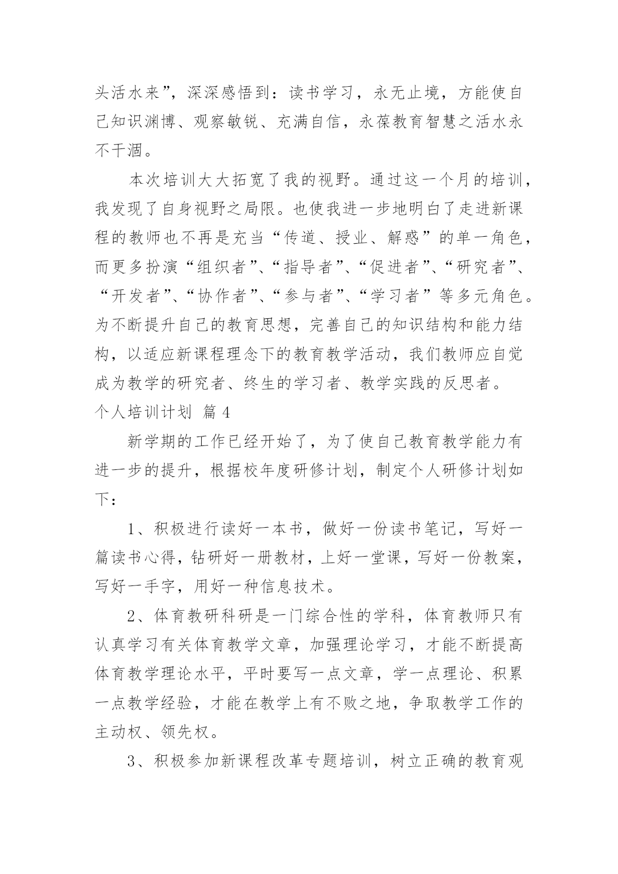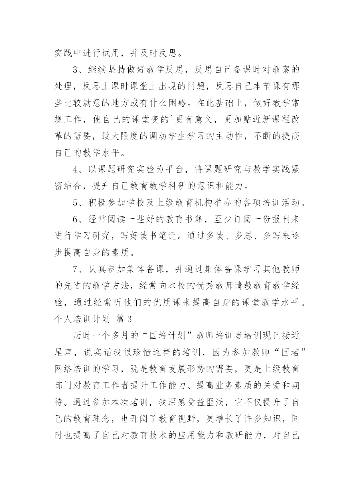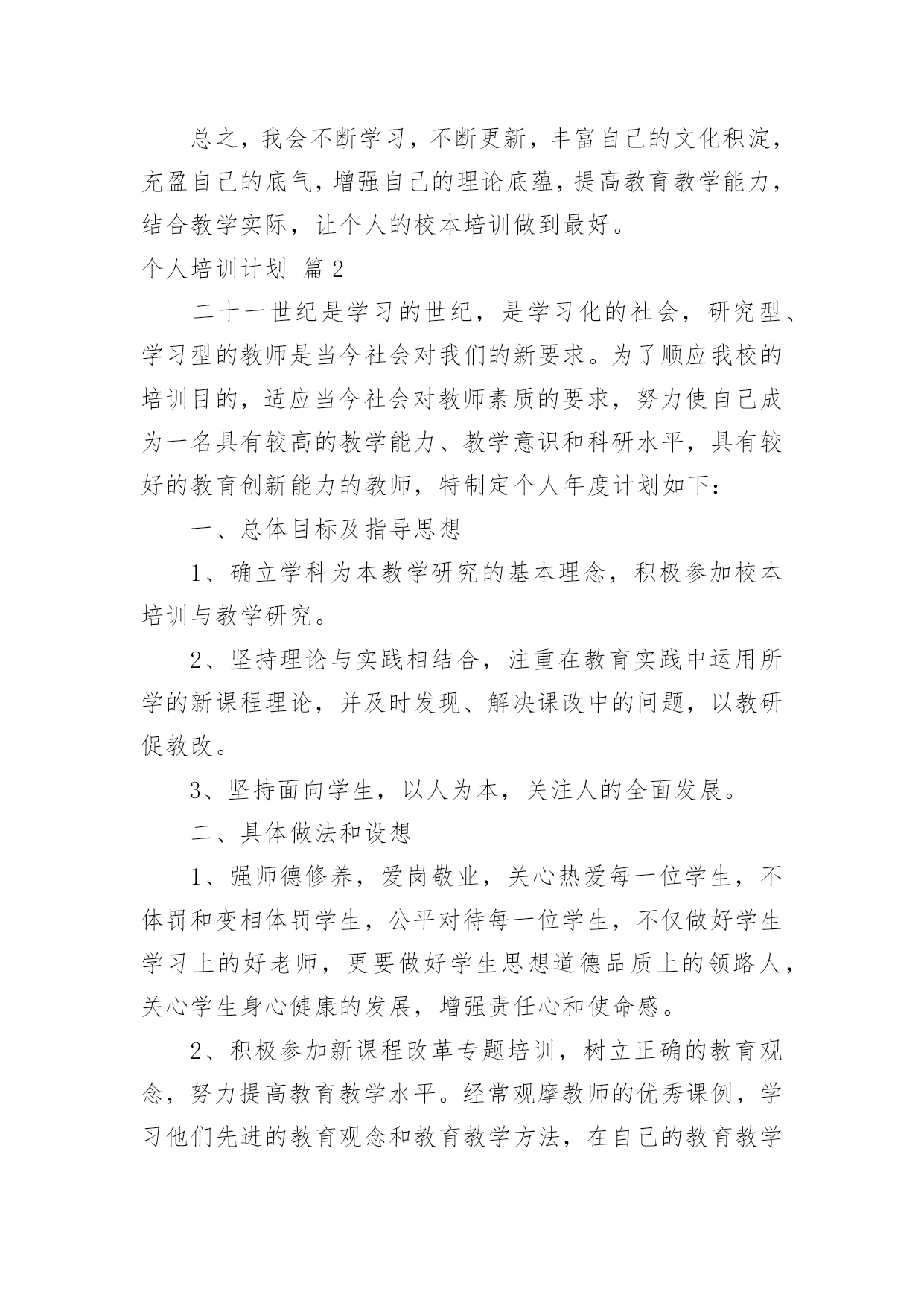 个人培训计划关于个人培训计划范文汇编10篇日子在弹指一挥间就毫无声息的流逝,我们又将续写新的诗篇,展开新的旅程,是时候写一份详细的计划了。那么计划怎么拟定才能发挥它最大的作用呢?以下是小编帮大家整理的个人培训计划10篇,欢迎阅读与收藏。个人培训计划篇1工作计划是行政活动中使用范围很广的重要公文。机关、团体、企事业单位的各级机构,对一定时期的工作预先作出安排和打算时,都要制定工作计划。工作计划实际上有许多不同种类,它们不仅有时间长短之分,而且有范围大小之别。以下是工作计划频道为大家整理的小学校本培训个人计划,供大家参考。更多阅读请查看本站工作计划频道。校本培训作为继续学习的一种促进教师专业成长和学校自主发展的重要方式和有效策略,已经走进了我们的校园,融进了我们的生活。这学年,结合我的自身情况,制定了个人的'校本培训计划。一、个人培训目标与要求:1、在教学中不断进行教学研究和尝试,努力探索研究适合学生特点、能促进学生计算机操作水平,并提高学生的设计和创新能力,提高学生积极性和参与性。保证教学质量。2、积极开展学业水平研究工作,充分发挥自己的作用,提高自身的专业水平、业务素质和教学研究水平。把新的技术应用于信息技术课中,开阔学生眼界。3、以新的教育理念为指导,以课程改革实验研究为重点,以促进师生共同发展为目的,以改革课堂教学为突破口。把立足点放在解决教学改革和实验中所遇到的实际问题上;着眼点放在理论与实践的结合上;切入点放在教师教学方式和学生学习方式的转变上。二、个人培训的具体措施:1、注重日常教学常规的扎实与提升。认真完成教学任务,做好每一次听课后记录。学会思考教育问题,积极把先进的教育理念转化为自身教学的行为,从反思中提升教学研究水平。每节公开课后,把自己在教学实践中发现的问题和有价值的东西赶快记下来,享受成功,弥补不足。在总结经验中完善自我。找到不同阶段学生的优点和兴趣点,挖掘更多的学生作为带头人。2、坚持写好教育教学随笔。平时多阅读优秀的教育名著,学习先进的教育理念,以他们的例子来激励自己,多观察、多总结,从学生实际来总结提高,积极撰写教育论文,努力让自己成为一名知识型教师。3、树立现代学生观,学会以发展的眼光看待每一个学生。相信学生的巨大潜能,并努力去探索发掘;在教育教学活动中发扬学生的主体精神,促进学生的主体发展,努力做到因材施教。4、利用信息技术手段辅助教学,充分利用网络优势,积极参与在线研讨。总之,我会不断学习,不断更新,丰富自己的文化积淀,充盈自己的底气,增强自己的理论底蕴,提高教育教学能力,结合教学实际,让个人的校本培训做到最好。个人培训计划篇2二十一世纪是学习的世纪,是学习化的社会,研究型、学习型的教师是当今社会对我们的新要求。为了顺应我校的培训目的,适应当今社会对教师素质的要求,努力使自己成为一名具有较高的教学能力、教学意识和科研水平,具有较好的教育创新能力的教师,特制定个人年度计划如下:一、总体目标及指导思想1、确立学科为本教学研究的基本理念,积极参加校本培训与教学研究。2、坚持理论与实践相结合,注重在教育实践中运用所学的新课程理论,并及时发现、解决课改中的问题,以教研促教改。3、坚持面向学生,以人为本,关注人的全面发展。二、具体做法和设想1、强师德修养,爱岗敬业,关心热爱每一位学生,不体罚和变相体罚学生,公平对待每一位学生,不仅做好学生学习上的好老师,更要做好学生思想道德品质上的领路人,关心学生身心健康的发展,增强责任心和使命感。2、积极参加新课程改革专题培训,树立正确的教育观念,努力提高教育教学水平。经常观摩教师的优秀课例,学习他们先进的教育观念和教育教学方法,在自己的教育教学实践中进行试用,并及时反思。3、继续坚持做好教学反思,反思自己备课时对教案的处理,反思上课时课堂上出现的问题,反思自己本节课有那些比较满意的地方或有什么困惑。在此基础上,做好教学常规工作,使自己的课堂变的`更有意义,更加贴近新课程改革的需要,最大限度的调动学生学习的主动性,不断的提高自己的教学水平。4、以课题研究实验为平台,将课题研究与教学实践紧密结合,提升自己教育教学科研的意识和能力。5、积极参加学校及上级教育机构举办的各项培训活动。6、经常阅读一些好的教育书籍,至少订阅一份报刊来进行学习研究,写好读书笔记。通过多读、多思、多写来逐步提高自身的素质。7、认真参加集体备课,并通过集体备课学习其他教师的先进的教学方法,经常向本校的优秀教师请教教育教学经验,通过经常听他们的优质课来提高自身的课堂教学水平。个人培训计划篇3历时一个多月的“国培计划”教师培训者培训现已接近尾声,说实话我很珍惜这样的培训,因为参加教师“国培”网络培训的学习,既是教育发展形势的需要,更是上级教育部门对教育工作者提升工作能力、提高业务素质的关爱和期待。通过参