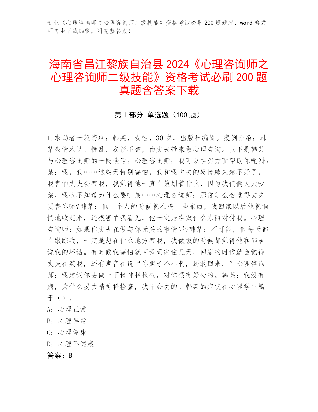 海南省昌江黎族自治县2024《心理咨询师之心理咨询师二级技能》资格考试必刷200题真题含答案下载