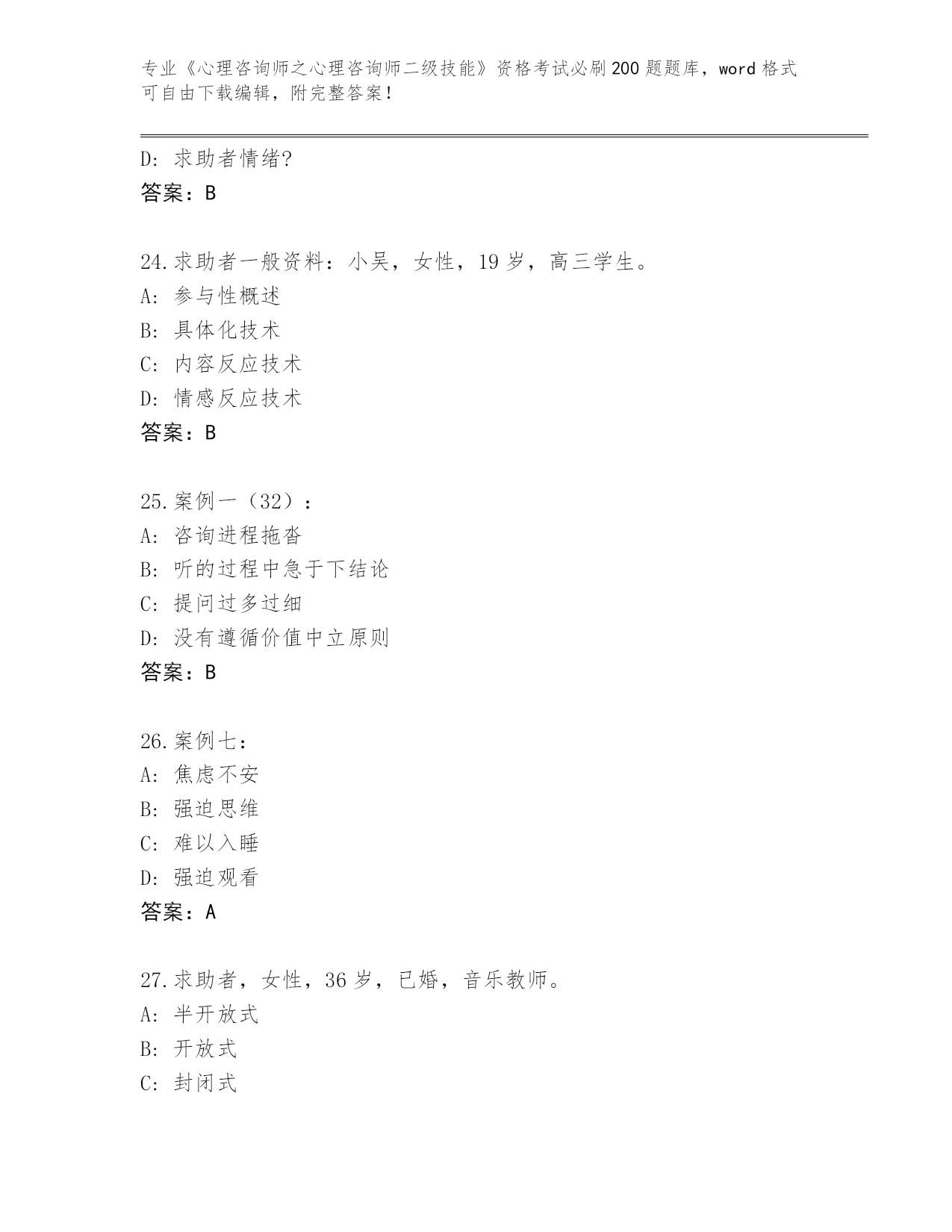 湖北省2024《心理咨询师之心理咨询师二级技能》考试必刷200题真题及答案下载