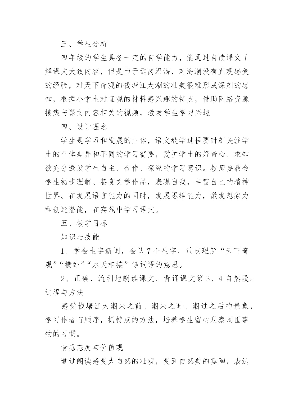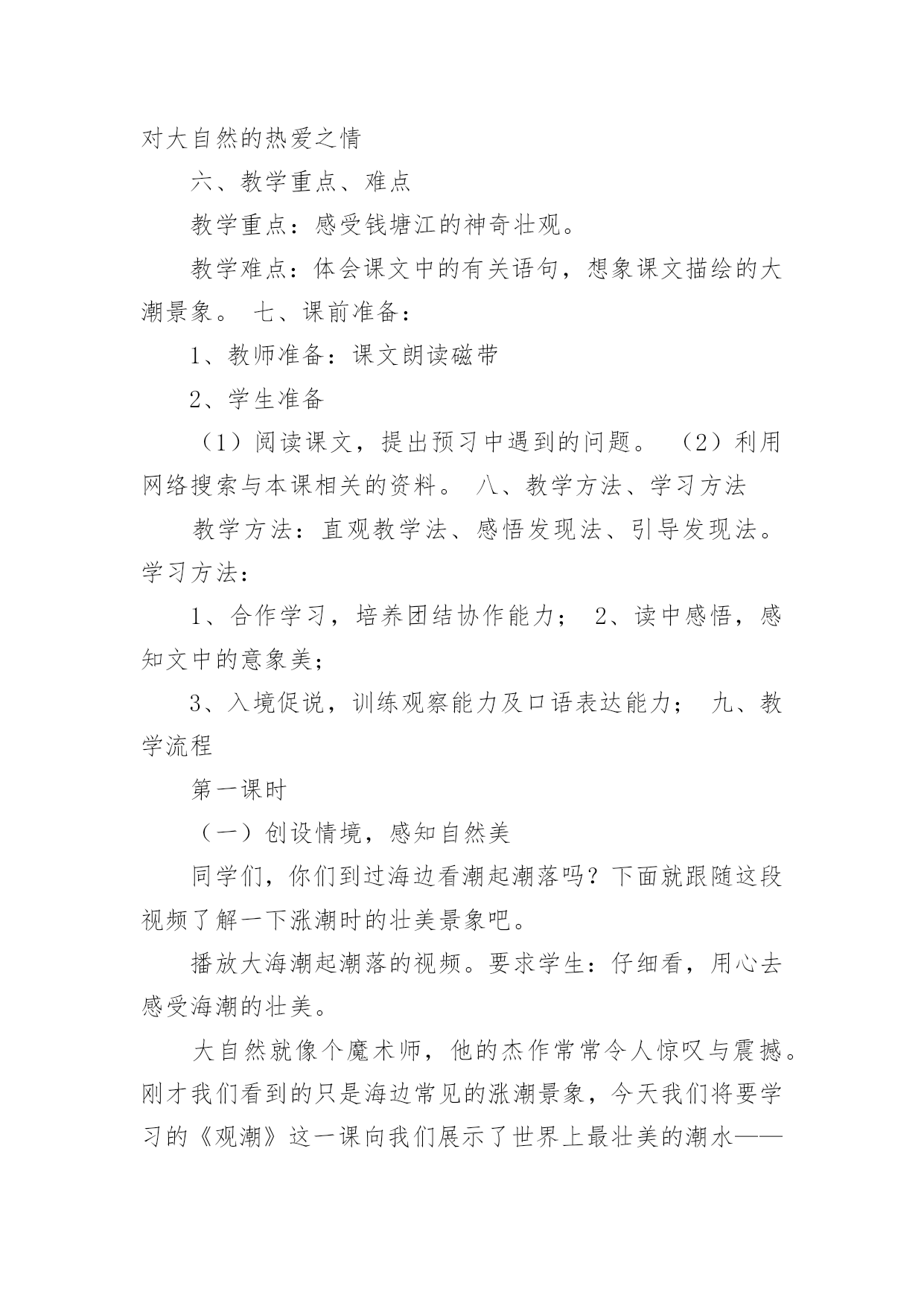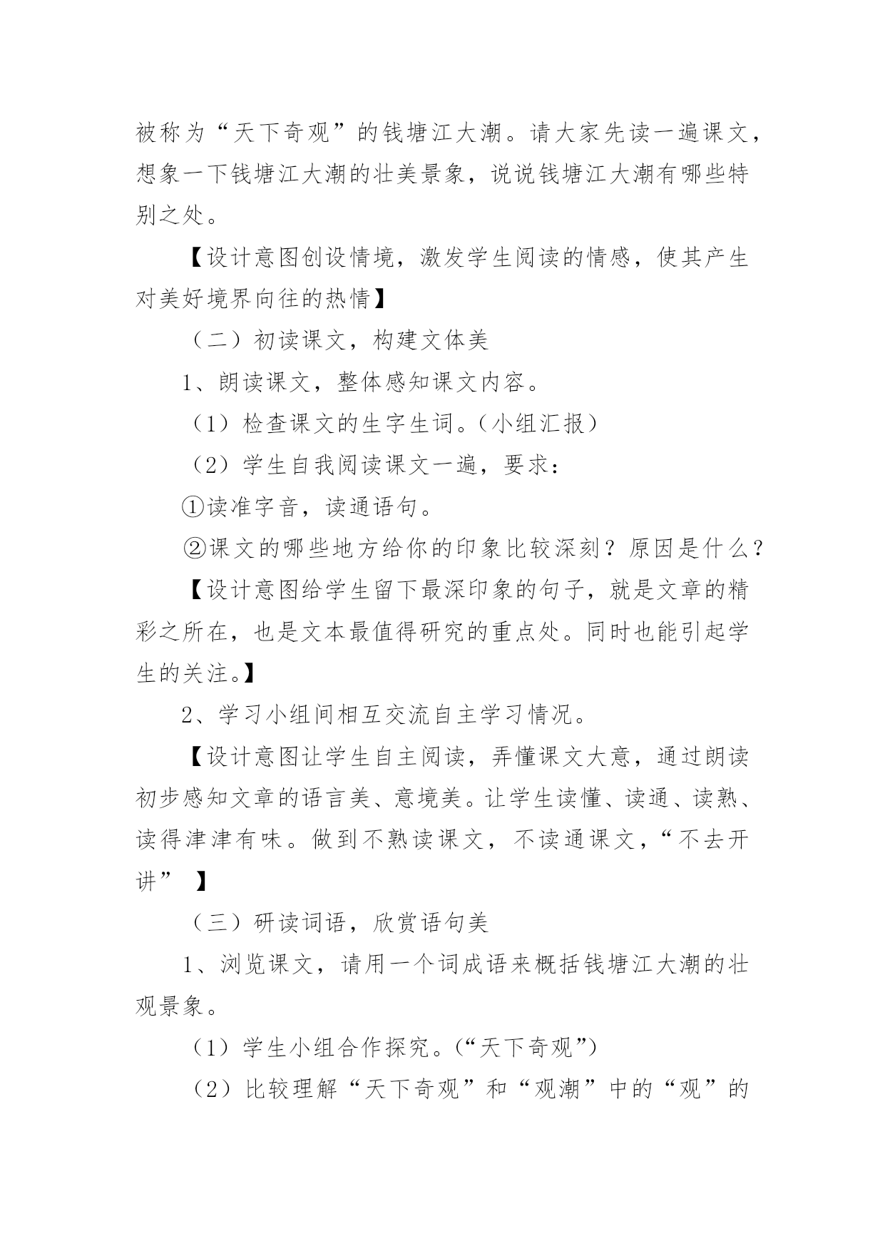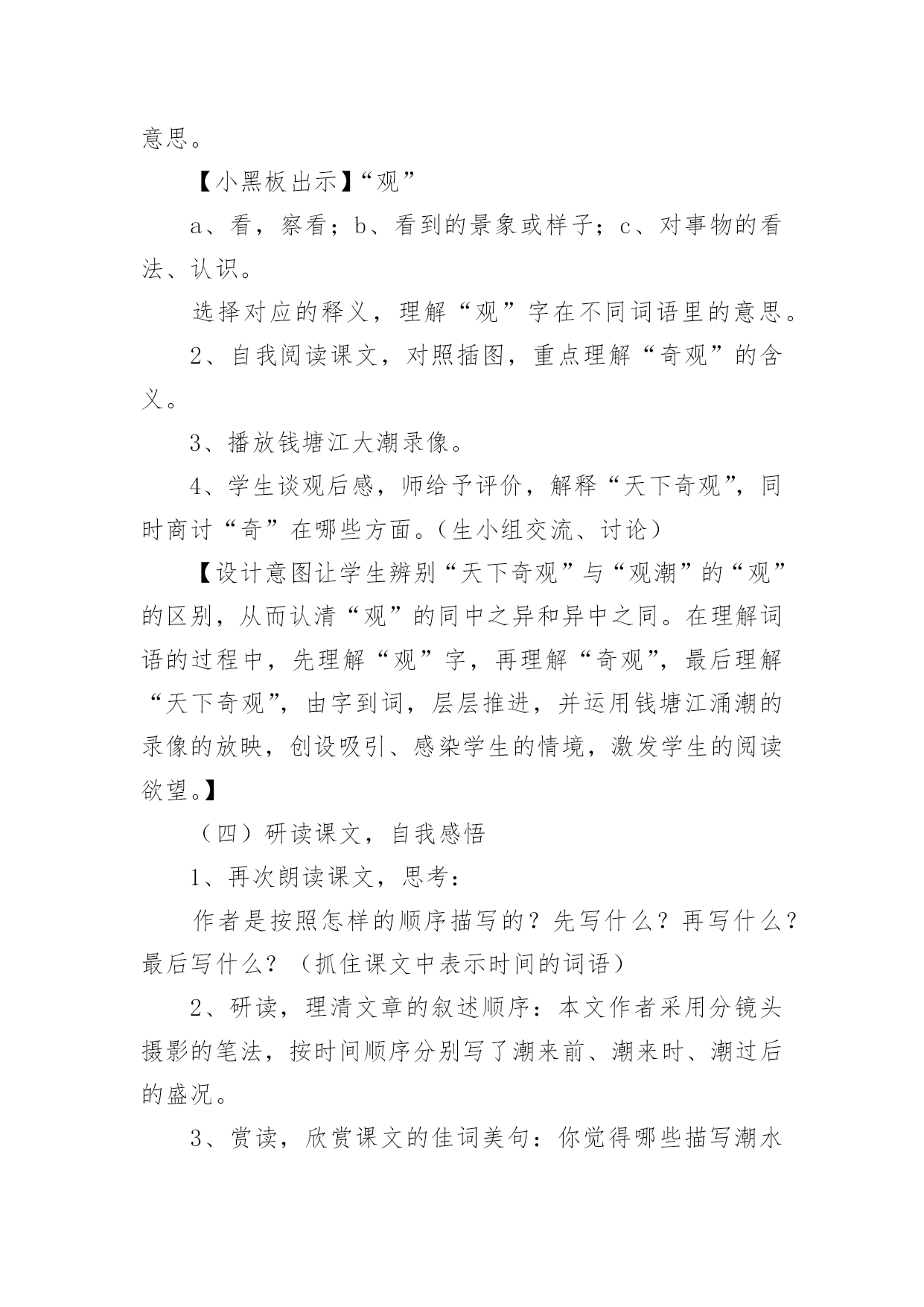 课文《观潮》教学设计作为一位杰出的教职工,常常需要准备教学设计,教学设计是教育技术的组成部分,它的功能在于运用系统方法设计教学过程,使之成为一种具有操作性的程序。你知道什么样的教学设计才能切实有效地帮助到我们吗?以下是小编帮大家整理的课文《观潮》教学设计,仅供参考,希望能够帮助到大家。课文《观潮》教学设计1一、教案背景1、学科:语文(第七册)2、课题:《观潮》3、课时:二课时二、教材分析这是一篇讲读课文。通过“我”的耳闻目睹,介绍了被称为“天下奇观”的钱塘江大潮壮丽、奇特的自然景观。抒发了作者热爱大自然、热爱祖国大好河山的思想感情。课文结构清楚,层次分明,不仅运用多种手法直接描绘了潮水铺天盖地的情状和声威,还以观潮的人数和热情间接地表现了大潮的奇特。教学本篇课文,要引导学生一边读课文,一边想画面,从而感受大自然的魅力,体会作者生动的描写;还要引导学生搜集有关钱塘江大潮观的资料,以丰富学生的见闻。三、学生分析四年级的学生具备一定的自学能力,能通过自读课文了解课文大致内容,但是由于远离沿海,对海潮没有直观感受的经验,对天下奇观的钱塘江大潮的壮美很难形成深刻的感知,根据小学生对直观的材料感兴趣的特点,借助网络资源搜集与课文内容相关的视频,激发学生学习兴趣四、设计理念学生是学习和发展的主体,语文教学过程要时刻关注学生的个体差异和不同的学习需要,爱护学生的好奇心、求知欲充分激发学生自主、合作、探究的学习意识。教师要教会学生初步理解、鉴赏文学作品,表现自我,丰富自己的精神世界。在发展语言能力的同时,发展思维能力,激发想象力和创造潜能,在实践中学习语文。五、教学目标知识与技能1、学会生字新词,会认7个生字,重点理解“天下奇观”“横卧”“水天相接”等词语的意思。2、正确、流利地朗读课文。背诵课文第3、4自然段。过程与方法感受钱塘江大潮来之前、潮来之时、潮过之后的景象,学习作者有顺序,抓特点的方法,培养学生留心观察周围事物的习惯。情感态度与价值观通过朗读感受大自然的壮观,受到自然美的熏陶,表达对大自然的热爱之情六、教学重点、难点教学重点:感受钱塘江的神奇壮观。教学难点:体会课文中的有关语句,想象课文描绘的大潮景象。七、课前准备:1、教师准备:课文朗读磁带2、学生准备(1)阅读课文,提出预习中遇到的问题。(2)利用网络搜索与本课相关的资料。八、教学方法、学习方法教学方法:直观教学法、感悟发现法、引导发现法。学习方法:1、合作学习,培养团结协作能力;2、读中感悟,感知文中的意象美;3、入境促说,训练观察能力及口语表达能力;九、教学流程第一课时(一)创设情境,感知自然美同学们,你们到过海边看潮起潮落吗?下面就跟随这段视频了解一下涨潮时的壮美景象吧。播放大海潮起潮落的视频。要求学生:仔细看,用心去感受海潮的壮美。大自然就像个魔术师,他的杰作常常令人惊叹与震撼。刚才我们看到的只是海边常见的涨潮景象,今天我们将要学习的《观潮》这一课向我们展示了世界上最壮美的潮水——被称为“天下奇观”的钱塘江大潮。请大家先读一遍课文,想象一下钱塘江大潮的壮美景象,说说钱塘江大潮有哪些特别之处。【设计意图创设情境,激发学生阅读的情感,使其产生对美好境界向往的热情】(二)初读课文,构建文体美1、朗读课文,整体感知课文内容。(1)检查课文的生字生词。(小组汇报)(2)学生自我阅读课文一遍,要求:①读准字音,读通语句。②课文的哪些地方给你的印象比较深刻?原因是什么?【设计意图给学生留下最深印象的句子,就是文章的精彩之所在,也是文本最值得研究的重点处。同时也能引起学生的关注。】2、学习小组间相互交流自主学习情况。【设计意图让学生自主阅读,弄懂课文大意,通过朗读初步感知文章的语言美、意境美。让学生读懂、读通、读熟、读得津津有味。做到不熟读课文,不读通课文,“不去开讲”】(三)研读词语,欣赏语句美1、浏览课文,请用一个词成语来概括钱塘江大潮的壮观景象。(1)学生小组合作探究。(“天下奇观”)(2)比较理解“天下奇观”和“观潮”中的“观”的意思。【小黑板出示】“观”a、看,察看;b、看到的景象或样子;c、对事物的看法、认识。选择对应的释义,理解“观”字在不同词语里的意思。2、自我阅读课文,对照插图,重点理解“奇观”的含义。3、播放钱塘江大潮录像。4、学生谈观后感,师给予评价,解释“天下奇观”,同时商讨“奇”在哪些方面。(生小组交流、讨论)【设计意图让学生辨别“天下奇观”与“观潮”的“观”的区别,从而认清“观”的同中之异和异中之同。在理解词语的过程中,先理解“观”字,再理解“奇观”,最后理解“天下奇观”,由字到词,层层推进,并运用钱塘江涌潮的录像的放映,创设吸引、感染学生的情境,激发学生的阅读欲望。】(四)研读课文,自我感悟1、再次朗读课文,思考:作者是按照怎样的顺序描写的?先写什么?再