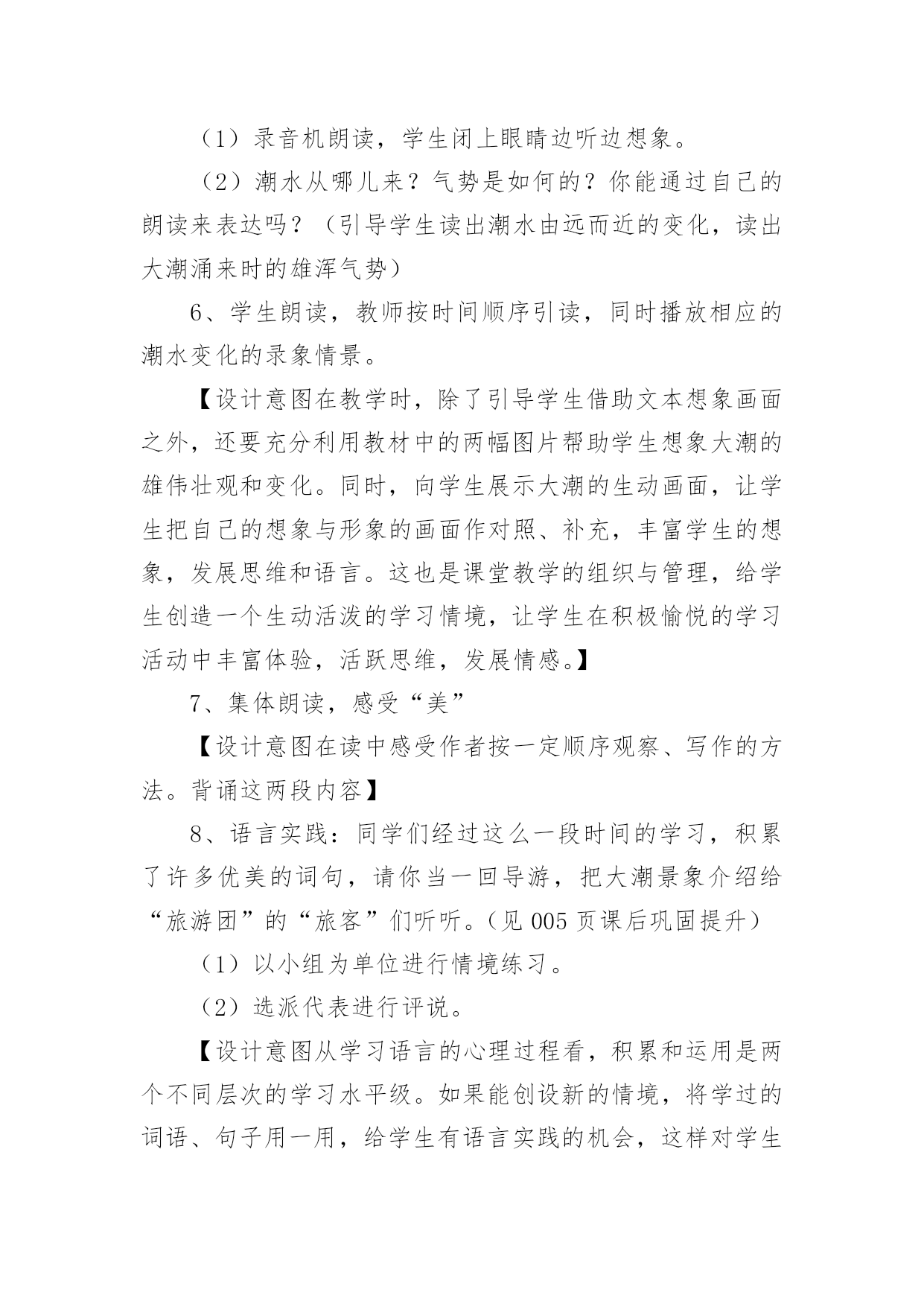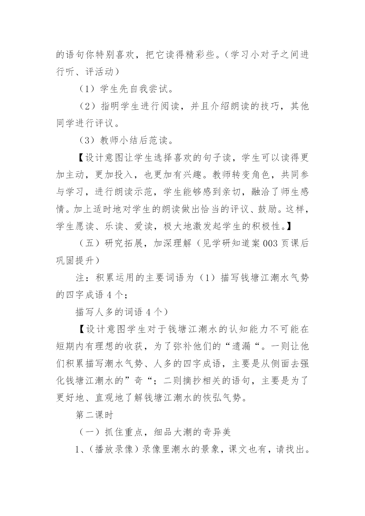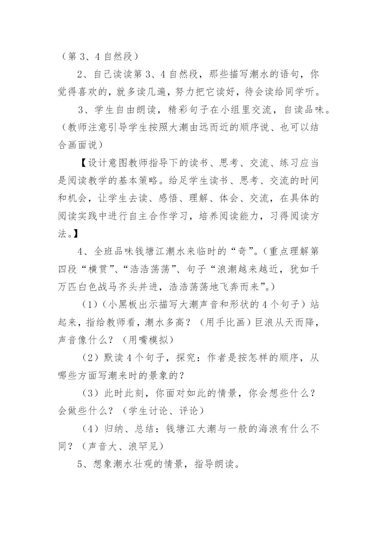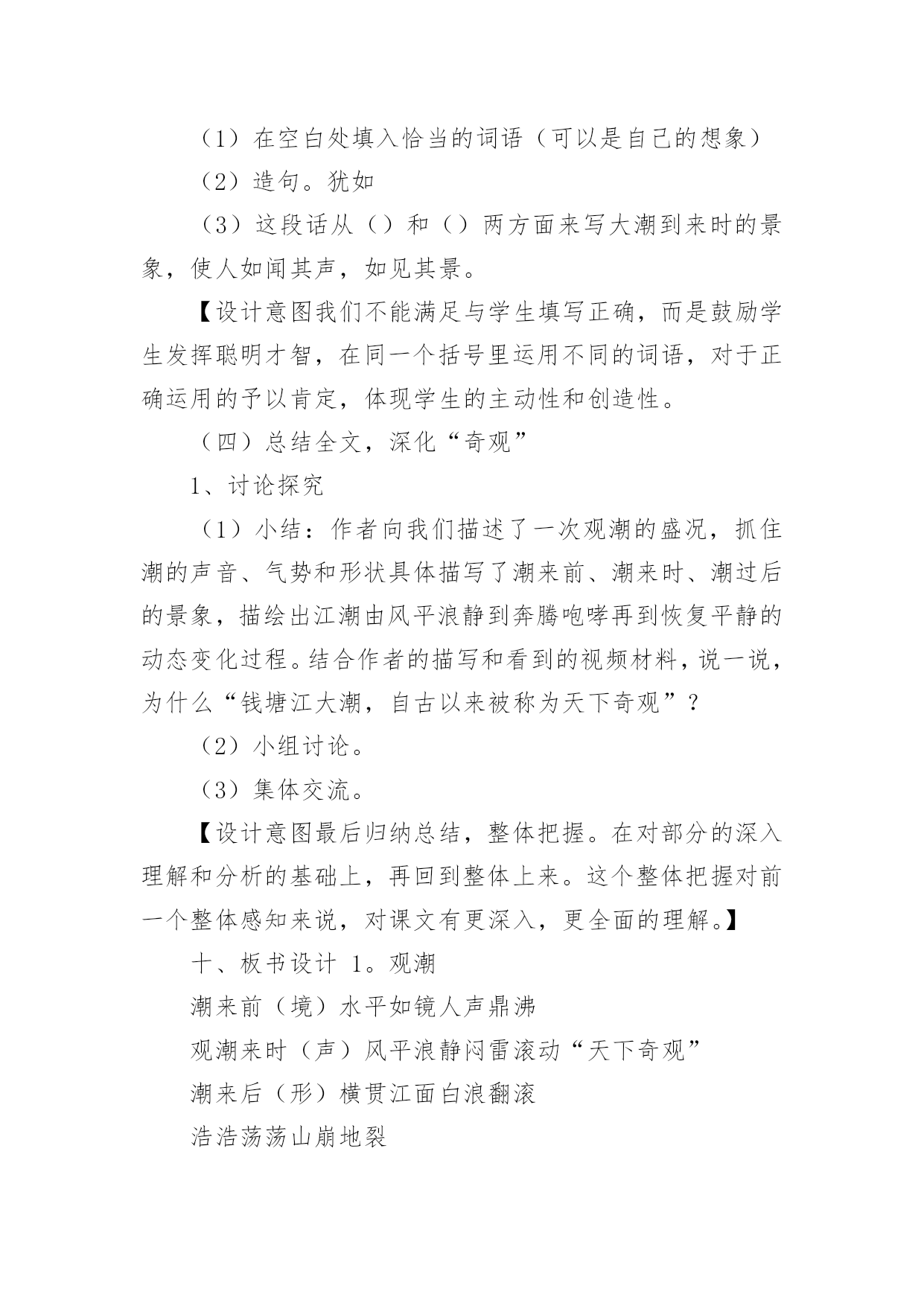 课文《观潮》教学设计作为一位杰出的教职工,常常需要准备教学设计,教学设计是教育技术的组成部分,它的功能在于运用系统方法设计教学过程,使之成为一种具有操作性的程序。你知道什么样的教学设计才能切实有效地帮助到我们吗?以下是小编帮大家整理的课文《观潮》教学设计,仅供参考,希望能够帮助到大家。课文《观潮》教学设计1一、教案背景1、学科:语文(第七册)2、课题:《观潮》3、课时:二课时二、教材分析这是一篇讲读课文。通过“我”的耳闻目睹,介绍了被称为“天下奇观”的钱塘江大潮壮丽、奇特的自然景观。抒发了作者热爱大自然、热爱祖国大好河山的思想感情。课文结构清楚,层次分明,不仅运用多种手法直接描绘了潮水铺天盖地的情状和声威,还以观潮的人数和热情间接地表现了大潮的奇特。教学本篇课文,要引导学生一边读课文,一边想画面,从而感受大自然的魅力,体会作者生动的描写;还要引导学生搜集有关钱塘江大潮观的资料,以丰富学生的见闻。三、学生分析四年级的学生具备一定的自学能力,能通过自读课文了解课文大致内容,但是由于远离沿海,对海潮没有直观感受的经验,对天下奇观的钱塘江大潮的壮美很难形成深刻的感知,根据小学生对直观的材料感兴趣的特点,借助网络资源搜集与课文内容相关的视频,激发学生学习兴趣四、设计理念学生是学习和发展的主体,语文教学过程要时刻关注学生的个体差异和不同的学习需要,爱护学生的好奇心、求知欲充分激发学生自主、合作、探究的学习意识。教师要教会学生初步理解、鉴赏文学作品,表现自我,丰富自己的精神世界。在发展语言能力的同时,发展思维能力,激发想象力和创造潜能,在实践中学习语文。五、教学目标知识与技能1、学会生字新词,会认7个生字,重点理解“天下奇观”“横卧”“水天相接”等词语的意思。2、正确、流利地朗读课文。背诵课文第3、4自然段。过程与方法感受钱塘江大潮来之前、潮来之时、潮过之后的景象,学习作者有顺序,抓特点的方法,培养学生留心观察周围事物的习惯。情感态度与价值观通过朗读感受大自然的壮观,受到自然美的熏陶,表达对大自然的热爱之情六、教学重点、难点教学重点:感受钱塘江的神奇壮观。教学难点:体会课文中的有关语句,想象课文描绘的大潮景象。七、课前准备:1、教师准备:课文朗读磁带2、学生准备(1)阅读课文,提出预习中遇到的问题。(2)利用网络搜索与本课相关的资料。八、教学方法、学习方法教学方法:直观教学法、感悟发现法、引导发现法。学习方法:1、合作学习,培养团结协作能力;2、读中感悟,感知文中的意象美;3、入境促说,训练观察能力及口语表达能力;九、教学流程第一课时(一)创设情境,感知自然美同学们,你们到过海边看潮起潮落吗?下面就跟随这段视频了解一下涨潮时的壮美景象吧。播放大海潮起潮落的视频。要求学生:仔细看,用心去感受海潮的壮美。大自然就像个魔术师,他的杰作常常令人惊叹与震撼。刚才我们看到的只是海边常见的涨潮景象,今天我们将要学习的《观潮》这一课向我们展示了世界上最壮美的潮水——被称为“天下奇观”的钱塘江大潮。请大家先读一遍课文,想象一下钱塘江大潮的壮美景象,说说钱塘江大潮有哪些特别之处。【设计意图创设情境,激发学生阅读的情感,使其产生对美好境界向往的热情】(二)初读课文,构建文体美1、朗读课文,整体感知课文内容。(1)检查课文的生字生词。(小组汇报)(2)学生自我阅读课文一遍,要求:①读准字音,读通语句。②课文的哪些地方给你的印象比较深刻?原因是什么?【设计意图给学生留下最深印象的句子,就是文章的精彩之所在,也是文本最值得研究的重点处。同时也能引起学生的关注。】2、学习小组间相互交流自主学习情况。【设计意图让学生自主阅读,弄懂课文大意,通过朗读初步感知文章的语言美、意境美。让学生读懂、读通、读熟、读得津津有味。做到不熟读课文,不读通课文,“不去开讲”】(三)研读词语,欣赏语句美1、浏览课文,请用一个词成语来概括钱塘江大潮的壮观景象。(1)学生小组合作探究。(“天下奇观”)(2)比较理解“天下奇观”和“观潮”中的“观”的意思。【小黑板出示】“观”a、看,察看;b、看到的景象或样子;c、对事物的看法、认识。选择对应的释义,理解“观”字在不同词语里的意思。2、自我阅读课文,对照插图,重点理解“奇观”的含义。3、播放钱塘江大潮录像。4、学生谈观后感,师给予评价,解释“天下奇观”,同时商讨“奇”在哪些方面。(生小组交流、讨论)【设计意图让学生辨别“天下奇观”与“观潮”的“观”的区别,从而认清“观”的同中之异和异中之同。在理解词语的过程中,先理解“观”字,再理解“奇观”,最后理解“天下奇观”,由字到词,层层推进,并运用钱塘江涌潮的录像的放映,创设吸引、感染学生的情境,激发学生的阅读欲望。】(四)研读课文,自我感悟1、再次朗读课文,思考:作者是按照怎样的顺序描写的?先写什么?再