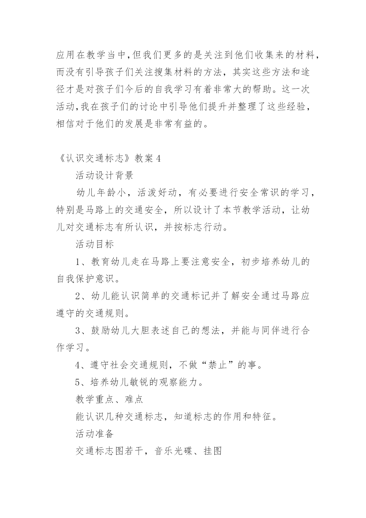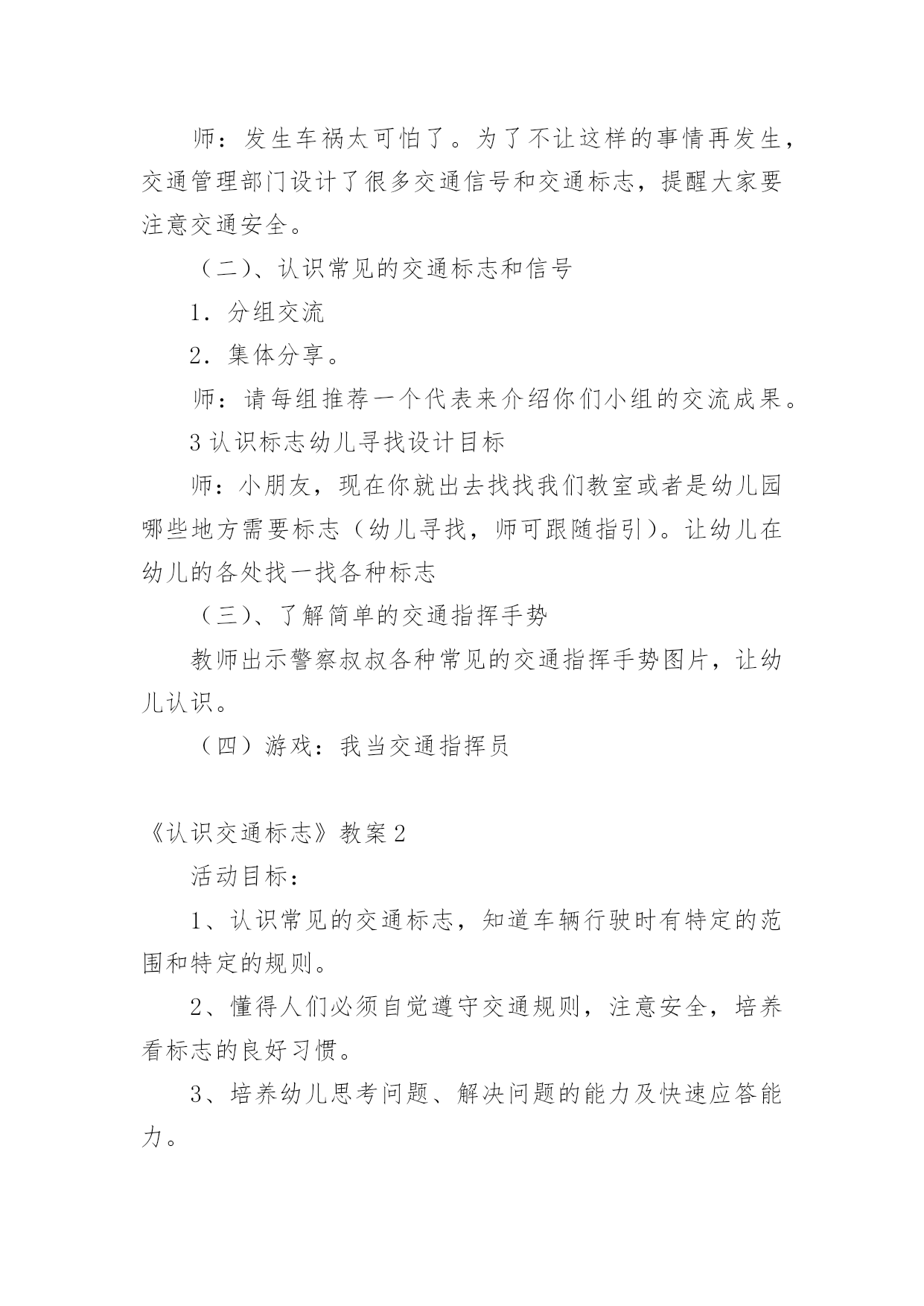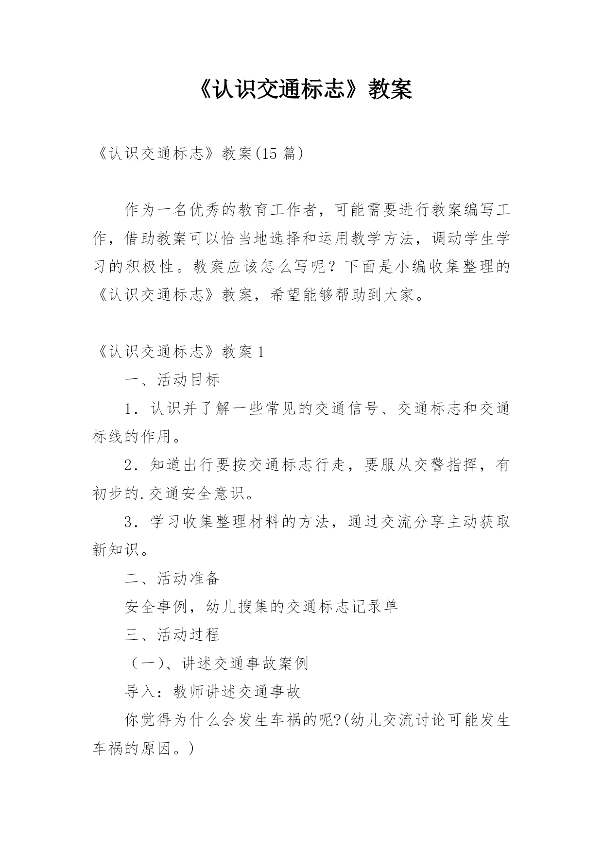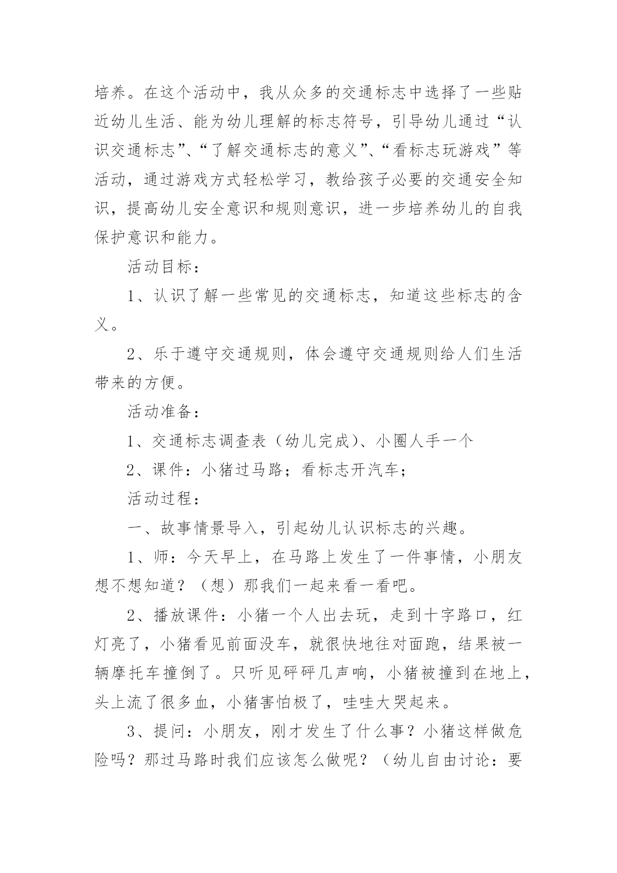 《认识交通标志》教案《认识交通标志》教案(15篇)作为一名优秀的教育工作者,可能需要进行教案编写工作,借助教案可以恰当地选择和运用教学方法,调动学生学习的积极性。教案应该怎么写呢?下面是小编收集整理的《认识交通标志》教案,希望能够帮助到大家。《认识交通标志》教案1一、活动目标1.认识并了解一些常见的交通信号、交通标志和交通标线的作用。2.知道出行要按交通标志行走,要服从交警指挥,有初步的.交通安全意识。3.学习收集整理材料的方法,通过交流分享主动获取新知识。二、活动准备安全事例,幼儿搜集的交通标志记录单三、活动过程(一)、讲述交通事故案例导入:教师讲述交通事故你觉得为什么会发生车祸的呢?(幼儿交流讨论可能发生车祸的原因。)师:发生车祸太可怕了。为了不让这样的事情再发生,交通管理部门设计了很多交通信号和交通标志,提醒大家要注意交通安全。(二)、认识常见的交通标志和信号1.分组交流2.集体分享。师:请每组推荐一个代表来介绍你们小组的交流成果。3认识标志幼儿寻找设计目标师:小朋友,现在你就出去找找我们教室或者是幼儿园哪些地方需要标志(幼儿寻找,师可跟随指引)。让幼儿在幼儿的各处找一找各种标志(三)、了解简单的交通指挥手势教师出示警察叔叔各种常见的交通指挥手势图片,让幼儿认识。(四)游戏:我当交通指挥员《认识交通标志》教案2活动目标:1、认识常见的交通标志,知道车辆行驶时有特定的范围和特定的规则。2、懂得人们必须自觉遵守交通规则,注意安全,培养看标志的良好习惯。3、培养幼儿思考问题、解决问题的能力及快速应答能力。4、培养幼儿勇敢、活泼的个性。活动准备:1、交通标志图片。2、音乐《去郊游》。3、PPT课件。活动重难点:1、活动重点:认识常见的交通标志,懂得人们必须自觉遵守交通规则,注意安全。2、活动难点:知道车辆行使时有特定的'范围和特定的规则。3、指导要点:以生动的故事激发幼儿学习的兴趣,引导幼儿认识常见的交通标志,懂得人们必须自觉遵守交通规则,主意安全。活动过程1、教师讲述故事,激发起幼儿兴趣,让幼儿欣赏故事,理解故事内容。(1)提出问题,激发兴趣。师:有一只小老鼠开车进城玩,可是却没钱上公园,这是为什么呢?(2)小结:小老鼠不认识交通标志,违反了交通规则,所以被罚款了,罚了钱就没有钱上幼儿园。2、结合图片,认识一些常见的交通标志。(1)师:你们愿意教小老鼠认识马路上的交通标志吗?让我们一起来看看。(2)依次出示标识卡,提问:这是什么标志?你们认识它吗?标志上画有什么?表示什么意思?3、讨论:在马路上还要听从谁的指挥?小结:有了交通标志,马路上的车和行人就不会随意乱行,这样就安全多了。小朋友们出门的时候要注意看是什么交通标志,注意安全,做一个遵守交通工具规则的乖宝宝!4、游戏:去郊游师:小朋友认识了这么多的标志,那我们一起开车去郊游吧!郊游的路上会有很多标志,小朋友们要注意看是什么标志,千万别违反了交通规矩哦!玩法:教师创设马路的情景,把幼儿分成两组,教师出示标志,引导幼儿看标志并遵守交通规则。教学反思:在社会活动《交通标志》中我首先提出问题,激发幼儿的兴趣,然后通过听故事《乡下老鼠逛公园》让幼儿了解小老鼠因不认识交通规则所带来的不便。接着结合图片认识一些常见的交通标志,引导幼儿观察,有斜线的标志就是不能做的事情,是禁止性标志;引导幼儿结合现实生活,进一步理解认识一些常见的标志,注意了知识与实际的结合。最后通过游戏《去郊游》结束本次活动。本次教育活动动静交替、由浅入深、层层递进,幼儿参与积极性高。《认识交通标志》教案3设计背景与幼儿一起看电视,发现一个“交通基地游戏活动”,这个活动有很多交通活动标志,孩子们非常感兴趣,争着说:我见过这个标志;我知道这个是什么标志……根据幼儿的兴趣,我就按教材要求,设计了这个活动。活动目标1、引导幼儿认识更多的交通标志,并了解其意义。2、培养幼儿的观察能力,知道交通标志的特征。3、培养幼儿敏锐的观察能力。4、探索、发现生活中的多样性及特征。5、加强幼儿的安全意识。重点难点培养幼儿的观察能力,知道交通标志的特征及作用。活动准备让幼儿在家搜集各种交通安全标志;教师根据交通标志的分类准备三种颜色的背景。活动过程1、请幼儿自己分类张贴展示搜集的`安全标志。2、请幼儿们介绍标志,并说说:“为什么放在不同的地方?”3、请小朋友观察:交通标志有哪些特征?4、请小朋友认识每种交通标志的不用作用。5、相互分享:我们还搜集了哪些标志?6、延伸活动:通过知道标志有提醒人的作用,鼓励幼儿在生活中尝试应用各种标记。教学反思幼儿自己搜集资料,这种学习形式已被大家熟识并常常应用在教学当中,但我们更多的是关注到他们收集来的材料,而没有引导孩子们关注搜集材料的方法,其实这些方法和途径才是对孩子们今后的自我学习有着非常大的帮助。这一