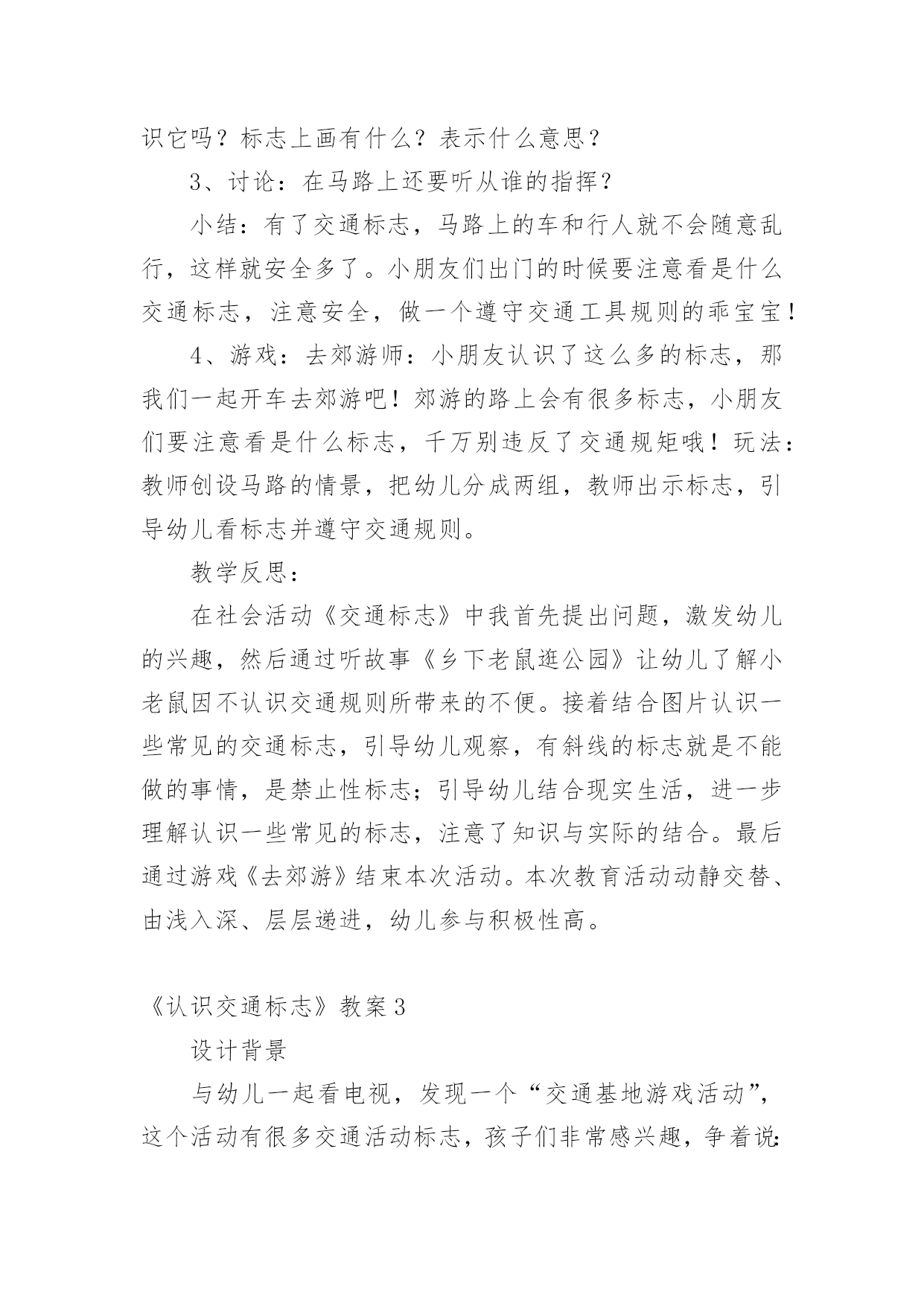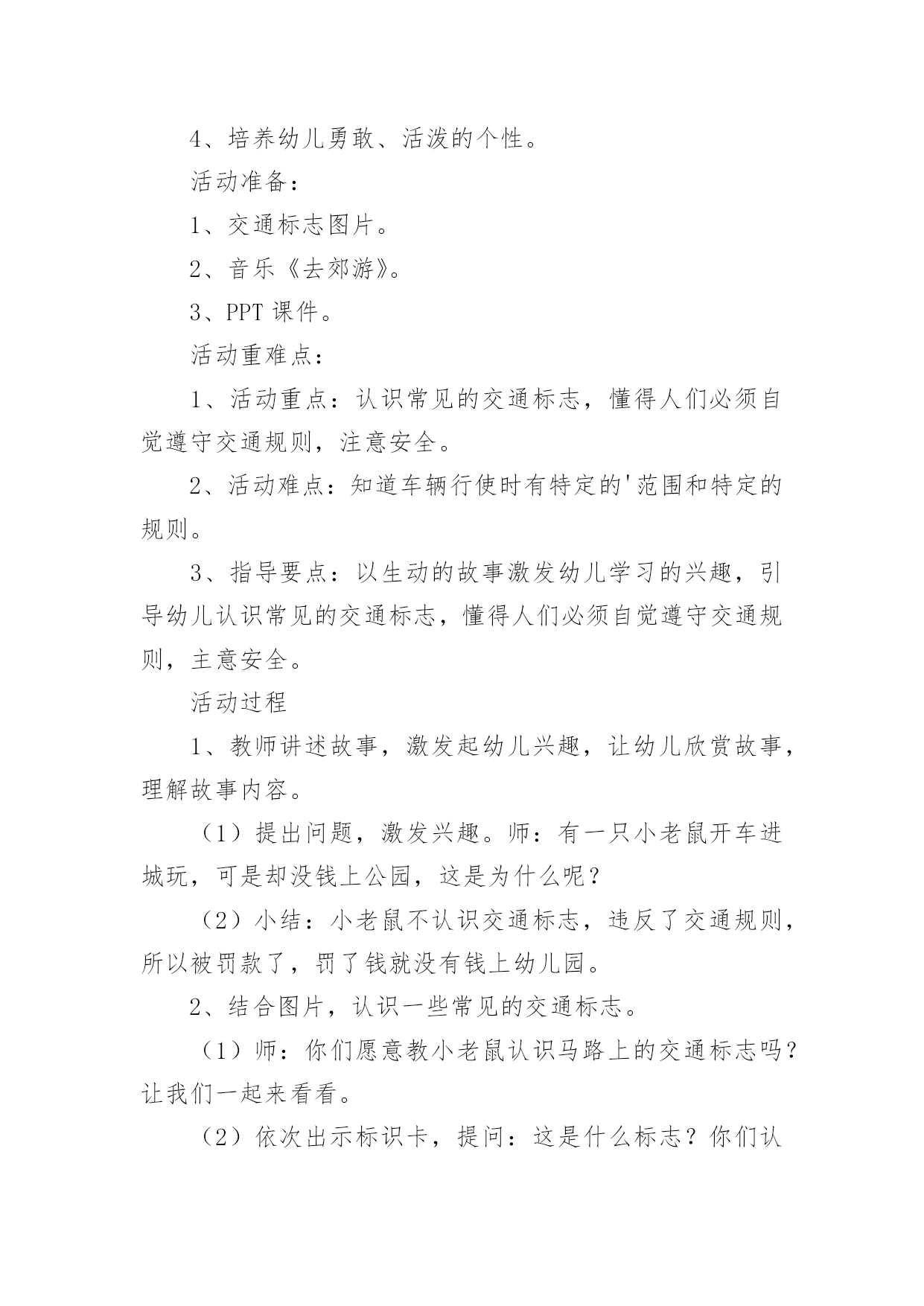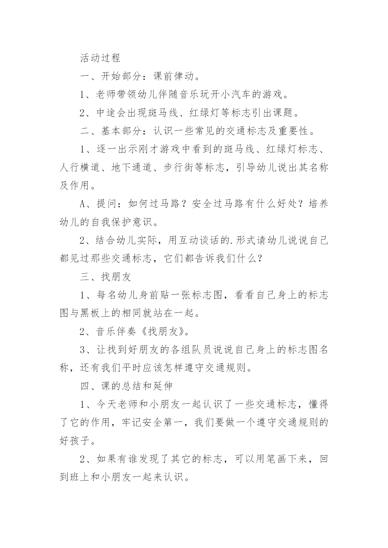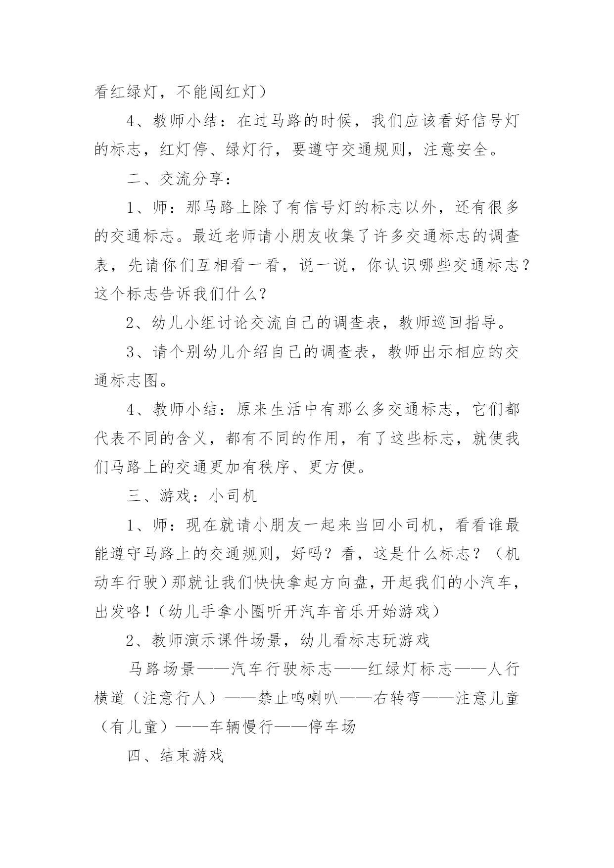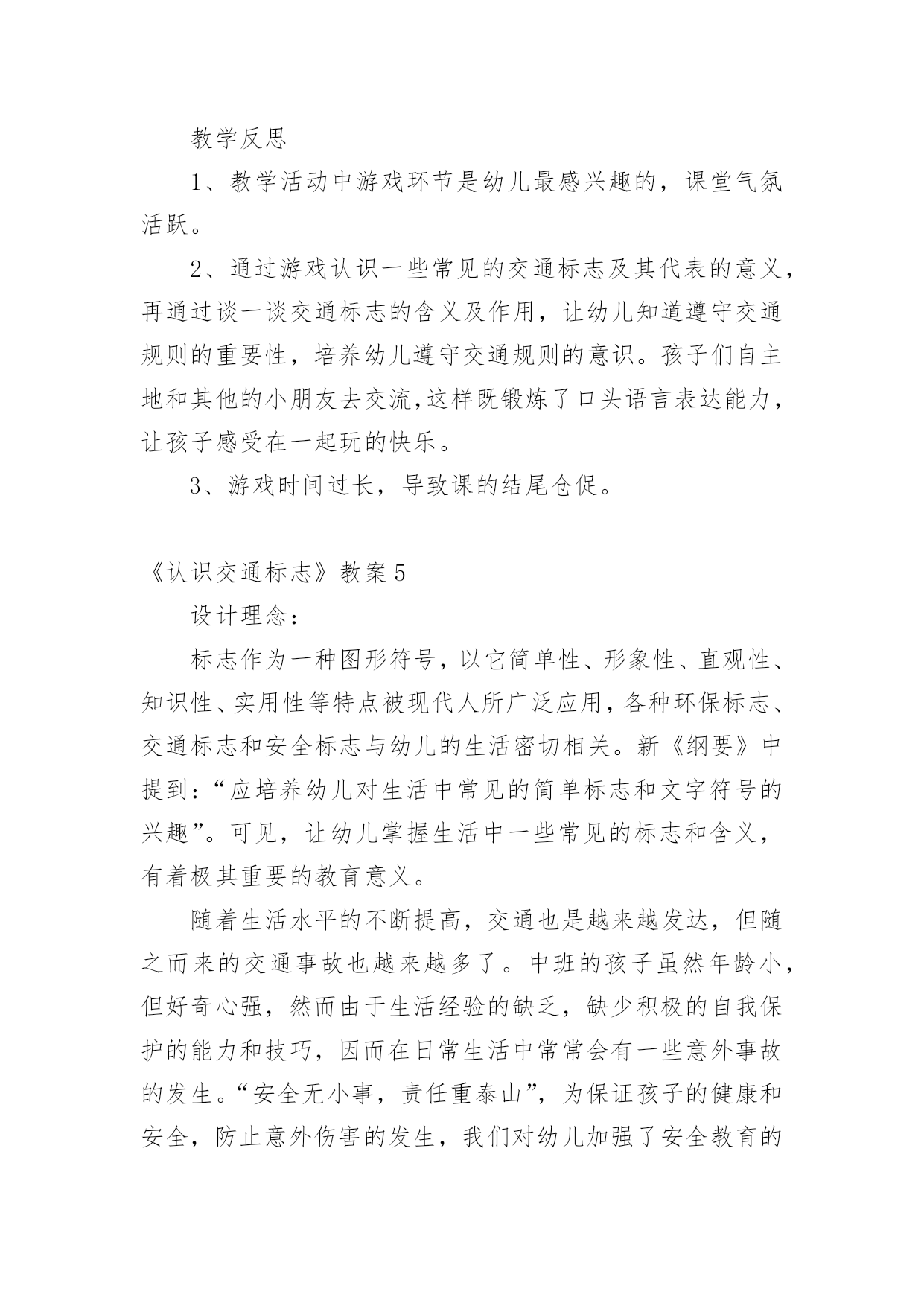 《认识交通标志》教案《认识交通标志》教案(15篇)作为一名优秀的教育工作者,可能需要进行教案编写工作,借助教案可以恰当地选择和运用教学方法,调动学生学习的积极性。教案应该怎么写呢?下面是小编收集整理的《认识交通标志》教案,希望能够帮助到大家。《认识交通标志》教案1一、活动目标1.认识并了解一些常见的交通信号、交通标志和交通标线的作用。2.知道出行要按交通标志行走,要服从交警指挥,有初步的.交通安全意识。3.学习收集整理材料的方法,通过交流分享主动获取新知识。二、活动准备安全事例,幼儿搜集的交通标志记录单三、活动过程(一)、讲述交通事故案例导入:教师讲述交通事故你觉得为什么会发生车祸的呢?(幼儿交流讨论可能发生车祸的原因。)师:发生车祸太可怕了。为了不让这样的事情再发生,交通管理部门设计了很多交通信号和交通标志,提醒大家要注意交通安全。(二)、认识常见的交通标志和信号1.分组交流2.集体分享。师:请每组推荐一个代表来介绍你们小组的交流成果。3认识标志幼儿寻找设计目标师:小朋友,现在你就出去找找我们教室或者是幼儿园哪些地方需要标志(幼儿寻找,师可跟随指引)。让幼儿在幼儿的各处找一找各种标志(三)、了解简单的交通指挥手势教师出示警察叔叔各种常见的交通指挥手势图片,让幼儿认识。(四)游戏:我当交通指挥员《认识交通标志》教案2活动目标:1、认识常见的交通标志,知道车辆行驶时有特定的范围和特定的规则。2、懂得人们必须自觉遵守交通规则,注意安全,培养看标志的良好习惯。3、培养幼儿思考问题、解决问题的能力及快速应答能力。4、培养幼儿勇敢、活泼的个性。活动准备:1、交通标志图片。2、音乐《去郊游》。3、PPT课件。活动重难点:1、活动重点:认识常见的交通标志,懂得人们必须自觉遵守交通规则,注意安全。2、活动难点:知道车辆行使时有特定的'范围和特定的规则。3、指导要点:以生动的故事激发幼儿学习的兴趣,引导幼儿认识常见的交通标志,懂得人们必须自觉遵守交通规则,主意安全。活动过程1、教师讲述故事,激发起幼儿兴趣,让幼儿欣赏故事,理解故事内容。(1)提出问题,激发兴趣。师:有一只小老鼠开车进城玩,可是却没钱上公园,这是为什么呢?(2)小结:小老鼠不认识交通标志,违反了交通规则,所以被罚款了,罚了钱就没有钱上幼儿园。2、结合图片,认识一些常见的交通标志。(1)师:你们愿意教小老鼠认识马路上的交通标志吗?让我们一起来看看。(2)依次出示标识卡,提问:这是什么标志?你们认识它吗?标志上画有什么?表示什么意思?3、讨论:在马路上还要听从谁的指挥?小结:有了交通标志,马路上的车和行人就不会随意乱行,这样就安全多了。小朋友们出门的时候要注意看是什么交通标志,注意安全,做一个遵守交通工具规则的乖宝宝!4、游戏:去郊游师:小朋友认识了这么多的标志,那我们一起开车去郊游吧!郊游的路上会有很多标志,小朋友们要注意看是什么标志,千万别违反了交通规矩哦!玩法:教师创设马路的情景,把幼儿分成两组,教师出示标志,引导幼儿看标志并遵守交通规则。教学反思:在社会活动《交通标志》中我首先提出问题,激发幼儿的兴趣,然后通过听故事《乡下老鼠逛公园》让幼儿了解小老鼠因不认识交通规则所带来的不便。接着结合图片认识一些常见的交通标志,引导幼儿观察,有斜线的标志就是不能做的事情,是禁止性标志;引导幼儿结合现实生活,进一步理解认识一些常见的标志,注意了知识与实际的结合。最后通过游戏《去郊游》结束本次活动。本次教育活动动静交替、由浅入深、层层递进,幼儿参与积极性高。《认识交通标志》教案3设计背景与幼儿一起看电视,发现一个“交通基地游戏活动”,这个活动有很多交通活动标志,孩子们非常感兴趣,争着说:我见过这个标志;我知道这个是什么标志……根据幼儿的兴趣,我就按教材要求,设计了这个活动。活动目标1、引导幼儿认识更多的交通标志,并了解其意义。2、培养幼儿的观察能力,知道交通标志的特征。3、培养幼儿敏锐的观察能力。4、探索、发现生活中的多样性及特征。5、加强幼儿的安全意识。重点难点培养幼儿的观察能力,知道交通标志的特征及作用。活动准备让幼儿在家搜集各种交通安全标志;教师根据交通标志的分类准备三种颜色的背景。活动过程1、请幼儿自己分类张贴展示搜集的`安全标志。2、请幼儿们介绍标志,并说说:“为什么放在不同的地方?”3、请小朋友观察:交通标志有哪些特征?4、请小朋友认识每种交通标志的不用作用。5、相互分享:我们还搜集了哪些标志?6、延伸活动:通过知道标志有提醒人的作用,鼓励幼儿在生活中尝试应用各种标记。教学反思幼儿自己搜集资料,这种学习形式已被大家熟识并常常应用在教学当中,但我们更多的是关注到他们收集来的材料,而没有引导孩子们关注搜集材料的方法,其实这些方法和途径才是对孩子们今后的自我学习有着非常大的帮助。这一