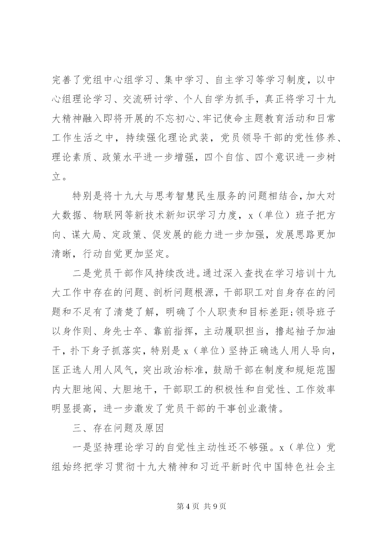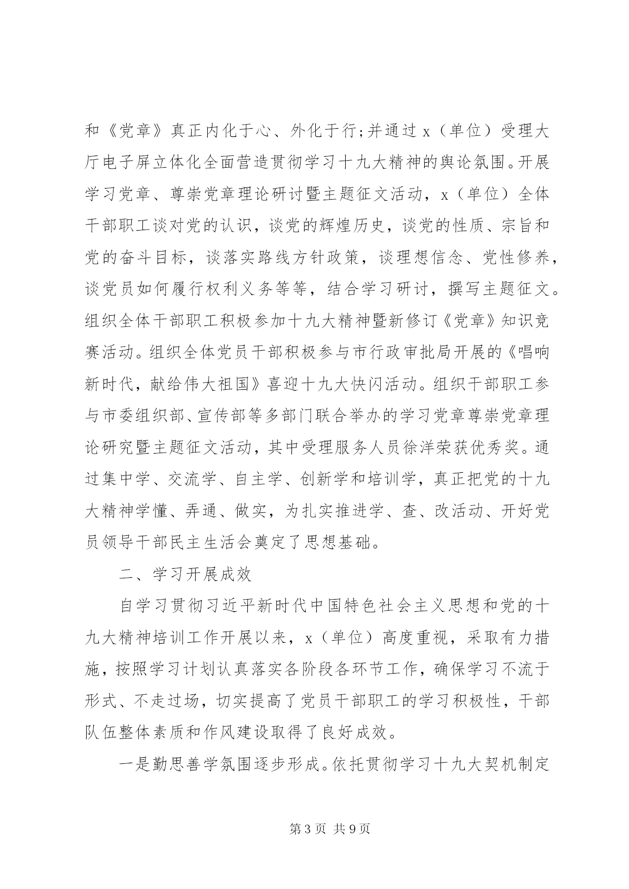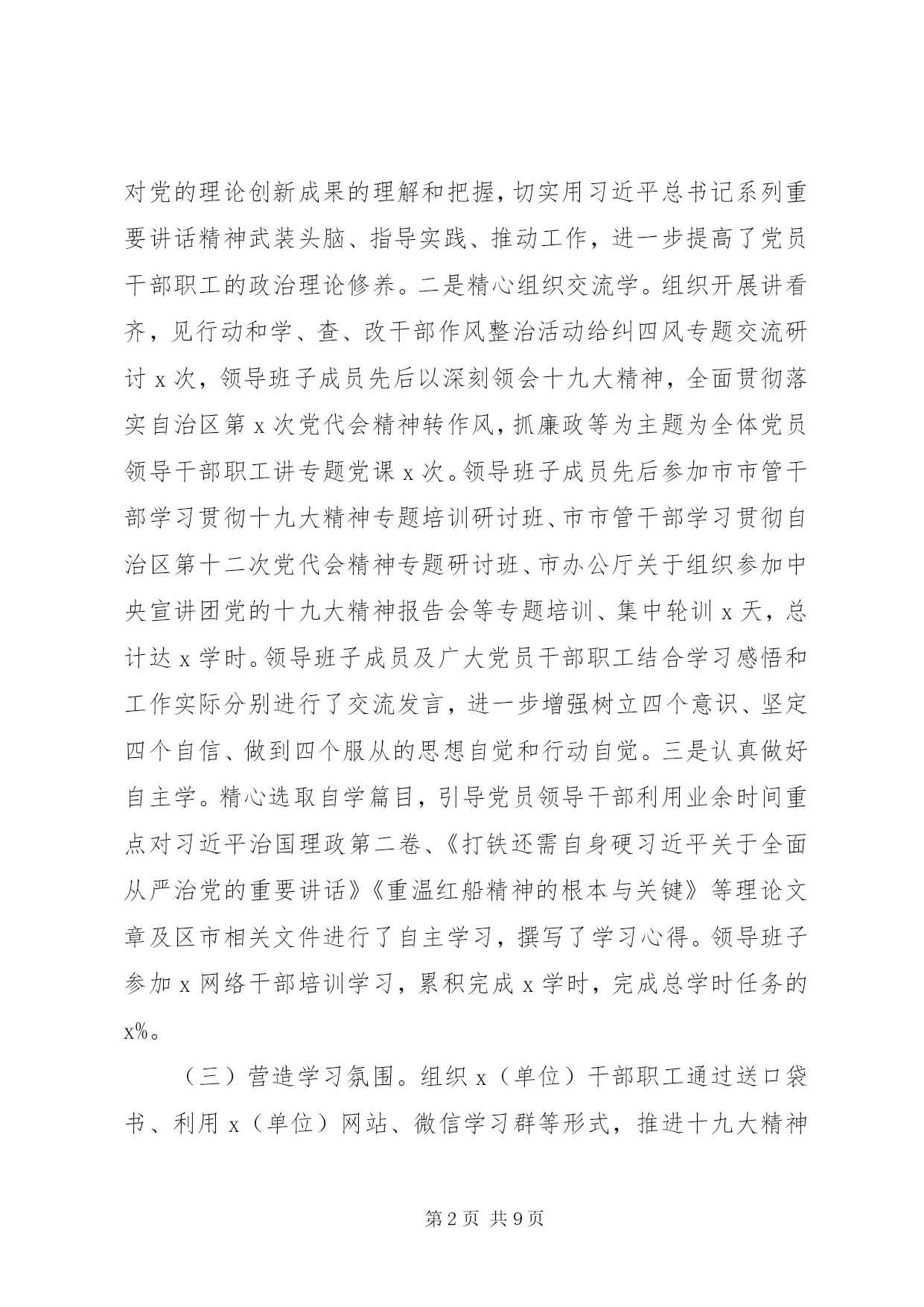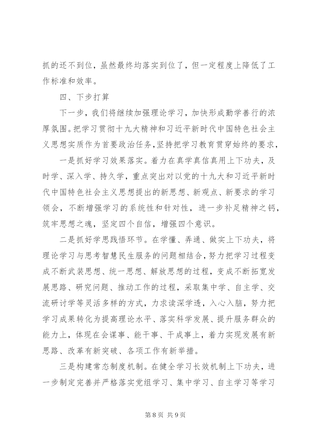 第PAGE\*Arabic\*MERGEFORMAT9页共NUMPAGES\*MERGEFORMAT9页关于开展理论学习的情况报告一、学习开展情况(一)精心筹划部署。中心党组始终把学习贯彻习近平新时代中国特色社会主义思想和党的十九大精神作为重要政治任务,按照市委的安排部署和市委办公厅《关于学习宣传贯彻党的十九大精神的通知》(x党办[2017]83号)文件精神,结合中心工作实际,制定印发了《xxxx(单位)学习宣传贯彻党的十九大精神计划安排》,中心党组结合学、查、改干部作风整治活动专题研究部署学习推进工作,统筹安排,精心组织,进一步明确任务分工和学习研讨各环节工作。形成了主要领导牵头抓、分管领导重点抓、党务专干具体抓、干部职工认真学的浓厚氛围。(二)深化学习教育。中心党组结合扎实开展学、查、改干部作风整治活动和2017年度领导班子及县处级领导干部民主生活会,全力抓好学习教育。一是扎实开展集中学。组织党员领导干部集中收看了《中国共产党第十九次全国代表大会》开幕式,明确了十九大的精神内涵和基本要义,为下一步工作开展夯实了精神根基。先后组织全体干部职工召开专题集中学习7次、党小组会3次。重点深入学习了习近平新时代中国特色社会主义思想精神实质、党的十九大提出的一系列重要科学论述及新党章、红船精神和习近平总书记关于纠正四风重要讲话精神,在读原著、学原文、悟原理上下功夫,做到深学深悟、常学常新,不断深化对党的理论创新成果的理解和把握,切实用习近平总书记系列重要讲话精神武装头脑、指导实践、推动工作,进一步提高了党员干部职工的政治理论修养。二是精心组织交流学。组织开展讲看齐,见行动和学、查、改干部作风整治活动给纠四风专题交流研讨x次,领导班子成员先后以深刻领会十九大精神,全面贯彻落实自治区第x次党代会精神转作风,抓廉政等为主题为全体党员领导干部职工讲专题党课x次。领导班子成员先后参加市市管干部学习贯彻十九大精神专题培训研讨班、市市管干部学习贯彻自治区第十二次党代会精神专题研讨班、市办公厅关于组织参加中央宣讲团党的十九大精神报告会等专题培训、集中轮训x天,总计达x学时。领导班子成员及广大党员干部职工结合学习感悟和工作实际分别进行了交流发言,进一步增强树立四个意识、坚定四个自信、做到四个服从的思想自觉和行动自觉。三是认真做好自主学。精心选取自学篇目,引导党员领导干部利用业余时间重点对习近平治国理政第二卷、《打铁还需自身硬习近平关于全面从严治党的重要讲话》《重温红船精神的根本与关键》等理论文章及区市相关文件进行了自主学习,撰写了学习心得。领导班子参加x网络干部培训学习,累积完成x学时,完成总学时任务的x%。(三)营造学习氛围。组织x(单位)干部职工通过送口袋书、利用x(单位)网站、微信学习群等形式,推进十九大精神和《党章》真正内化于心、外化于行;并通过x(单位)受理大厅电子屏立体化全面营造贯彻学习十九大精神的舆论氛围。开展学习党章、尊崇党章理论研讨暨主题征文活动,x(单位)全体干部职工谈对党的认识,谈党的辉煌历史,谈党的性质、宗旨和党的奋斗目标,谈落实路线方针政策,谈理想信念、党性修养,谈党员如何履行权利义务等等,结合学习研讨,撰写主题征文。组织全体干部职工积极参加十九大精神暨新修订《党章》知识竞赛活动。组织全体党员干部积极参与市行政审批局开展的《唱响新时代,献给伟大祖国》喜迎十九大快闪活动。组织干部职工参与市委组织部、宣传部等多部门联合举办的学习党章尊崇党章理论研究暨主题征文活动,其中受理服务人员徐洋荣获优秀奖。通过集中学、交流学、自主学、创新学和培训学,真正把党的十九大精神学懂、弄通、做实,为扎实推进学、查、改活动、开好党员领导干部民主生活会奠定了思想基础。二、学习开展成效自学习贯彻习近平新时代中国特色社会主义思想和党的十九大精神培训工作开展以来,x(单位)高度重视,采取有力措施,按照学习计划认真落实各阶段各环节工作,确保学习不流于形式、不走过场,切实提高了党员干部职工的学习积极性,干部队伍整体素质和作风建设取得了良好成效。一是勤思善学氛围逐步形成。依托贯彻学习十九大契机制定完善了党组中心组学习、集中学习、自主学习等学习制度,以中心组理论学习、交流研讨学、个人自学为抓手,真正将学习十九大精神融入即将开展的不忘初心、牢记使命主题教育活动和日常工作生活之中,持续强化理论武装,党员领导干部的党性修养、理论素质、政策水平进一步增强,四个自信、四个意识进一步树立。特别是将十九大与思考智慧民生服务的问题相结合,加大对大数据、物联网等新技术新知识学习力度,x(单位)班子把方向、谋大局、定政策、促发展的能力进一步加强,发展思路更加清晰,行动自觉更加坚定。二是党员干部作风持续改进。通过深入查找在学习培训十九大工作中存在的问题、剖析问题根源