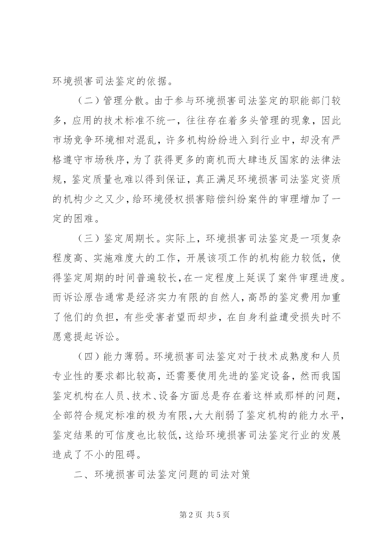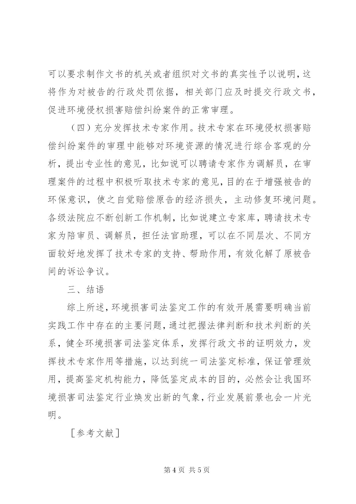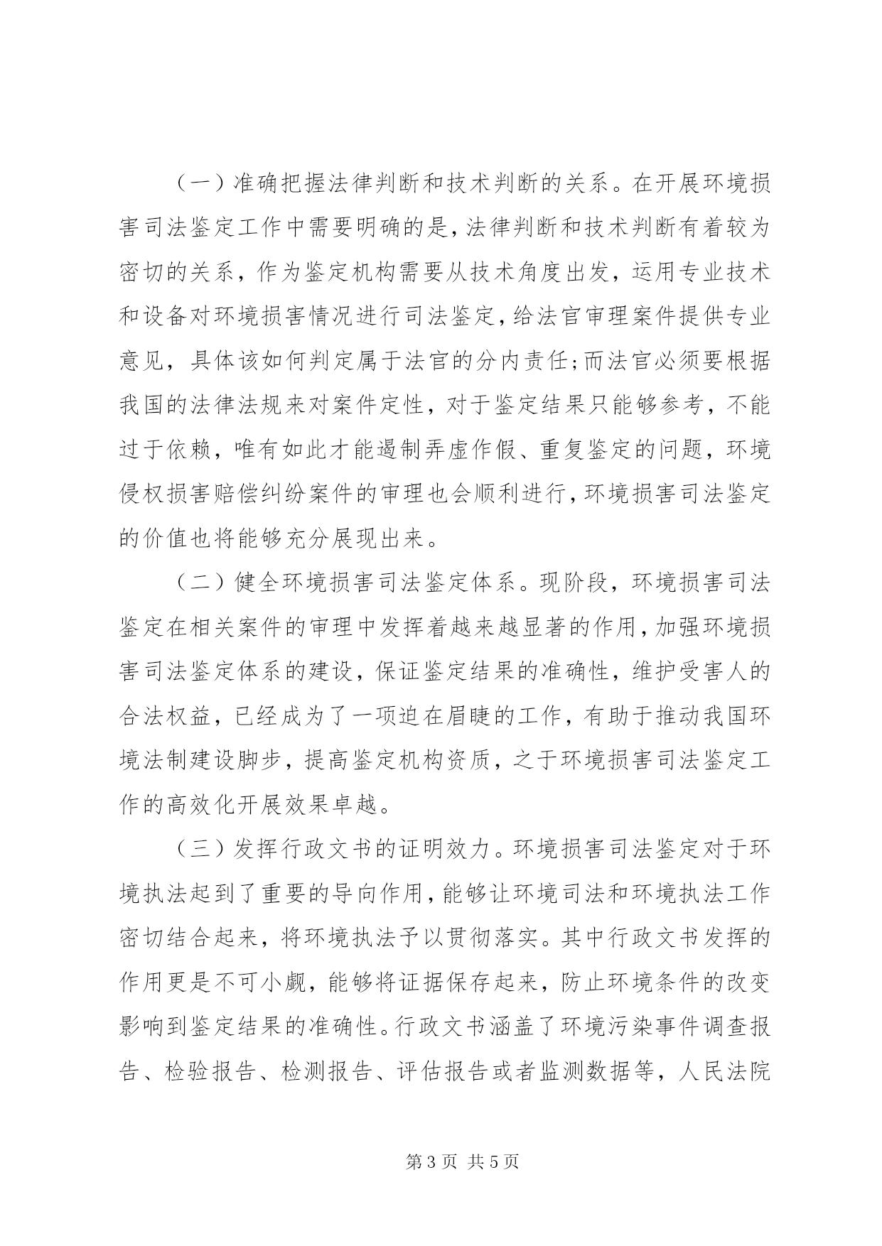 第PAGE\*Arabic\*MERGEFORMAT5页共NUMPAGES\*MERGEFORMAT5页环境损害司法鉴定问题及对策探讨摘要。在环境损害司法鉴定中存在着诸多问题,为了对这些问题予以妥善解决,本文将提出行之有效的司法对策,希望在实践工作中能够起到参考和借鉴的作用,致力于将环境侵权损害赔偿纠纷予以化解,为相关案件的审理提供有力的支持。关键词:环境损害;司法鉴定;问题;司法对策伴随着我国城市化发展脚步的逐渐加快,关于环境侵权损害赔偿纠纷的案件与日俱增,如果不能采取有效的环境损害司法鉴定措施,将会严重危害到受害人的合法权益,司法的公平性和公正性也会饱受质疑。为了保证相关案件审理结果的权威性,必须要加强对环境损害司法鉴定问题的处理,确保双方纠纷能够得到及时缓解,避免酿成更大的损失,从而为环境损害司法鉴定的长效开展奠定坚实的基础。一、环境损害司法鉴定问题分析(一)标准不统一。一般来说,环境损害司法鉴定体系涉及到的范围十分广泛,农业、林业、养殖业、渔业、海洋生态的环境损害司法鉴定以及危险废弃物认定等都囊括在内,这些领域所需的环境损害司法鉴定技术有着明显的差异,给相关鉴定工作增加了难度。与此同时,环境损害司法鉴定需要多个行政管理部门的共同参与,他们遵循的技术规范有所不同,最终生成的鉴定结果也会存在明显的区别,甚至有些结论是截然相反的,难以成为环境损害司法鉴定的依据。(二)管理分散。由于参与环境损害司法鉴定的职能部门较多,应用的技术标准不统一,往往存在着多头管理的现象,因此市场竞争环境相对混乱,许多机构纷纷进入到行业中,却没有严格遵守市场秩序,为了获得更多的商机而大肆违反国家的法律法规,鉴定质量也难以得到保证,真正满足环境损害司法鉴定资质的机构少之又少,给环境侵权损害赔偿纠纷案件的审理增加了一定的困难。(三)鉴定周期长。实际上,环境损害司法鉴定是一项复杂程度高、实施难度大的工作,开展该项工作的机构能力较低,使得鉴定周期的时间普遍较长,在一定程度上延误了案件审理进度。而诉讼原告通常是经济实力有限的自然人,高昂的鉴定费用加重了他们的负担,有些受害者望而却步,在自身利益遭受损失时不愿意提起诉讼。(四)能力薄弱。环境损害司法鉴定对于技术成熟度和人员专业性的要求都比较高,还需要使用先进的鉴定设备,然而我国鉴定机构在人员、技术、设备方面总是存在着这样或那样的问题,全部符合规定标准的极为有限,大大削弱了鉴定机构的能力水平,鉴定结果的可信度也比较低,这给环境损害司法鉴定行业的发展造成了不小的阻碍。二、环境损害司法鉴定问题的司法对策(一)准确把握法律判断和技术判断的关系。在开展环境损害司法鉴定工作中需要明确的是,法律判断和技术判断有着较为密切的关系,作为鉴定机构需要从技术角度出发,运用专业技术和设备对环境损害情况进行司法鉴定,给法官审理案件提供专业意见,具体该如何判定属于法官的分内责任;而法官必须要根据我国的法律法规来对案件定性,对于鉴定结果只能够参考,不能过于依赖,唯有如此才能遏制弄虚作假、重复鉴定的问题,环境侵权损害赔偿纠纷案件的审理也会顺利进行,环境损害司法鉴定的价值也将能够充分展现出来。(二)健全环境损害司法鉴定体系。现阶段,环境损害司法鉴定在相关案件的审理中发挥着越来越显著的作用,加强环境损害司法鉴定体系的建设,保证鉴定结果的准确性,维护受害人的合法权益,已经成为了一项迫在眉睫的工作,有助于推动我国环境法制建设脚步,提高鉴定机构资质,之于环境损害司法鉴定工作的高效化开展效果卓越。(三)发挥行政文书的证明效力。环境损害司法鉴定对于环境执法起到了重要的导向作用,能够让环境司法和环境执法工作密切结合起来,将环境执法予以贯彻落实。其中行政文书发挥的作用更是不可小觑,能够将证据保存起来,防止环境条件的改变影响到鉴定结果的准确性。行政文书涵盖了环境污染事件调查报告、检验报告、检测报告、评估报告或者监测数据等,人民法院可以要求制作文书的机关或者组织对文书的真实性予以说明,这将作为对被告的行政处罚依据,相关部门应及时提交行政文书,促进环境侵权损害赔偿纠纷案件的正常审理。(四)充分发挥技术专家作用。技术专家在环境侵权损害赔偿纠纷案件的审理中能够对环境资源的情况进行综合客观的分析,提出专业性的意见,比如说可以聘请专家作为调解员,在审理案件的过程中积极听取技术专家的意见,目的在于增强被告的环保意识,使之自觉赔偿原告的经济损失,主动修复环境问题。各级法院应不断创新工作机制,比如说建立专家库,聘请技术专家为陪审员、调解员,担任法官助理,可以在不同层次、不同方面较好地发挥了技术专家的支持、帮助作用,有效化解了原被告间的诉讼争议。三、结语综上所述,环境损害司法鉴定工作的有效开展需要明确当前实践工作中存在的主要问题,通过把握法律判断和技术判断的