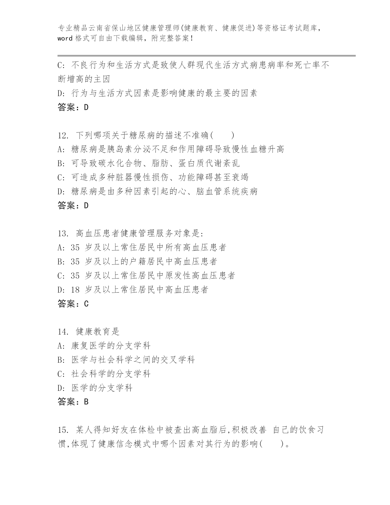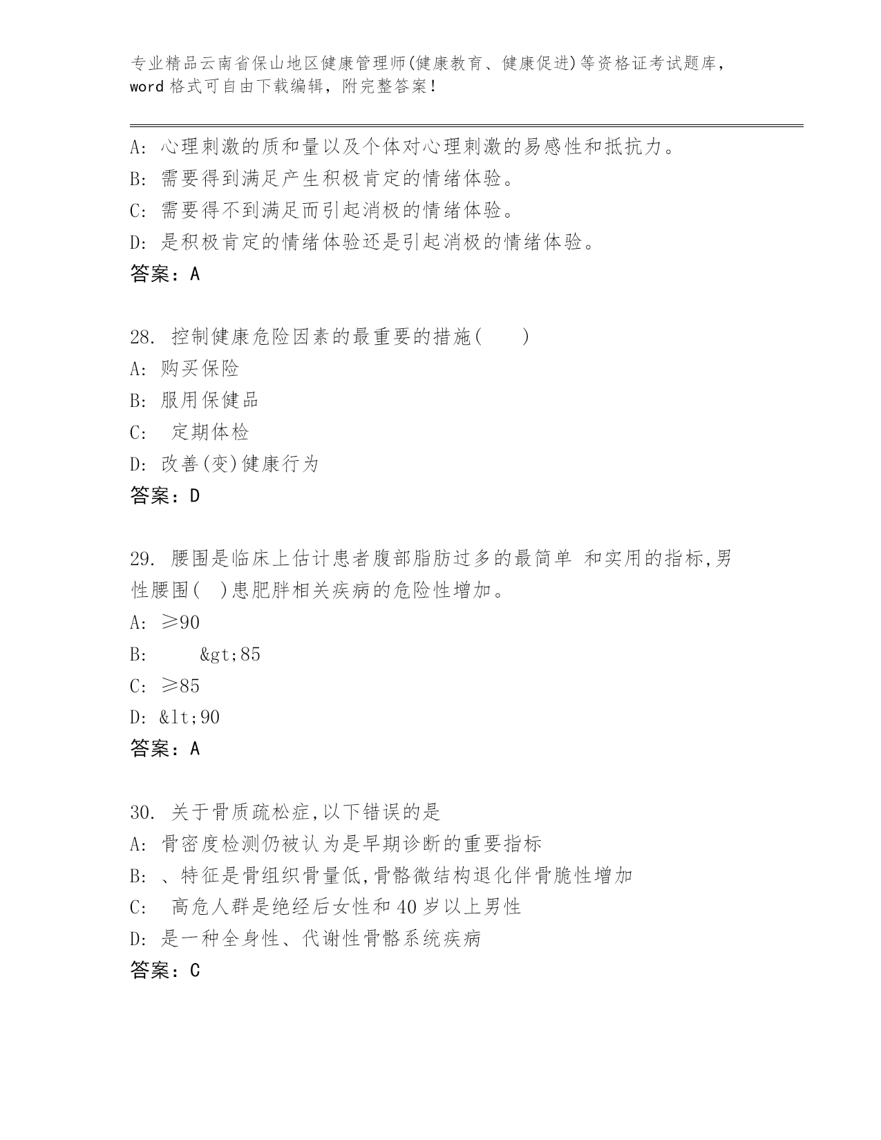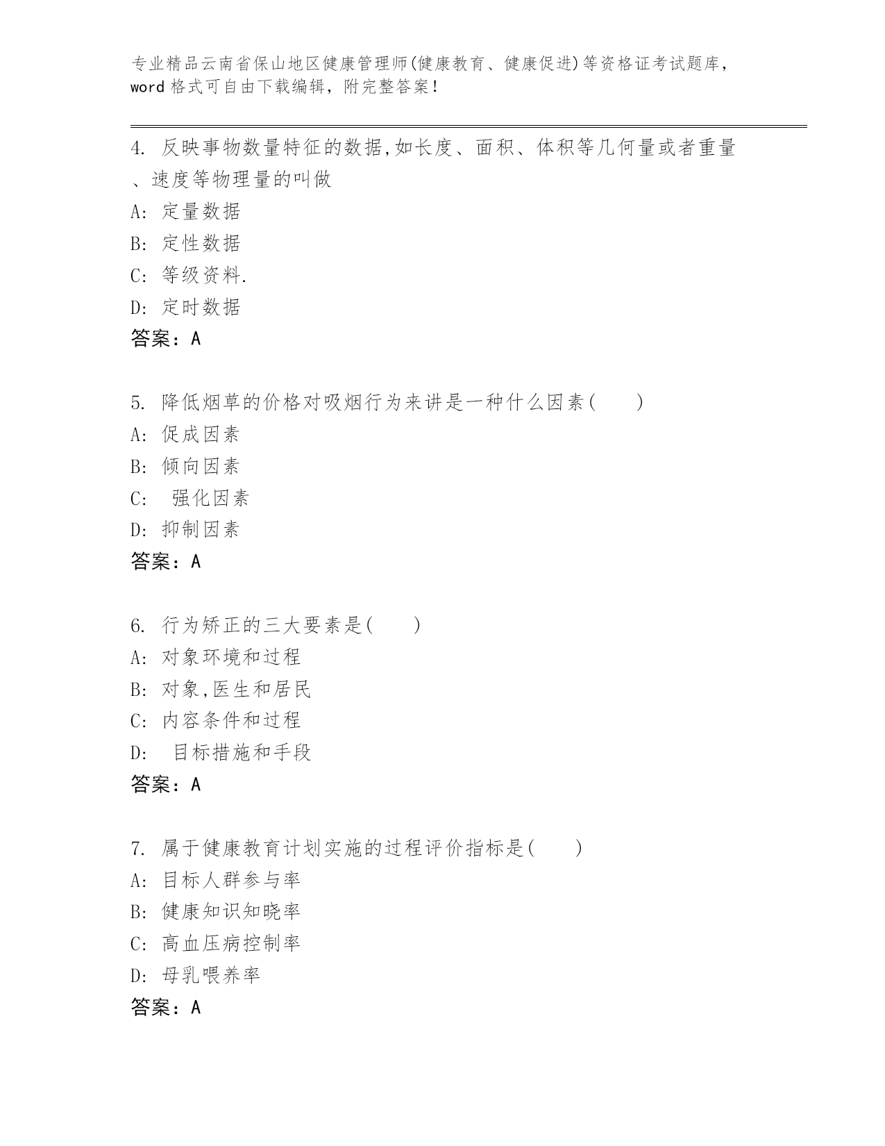 云南省保山地区健康管理师(健康教育、健康促进)等资格证考试通用题库(精练).docx