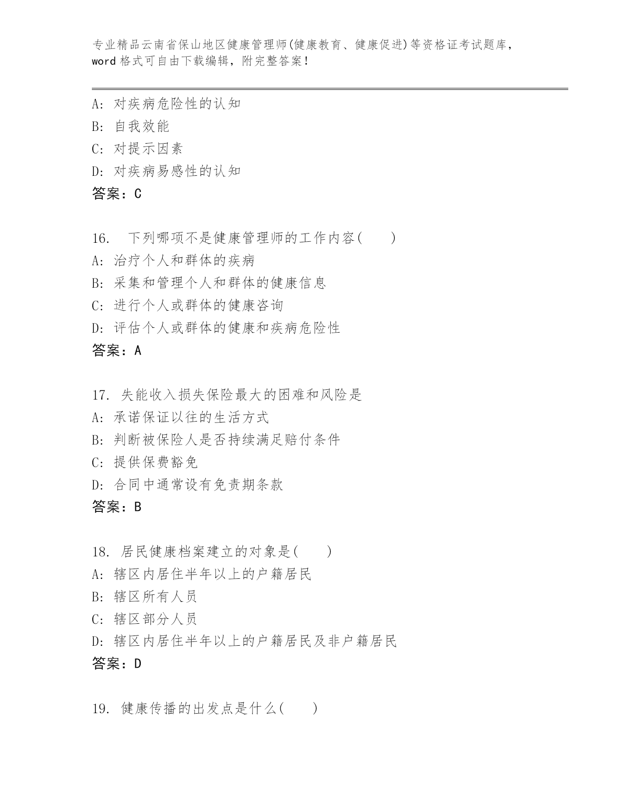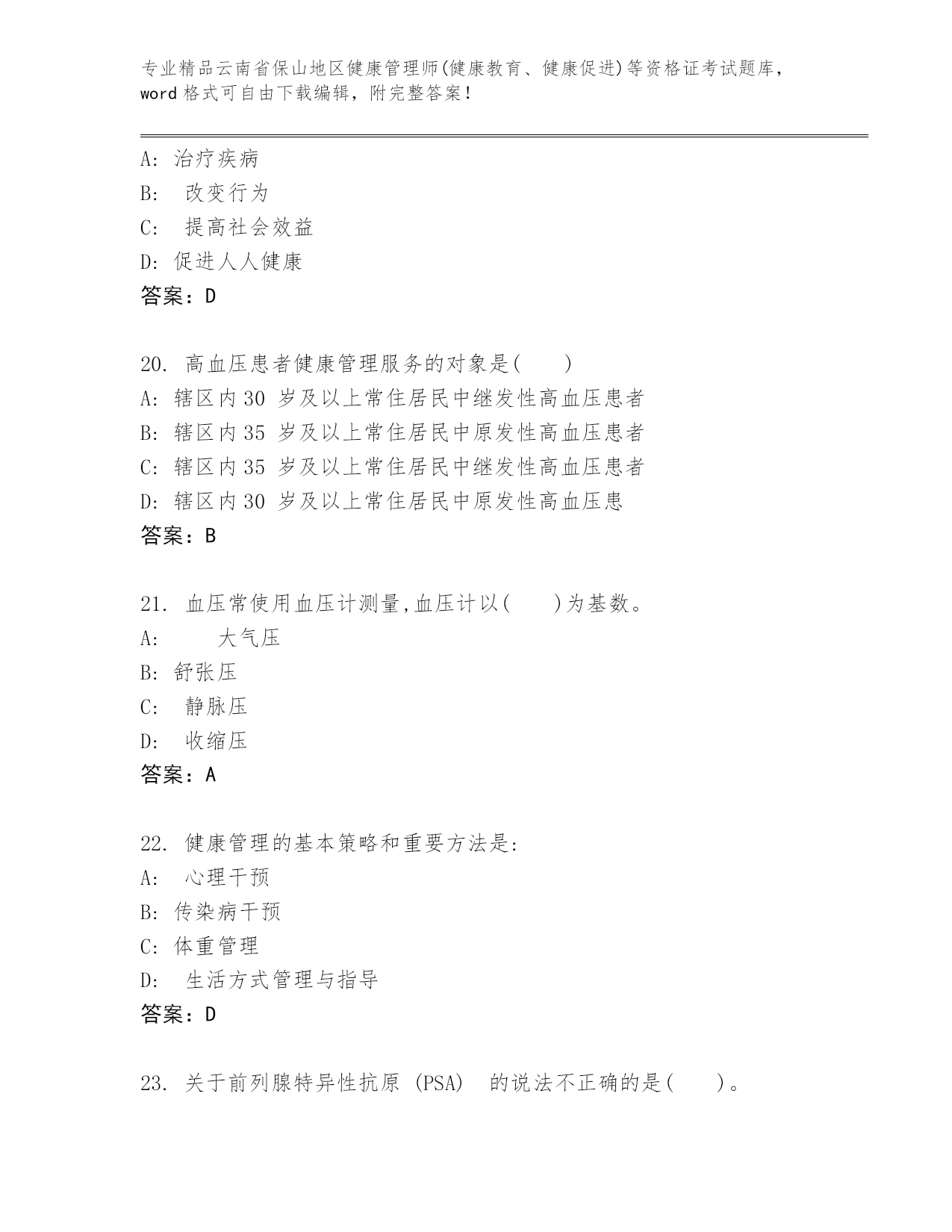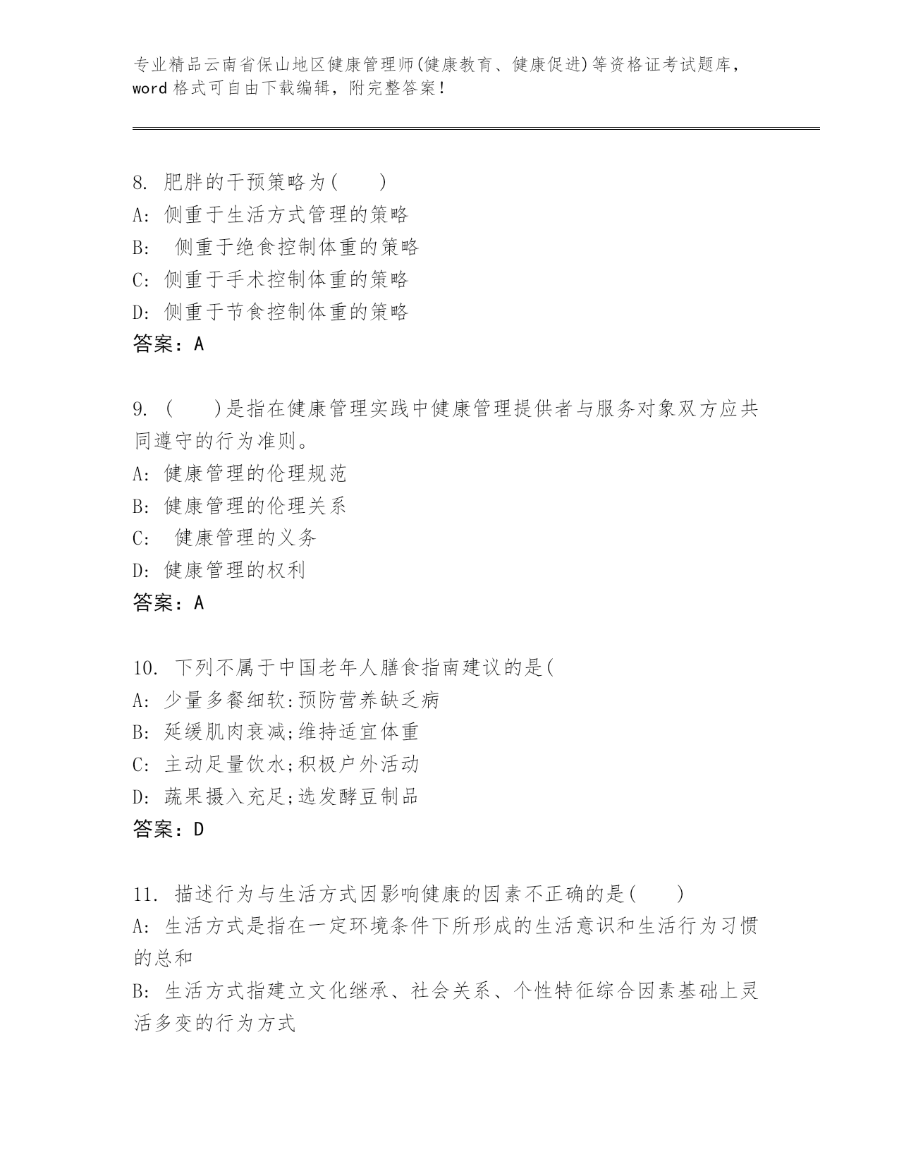 云南省保山地区健康管理师(健康教育、健康促进)等资格证考试通用题库(精练).docx