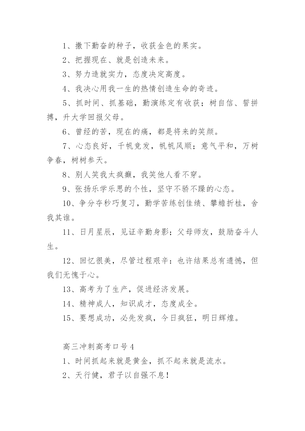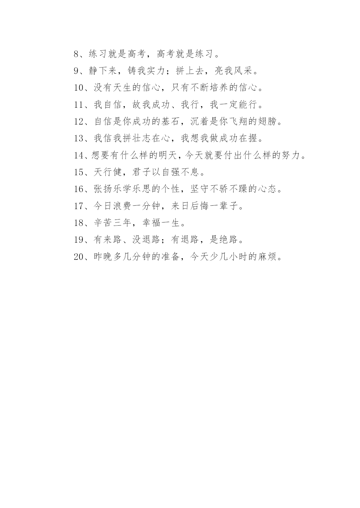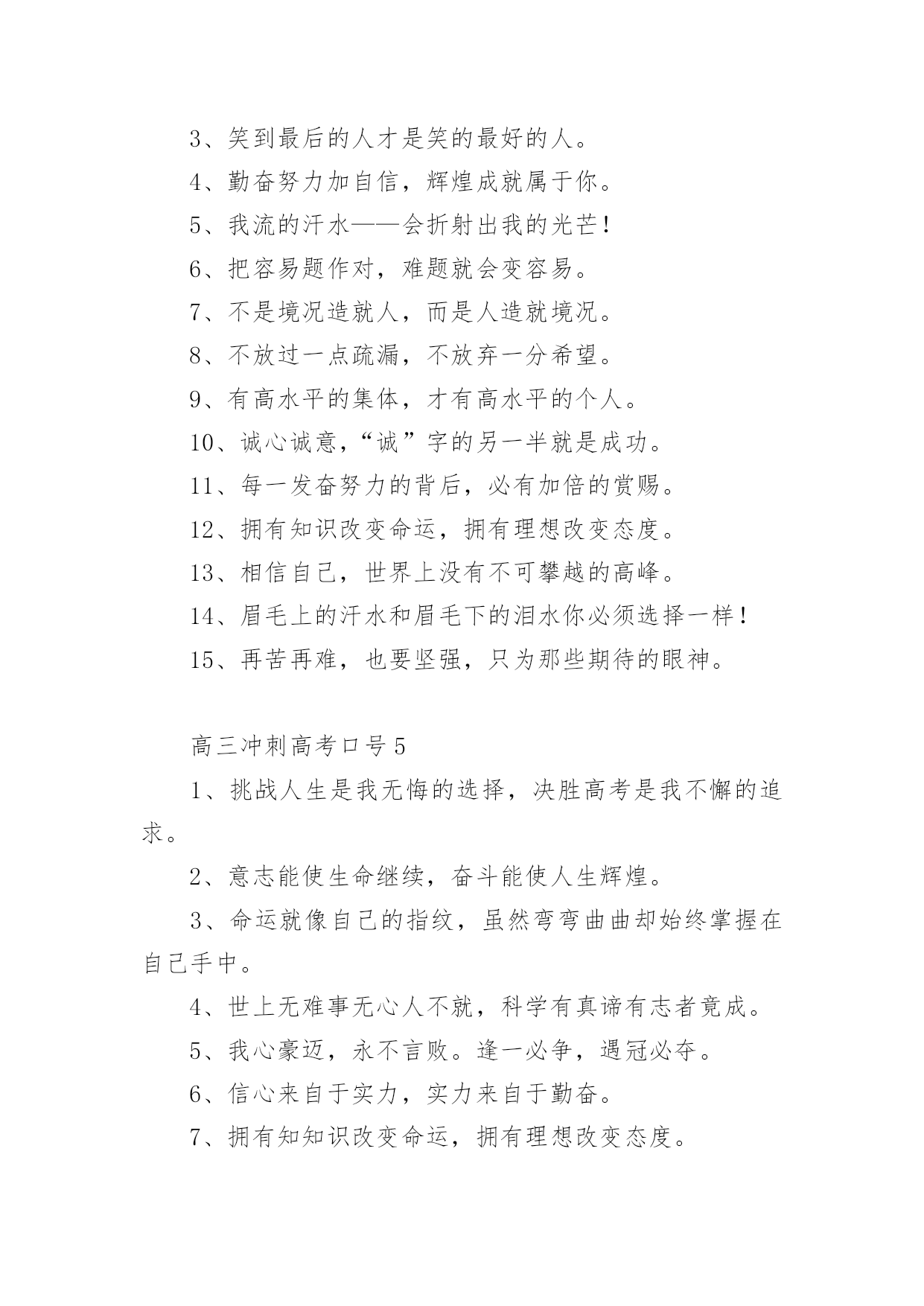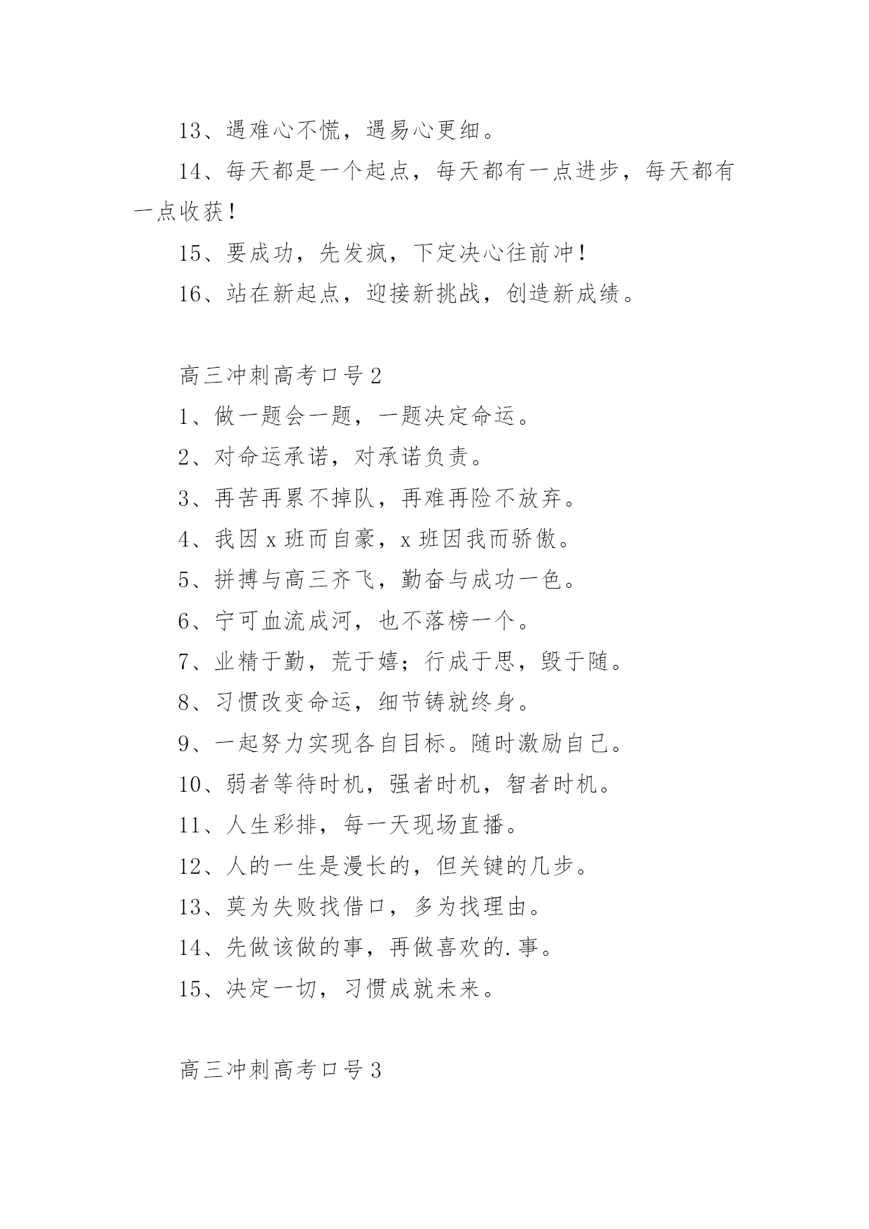 高三冲刺高考口号高三冲刺高考口号(通用5篇)在学习、工作、生活中,大家总少不了接触一些耳熟能详的口号吧,口号在句式上,除了简短,容易记忆之外,还要容易念,容易传。你还在找寻优秀经典的口号吗?以下是小编精心整理的高三冲刺高考口号(通用5篇),仅供参考,大家一起来看看吧。高三冲刺高考口号11、拧成一股绳,搏尽一份力,狠下一条心,共圆一个梦。2、把汗水变成珍珠,把梦想变成现实!3、精神成就事业,态度决定一切。4、静下来,铸我实力;拼上去,亮我风采。5、人活着要呼吸。呼者,出一口气;吸者,争一口气。6、眼泪不是我们的答案,拼搏才是我们的选择。7、拼一载春秋,搏一生无悔。8、拼一分高一分,一分成就终生。9、做一题会一题,一题决定命运。10、贵在坚持、难在坚持、成在坚持11、不苦不累,高三无味;不拼不搏,等于白活。12、忘时,忘物,忘我。诚实,朴实,踏实。13、遇难心不慌,遇易心更细。14、每天都是一个起点,每天都有一点进步,每天都有一点收获!15、要成功,先发疯,下定决心往前冲!16、站在新起点,迎接新挑战,创造新成绩。高三冲刺高考口号21、做一题会一题,一题决定命运。2、对命运承诺,对承诺负责。3、再苦再累不掉队,再难再险不放弃。4、我因x班而自豪,x班因我而骄傲。5、拼搏与高三齐飞,勤奋与成功一色。6、宁可血流成河,也不落榜一个。7、业精于勤,荒于嬉;行成于思,毁于随。8、习惯改变命运,细节铸就终身。9、一起努力实现各自目标。随时激励自己。10、弱者等待时机,强者时机,智者时机。11、人生彩排,每一天现场直播。12、人的一生是漫长的,但关键的几步。13、莫为失败找借口,多为找理由。14、先做该做的事,再做喜欢的.事。15、决定一切,习惯成就未来。高三冲刺高考口号31、撒下勤奋的种子,收获金色的果实。2、把握现在、就是创造未来。3、努力造就实力,态度决定高度。4、我决心用我一生的热情创造生命的奇迹。5、抓时间、抓基础,勤演练定有收获;树自信、誓拼搏,升大学回报父母。6、曾经的苦,现在的痛,都是将来的笑颜。7、心态良好,千帆竞发,帆帆风顺;意气平和,万树争春,树树参天。8、别人笑我太疯癫,我笑他人看不穿。9、张扬乐学乐思的个性,坚守不骄不躁的心态。10、争分夺秒巧复习,勤学苦练创佳绩、攀蟾折桂,舍我其谁。11、日月星辰,见证辛勤身影;父母师友,鼓励奋斗人生。12、回忆很美,尽管过程艰辛:也许结果总有遗憾,但我们无愧于心。13、高考为了生产,促进经济发展。14、精神成人,知识成才,态度成全。15、要想成功,必先发疯,今日疯狂,明日辉煌。高三冲刺高考口号41、时间抓起来就是黄金,抓不起来就是流水。2、天行健,君子以自强不息!3、笑到最后的人才是笑的最好的人。4、勤奋努力加自信,辉煌成就属于你。5、我流的汗水——会折射出我的光芒!6、把容易题作对,难题就会变容易。7、不是境况造就人,而是人造就境况。8、不放过一点疏漏,不放弃一分希望。9、有高水平的集体,才有高水平的个人。10、诚心诚意,“诚”字的另一半就是成功。11、每一发奋努力的背后,必有加倍的赏赐。12、拥有知识改变命运,拥有理想改变态度。13、相信自己,世界上没有不可攀越的高峰。14、眉毛上的汗水和眉毛下的泪水你必须选择一样!15、再苦再难,也要坚强,只为那些期待的眼神。高三冲刺高考口号51、挑战人生是我无悔的选择,决胜高考是我不懈的追求。2、意志能使生命继续,奋斗能使人生辉煌。3、命运就像自己的指纹,虽然弯弯曲曲却始终掌握在自己手中。4、世上无难事无心人不就,科学有真谛有志者竟成。5、我心豪迈,永不言败。逢一必争,遇冠必夺。6、信心来自于实力,实力来自于勤奋。7、拥有知知识改变命运,拥有理想改变态度。8、练习就是高考,高考就是练习。9、静下来,铸我实力;拼上去,亮我风采。10、没有天生的信心,只有不断培养的信心。11、我自信,故我成功、我行,我一定能行。12、自信是你成功的基石,沉着是你飞翔的翅膀。13、我信我拼壮志在心,我想我做成功在握。14、想要有什么样的明天,今天就要付出什么样的努力。15、天行健,君子以自强不息。16、张扬乐学乐思的个性,坚守不骄不躁的心态。17、今日浪费一分钟,来日后悔一辈子。18、辛苦三年,幸福一生。19、有来路、没退路;有退路,是绝路。20、昨晚多几分钟的准备,今天少几小时的麻烦。