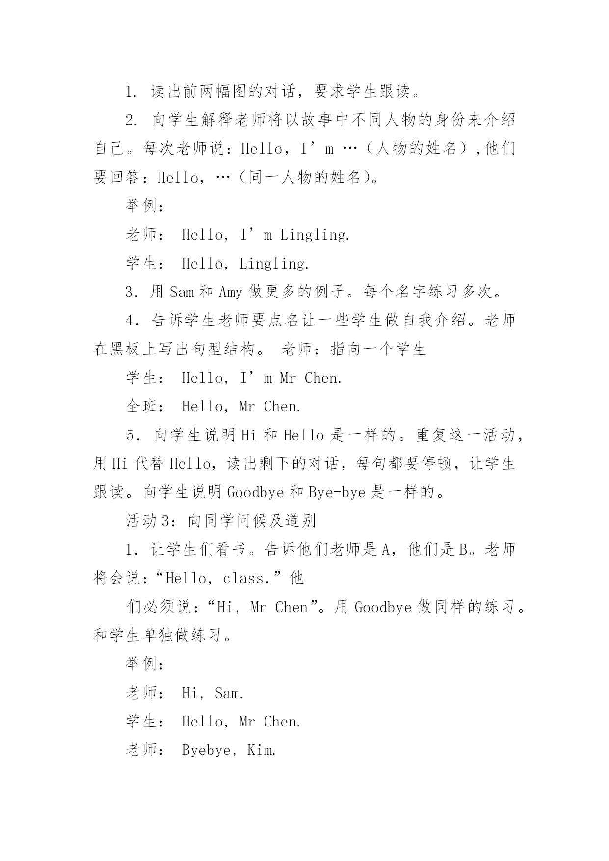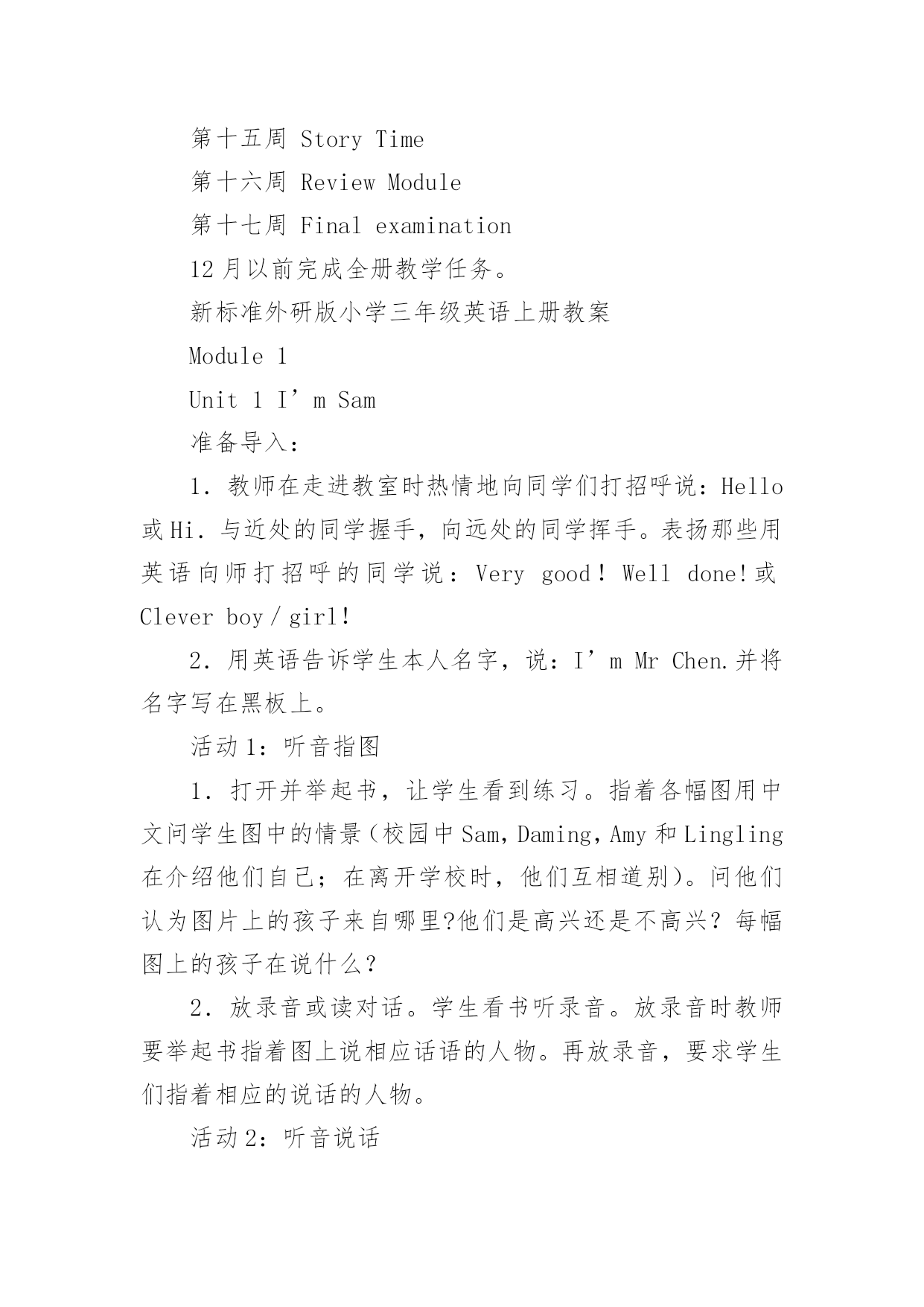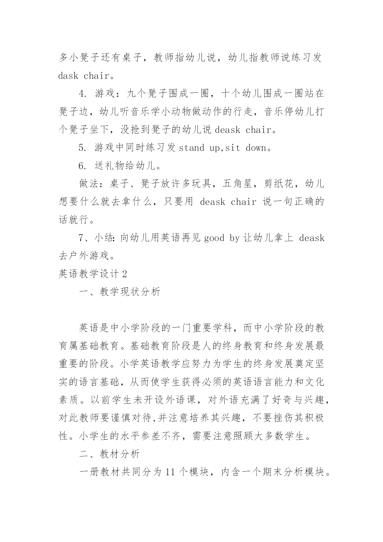 英语教学设计英语教学设计作为一名优秀的教育工作者,时常需要编写教学设计,教学设计是根据课程标准的要求和教学对象的特点,将教学诸要素有序安排,确定合适的教学方案的设想和计划。我们应该怎么写教学设计呢?下面是小编整理的英语教学设计,希望对大家有所帮助。英语教学设计1目标:1.教幼儿学会deskchair的正确发音,学会听懂短语standusitdown,clapyourhandsds。2.培养幼儿大胆说英语,对英语的浓厚兴趣。准备:桌子、凳子、一些幼儿喜爱的玩具,五角星,剪纸花。过程:1.老师和蔼向幼儿问好,(goodmonrningboysandgrils)。2.老师做寻找东西样,请幼儿猜老师在干什么?幼儿自由回答后,教师出示凳子、桌子,告诉幼儿他们的英文名是deskchair教幼儿先听音看口形发音。注意发准{k}。3.showme(deskchair)并发音。做法:室内藏有许多小凳子还有桌子,教师指幼儿说,幼儿指教师说练习发daskchair。4.游戏:九个凳子围成一圈,十个幼儿围成一圈站在凳子边,幼儿听音乐学小动物做动作的行走,音乐停幼儿打个凳子坐下,没抢到凳子的幼儿说deaskchair。5.游戏中同时练习发standup,sitdown。6.送礼物给幼儿。做法:桌子、凳子放许多玩具,五角星,剪纸花,幼儿想要什么就去拿什么,只要用deaskchair说一句正确的话就行。7、小结:向幼儿用英语再见goodby让幼儿拿上deask去户外游戏。英语教学设计2一、教学现状分析英语是中小学阶段的一门重要学科,而中小学阶段的教育属基础教育。基础教育阶段是人的终身教育和终身发展最重要的阶段。小学英语教学应努力为学生的终身发展奠定坚实的语言基础,从而使学生获得必须的英语语言能力和文化素质。以前学生未开设外语课,对外语充满了好奇与兴趣,对此教师要谨慎对待,并注意培养其兴趣,不要挫伤其积极性。小学生的水平参差不齐,需要注意照顾大多数学生。二、教材分析一册教材共同分为11个模块,内含一个期末分析模块。每个模块分两个单元。一般,第一单元呈现要学习的语言内容,第二提供任务型练习,包括一首歌谣和小诗。歌谣和小诗的学习目的有三,一是培养学生的语感和节奏感,二是提高学生发音准确性,三是通过这些英语国家儿童所熟知的歌谣介绍一定的西方文化。不常用单词不要求掌握。希望学生结合语用和语词的基本语义,逐步获得最基本的运用英语的能力。课文呈现了一些新的语法内容,但不要求讲解,更不要求学生掌握,只是要求初步运用这些语句。三、教学目标通过学习本册教材使学生:1.逐渐形成学习英语的兴趣和爱好,形成在真实环境中使用英语进行活动的积极性。2.能运用英语在日常生活和课堂情景中与老师和同学进行初步交际,如问候他人,家庭和朋友的简单消息。3.能参加运用英语组织和开展的日常课堂教学和生活游戏,及其它课内外活动。4.能听懂简单的指令并作出适当的反应,能读懂简单的配图小故事,进行口头描述,唱一些英语歌曲,背一些小诗和歌谣。5.养成良好的学习英语的基本方法;形成英语学习的自觉性,和通过英语学习,获得更多知识的求知欲。6.养成良好的文明行为习惯,掌握基本的英语交际礼貌策略,全面提高综合素质。7.乐于了解英语国家儿童的兴趣爱好,以及外国人的一般风俗习惯。四、提高教学质量的措施1.创造良好的学习气氛。2.在课堂上尽量的使用英语,适当使用汉语。3.合理确定教学要求。不要求学生自由地说出课文所有内容,甚至不要求能自由地朗读课文。4.纠正控制性错误,不纠正非控制性错误。5.多表扬多鼓励。6.利用录音带、多媒体教学课件、挂图等。五、教学进度第一周Module1Greetings第二周Module2Introductions第三周Module3Classroom第四周Module4Colours第五周Module5Numbers1-12第六周Rest第七周Module6School第八周MiddleReview第九周MiddleReview第十周Mid-termexamination第十一周Module7Birthday第十二周Module8Friends第十三周Module9Family第十四周Module10Body第十五周StoryTime第十六周ReviewModule第十七周Finalexamination12月以前完成全册教学任务。新标准外研版小学三年级英语上册教案Module1Unit1I’mSam准备导入:1.教师在走进教室时热情地向同学们打招呼说:Hello或Hi.与近处的同学握手,向远处的同学挥手。表扬那些用英语向师打招呼的同学说:Verygood!Welldone!或Cleverboy/girl!2.用英语告诉学生本人名字,说:I’mMrChen.并将名字写在黑板上。活动1:听音