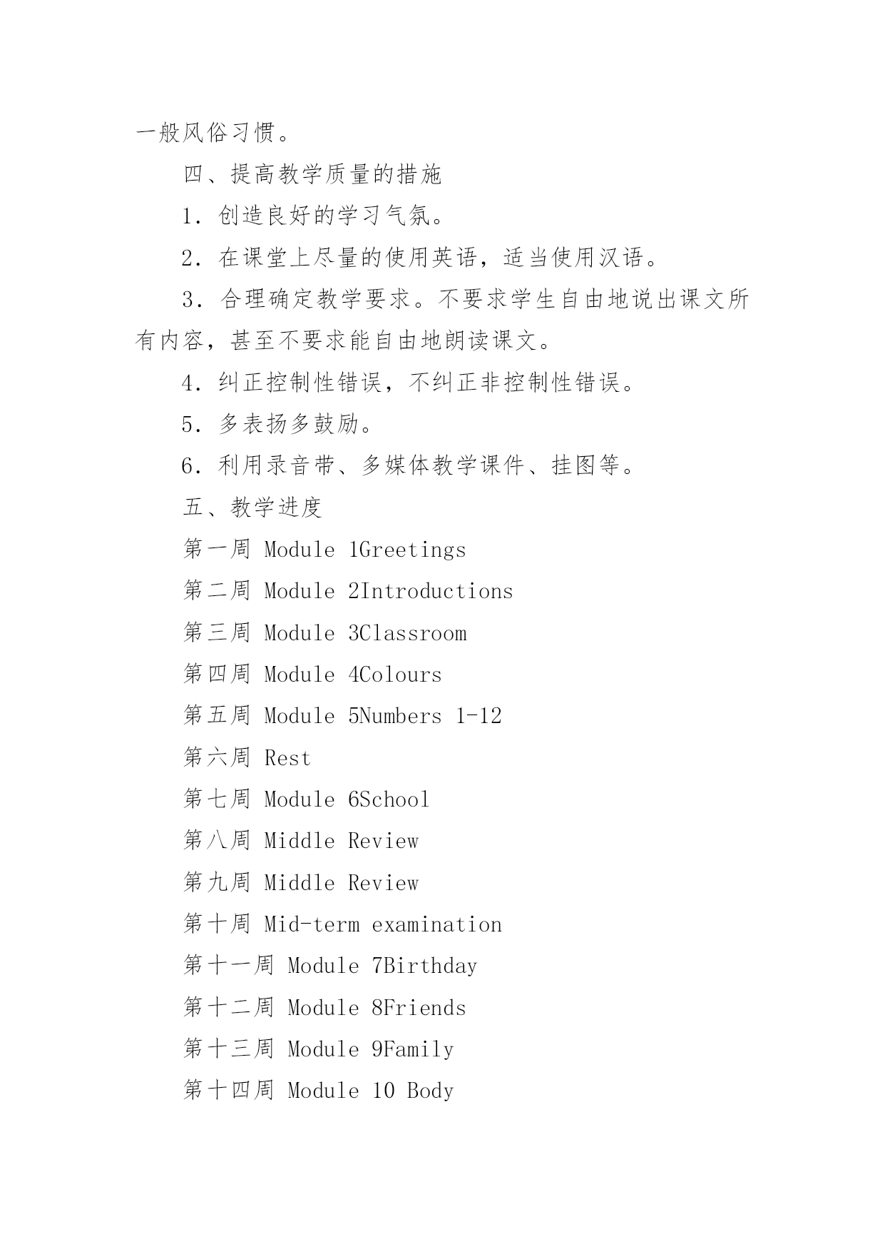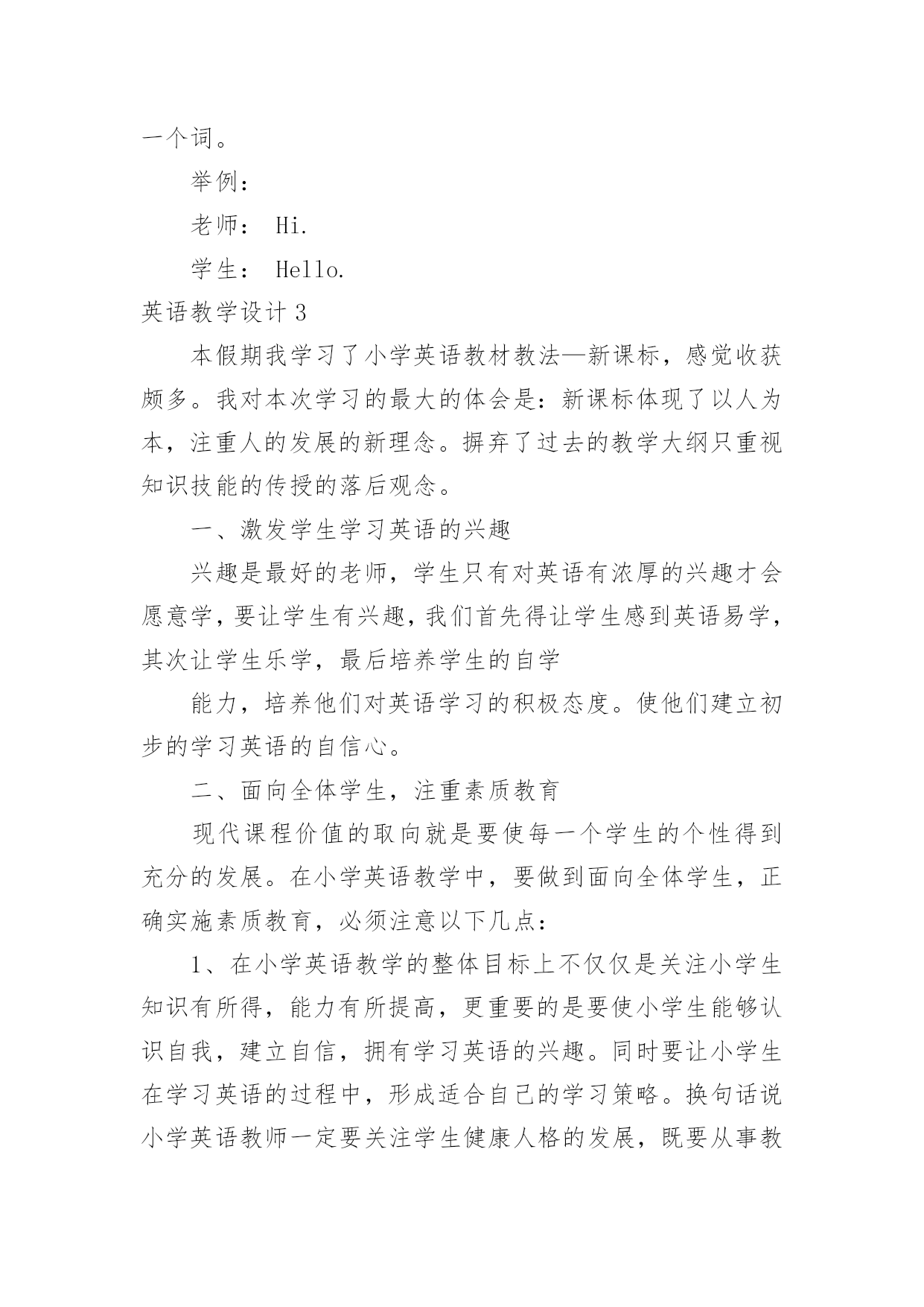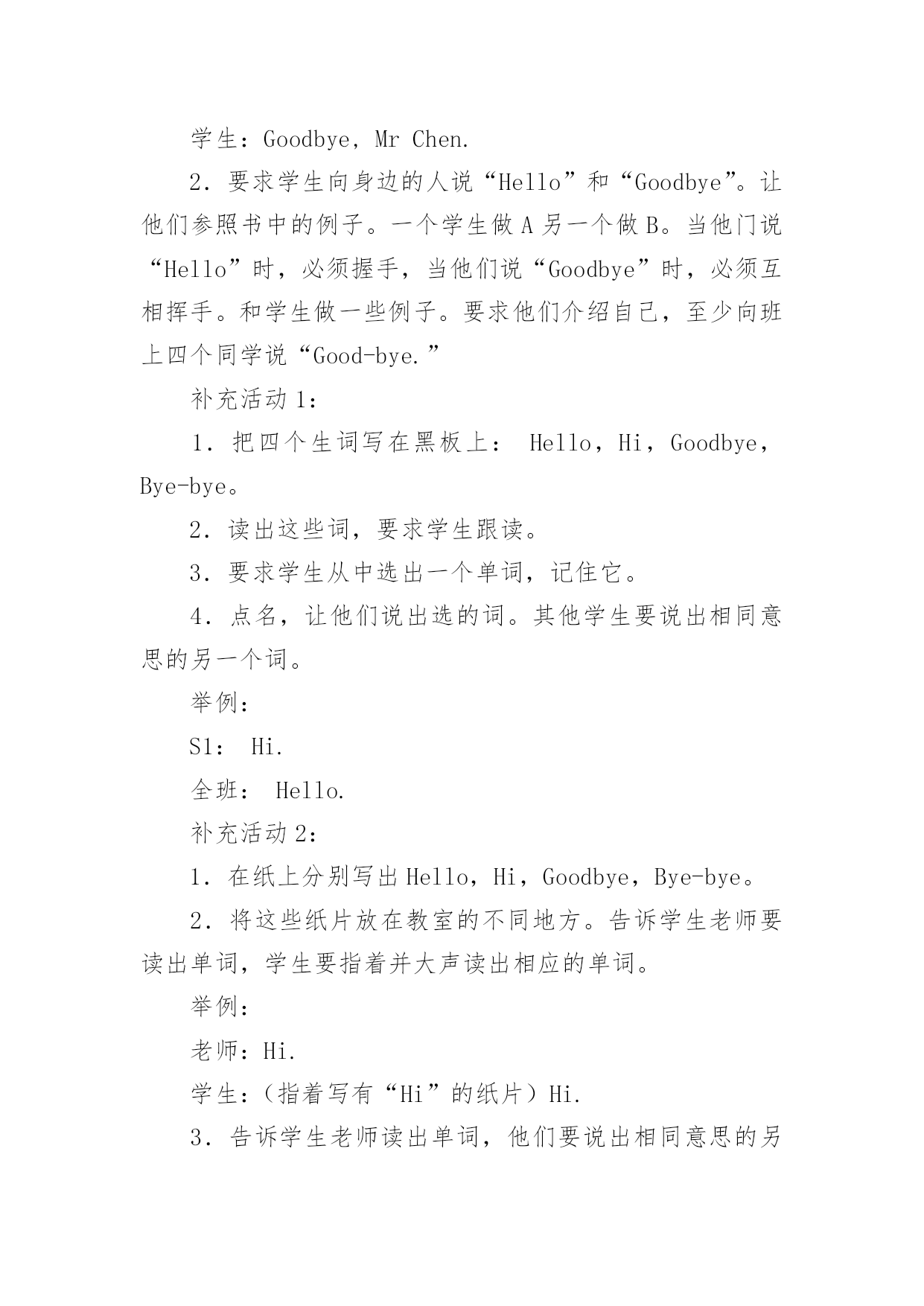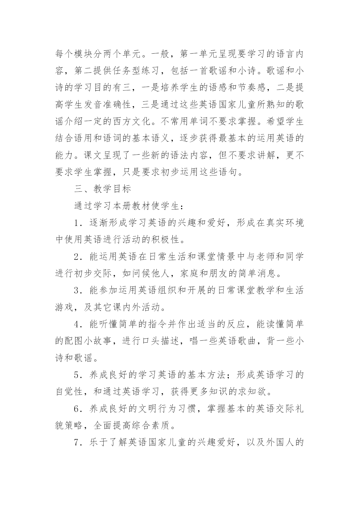 英语教学设计英语教学设计作为一名优秀的教育工作者,时常需要编写教学设计,教学设计是根据课程标准的要求和教学对象的特点,将教学诸要素有序安排,确定合适的教学方案的设想和计划。我们应该怎么写教学设计呢?下面是小编整理的英语教学设计,希望对大家有所帮助。英语教学设计1目标:1.教幼儿学会deskchair的正确发音,学会听懂短语standusitdown,clapyourhandsds。2.培养幼儿大胆说英语,对英语的浓厚兴趣。准备:桌子、凳子、一些幼儿喜爱的玩具,五角星,剪纸花。过程:1.老师和蔼向幼儿问好,(goodmonrningboysandgrils)。2.老师做寻找东西样,请幼儿猜老师在干什么?幼儿自由回答后,教师出示凳子、桌子,告诉幼儿他们的英文名是deskchair教幼儿先听音看口形发音。注意发准{k}。3.showme(deskchair)并发音。做法:室内藏有许多小凳子还有桌子,教师指幼儿说,幼儿指教师说练习发daskchair。4.游戏:九个凳子围成一圈,十个幼儿围成一圈站在凳子边,幼儿听音乐学小动物做动作的行走,音乐停幼儿打个凳子坐下,没抢到凳子的幼儿说deaskchair。5.游戏中同时练习发standup,sitdown。6.送礼物给幼儿。做法:桌子、凳子放许多玩具,五角星,剪纸花,幼儿想要什么就去拿什么,只要用deaskchair说一句正确的话就行。7、小结:向幼儿用英语再见goodby让幼儿拿上deask去户外游戏。英语教学设计2一、教学现状分析英语是中小学阶段的一门重要学科,而中小学阶段的教育属基础教育。基础教育阶段是人的终身教育和终身发展最重要的阶段。小学英语教学应努力为学生的终身发展奠定坚实的语言基础,从而使学生获得必须的英语语言能力和文化素质。以前学生未开设外语课,对外语充满了好奇与兴趣,对此教师要谨慎对待,并注意培养其兴趣,不要挫伤其积极性。小学生的水平参差不齐,需要注意照顾大多数学生。二、教材分析一册教材共同分为11个模块,内含一个期末分析模块。每个模块分两个单元。一般,第一单元呈现要学习的语言内容,第二提供任务型练习,包括一首歌谣和小诗。歌谣和小诗的学习目的有三,一是培养学生的语感和节奏感,二是提高学生发音准确性,三是通过这些英语国家儿童所熟知的歌谣介绍一定的西方文化。不常用单词不要求掌握。希望学生结合语用和语词的基本语义,逐步获得最基本的运用英语的能力。课文呈现了一些新的语法内容,但不要求讲解,更不要求学生掌握,只是要求初步运用这些语句。三、教学目标通过学习本册教材使学生:1.逐渐形成学习英语的兴趣和爱好,形成在真实环境中使用英语进行活动的积极性。2.能运用英语在日常生活和课堂情景中与老师和同学进行初步交际,如问候他人,家庭和朋友的简单消息。3.能参加运用英语组织和开展的日常课堂教学和生活游戏,及其它课内外活动。4.能听懂简单的指令并作出适当的反应,能读懂简单的配图小故事,进行口头描述,唱一些英语歌曲,背一些小诗和歌谣。5.养成良好的学习英语的基本方法;形成英语学习的自觉性,和通过英语学习,获得更多知识的求知欲。6.养成良好的文明行为习惯,掌握基本的英语交际礼貌策略,全面提高综合素质。7.乐于了解英语国家儿童的兴趣爱好,以及外国人的一般风俗习惯。四、提高教学质量的措施1.创造良好的学习气氛。2.在课堂上尽量的使用英语,适当使用汉语。3.合理确定教学要求。不要求学生自由地说出课文所有内容,甚至不要求能自由地朗读课文。4.纠正控制性错误,不纠正非控制性错误。5.多表扬多鼓励。6.利用录音带、多媒体教学课件、挂图等。五、教学进度第一周Module1Greetings第二周Module2Introductions第三周Module3Classroom第四周Module4Colours第五周Module5Numbers1-12第六周Rest第七周Module6School第八周MiddleReview第九周MiddleReview第十周Mid-termexamination第十一周Module7Birthday第十二周Module8Friends第十三周Module9Family第十四周Module10Body第十五周StoryTime第十六周ReviewModule第十七周Finalexamination12月以前完成全册教学任务。新标准外研版小学三年级英语上册教案Module1Unit1I’mSam准备导入:1.教师在走进教室时热情地向同学们打招呼说:Hello或Hi.与近处的同学握手,向远处的同学挥手。表扬那些用英语向师打招呼的同学说:Verygood!Welldone!或Cleverboy/girl!2.用英语告诉学生本人名字,说:I’mMrChen.并将名字写在黑板上。活动1:听音