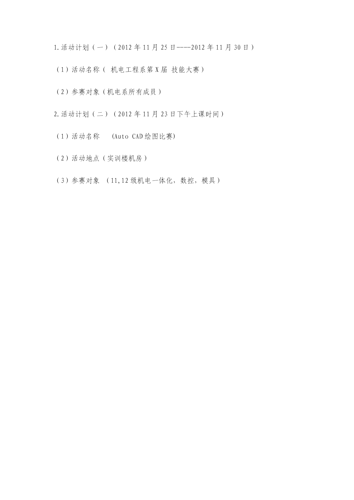 珠江学院机电系2012-2013年工作计划书走过了丰收、汗水与喜悦交加的11年。我们又踏上12年希望的旅途。回头看看那一串串一深一浅的脚印,我们团总支学生会更坚定我们前进的道路。2011年,经过全体同学的不懈努力,各部活动开展得有声有色,在各项大型活动和比赛中更是硕果累累。面对这些可喜的成绩,我们并不满足,我们紧记“胜不娇,败不馁”的古训,相信在面对12年的挑战和考验时,我们依然信心十足,精神百倍。团总支学生会,作为大学里的特殊组织,扮演着举足轻重的角色,它是领导、老师、学生沟通的桥梁,更是大学生活中的一支“雷锋队伍”,所以我们不仅要的是一支会做事、有耐心和有顽强一致精神凝聚力的队伍,更需要一个能为老师、同学服务的、具有创新精神的大学生风貌组织。我们也正朝这个目标迈进,新学期开始我们就开始对12年工作中存在的问题进行讨论分析解决,对取得成功的宝贵经验进行积累,并对传统的工作方法进行更新和改进,发扬我系的优良传统,为此我们要制定新学年的工作计划:一、招新计划时间(2012年9月26日-2012年10月11日)1.宣传,走班式宣传2.机电工程系学生会各部门(团总支,组织部,生活部,宣传部,办公室,外联部)共同宣传招新。3.面试内容(2012年9月27日(时间12:30点),2012年10月11日时间:21:00地点:综合楼420)(1)以自我介绍及现场提问的方式进行。(2)第一轮面试合格35个(具体事情具体分析,人数过多采用第二次面试)(3)以三周为考察期,以确定最终人数。二、活动计划1.活动计划(一)(2012年11月25日----2012年11月30日)(1)活动名称(机电工程系第X届技能大赛)(2)参赛对象(机电系所有成员)2.活动计划(二)(2012年11月23日下午上课时间)(1)活动名称(AutoCAD绘图比赛)(2)活动地点(实训楼机房)(3)参赛对象(11,12级机电一体化,数控,模具)