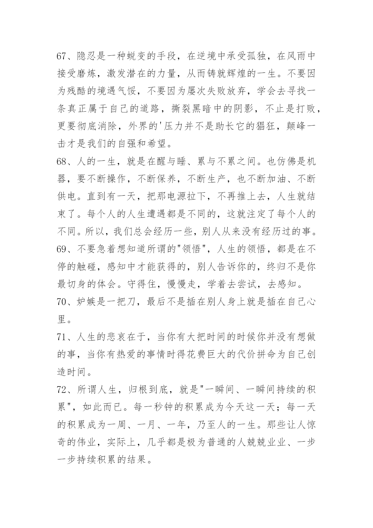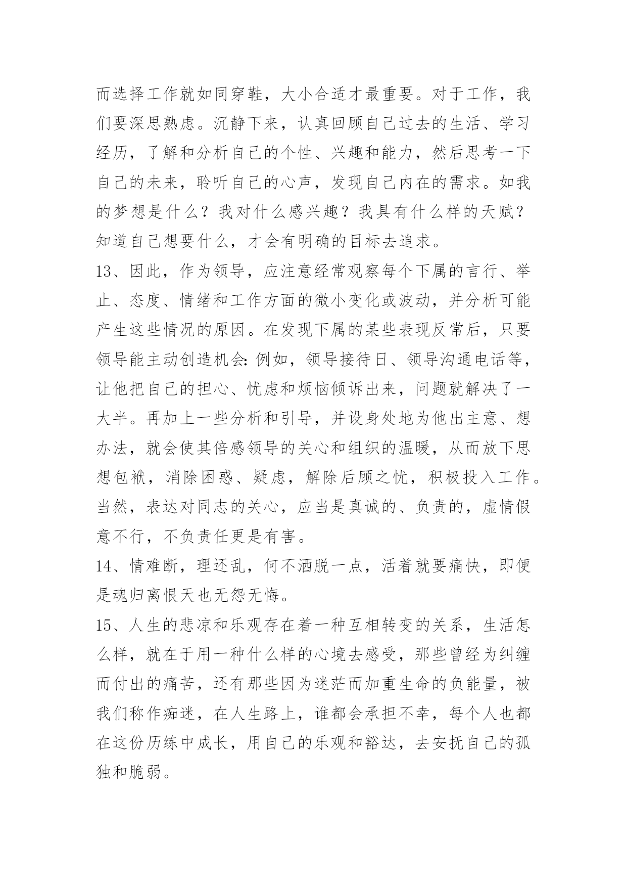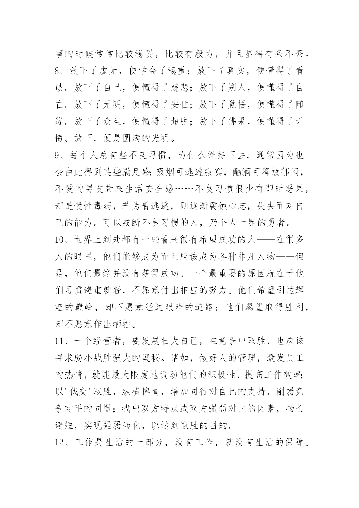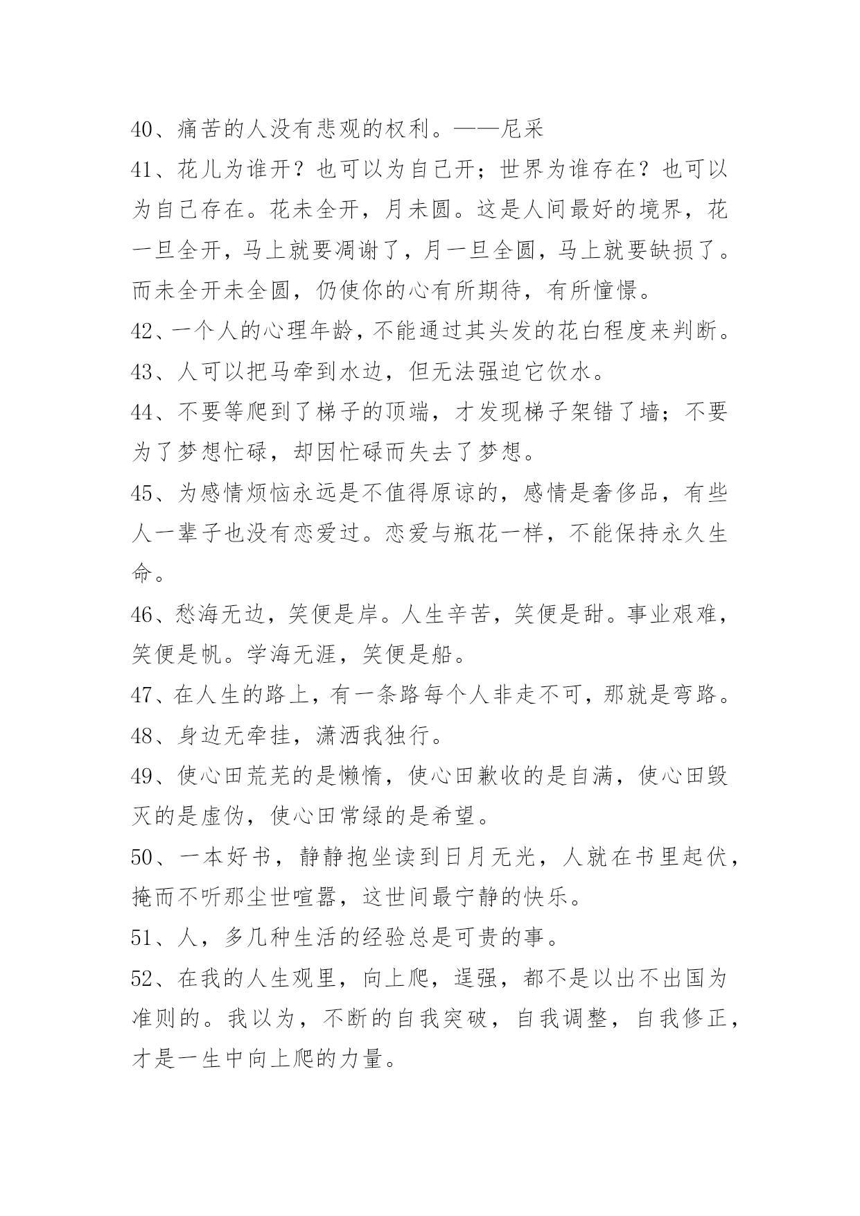 人生的哲理语录100条精选人生的哲理语录汇总100条真正的爱护并不是一味地讨好,而且在发现对方的缺点错误后,能真心指出来并帮助其改正,使之不断地完美起来。以下是小编为大家提供的人生的哲理语录100条,供各位参考。1、顽固的人总是那么自负,总觉得自己是对的,听不进任何人的意见,只有跌倒了才会恍然大悟。2、茶是流在记忆里的长河,将人生中的波澜,无论高昂与低沉,都敛收成杯碗中的静波,任你感慨,任你评说。3、我要在透明的火焰里,变得像灰烬一般轻松。4、千江有水千江月,万里无云万里天。让我们用生命中固有的顽强、抗争和韧性,打磨掉自身的浮躁和轻狂,打磨掉懒散和消沉,还一份深沉、持重、克制。5、妄念虽多,如云海奔涌而无根。念佛纵弱,如片石屹立而不移。6、幽默是能够在社交场合发挥出巨大作用的。就算你不能随心所欲地运用幽默的技巧,也应该在生活中尽量让自己幽默一些,那么你会发现自己的社交生活变得不一样。7、整齐干净的办公桌:这种办公桌相当的干净、整齐,任何的东东都被安排得井井有条,拥有这样办公桌的主人大多给人一种重视秩序,脚踏实地,值得信赖的感觉。(她)做事的时候常常比较稳妥,比较有毅力,并且显得有条不紊。8、放下了虚无,便学会了稳重;放下了真实,便懂得了看破。放下了自己,便懂得了慈悲;放下了别人,便懂得了自在。放下了无明,便懂得了安住;放下了觉悟,便懂得了随缘。放下了众生,便懂得了超脱;放下了佛果,便懂得了无悔。放下,便是圆满的光明。9、每个人总有些不良习惯,为什么维持下去,通常因为也会由此得到某些满足感:吸烟可逃避寂寞,酗酒可释放郁闷,不爱的男友带来生活安全感……不良习惯很少有即时恶果,却是慢性毒药,若为着逃避,则逐渐腐蚀心志,失去面对自己的能力。可以戒断不良习惯的人,乃个人世界的勇者。10、世界上到处都有一些看来很有希望成功的人——在很多人的眼里,他们能够成为而且应该成为各种非凡人物——但是,他们最终并没有获得成功。一个最重要的原因就在于他们习惯避重就轻,不愿意付出相应的努力。他们希望到达辉煌的巅峰,却不愿意经过艰难的道路;他们渴望取得胜利,却不愿意作出牺牲。11、一个经营者,要发展壮大自己,在竞争中取胜,也应该寻求弱小战胜强大的奥秘。诸如,做好人的管理,激发员工的热情,就能最大限度地调动他们的积极性,提高工作效率;以"伐交"取胜,纵横捭阖,增加同行对自己的支持,削弱竞争对手的同盟;找出双方特点或双方强弱对比的因素,扬长避短,实现强弱转化,以达到取胜的目的。12、工作是生活的一部分,没有工作,就没有生活的保障。而选择工作就如同穿鞋,大小合适才最重要。对于工作,我们要深思熟虑。沉静下来,认真回顾自己过去的生活、学习经历,了解和分析自己的个性、兴趣和能力,然后思考一下自己的未来,聆听自己的心声,发现自己内在的需求。如我的梦想是什么?我对什么感兴趣?我具有什么样的天赋?知道自己想要什么,才会有明确的目标去追求。13、因此,作为领导,应注意经常观察每个下属的言行、举止、态度、情绪和工作方面的微小变化或波动,并分析可能产生这些情况的原因。在发现下属的某些表现反常后,只要领导能主动创造机会:例如,领导接待日、领导沟通电话等,让他把自己的担心、忧虑和烦恼倾诉出来,问题就解决了一大半。再加上一些分析和引导,并设身处地为他出主意、想办法,就会使其倍感领导的关心和组织的温暖,从而放下思想包袱,消除困惑、疑虑,解除后顾之忧,积极投入工作。当然,表达对同志的关心,应当是真诚的、负责的,虚情假意不行,不负责任更是有害。14、情难断,理还乱,何不洒脱一点,活着就要痛快,即便是魂归离恨天也无怨无悔。15、人生的悲凉和乐观存在着一种互相转变的关系,生活怎么样,就在于用一种什么样的心境去感受,那些曾经为纠缠而付出的痛苦,还有那些因为迷茫而加重生命的负能量,被我们称作痴迷,在人生路上,谁都会承担不幸,每个人也都在这份历练中成长,用自己的乐观和豁达,去安抚自己的孤独和脆弱。16、越向往光明,越要默默地扎根于黑暗。17、有时一人独坐,其实并不寂寞。只想自己待会儿,别人却想太多。18、只有充分相信自己,才有决心去摆脱磨难,证明自己不是一个弱者。19、有多少繁花满枝,就会有多少秋叶零落;有多少明媚向阳,就会有多少阴雨成灾;走过的灿烂,终究会有一些寂寞来偿还;爱过的时光,始终会用一些回忆填满。人生若之如初见,旖旎了多少小心轻放的光阴,给寻常的日子馈赠了多少柔情?如果你爱上了一个人,请一定要温柔对待他,因为爱,或许就那么一次。20、想看什么就去看,想做什么就去做,想去哪里就去;凡事心有所想,必定身体力行。21、最快乐的人并不是拥有最好的东西,它们只是充分地利用了身边所有的资源。22、插上"两个翅膀":一个叫理想,一个叫毅力。如果一个人有了这"两个翅膀",他就能飞得高,飞得远。23、糊