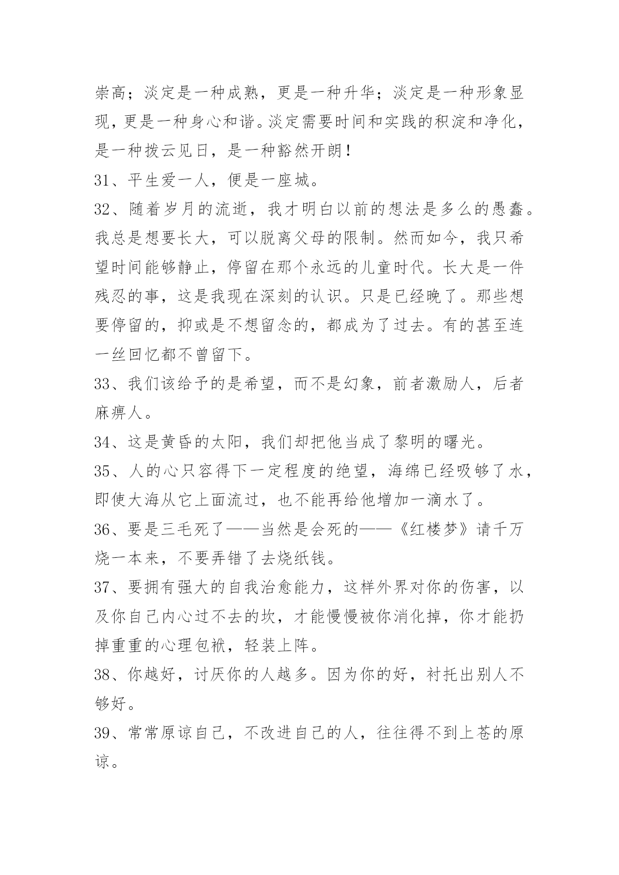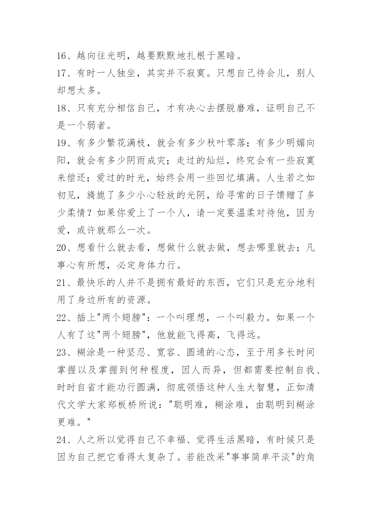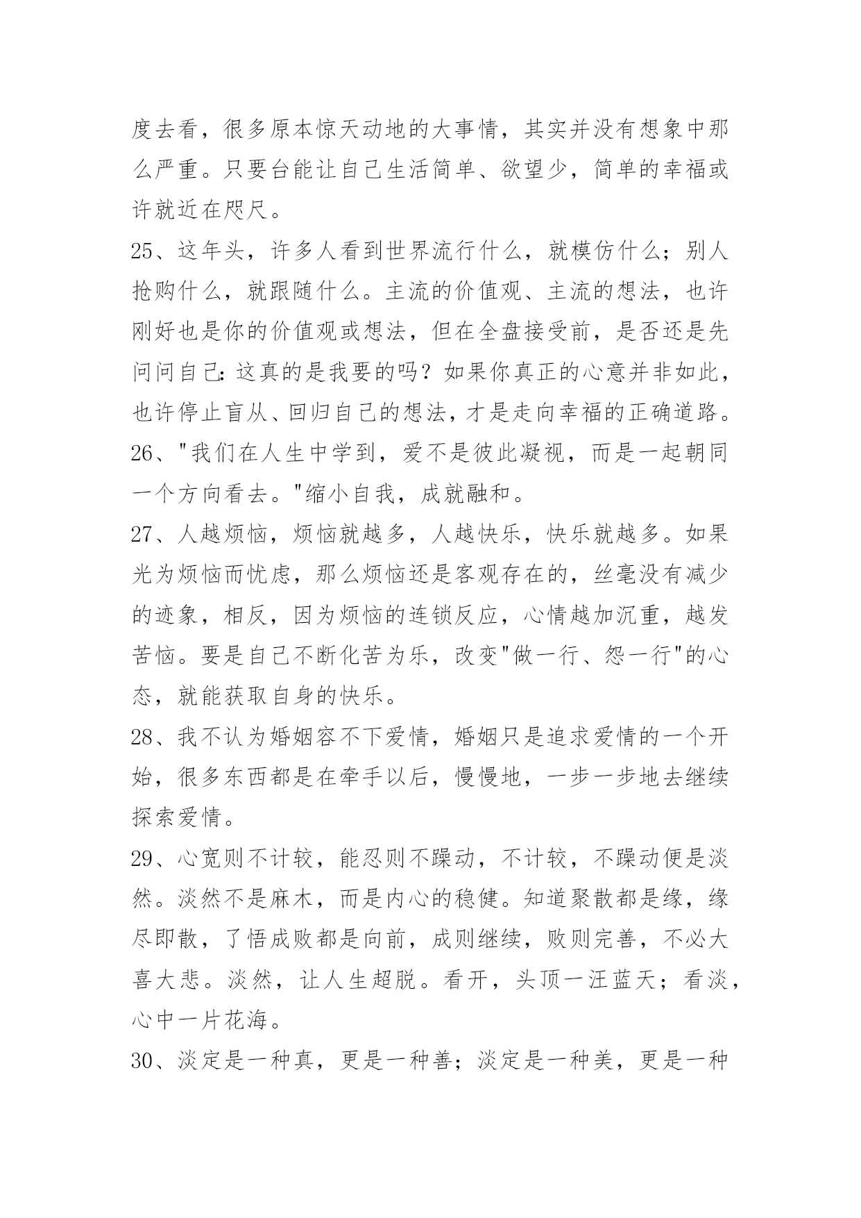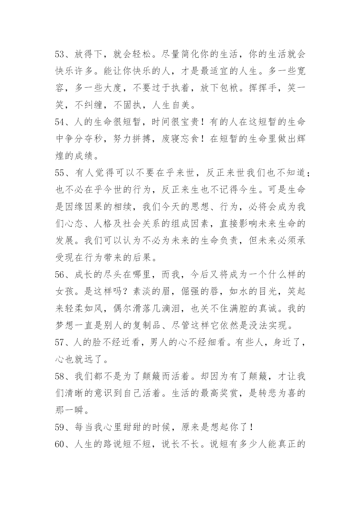 人生的哲理语录100条精选人生的哲理语录汇总100条真正的爱护并不是一味地讨好,而且在发现对方的缺点错误后,能真心指出来并帮助其改正,使之不断地完美起来。以下是小编为大家提供的人生的哲理语录100条,供各位参考。1、顽固的人总是那么自负,总觉得自己是对的,听不进任何人的意见,只有跌倒了才会恍然大悟。2、茶是流在记忆里的长河,将人生中的波澜,无论高昂与低沉,都敛收成杯碗中的静波,任你感慨,任你评说。3、我要在透明的火焰里,变得像灰烬一般轻松。4、千江有水千江月,万里无云万里天。让我们用生命中固有的顽强、抗争和韧性,打磨掉自身的浮躁和轻狂,打磨掉懒散和消沉,还一份深沉、持重、克制。5、妄念虽多,如云海奔涌而无根。念佛纵弱,如片石屹立而不移。6、幽默是能够在社交场合发挥出巨大作用的。就算你不能随心所欲地运用幽默的技巧,也应该在生活中尽量让自己幽默一些,那么你会发现自己的社交生活变得不一样。7、整齐干净的办公桌:这种办公桌相当的干净、整齐,任何的东东都被安排得井井有条,拥有这样办公桌的主人大多给人一种重视秩序,脚踏实地,值得信赖的感觉。(她)做事的时候常常比较稳妥,比较有毅力,并且显得有条不紊。8、放下了虚无,便学会了稳重;放下了真实,便懂得了看破。放下了自己,便懂得了慈悲;放下了别人,便懂得了自在。放下了无明,便懂得了安住;放下了觉悟,便懂得了随缘。放下了众生,便懂得了超脱;放下了佛果,便懂得了无悔。放下,便是圆满的光明。9、每个人总有些不良习惯,为什么维持下去,通常因为也会由此得到某些满足感:吸烟可逃避寂寞,酗酒可释放郁闷,不爱的男友带来生活安全感……不良习惯很少有即时恶果,却是慢性毒药,若为着逃避,则逐渐腐蚀心志,失去面对自己的能力。可以戒断不良习惯的人,乃个人世界的勇者。10、世界上到处都有一些看来很有希望成功的人——在很多人的眼里,他们能够成为而且应该成为各种非凡人物——但是,他们最终并没有获得成功。一个最重要的原因就在于他们习惯避重就轻,不愿意付出相应的努力。他们希望到达辉煌的巅峰,却不愿意经过艰难的道路;他们渴望取得胜利,却不愿意作出牺牲。11、一个经营者,要发展壮大自己,在竞争中取胜,也应该寻求弱小战胜强大的奥秘。诸如,做好人的管理,激发员工的热情,就能最大限度地调动他们的积极性,提高工作效率;以"伐交"取胜,纵横捭阖,增加同行对自己的支持,削弱竞争对手的同盟;找出双方特点或双方强弱对比的因素,扬长避短,实现强弱转化,以达到取胜的目的。12、工作是生活的一部分,没有工作,就没有生活的保障。而选择工作就如同穿鞋,大小合适才最重要。对于工作,我们要深思熟虑。沉静下来,认真回顾自己过去的生活、学习经历,了解和分析自己的个性、兴趣和能力,然后思考一下自己的未来,聆听自己的心声,发现自己内在的需求。如我的梦想是什么?我对什么感兴趣?我具有什么样的天赋?知道自己想要什么,才会有明确的目标去追求。13、因此,作为领导,应注意经常观察每个下属的言行、举止、态度、情绪和工作方面的微小变化或波动,并分析可能产生这些情况的原因。在发现下属的某些表现反常后,只要领导能主动创造机会:例如,领导接待日、领导沟通电话等,让他把自己的担心、忧虑和烦恼倾诉出来,问题就解决了一大半。再加上一些分析和引导,并设身处地为他出主意、想办法,就会使其倍感领导的关心和组织的温暖,从而放下思想包袱,消除困惑、疑虑,解除后顾之忧,积极投入工作。当然,表达对同志的关心,应当是真诚的、负责的,虚情假意不行,不负责任更是有害。14、情难断,理还乱,何不洒脱一点,活着就要痛快,即便是魂归离恨天也无怨无悔。15、人生的悲凉和乐观存在着一种互相转变的关系,生活怎么样,就在于用一种什么样的心境去感受,那些曾经为纠缠而付出的痛苦,还有那些因为迷茫而加重生命的负能量,被我们称作痴迷,在人生路上,谁都会承担不幸,每个人也都在这份历练中成长,用自己的乐观和豁达,去安抚自己的孤独和脆弱。16、越向往光明,越要默默地扎根于黑暗。17、有时一人独坐,其实并不寂寞。只想自己待会儿,别人却想太多。18、只有充分相信自己,才有决心去摆脱磨难,证明自己不是一个弱者。19、有多少繁花满枝,就会有多少秋叶零落;有多少明媚向阳,就会有多少阴雨成灾;走过的灿烂,终究会有一些寂寞来偿还;爱过的时光,始终会用一些回忆填满。人生若之如初见,旖旎了多少小心轻放的光阴,给寻常的日子馈赠了多少柔情?如果你爱上了一个人,请一定要温柔对待他,因为爱,或许就那么一次。20、想看什么就去看,想做什么就去做,想去哪里就去;凡事心有所想,必定身体力行。21、最快乐的人并不是拥有最好的东西,它们只是充分地利用了身边所有的资源。22、插上"两个翅膀":一个叫理想,一个叫毅力。如果一个人有了这"两个翅膀",他就能飞得高,飞得远。23、糊