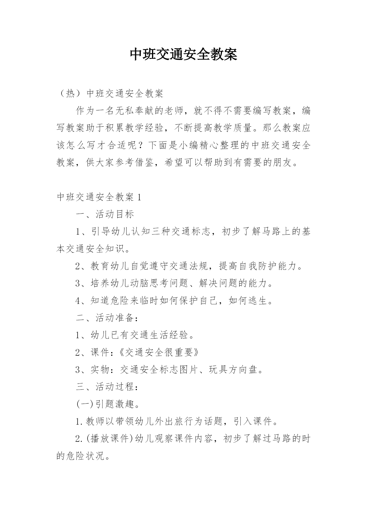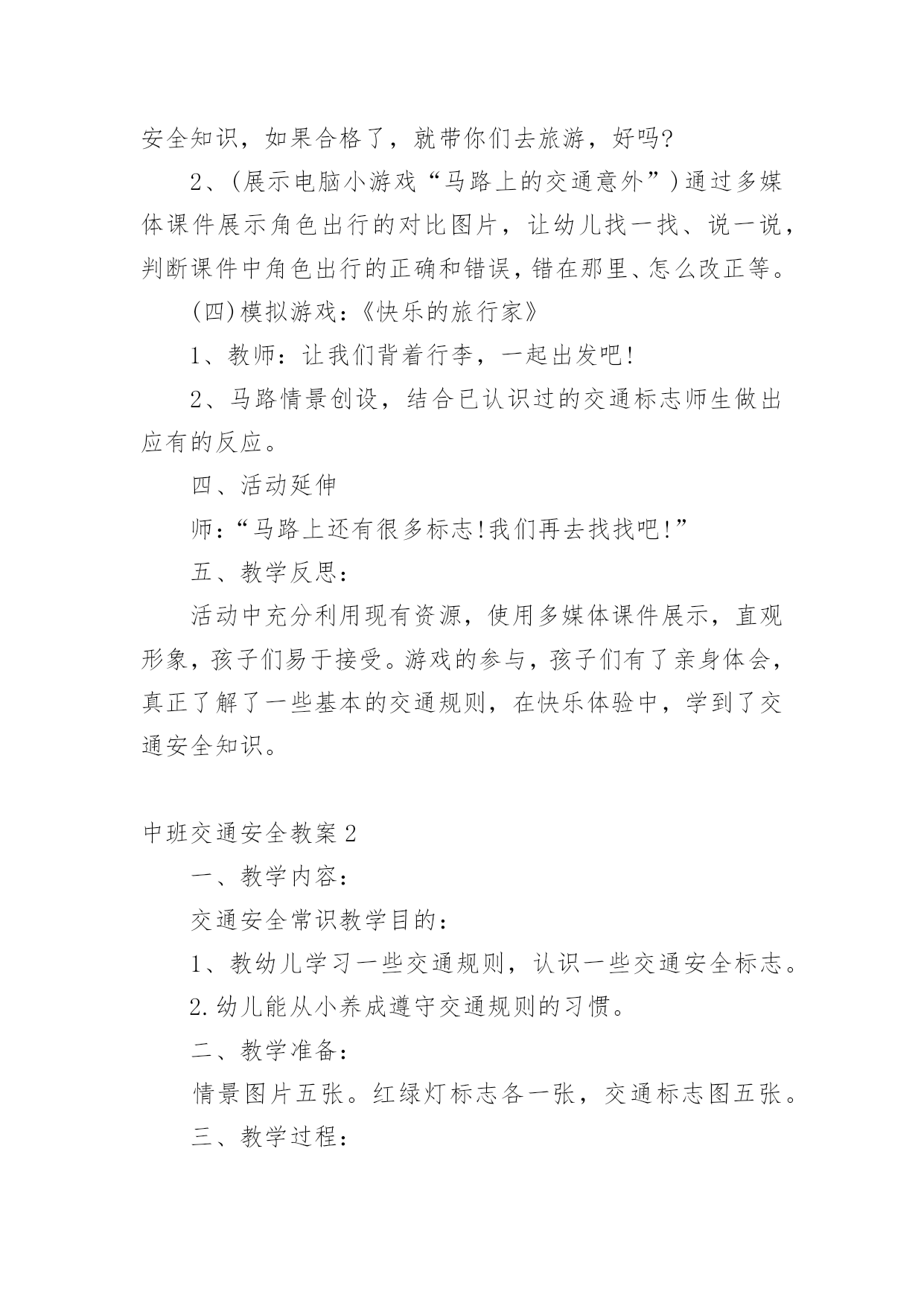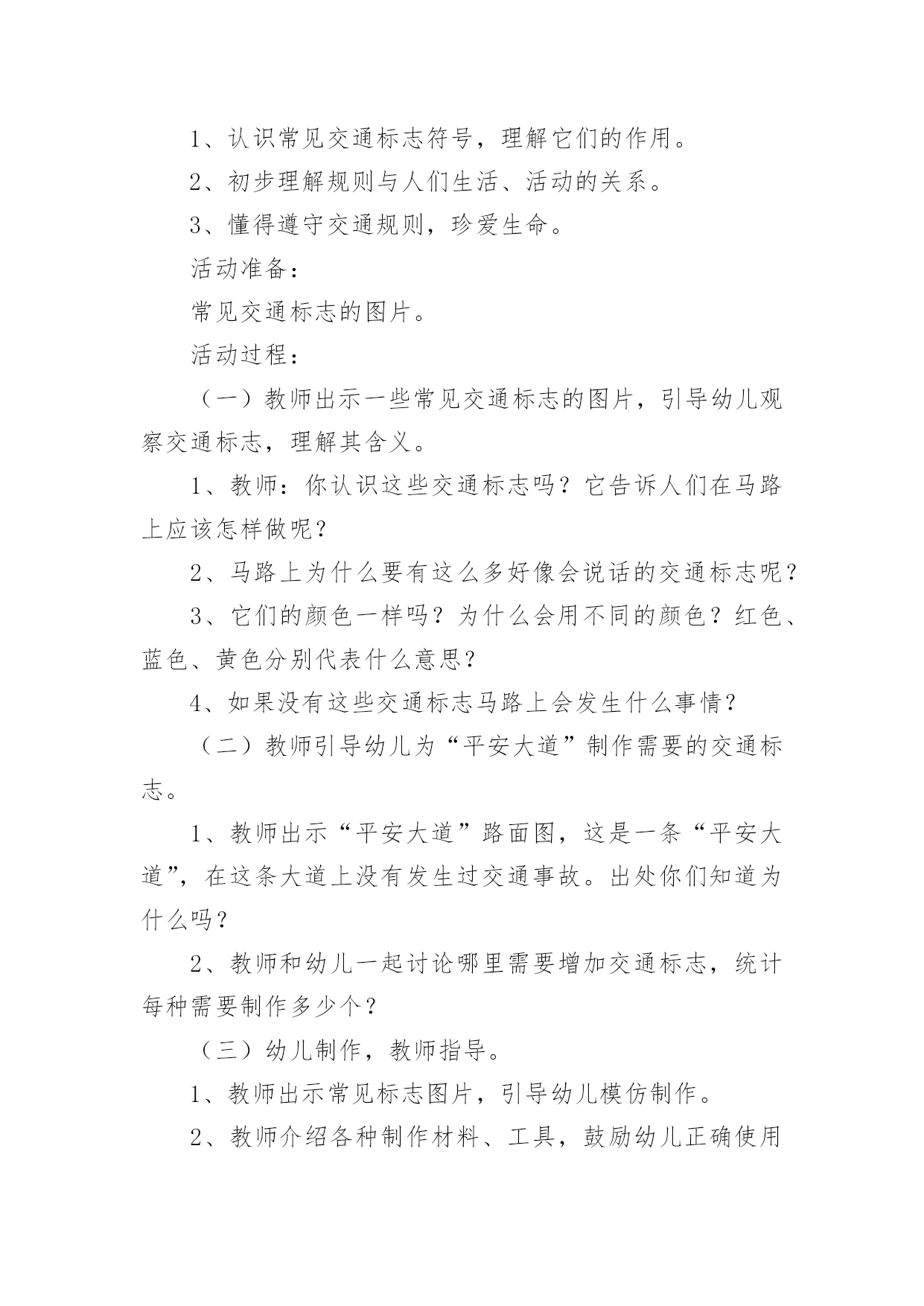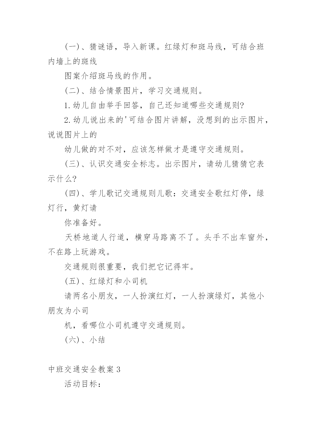 中班交通安全教案(热)中班交通安全教案作为一名无私奉献的老师,就不得不需要编写教案,编写教案助于积累教学经验,不断提高教学质量。那么教案应该怎么写才合适呢?下面是小编精心整理的中班交通安全教案,供大家参考借鉴,希望可以帮助到有需要的朋友。中班交通安全教案1一、活动目标1、引导幼儿认知三种交通标志,初步了解马路上的基本交通安全知识。2、教育幼儿自觉遵守交通法规,提高自我防护能力。3、培养幼儿动脑思考问题、解决问题的能力。4、知道危险来临时如何保护自己,如何逃生。二、活动准备:1、幼儿已有交通生活经验。2、课件:《交通安全很重要》3、实物:交通安全标志图片、玩具方向盘。三、活动过程:(一)引题激趣。1.教师以带领幼儿外出旅行为话题,引入课件。2.(播放课件)幼儿观察课件内容,初步了解过马路的时的危险状况。3.通过课件,引出“熊猫博士”这一交通出行的专家,带领幼儿学习交通安全知识。(二)观察讨论。1、(播放课件)幼儿观察、认识马路上的红绿灯、人行道。提问:这是什么地方?怎样过去才安全?2、认识常见的三种交通安全标志。出示标志:禁止行人通行、人行横道、步行街三种人行交通标志,让幼儿学习认识并了解它们的作用。3、危险案例分析(出示课件)(1)组织幼儿观察翻越栏、路边玩耍、横穿马路等危险行为,引导幼儿讨论:这样做对吗?为什么?应该怎样做?(2)教师小结。4.乘车安全要注意(1)幼儿自由讨论有关乘车的`安全。(2)请个别幼儿说一说乘车时应做什么?不能做什么?播放课件:小朋友把头伸到窗户外看风景。提问:这样乘车好不好?为什么?他该怎么做?播放课件:小朋友在出租车上随便开门。提问:他这样做对吗?为什么?他该怎么做?(3)小结:乘车时要坐在座位上,不能四处走动,并系好安全带,不能随手把垃圾从窗户扔到外面,不能把头、手伸出车外……(三)体验互动。1、师:熊猫博士要考考你们是不是都掌握了这些交通安全知识,如果合格了,就带你们去旅游,好吗?2、(展示电脑小游戏“马路上的交通意外”)通过多媒体课件展示角色出行的对比图片,让幼儿找一找、说一说,判断课件中角色出行的正确和错误,错在那里、怎么改正等。(四)模拟游戏:《快乐的旅行家》1、教师:让我们背着行李,一起出发吧!2、马路情景创设,结合已认识过的交通标志师生做出应有的反应。四、活动延伸师:“马路上还有很多标志!我们再去找找吧!”五、教学反思:活动中充分利用现有资源,使用多媒体课件展示,直观形象,孩子们易于接受。游戏的参与,孩子们有了亲身体会,真正了解了一些基本的交通规则,在快乐体验中,学到了交通安全知识。中班交通安全教案2一、教学内容:交通安全常识教学目的:1、教幼儿学习一些交通规则,认识一些交通安全标志。2.幼儿能从小养成遵守交通规则的习惯。二、教学准备:情景图片五张。红绿灯标志各一张,交通标志图五张。三、教学过程:(一)、猜谜语,导入新课。红绿灯和斑马线,可结合班内墙上的斑线图案介绍斑马线的作用。(二)、结合情景图片,学习交通规则。1.幼儿自由举手回答,自己还知道哪些交通规则?2.幼儿说出来的'可结合图片讲解,没想到的出示图片,说说图片上的幼儿做的对不对,应该怎样做才是遵守交通规则。(三)、认识交通安全标志。出示图片,请幼儿猜猜它表示什么?(四)、学儿歌记交通规则儿歌:交通安全歌红灯停,绿灯行,黄灯请你准备好。天桥地道人行道,横穿马路离不了。头手不出车窗外,不在路上玩游戏。交通规则很重要,我们把它记得牢。(五)、红绿灯和小司机请两名小朋友,一人扮演红灯,一人扮演绿灯,其他小朋友为小司机,看哪位小司机遵守交通规则。(六)、小结中班交通安全教案3活动目标:1、认识常见交通标志符号,理解它们的作用。2、初步理解规则与人们生活、活动的关系。3、懂得遵守交通规则,珍爱生命。活动准备:常见交通标志的图片。活动过程:(一)教师出示一些常见交通标志的图片,引导幼儿观察交通标志,理解其含义。1、教师:你认识这些交通标志吗?它告诉人们在马路上应该怎样做呢?2、马路上为什么要有这么多好像会说话的交通标志呢?3、它们的颜色一样吗?为什么会用不同的颜色?红色、蓝色、黄色分别代表什么意思?4、如果没有这些交通标志马路上会发生什么事情?(二)教师引导幼儿为“平安大道”制作需要的交通标志。1、教师出示“平安大道”路面图,这是一条“平安大道”,在这条大道上没有发生过交通事故。出处你们知道为什么吗?2、教师和幼儿一起讨论哪里需要增加交通标志,统计每种需要制作多少个?(三)幼儿制作,教师指导。1、教师出示常见标志图片,引导幼儿模仿制作。2、教师介绍各种制作材料、工具,鼓励幼儿正确使用各种材料进行制作。(四)引导幼儿把制作好的交通标志摆放在“平安大道”上。在摆放的过程中引导幼儿巩固对交通标志的认识。1、分组请幼儿摆放交通标志,并请幼儿说