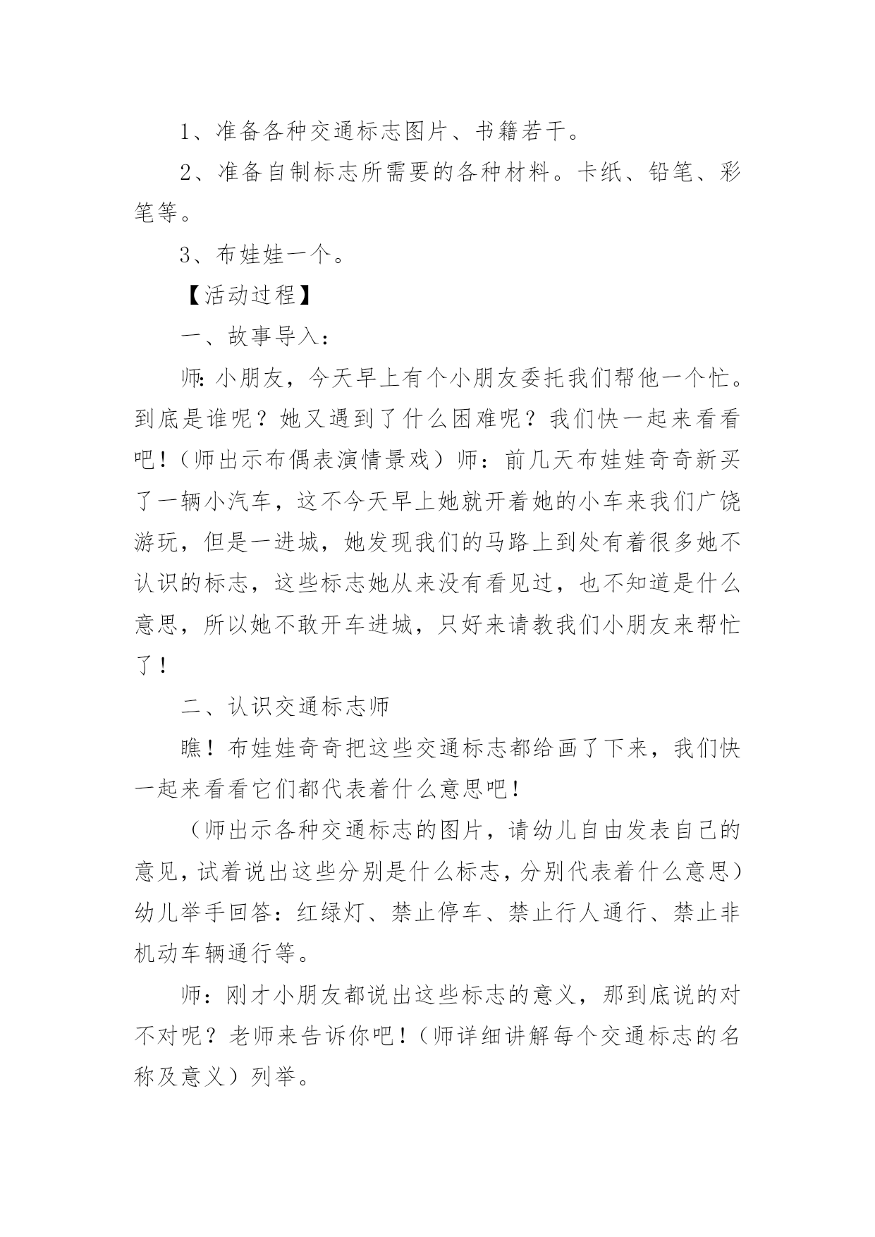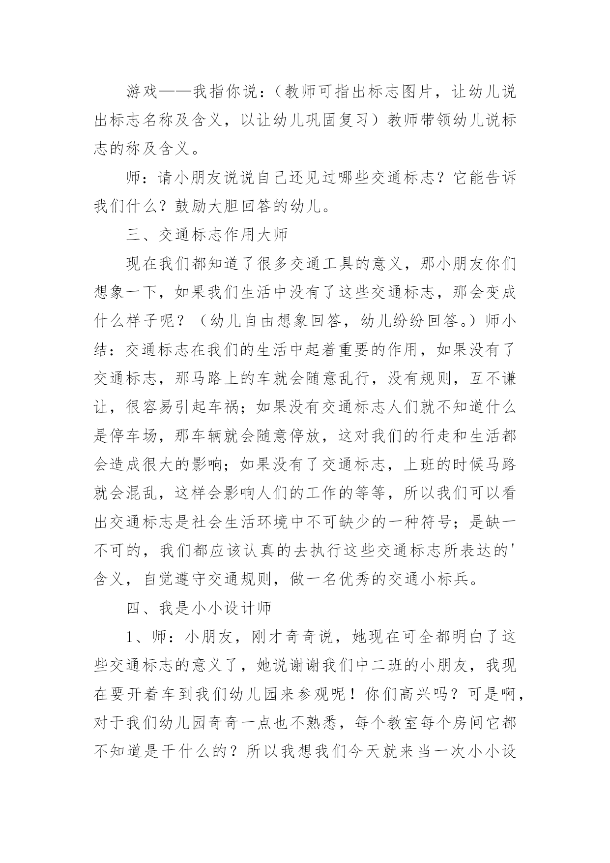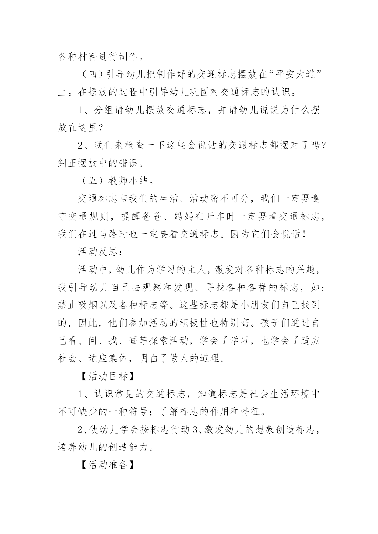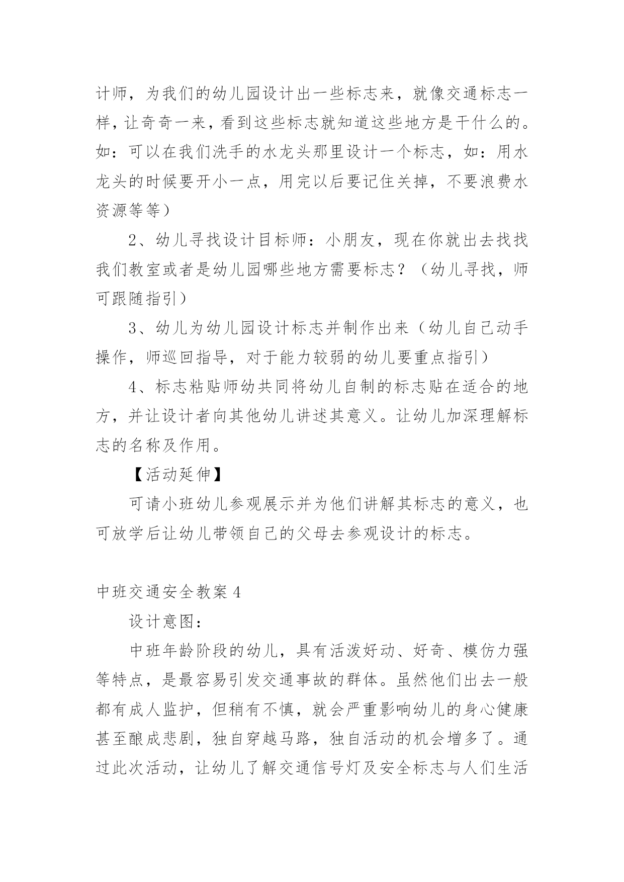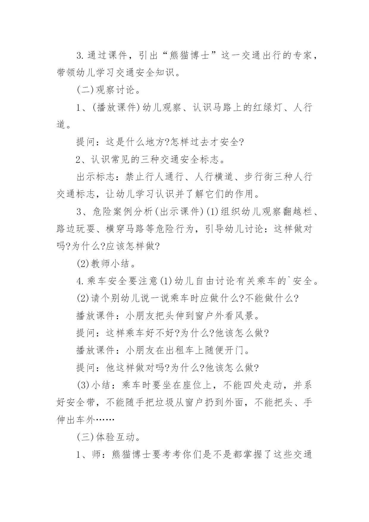 中班交通安全教案(热)中班交通安全教案作为一名无私奉献的老师,就不得不需要编写教案,编写教案助于积累教学经验,不断提高教学质量。那么教案应该怎么写才合适呢?下面是小编精心整理的中班交通安全教案,供大家参考借鉴,希望可以帮助到有需要的朋友。中班交通安全教案1一、活动目标1、引导幼儿认知三种交通标志,初步了解马路上的基本交通安全知识。2、教育幼儿自觉遵守交通法规,提高自我防护能力。3、培养幼儿动脑思考问题、解决问题的能力。4、知道危险来临时如何保护自己,如何逃生。二、活动准备:1、幼儿已有交通生活经验。2、课件:《交通安全很重要》3、实物:交通安全标志图片、玩具方向盘。三、活动过程:(一)引题激趣。1.教师以带领幼儿外出旅行为话题,引入课件。2.(播放课件)幼儿观察课件内容,初步了解过马路的时的危险状况。3.通过课件,引出“熊猫博士”这一交通出行的专家,带领幼儿学习交通安全知识。(二)观察讨论。1、(播放课件)幼儿观察、认识马路上的红绿灯、人行道。提问:这是什么地方?怎样过去才安全?2、认识常见的三种交通安全标志。出示标志:禁止行人通行、人行横道、步行街三种人行交通标志,让幼儿学习认识并了解它们的作用。3、危险案例分析(出示课件)(1)组织幼儿观察翻越栏、路边玩耍、横穿马路等危险行为,引导幼儿讨论:这样做对吗?为什么?应该怎样做?(2)教师小结。4.乘车安全要注意(1)幼儿自由讨论有关乘车的`安全。(2)请个别幼儿说一说乘车时应做什么?不能做什么?播放课件:小朋友把头伸到窗户外看风景。提问:这样乘车好不好?为什么?他该怎么做?播放课件:小朋友在出租车上随便开门。提问:他这样做对吗?为什么?他该怎么做?(3)小结:乘车时要坐在座位上,不能四处走动,并系好安全带,不能随手把垃圾从窗户扔到外面,不能把头、手伸出车外……(三)体验互动。1、师:熊猫博士要考考你们是不是都掌握了这些交通安全知识,如果合格了,就带你们去旅游,好吗?2、(展示电脑小游戏“马路上的交通意外”)通过多媒体课件展示角色出行的对比图片,让幼儿找一找、说一说,判断课件中角色出行的正确和错误,错在那里、怎么改正等。(四)模拟游戏:《快乐的旅行家》1、教师:让我们背着行李,一起出发吧!2、马路情景创设,结合已认识过的交通标志师生做出应有的反应。四、活动延伸师:“马路上还有很多标志!我们再去找找吧!”五、教学反思:活动中充分利用现有资源,使用多媒体课件展示,直观形象,孩子们易于接受。游戏的参与,孩子们有了亲身体会,真正了解了一些基本的交通规则,在快乐体验中,学到了交通安全知识。中班交通安全教案2一、教学内容:交通安全常识教学目的:1、教幼儿学习一些交通规则,认识一些交通安全标志。2.幼儿能从小养成遵守交通规则的习惯。二、教学准备:情景图片五张。红绿灯标志各一张,交通标志图五张。三、教学过程:(一)、猜谜语,导入新课。红绿灯和斑马线,可结合班内墙上的斑线图案介绍斑马线的作用。(二)、结合情景图片,学习交通规则。1.幼儿自由举手回答,自己还知道哪些交通规则?2.幼儿说出来的'可结合图片讲解,没想到的出示图片,说说图片上的幼儿做的对不对,应该怎样做才是遵守交通规则。(三)、认识交通安全标志。出示图片,请幼儿猜猜它表示什么?(四)、学儿歌记交通规则儿歌:交通安全歌红灯停,绿灯行,黄灯请你准备好。天桥地道人行道,横穿马路离不了。头手不出车窗外,不在路上玩游戏。交通规则很重要,我们把它记得牢。(五)、红绿灯和小司机请两名小朋友,一人扮演红灯,一人扮演绿灯,其他小朋友为小司机,看哪位小司机遵守交通规则。(六)、小结中班交通安全教案3活动目标:1、认识常见交通标志符号,理解它们的作用。2、初步理解规则与人们生活、活动的关系。3、懂得遵守交通规则,珍爱生命。活动准备:常见交通标志的图片。活动过程:(一)教师出示一些常见交通标志的图片,引导幼儿观察交通标志,理解其含义。1、教师:你认识这些交通标志吗?它告诉人们在马路上应该怎样做呢?2、马路上为什么要有这么多好像会说话的交通标志呢?3、它们的颜色一样吗?为什么会用不同的颜色?红色、蓝色、黄色分别代表什么意思?4、如果没有这些交通标志马路上会发生什么事情?(二)教师引导幼儿为“平安大道”制作需要的交通标志。1、教师出示“平安大道”路面图,这是一条“平安大道”,在这条大道上没有发生过交通事故。出处你们知道为什么吗?2、教师和幼儿一起讨论哪里需要增加交通标志,统计每种需要制作多少个?(三)幼儿制作,教师指导。1、教师出示常见标志图片,引导幼儿模仿制作。2、教师介绍各种制作材料、工具,鼓励幼儿正确使用各种材料进行制作。(四)引导幼儿把制作好的交通标志摆放在“平安大道”上。在摆放的过程中引导幼儿巩固对交通标志的认识。1、分组请幼儿摆放交通标志,并请幼儿说