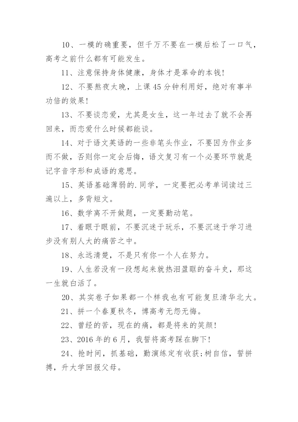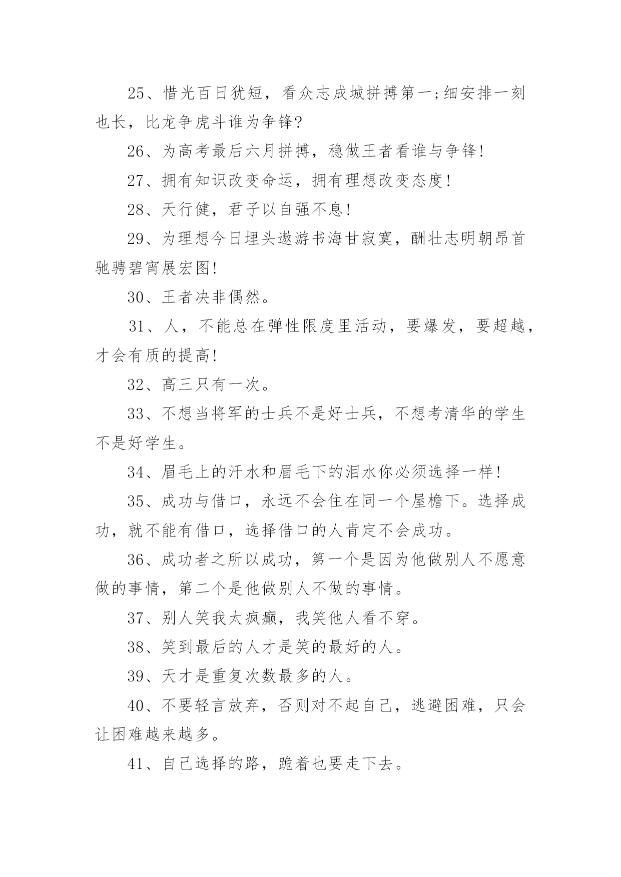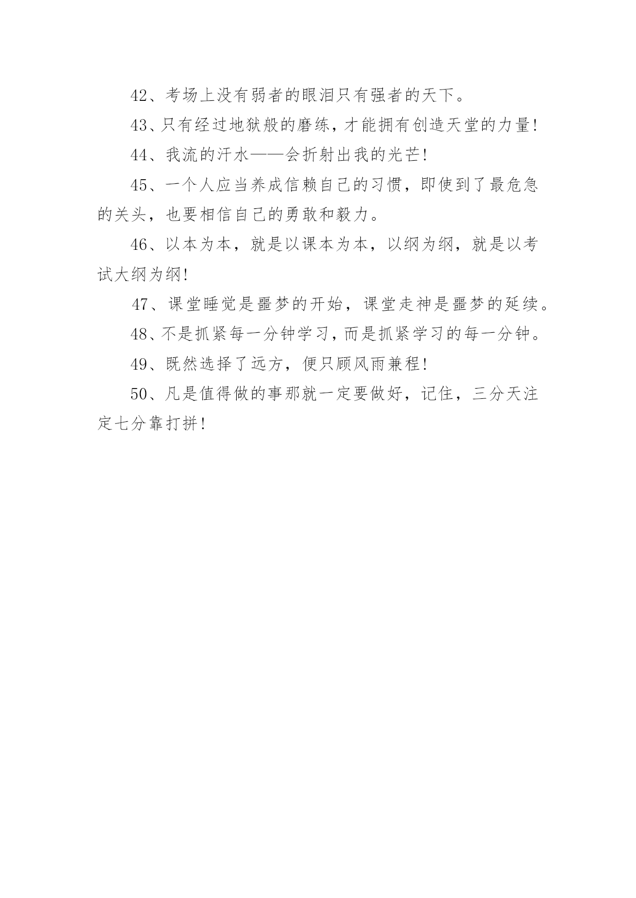高考励志语录高考励志语录汇集面对高考,你是充满动力还是带着迷茫?不管你现在的成绩如何,你都应该看看这50个伟大理由!奋斗吧,小宇宙!燃烧吧,小宇宙!下面是小编帮大家整理的高考励志语录,希望大家喜欢。1、有的时候你会感到很绝望,但不放弃是攻克困难的最好方法!2、千万不要心存侥幸的心理,想着自己的强项一定能弥补弱项,高考时什么情况都能发生,你的弱项会使你未战先败!3、不要看不起老师的一些复习方法,紧跟老师的复习计划去学习是最好的复习方法!4、坚信你的对手也一样会感到很疲惫。5、不管作业有多少,都要按时完成,而且都要有质量的完成。切记,认真且有思考的完成一套卷,比走马观花的完成十套卷有用的多。7、不管你的老师如何,学着喜欢他,这样有助于你对他所教的科目的学习。8、不要以为到高三下学期学习还来得及,下学期几乎就是模拟考的天下。9、就是到了最疲惫的时候都不要放弃,否则前功尽弃。10、一模的确重要,但千万不要在一模后松了一口气,高考之前什么都有可能发生。11、注意保持身体健康,身体才是革命的本钱!12、不要熬夜太晚,上课45分钟利用好,绝对有事半功倍的效果!13、不要谈恋爱,尤其是女生,这一年过去了就不会再回来,而恋爱什么时候都能谈。14、对于语文英语的一些非笔头作业,不要因为作业多而不做,否则你一定会后悔,语文复习有一个必要环节就是记字音字形和成语的意思。15、英语基础薄弱的.同学,一定要把必考单词读过三遍以上,多背短文。16、数学离不开做题,一定要勤动笔。17、着眼于眼前,不要沉迷于玩乐,不要沉迷于学习进步没有别人大的痛苦之中。18、永远清楚,不是只有你一个人在努力。19、人生若没有一段想起来就热泪盈眶的奋斗史,那这一生就白活了。20、其实卷子如果都一个样我也有可能复旦清华北大。21、拼一个春夏秋冬,博高考无怨无悔。22、曾经的苦,现在的痛,都是将来的笑颜!23、2016年的6月,我誓将高考踩在脚下!24、抢时间,抓基础,勤演练定有收获;树自信,誓拼搏,升大学回报父母。25、惜光百日犹短,看众志成城拼搏第一;细安排一刻也长,比龙争虎斗谁为争锋?26、为高考最后六月拼搏,稳做王者看谁与争锋!27、拥有知识改变命运,拥有理想改变态度!28、天行健,君子以自强不息!29、为理想今日埋头遨游书海甘寂寞,酬壮志明朝昂首驰骋碧宵展宏图!30、王者决非偶然。31、人,不能总在弹性限度里活动,要爆发,要超越,才会有质的提高!32、高三只有一次。33、不想当将军的士兵不是好士兵,不想考清华的学生不是好学生。34、眉毛上的汗水和眉毛下的泪水你必须选择一样!35、成功与借口,永远不会住在同一个屋檐下。选择成功,就不能有借口,选择借口的人肯定不会成功。36、成功者之所以成功,第一个是因为他做别人不愿意做的事情,第二个是他做别人不做的事情。37、别人笑我太疯癫,我笑他人看不穿。38、笑到最后的人才是笑的最好的人。39、天才是重复次数最多的人。40、不要轻言放弃,否则对不起自己,逃避困难,只会让困难越来越多。41、自己选择的路,跪着也要走下去。42、考场上没有弱者的眼泪只有强者的天下。43、只有经过地狱般的磨练,才能拥有创造天堂的力量!44、我流的汗水——会折射出我的光芒!45、一个人应当养成信赖自己的习惯,即使到了最危急的关头,也要相信自己的勇敢和毅力。46、以本为本,就是以课本为本,以纲为纲,就是以考试大纲为纲!47、课堂睡觉是噩梦的开始,课堂走神是噩梦的延续。48、不是抓紧每一分钟学习,而是抓紧学习的每一分钟。49、既然选择了远方,便只顾风雨兼程!50、凡是值得做的事那就一定要做好,记住,三分天注定七分靠打拼!