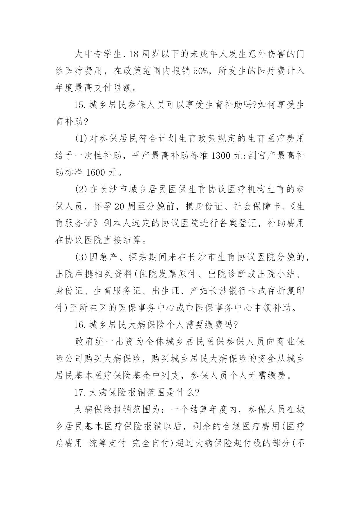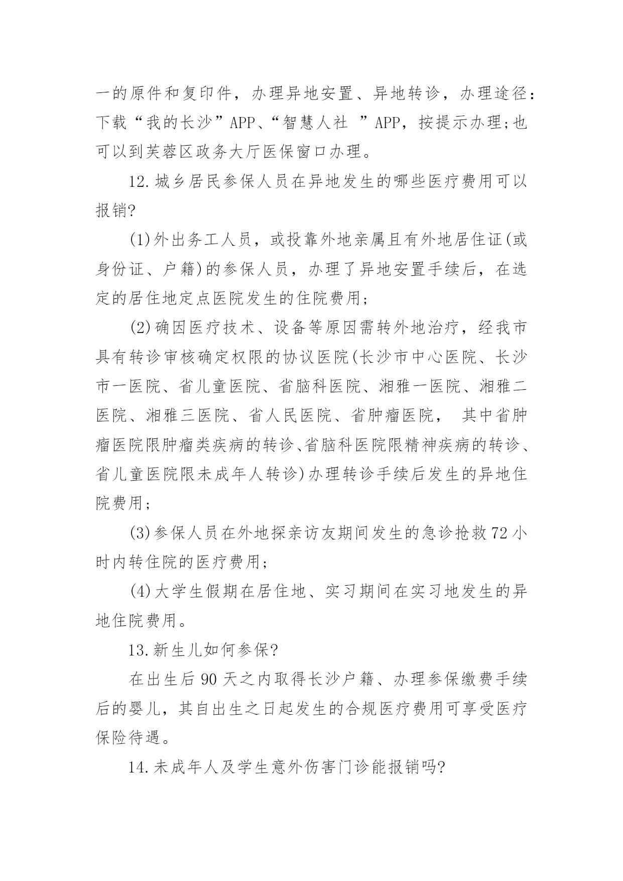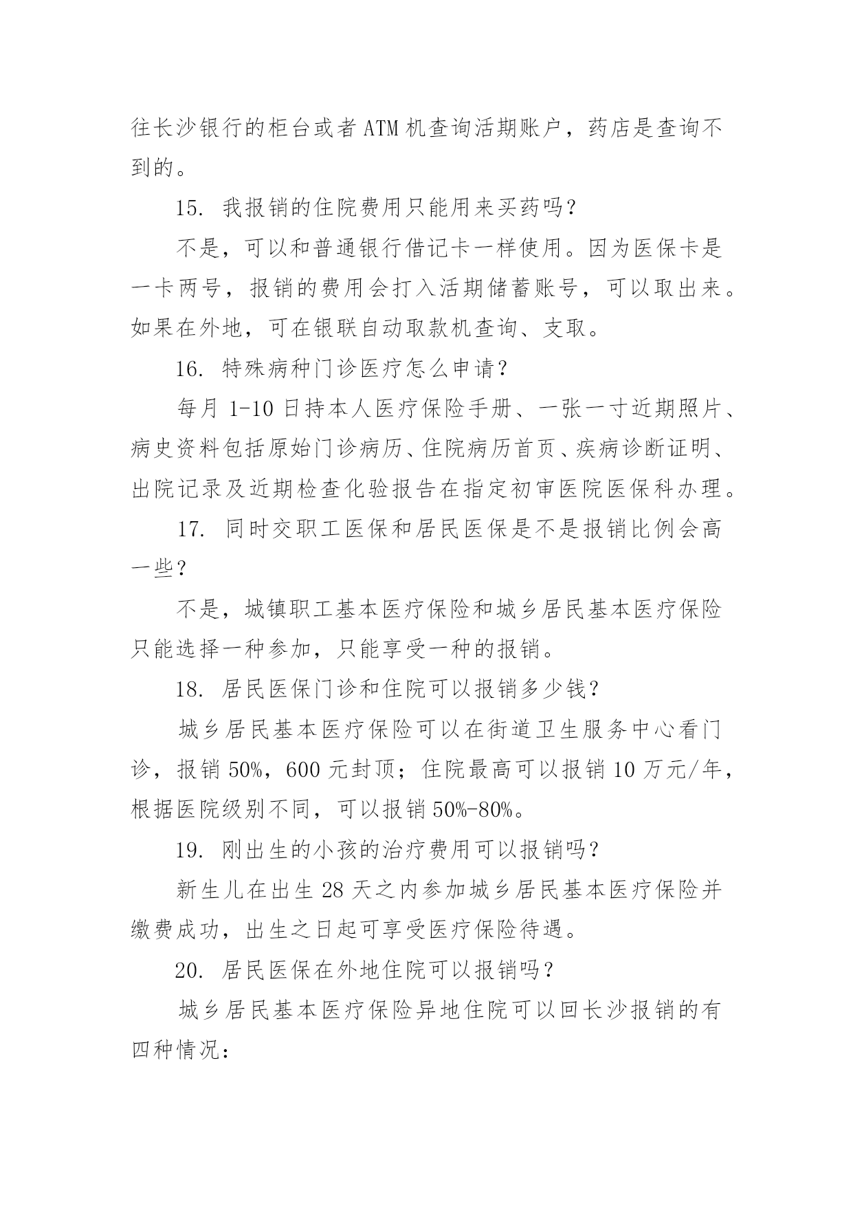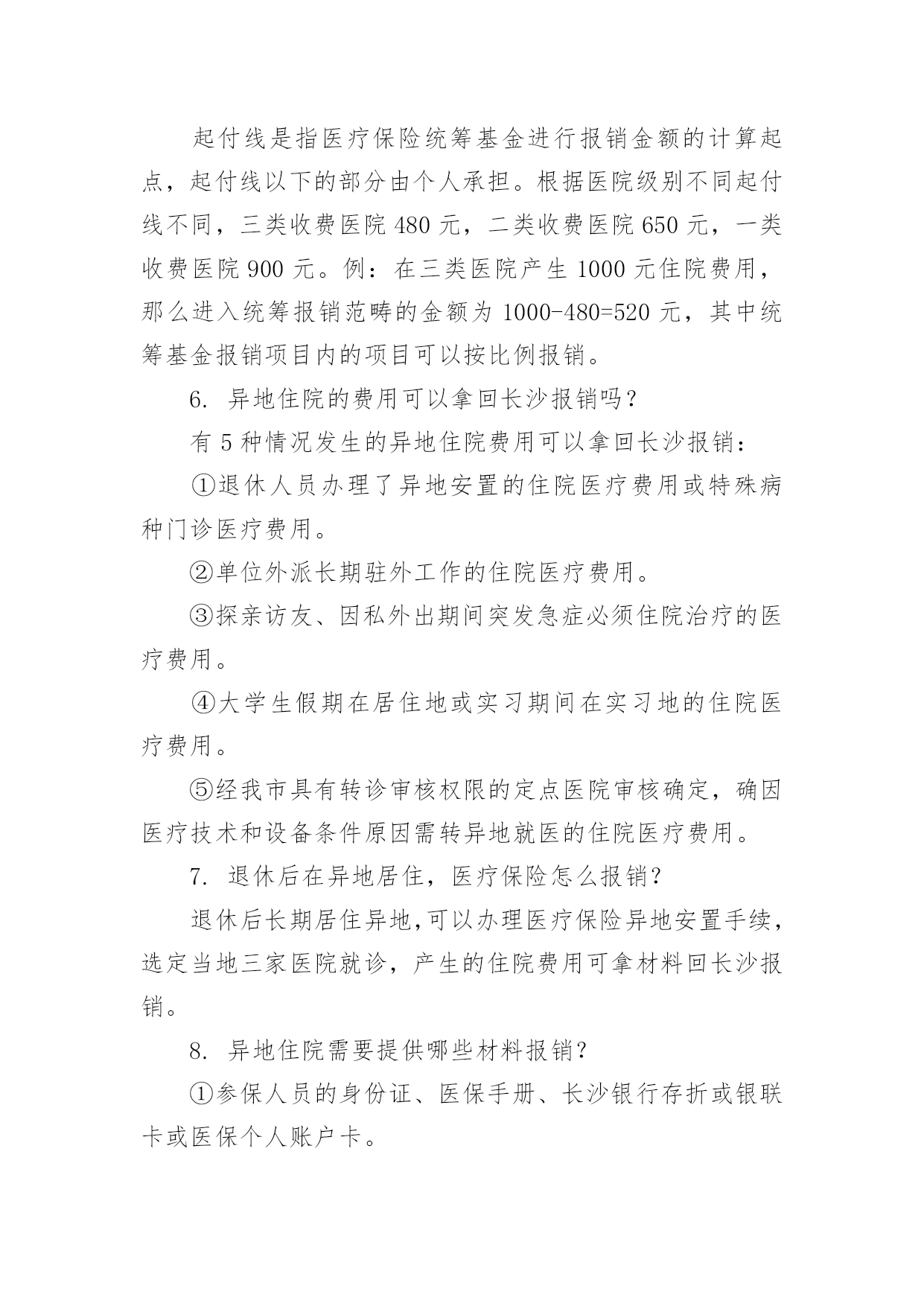 湖南长沙医疗保险问答关于湖南长沙医疗保险问答对于长沙医疗保险常见问题解答的内容,最近很多人很困惑,下面是小编为大家收集的关于湖南长沙医疗保险问答,欢迎大家借鉴与参考,希望对大家有所帮助。1.办理医保缴费后何时可以享受医保待遇?从缴费成功的次月起就可以享受医保待遇。2.医疗保险断交三个月以后会清零吗?医疗保险是按累积缴费年限来计算的,永远不会清零。断交三个月以上只不过是连续缴费年限会中断,会影响报销的最高额度,对医保账户和医保年限没有影响。3.我自己买的医保,欠费了,突然住院了,还能报销吗?灵活就业医保欠费,可以在“灵活就业缴费”窗口打印缴费单,在银行缴费成功后,来我局1111房间办理紧急开通,还可以享受报销。欠费在3个月以内,该年度内自付比例提高10%。欠费3个月以上,该年度内自付比例提高15%。4.住院最高的报销额度是多少?基本医保基金最高支付限额8万元,超过8万元的部分进入大病医疗互助基金支付范畴,大病医疗互助基金最高支付限额12万元。5.住院报销的起付线是什么意思?起付线是指医疗保险统筹基金进行报销金额的计算起点,起付线以下的部分由个人承担。根据医院级别不同起付线不同,三类收费医院480元,二类收费医院650元,一类收费医院900元。例:在三类医院产生1000元住院费用,那么进入统筹报销范畴的金额为1000-480=520元,其中统筹基金报销项目内的项目可以按比例报销。6.异地住院的费用可以拿回长沙报销吗?有5种情况发生的异地住院费用可以拿回长沙报销:①退休人员办理了异地安置的住院医疗费用或特殊病种门诊医疗费用。②单位外派长期驻外工作的住院医疗费用。③探亲访友、因私外出期间突发急症必须住院治疗的医疗费用。④大学生假期在居住地或实习期间在实习地的住院医疗费用。⑤经我市具有转诊审核权限的定点医院审核确定,确因医疗技术和设备条件原因需转异地就医的住院医疗费用。7.退休后在异地居住,医疗保险怎么报销?退休后长期居住异地,可以办理医疗保险异地安置手续,选定当地三家医院就诊,产生的住院费用可拿材料回长沙报销。8.异地住院需要提供哪些材料报销?①参保人员的身份证、医保手册、长沙银行存折或银联卡或医保个人账户卡。②有效医疗费用原始票据、医疗费用汇总清单、出院疾病诊断证明书或出院小结、医院级别证明(均须加盖医院公章)。③县级以下区、乡镇、街道卫生院、厂矿职工医院住院的还需提供:长期医嘱、临时医嘱复印件。(加盖医院公章)④因私外出急诊住院的还需提供:入院记录或急诊病历。(加盖医院公章)⑤经授权定点医院办理了转诊手续的住院还需提供:转诊转治审批单(授权定点医院医保科和医务科盖章)。⑥因意外伤害住院还需提供:1、入院记录、急诊病历。2、证明材料:需由本人写出书面报告将意外伤受伤的经过、时间、地点详细记录,报告上留两个证明人姓名及联系电话。⑦有住院前72小时内发生的不间断的急诊抢救医疗费用的还需提供:急诊留观病历。⑧经连续急诊抢救无效死亡的医疗费用还需提供:急诊留观病历、死亡证明复印件及家属关系证明(由当地派出所出示)。9.医疗保险中断了需要补缴吗?从2011年4月1日起医疗保险是不能中断的,因此从2011年4月1日开始必须连续缴费,其他时间段可自愿选择是否补缴。10.小孩的医疗费用可以用父母的医保报销吗?不可以,参保人的医疗保险只可以给本人使用,不可以用于他人。11.我的医保卡每个月的钱都是我自己交的吗?职工医保每个月划账由两个部分组成:①个人划入部分2%全部划入;②单位划入部分:45岁以下的划入0.7%;45岁以上未到退休年龄的划入1.2%;退休的划入4%。例:年龄25岁,缴费基数为2265元,每个月划入医保卡的有自己交的2%即2265×0.02=45.3元;单位交的0.7%即2265×0.007=15.86,因此每个月医保卡有45.3+15.86=61.16元。1.灵活就业退休,医保卡每个月多少钱?以上年度市政府发布的社会保险缴费基数的60%为个人账户划入基数。例:2012年基数为2960元,即每月应发个人账户金额=2960元×60%=71.04元13.为什么医保卡划账上半年和下半年的钱不一样?医保卡的划账跟医保缴费基数紧密相关,缴费基数是上年度的社平工资,而这一标准由湖南省统计局每年8月份公布。因此每年1-7月份的基数只是一个暂定基数,到了8月份才进行调整,因此医保卡划账才会出现上半年和下半年金额不一致的情况。14.我保险的住院费用如何查询?在提交资料后,会收到一张回执单,20个工作日后,前往长沙银行的柜台或者ATM机查询活期账户,药店是查询不到的。15.我报销的住院费用只能用来买药吗?不是,可以和普通银行借记卡一样使用。因为医保卡是一卡两号,报销的费用会打入活期储蓄账号,可以取出来。如果在外地,可在银联自动取款机查询、支取。16.特