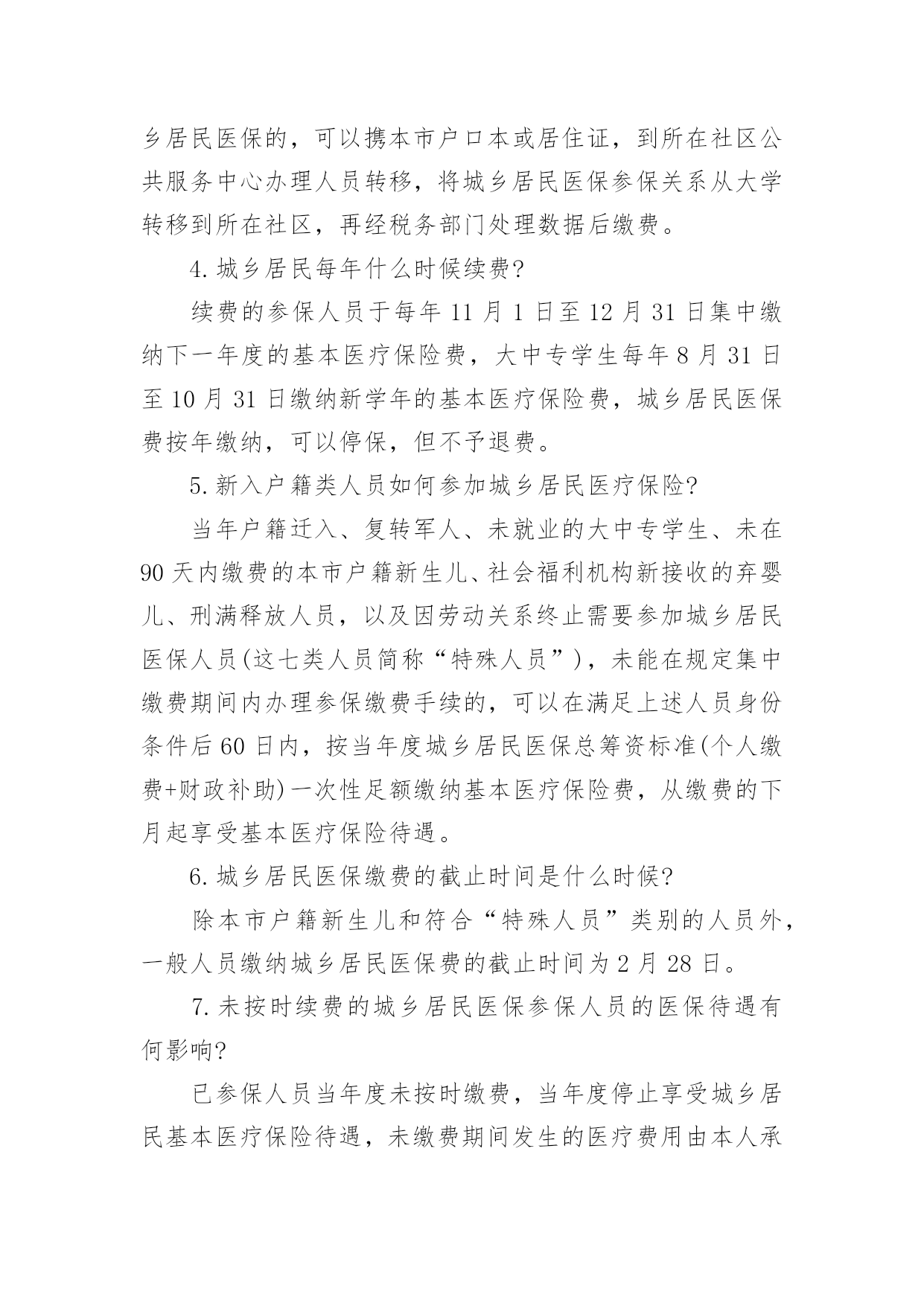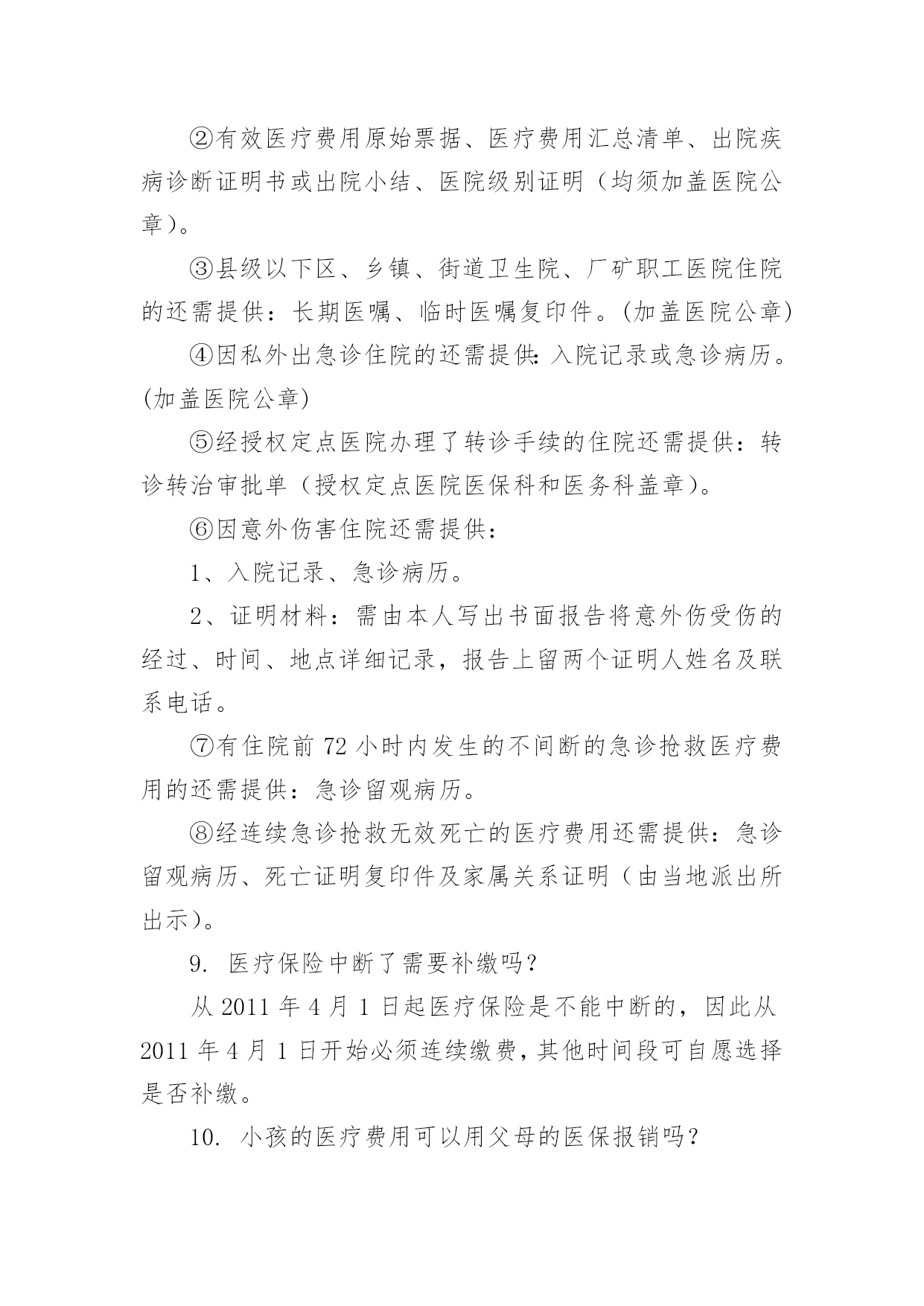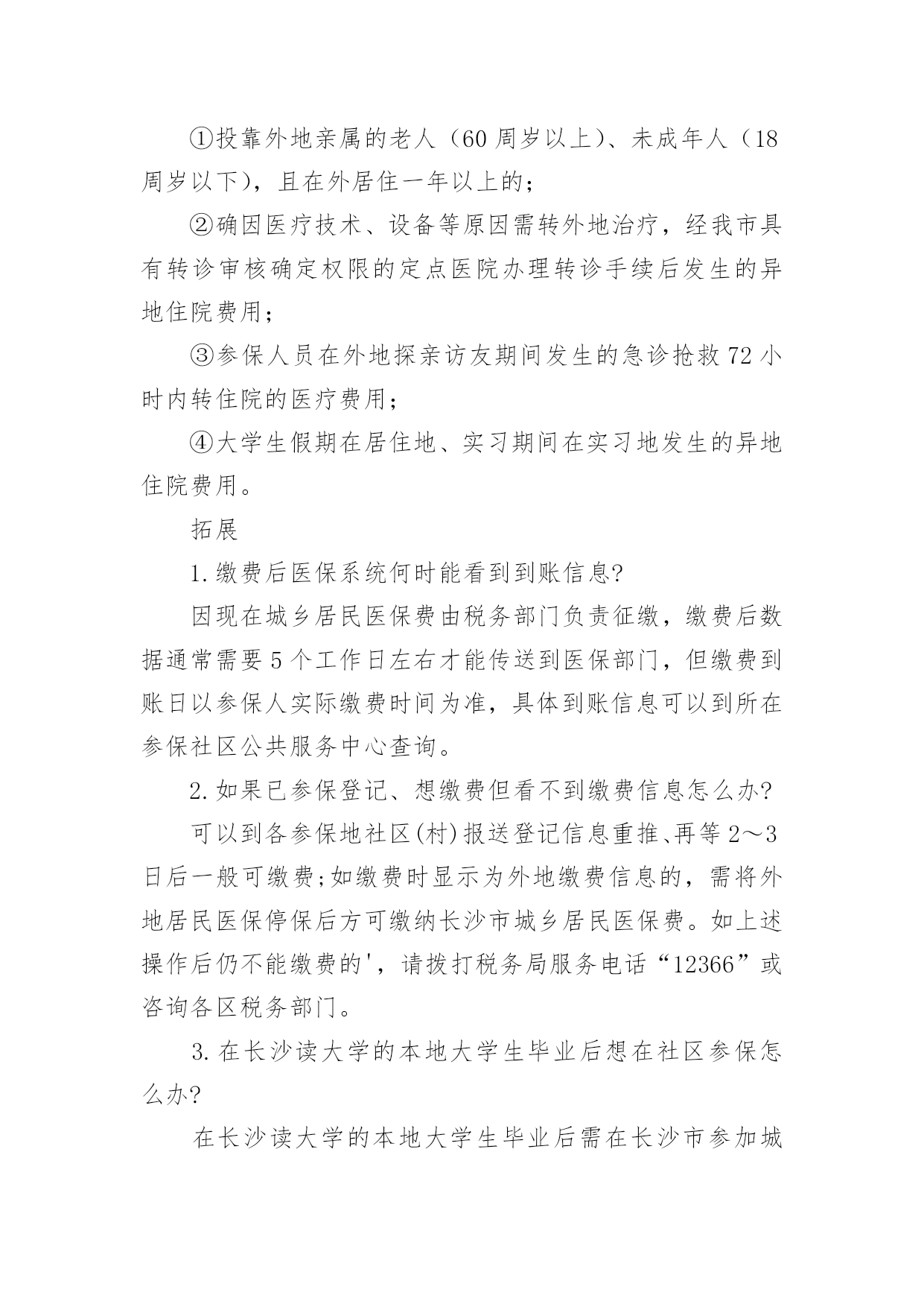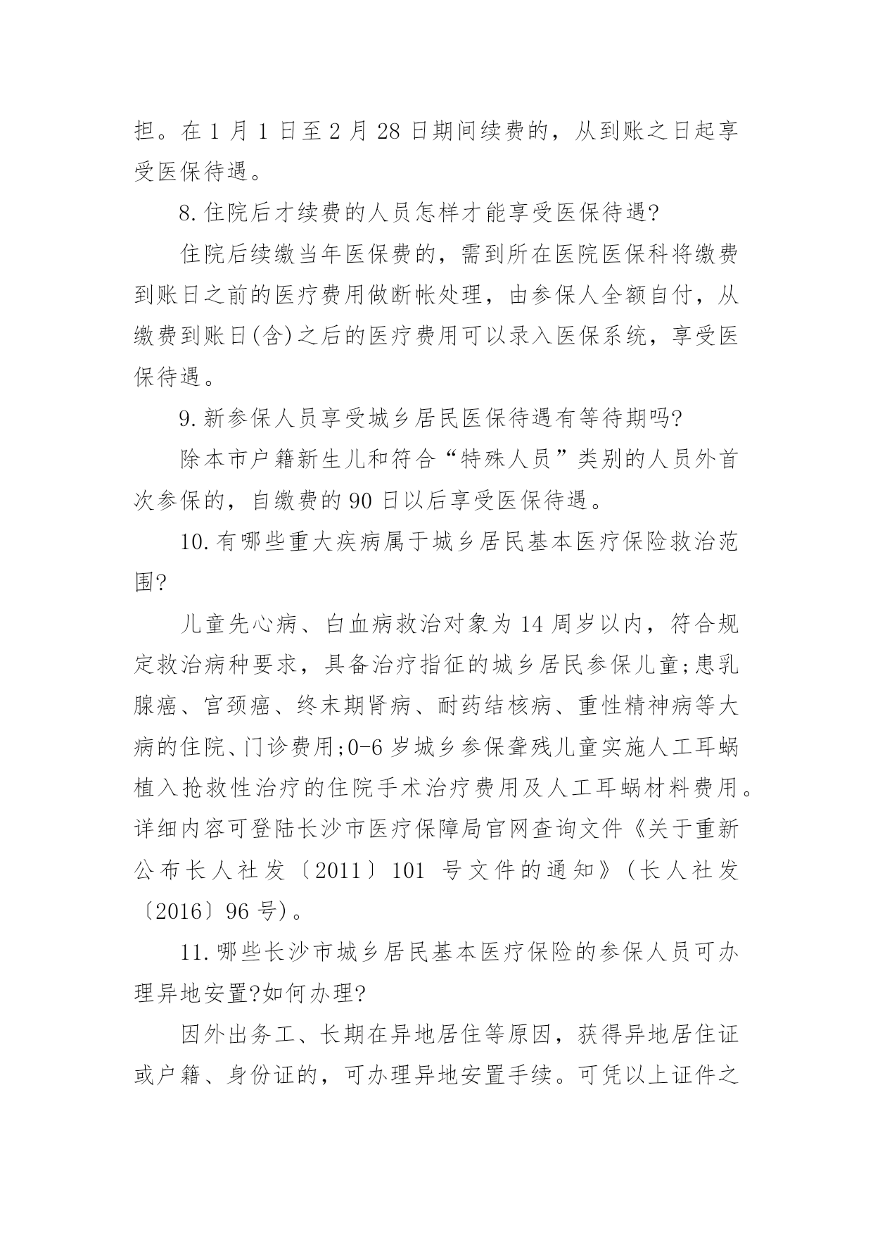 湖南长沙医疗保险问答关于湖南长沙医疗保险问答对于长沙医疗保险常见问题解答的内容,最近很多人很困惑,下面是小编为大家收集的关于湖南长沙医疗保险问答,欢迎大家借鉴与参考,希望对大家有所帮助。1.办理医保缴费后何时可以享受医保待遇?从缴费成功的次月起就可以享受医保待遇。2.医疗保险断交三个月以后会清零吗?医疗保险是按累积缴费年限来计算的,永远不会清零。断交三个月以上只不过是连续缴费年限会中断,会影响报销的最高额度,对医保账户和医保年限没有影响。3.我自己买的医保,欠费了,突然住院了,还能报销吗?灵活就业医保欠费,可以在“灵活就业缴费”窗口打印缴费单,在银行缴费成功后,来我局1111房间办理紧急开通,还可以享受报销。欠费在3个月以内,该年度内自付比例提高10%。欠费3个月以上,该年度内自付比例提高15%。4.住院最高的报销额度是多少?基本医保基金最高支付限额8万元,超过8万元的部分进入大病医疗互助基金支付范畴,大病医疗互助基金最高支付限额12万元。5.住院报销的起付线是什么意思?起付线是指医疗保险统筹基金进行报销金额的计算起点,起付线以下的部分由个人承担。根据医院级别不同起付线不同,三类收费医院480元,二类收费医院650元,一类收费医院900元。例:在三类医院产生1000元住院费用,那么进入统筹报销范畴的金额为1000-480=520元,其中统筹基金报销项目内的项目可以按比例报销。6.异地住院的费用可以拿回长沙报销吗?有5种情况发生的异地住院费用可以拿回长沙报销:①退休人员办理了异地安置的住院医疗费用或特殊病种门诊医疗费用。②单位外派长期驻外工作的住院医疗费用。③探亲访友、因私外出期间突发急症必须住院治疗的医疗费用。④大学生假期在居住地或实习期间在实习地的住院医疗费用。⑤经我市具有转诊审核权限的定点医院审核确定,确因医疗技术和设备条件原因需转异地就医的住院医疗费用。7.退休后在异地居住,医疗保险怎么报销?退休后长期居住异地,可以办理医疗保险异地安置手续,选定当地三家医院就诊,产生的住院费用可拿材料回长沙报销。8.异地住院需要提供哪些材料报销?①参保人员的身份证、医保手册、长沙银行存折或银联卡或医保个人账户卡。②有效医疗费用原始票据、医疗费用汇总清单、出院疾病诊断证明书或出院小结、医院级别证明(均须加盖医院公章)。③县级以下区、乡镇、街道卫生院、厂矿职工医院住院的还需提供:长期医嘱、临时医嘱复印件。(加盖医院公章)④因私外出急诊住院的还需提供:入院记录或急诊病历。(加盖医院公章)⑤经授权定点医院办理了转诊手续的住院还需提供:转诊转治审批单(授权定点医院医保科和医务科盖章)。⑥因意外伤害住院还需提供:1、入院记录、急诊病历。2、证明材料:需由本人写出书面报告将意外伤受伤的经过、时间、地点详细记录,报告上留两个证明人姓名及联系电话。⑦有住院前72小时内发生的不间断的急诊抢救医疗费用的还需提供:急诊留观病历。⑧经连续急诊抢救无效死亡的医疗费用还需提供:急诊留观病历、死亡证明复印件及家属关系证明(由当地派出所出示)。9.医疗保险中断了需要补缴吗?从2011年4月1日起医疗保险是不能中断的,因此从2011年4月1日开始必须连续缴费,其他时间段可自愿选择是否补缴。10.小孩的医疗费用可以用父母的医保报销吗?不可以,参保人的医疗保险只可以给本人使用,不可以用于他人。11.我的医保卡每个月的钱都是我自己交的吗?职工医保每个月划账由两个部分组成:①个人划入部分2%全部划入;②单位划入部分:45岁以下的划入0.7%;45岁以上未到退休年龄的划入1.2%;退休的划入4%。例:年龄25岁,缴费基数为2265元,每个月划入医保卡的有自己交的2%即2265×0.02=45.3元;单位交的0.7%即2265×0.007=15.86,因此每个月医保卡有45.3+15.86=61.16元。1.灵活就业退休,医保卡每个月多少钱?以上年度市政府发布的社会保险缴费基数的60%为个人账户划入基数。例:2012年基数为2960元,即每月应发个人账户金额=2960元×60%=71.04元13.为什么医保卡划账上半年和下半年的钱不一样?医保卡的划账跟医保缴费基数紧密相关,缴费基数是上年度的社平工资,而这一标准由湖南省统计局每年8月份公布。因此每年1-7月份的基数只是一个暂定基数,到了8月份才进行调整,因此医保卡划账才会出现上半年和下半年金额不一致的情况。14.我保险的住院费用如何查询?在提交资料后,会收到一张回执单,20个工作日后,前往长沙银行的柜台或者ATM机查询活期账户,药店是查询不到的。15.我报销的住院费用只能用来买药吗?不是,可以和普通银行借记卡一样使用。因为医保卡是一卡两号,报销的费用会打入活期储蓄账号,可以取出来。如果在外地,可在银联自动取款机查询、支取。16.特