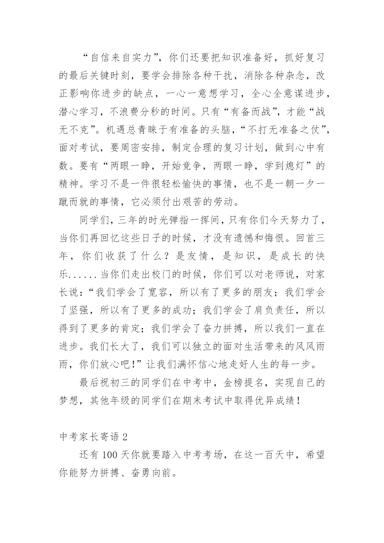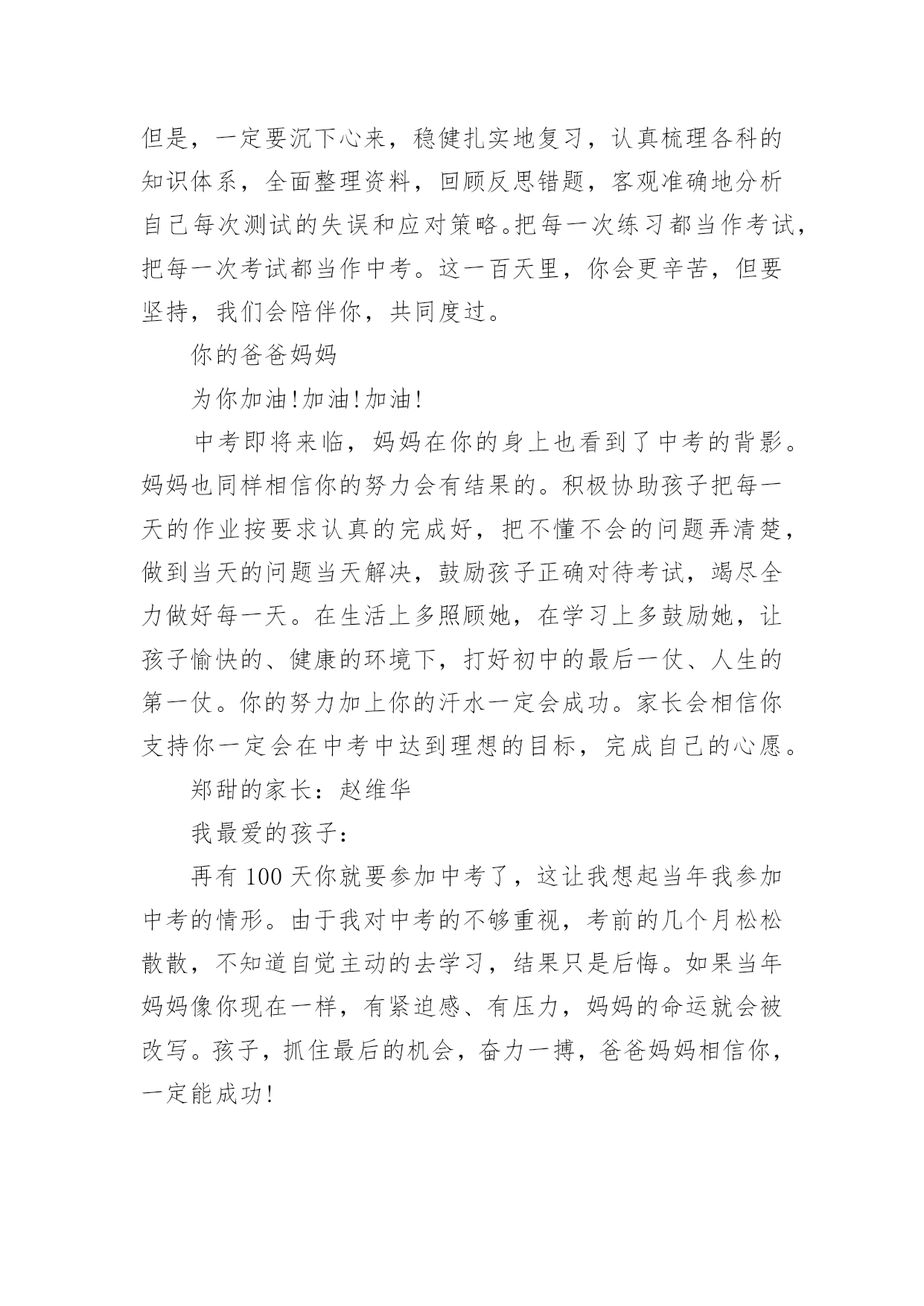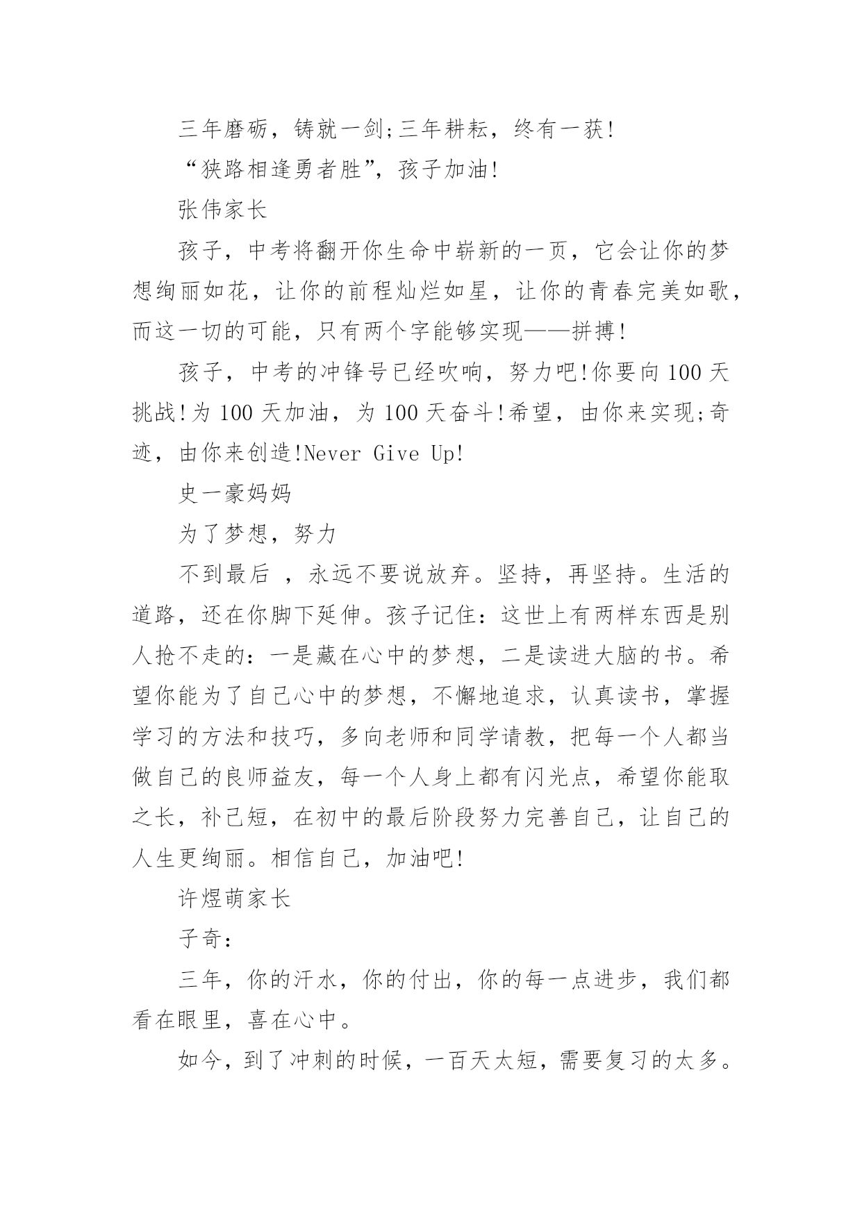 中考家长寄语在我们平凡的日常里,说到寄语,大家肯定都不陌生吧,寄语是所传的话语,有时也指寄托希望的话语。那么你所知道的寄语都是什么样子的?以下是小编帮大家整理的中考家长寄语,供大家参考借鉴,希望可以帮助到有需要的朋友。中考家长寄语1尊敬的各位老师、亲爱的同学们,以及各位家长朋友们:大家下午好!经过三年紧张的学习生活,你们将要迎来人生中的一个重要转折点——中考。万米赛跑已经到了百米冲刺的时候,三年的寒窗苦读,1000多个日日夜夜,你们付出的所有艰辛和汗水,都将在这火红的6月收获。最后100天的拼搏,是意志的较量,更是心态的比拼。这段日子的付出与收获都将会是你们一生回味无穷、值得珍惜的宝贵财富。在迎接中考的日子里,你们要做好充分的准备,首先做好心理准备,确立目标,树立信心。目标是你们奋战中考的方向和动力,充满信心是决战中考的前提。要坚信自己,用“我能行!我成功!”这些富有激情的话语时刻提醒自己,点燃热情进行自我鼓励和鞭策。端正态度,变压力为动力,保持积极乐观的态度去迎接中考,坚信你们的努力一定会换来金秋的硕果。不管中途我们遇到了什么困难,都要坚强地面对,并坚持到最后,因为“笑到最后的才是的”。“自信来自实力”,你们还要把知识准备好,抓好复习的最后关键时刻,要学会排除各种干扰,消除各种杂念,改正影响你进步的缺点,一心一意想学习,全心全意谋进步,潜心学习,不浪费分秒的时间。只有“有备而战”,才能“战无不克”。机遇总青睐于有准备的头脑,“不打无准备之仗”,面对考试,要周密安排,制定合理的复习计划,做到心中有数。要有“两眼一睁,开始竞争,两眼一睁,学到熄灯”的精神。学习不是一件很轻松愉快的事情,也不是一朝一夕一蹴而就的事情,它必须付出艰苦的劳动。同学们,三年的时光弹指一挥间,只有你们今天努力了,当你们再回忆这些日子的时候,才没有遗憾和悔恨。回首三年,你们收获了什么?是友情,是知识,是成长的快乐......当你们走出校门的时候,你们可以对老师说,对家长说:“我们学会了宽容,所以有了更多的朋友;我们学会了坚强,所以有了更多的成功;我们学会了肩负责任,所以得到了更多的肯定;我们学会了奋力拼搏,所以我们一直在进步。我们长大了,我们可以独立的面对生活带来的风风雨雨,你们放心吧!”让我们满怀信心地走好人生的每一步。最后祝初三的同学们在中考中,金榜提名,实现自己的梦想,其他年级的同学们在期末考试中取得优异成绩!中考家长寄语2还有100天你就要踏入中考考场,在这一百天中,希望你能努力拼搏、奋勇向前。三年磨砺,铸就一剑;三年耕耘,终有一获!“狭路相逢勇者胜”,孩子加油!张伟家长孩子,中考将翻开你生命中崭新的一页,它会让你的梦想绚丽如花,让你的前程灿烂如星,让你的青春完美如歌,而这一切的可能,只有两个字能够实现——拼搏!孩子,中考的冲锋号已经吹响,努力吧!你要向100天挑战!为100天加油,为100天奋斗!希望,由你来实现;奇迹,由你来创造!NeverGiveUp!史一豪妈妈为了梦想,努力不到最后,永远不要说放弃。坚持,再坚持。生活的道路,还在你脚下延伸。孩子记住:这世上有两样东西是别人抢不走的:一是藏在心中的梦想,二是读进大脑的书。希望你能为了自己心中的梦想,不懈地追求,认真读书,掌握学习的方法和技巧,多向老师和同学请教,把每一个人都当做自己的良师益友,每一个人身上都有闪光点,希望你能取之长,补己短,在初中的最后阶段努力完善自己,让自己的人生更绚丽。相信自己,加油吧!许煜萌家长子奇:三年,你的汗水,你的付出,你的每一点进步,我们都看在眼里,喜在心中。如今,到了冲刺的时候,一百天太短,需要复习的太多。但是,一定要沉下心来,稳健扎实地复习,认真梳理各科的知识体系,全面整理资料,回顾反思错题,客观准确地分析自己每次测试的失误和应对策略。把每一次练习都当作考试,把每一次考试都当作中考。这一百天里,你会更辛苦,但要坚持,我们会陪伴你,共同度过。你的爸爸妈妈为你加油!加油!加油!中考即将来临,妈妈在你的身上也看到了中考的背影。妈妈也同样相信你的努力会有结果的。积极协助孩子把每一天的作业按要求认真的完成好,把不懂不会的问题弄清楚,做到当天的问题当天解决,鼓励孩子正确对待考试,竭尽全力做好每一天。在生活上多照顾她,在学习上多鼓励她,让孩子愉快的、健康的环境下,打好初中的最后一仗、人生的第一仗。你的努力加上你的汗水一定会成功。家长会相信你支持你一定会在中考中达到理想的目标,完成自己的心愿。郑甜的家长:赵维华我最爱的孩子:再有100天你就要参加中考了,这让我想起当年我参加中考的情形。由于我对中考的不够重视,考前的几个月松松散散,不知道自觉主动的去学习,结果只是后悔。如果当年妈妈像你现在一样,有紧迫感、有压力,妈妈的命运就会被改写。孩子,抓住最后的机会,奋力一搏,爸爸妈妈相