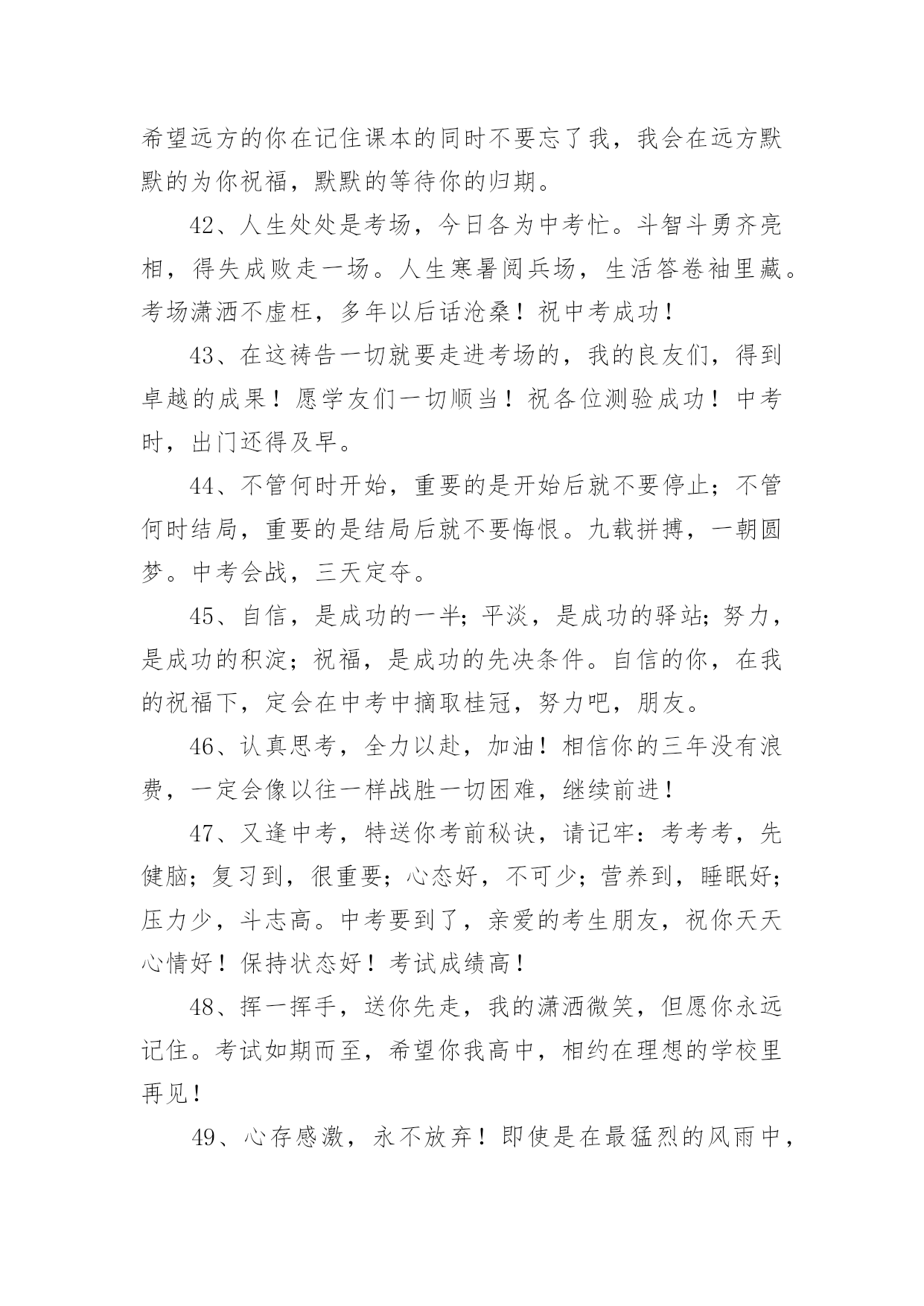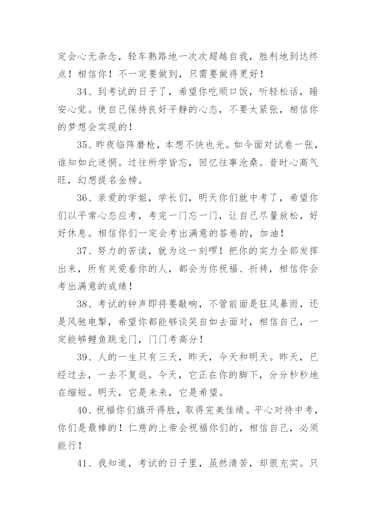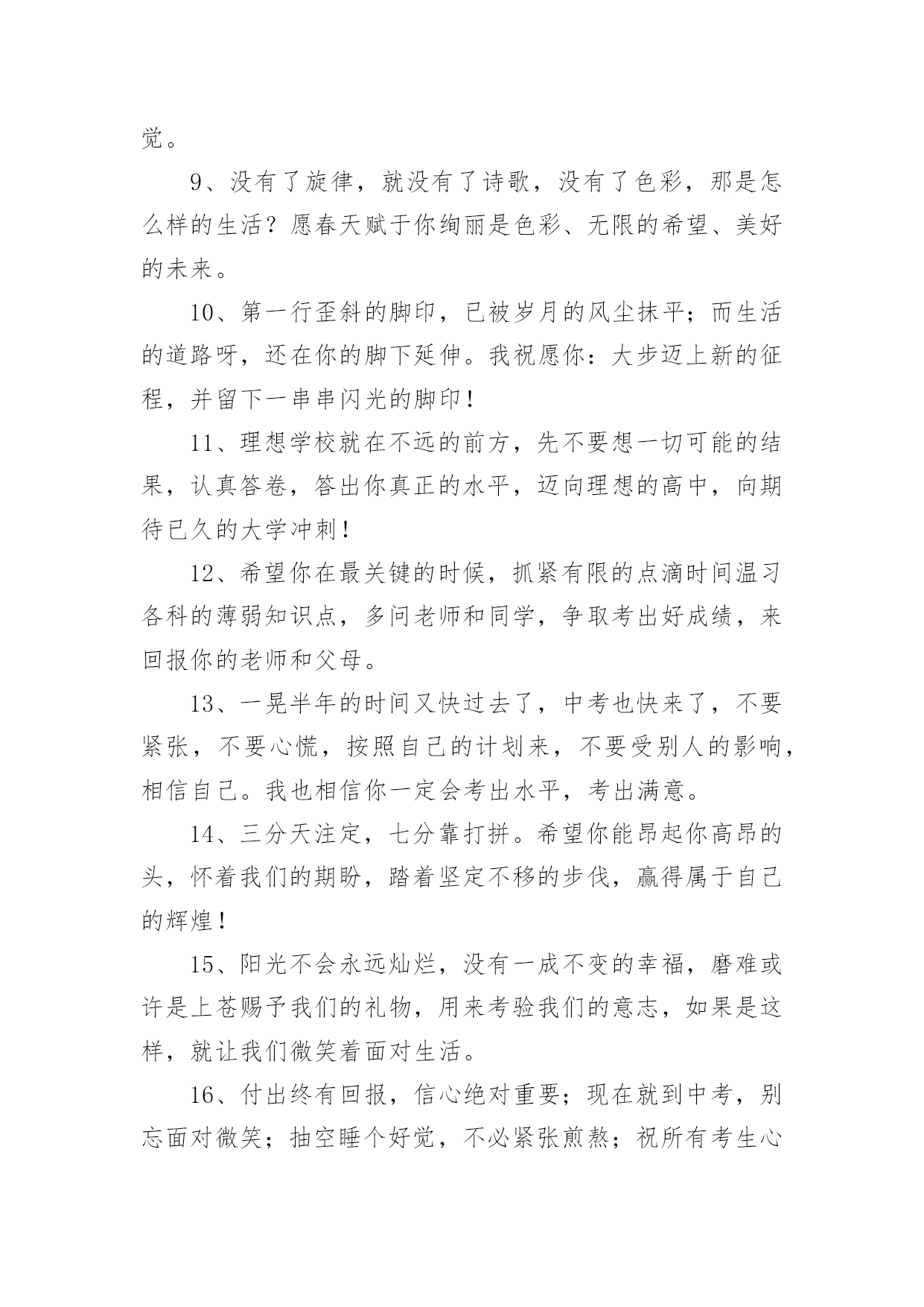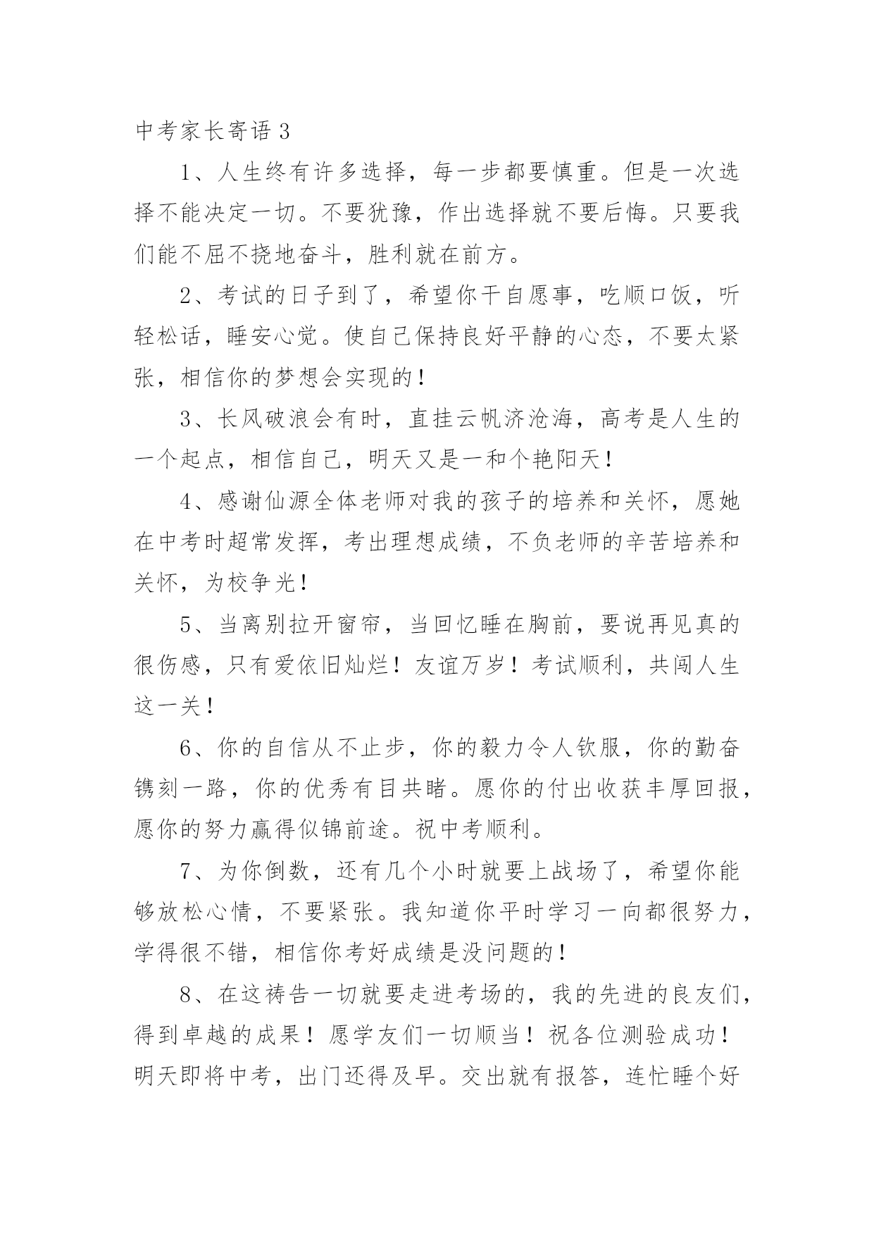 中考家长寄语在我们平凡的日常里,说到寄语,大家肯定都不陌生吧,寄语是所传的话语,有时也指寄托希望的话语。那么你所知道的寄语都是什么样子的?以下是小编帮大家整理的中考家长寄语,供大家参考借鉴,希望可以帮助到有需要的朋友。中考家长寄语1尊敬的各位老师、亲爱的同学们,以及各位家长朋友们:大家下午好!经过三年紧张的学习生活,你们将要迎来人生中的一个重要转折点——中考。万米赛跑已经到了百米冲刺的时候,三年的寒窗苦读,1000多个日日夜夜,你们付出的所有艰辛和汗水,都将在这火红的6月收获。最后100天的拼搏,是意志的较量,更是心态的比拼。这段日子的付出与收获都将会是你们一生回味无穷、值得珍惜的宝贵财富。在迎接中考的日子里,你们要做好充分的准备,首先做好心理准备,确立目标,树立信心。目标是你们奋战中考的方向和动力,充满信心是决战中考的前提。要坚信自己,用“我能行!我成功!”这些富有激情的话语时刻提醒自己,点燃热情进行自我鼓励和鞭策。端正态度,变压力为动力,保持积极乐观的态度去迎接中考,坚信你们的努力一定会换来金秋的硕果。不管中途我们遇到了什么困难,都要坚强地面对,并坚持到最后,因为“笑到最后的才是的”。“自信来自实力”,你们还要把知识准备好,抓好复习的最后关键时刻,要学会排除各种干扰,消除各种杂念,改正影响你进步的缺点,一心一意想学习,全心全意谋进步,潜心学习,不浪费分秒的时间。只有“有备而战”,才能“战无不克”。机遇总青睐于有准备的头脑,“不打无准备之仗”,面对考试,要周密安排,制定合理的复习计划,做到心中有数。要有“两眼一睁,开始竞争,两眼一睁,学到熄灯”的精神。学习不是一件很轻松愉快的事情,也不是一朝一夕一蹴而就的事情,它必须付出艰苦的劳动。同学们,三年的时光弹指一挥间,只有你们今天努力了,当你们再回忆这些日子的时候,才没有遗憾和悔恨。回首三年,你们收获了什么?是友情,是知识,是成长的快乐......当你们走出校门的时候,你们可以对老师说,对家长说:“我们学会了宽容,所以有了更多的朋友;我们学会了坚强,所以有了更多的成功;我们学会了肩负责任,所以得到了更多的肯定;我们学会了奋力拼搏,所以我们一直在进步。我们长大了,我们可以独立的面对生活带来的风风雨雨,你们放心吧!”让我们满怀信心地走好人生的每一步。最后祝初三的同学们在中考中,金榜提名,实现自己的梦想,其他年级的同学们在期末考试中取得优异成绩!中考家长寄语2还有100天你就要踏入中考考场,在这一百天中,希望你能努力拼搏、奋勇向前。三年磨砺,铸就一剑;三年耕耘,终有一获!“狭路相逢勇者胜”,孩子加油!张伟家长孩子,中考将翻开你生命中崭新的一页,它会让你的梦想绚丽如花,让你的前程灿烂如星,让你的青春完美如歌,而这一切的可能,只有两个字能够实现——拼搏!孩子,中考的冲锋号已经吹响,努力吧!你要向100天挑战!为100天加油,为100天奋斗!希望,由你来实现;奇迹,由你来创造!NeverGiveUp!史一豪妈妈为了梦想,努力不到最后,永远不要说放弃。坚持,再坚持。生活的道路,还在你脚下延伸。孩子记住:这世上有两样东西是别人抢不走的:一是藏在心中的梦想,二是读进大脑的书。希望你能为了自己心中的梦想,不懈地追求,认真读书,掌握学习的方法和技巧,多向老师和同学请教,把每一个人都当做自己的良师益友,每一个人身上都有闪光点,希望你能取之长,补己短,在初中的最后阶段努力完善自己,让自己的人生更绚丽。相信自己,加油吧!许煜萌家长子奇:三年,你的汗水,你的付出,你的每一点进步,我们都看在眼里,喜在心中。如今,到了冲刺的时候,一百天太短,需要复习的太多。但是,一定要沉下心来,稳健扎实地复习,认真梳理各科的知识体系,全面整理资料,回顾反思错题,客观准确地分析自己每次测试的失误和应对策略。把每一次练习都当作考试,把每一次考试都当作中考。这一百天里,你会更辛苦,但要坚持,我们会陪伴你,共同度过。你的爸爸妈妈为你加油!加油!加油!中考即将来临,妈妈在你的身上也看到了中考的背影。妈妈也同样相信你的努力会有结果的。积极协助孩子把每一天的作业按要求认真的完成好,把不懂不会的问题弄清楚,做到当天的问题当天解决,鼓励孩子正确对待考试,竭尽全力做好每一天。在生活上多照顾她,在学习上多鼓励她,让孩子愉快的、健康的环境下,打好初中的最后一仗、人生的第一仗。你的努力加上你的汗水一定会成功。家长会相信你支持你一定会在中考中达到理想的目标,完成自己的心愿。郑甜的家长:赵维华我最爱的孩子:再有100天你就要参加中考了,这让我想起当年我参加中考的情形。由于我对中考的不够重视,考前的几个月松松散散,不知道自觉主动的去学习,结果只是后悔。如果当年妈妈像你现在一样,有紧迫感、有压力,妈妈的命运就会被改写。孩子,抓住最后的机会,奋力一搏,爸爸妈妈相